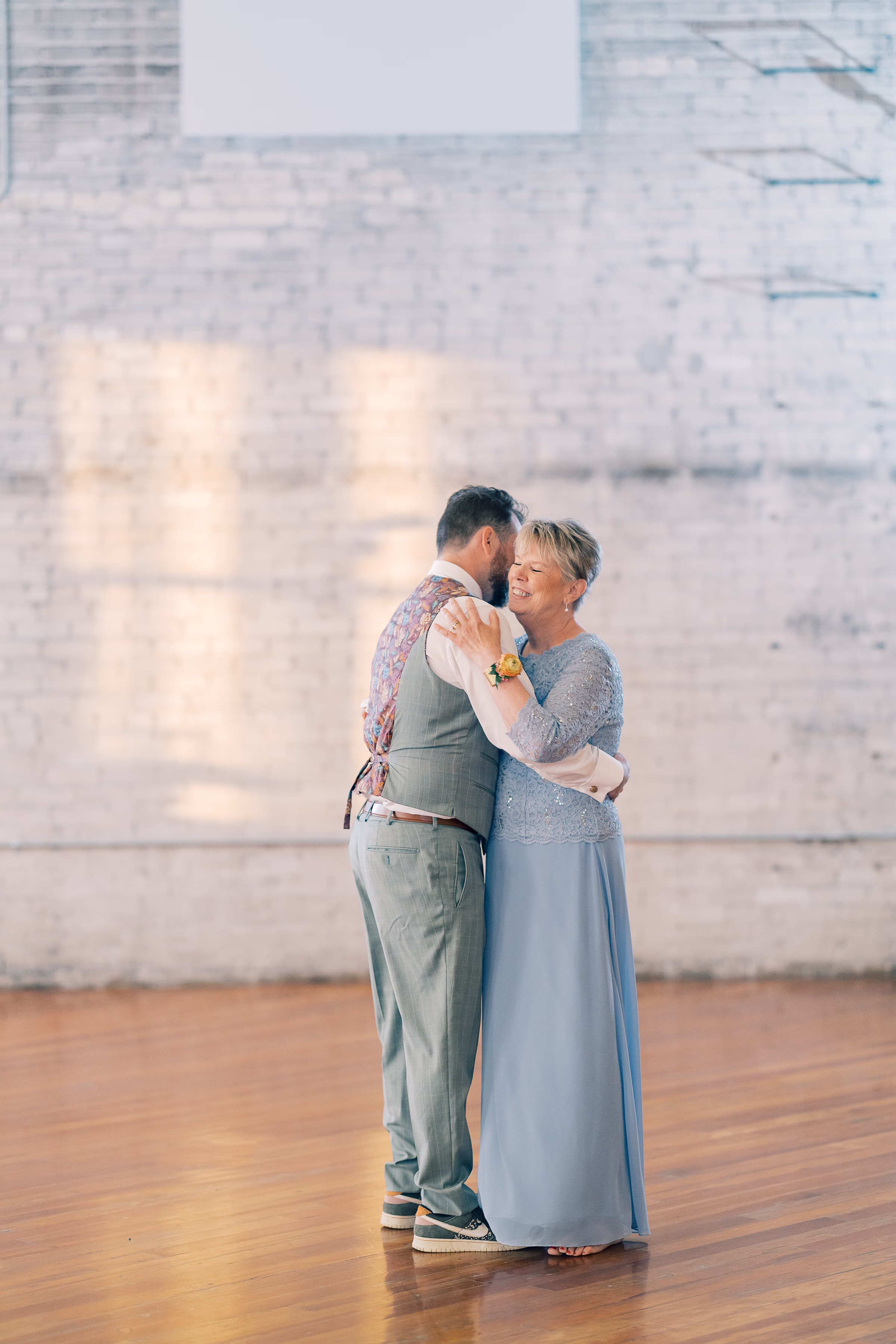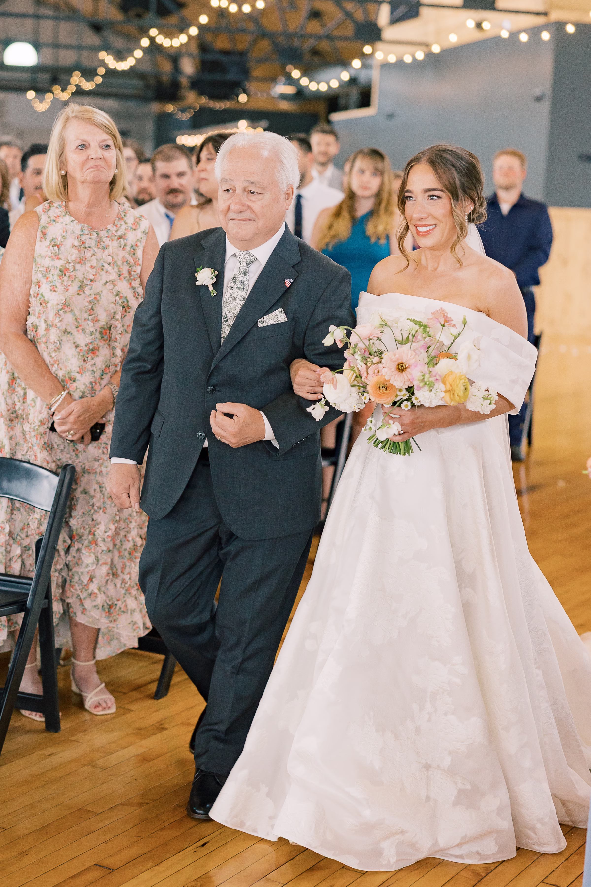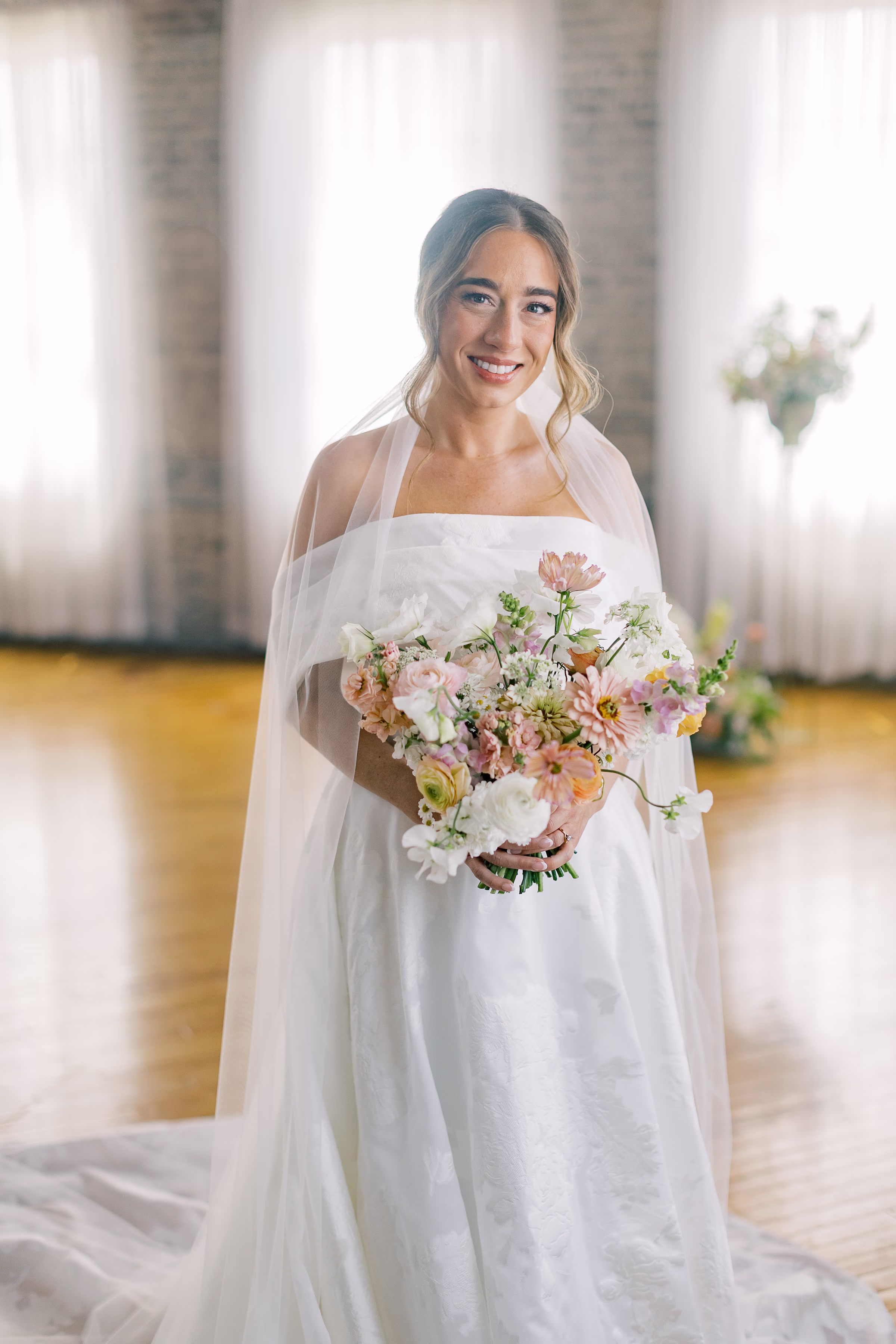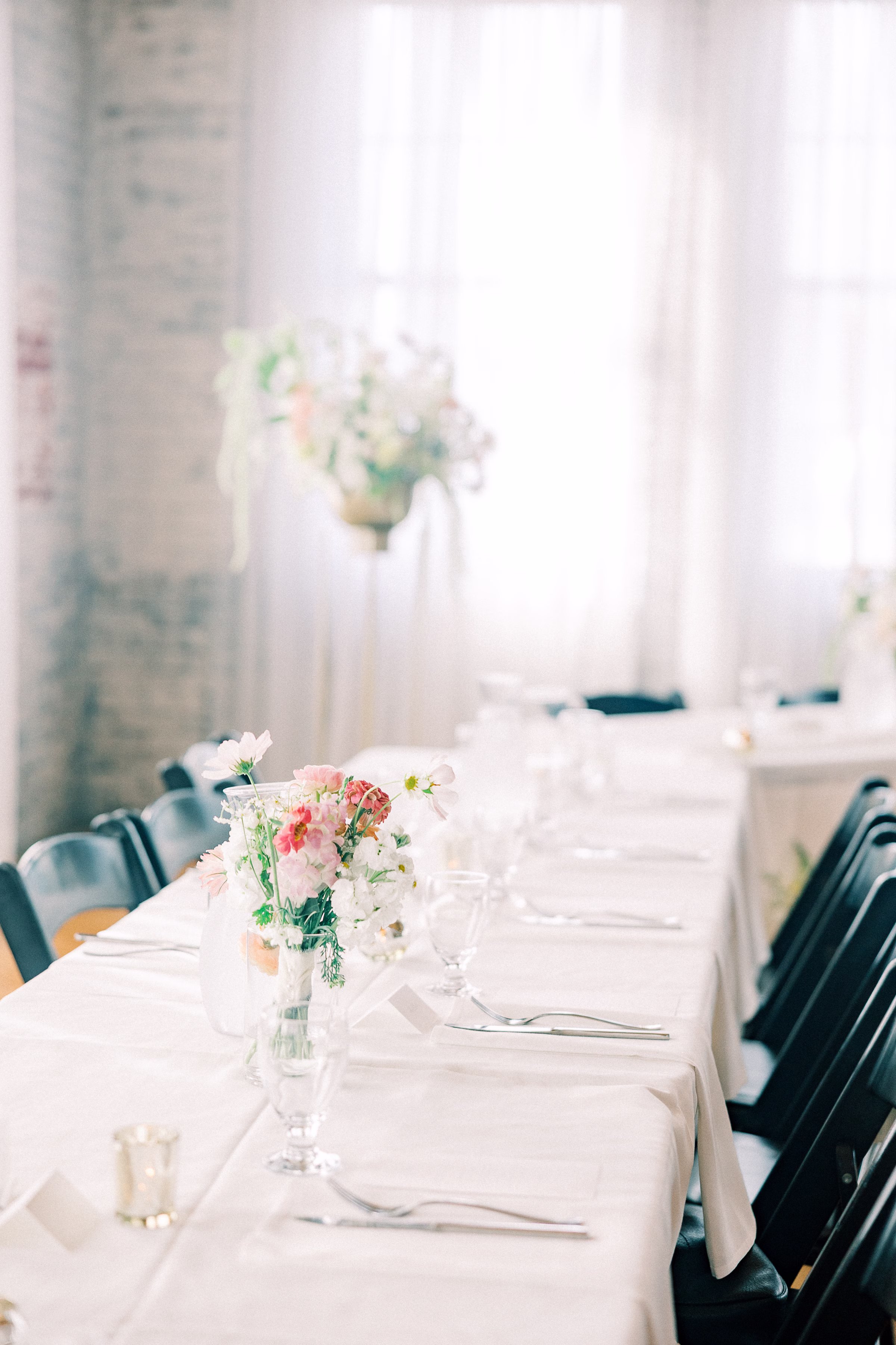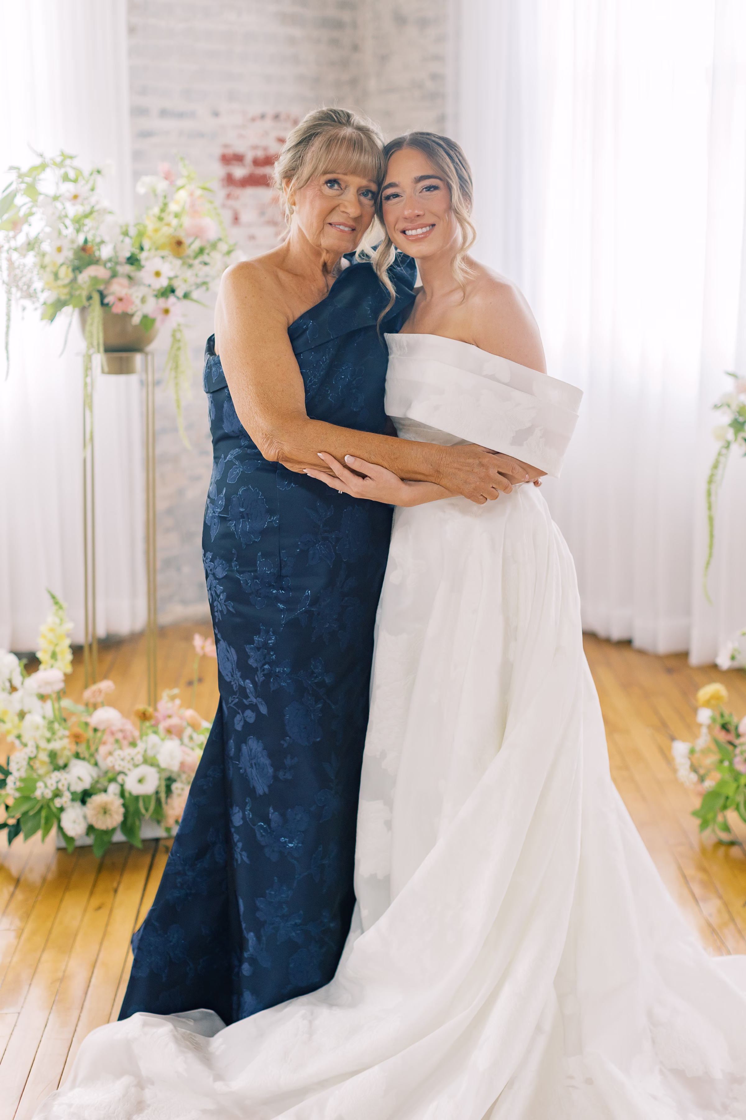 The couple wed in an indoor ceremony framed by florals, natural light, and a timeless brick backdrop. Right after the ceremony, Mallory and Ryan stepped away for a private moment. Mallory reflected, “It was a chance to soak in the moment and be fully present with each other. During that time, we shared our personal vows with just the two of us. It was intimate, emotional, and one of the most meaningful parts of our wedding.”