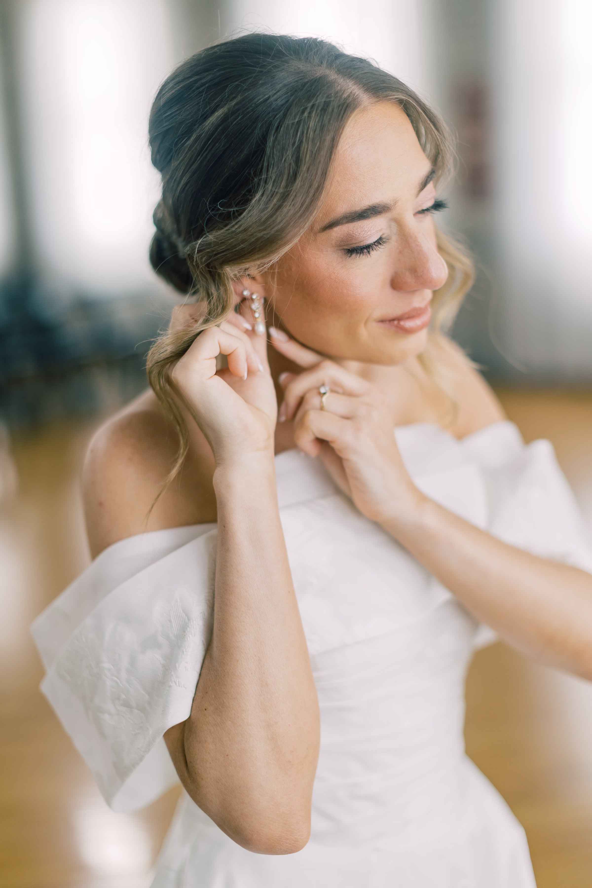 Su Casa Salon & Bridal Suite and Makeup by Jaide Johnson kept hair and makeup simple, sweet, and refined. Mallory and her bridesmaids wore their hair in loose waves, in varying updos or half-up styles, often with loose, face-framing pieces. Mallory’s bridal makeup included shimmering pink eyeshadow, soft eyeliner, blush cheeks, and a natural lip.