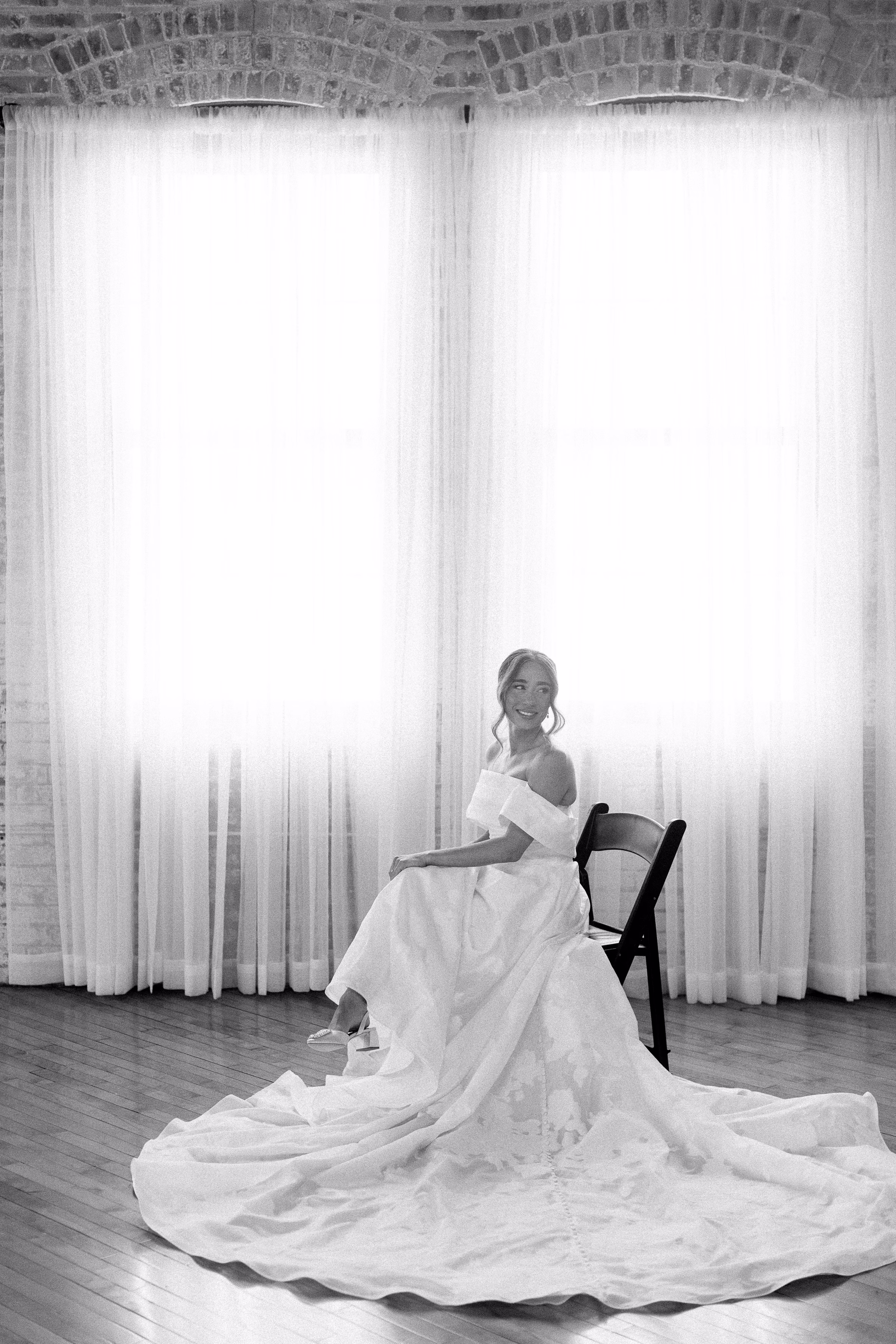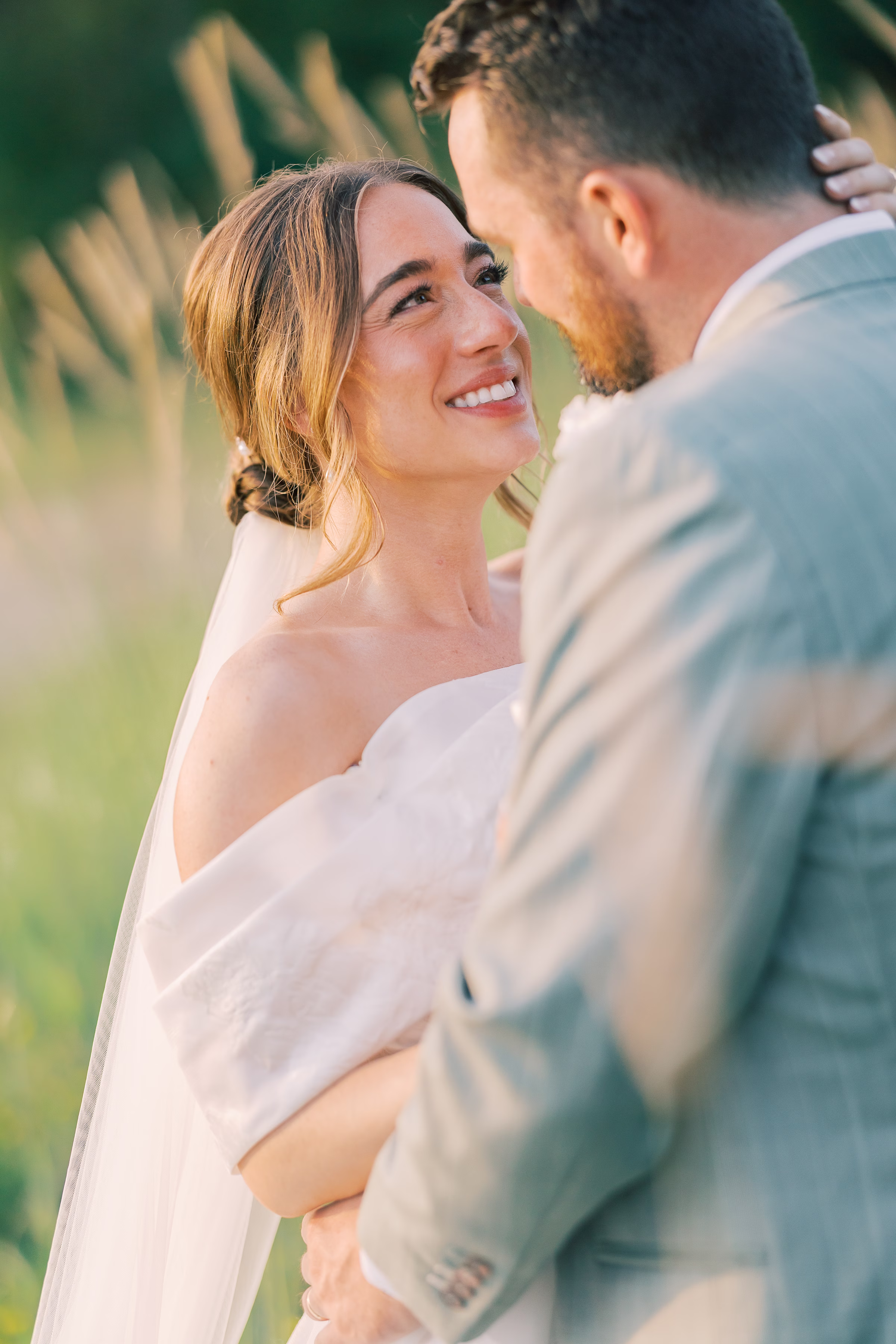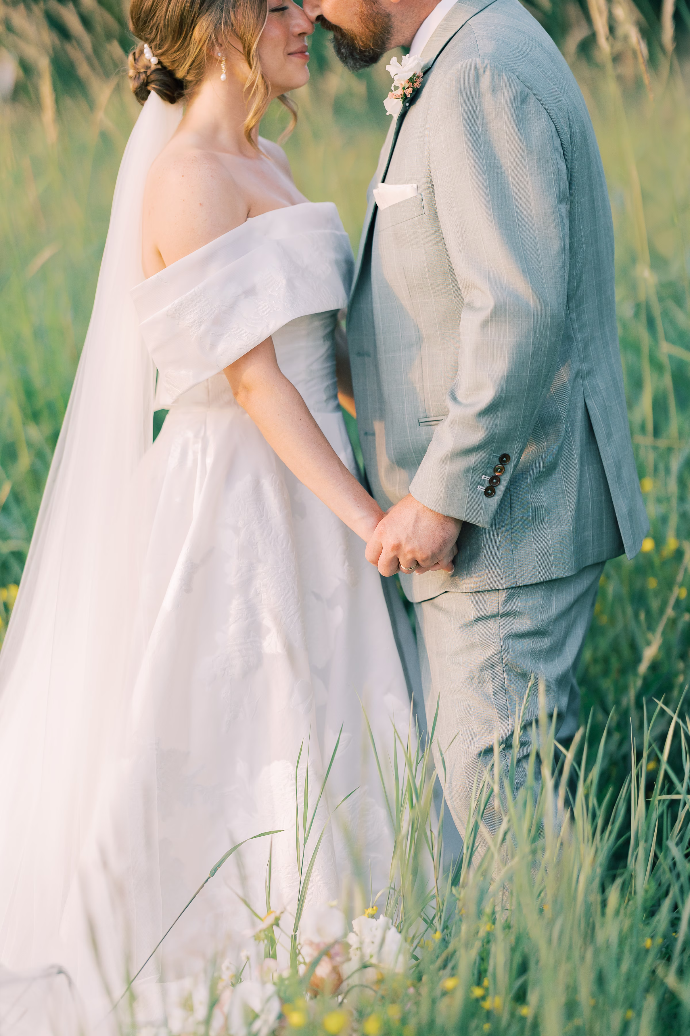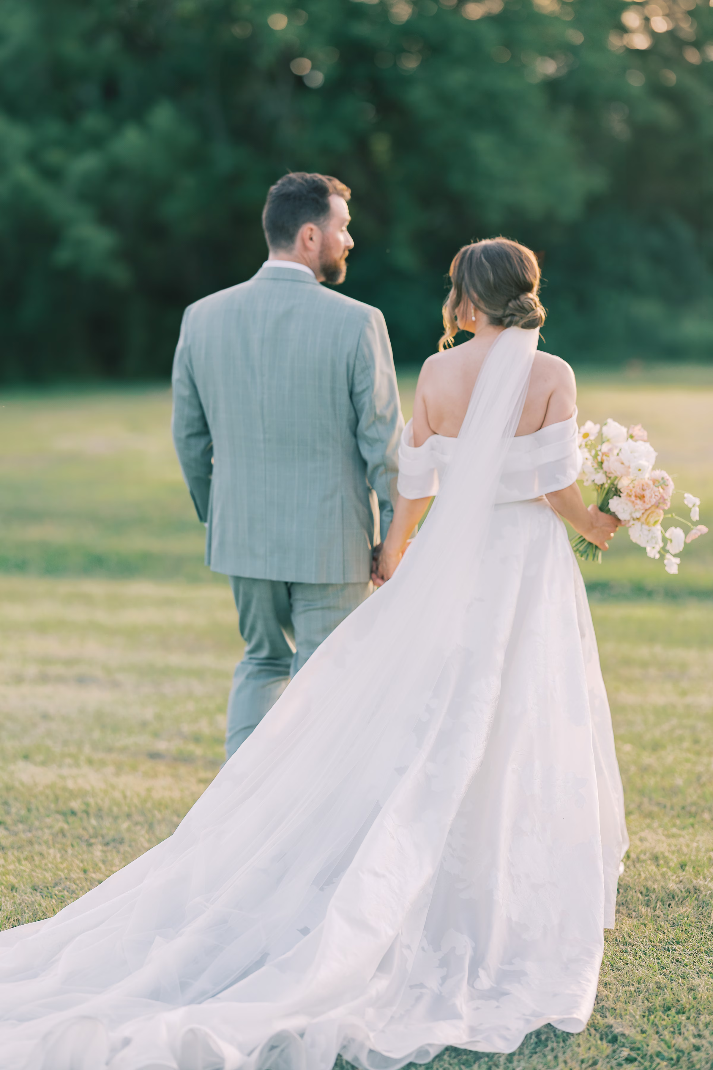 Mallory said yes to an ethereal, romantic gown from Marah’s Bridal. The beautiful, off-the-shoulder dress featured a wrapped bodice, A-line silhouette, and luxe (brocade) fabric draping into an elegant, full train. She accessorized with a cathedral-length tulle veil at varying times throughout the day, for the ceremony and couple portraits.