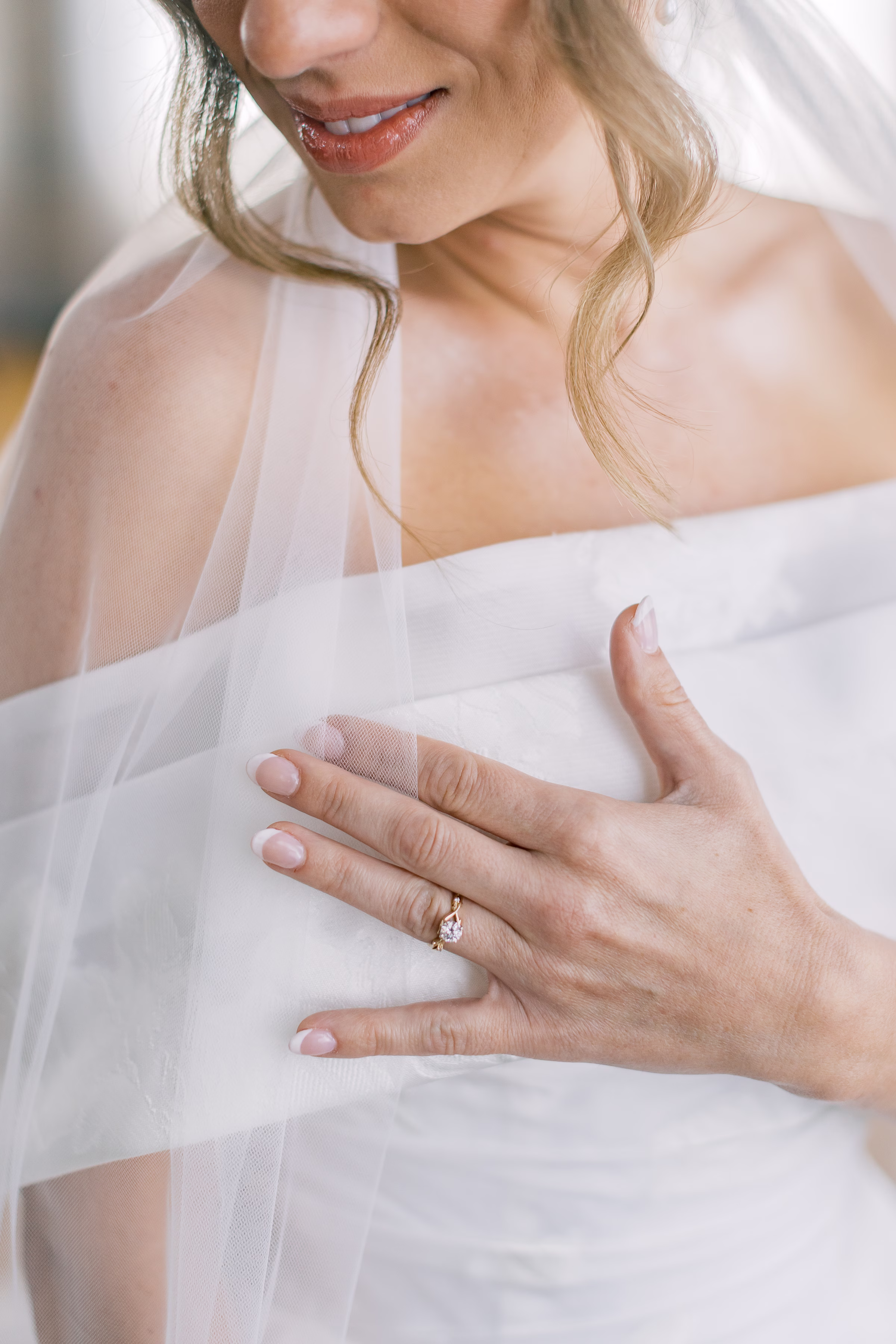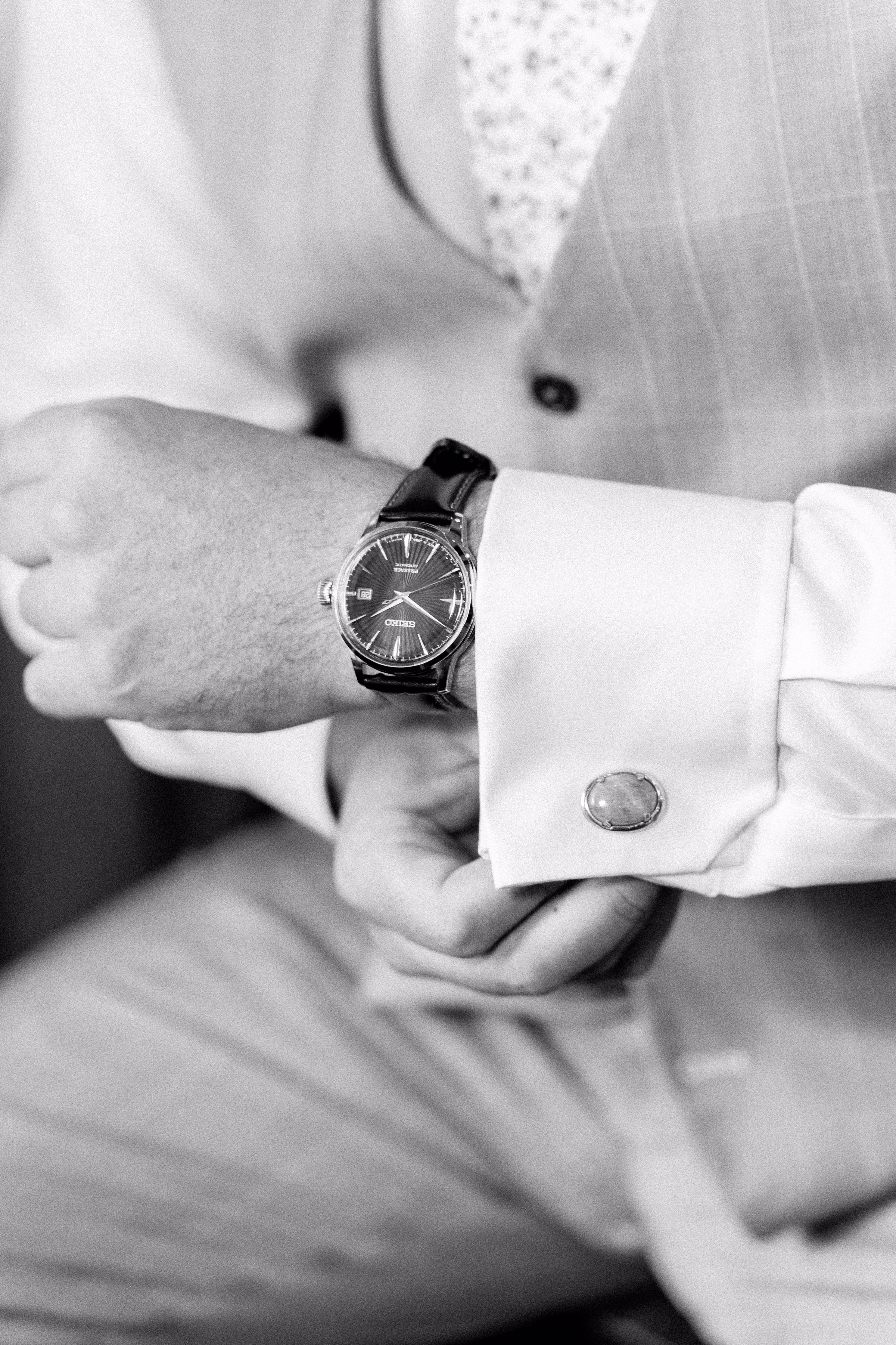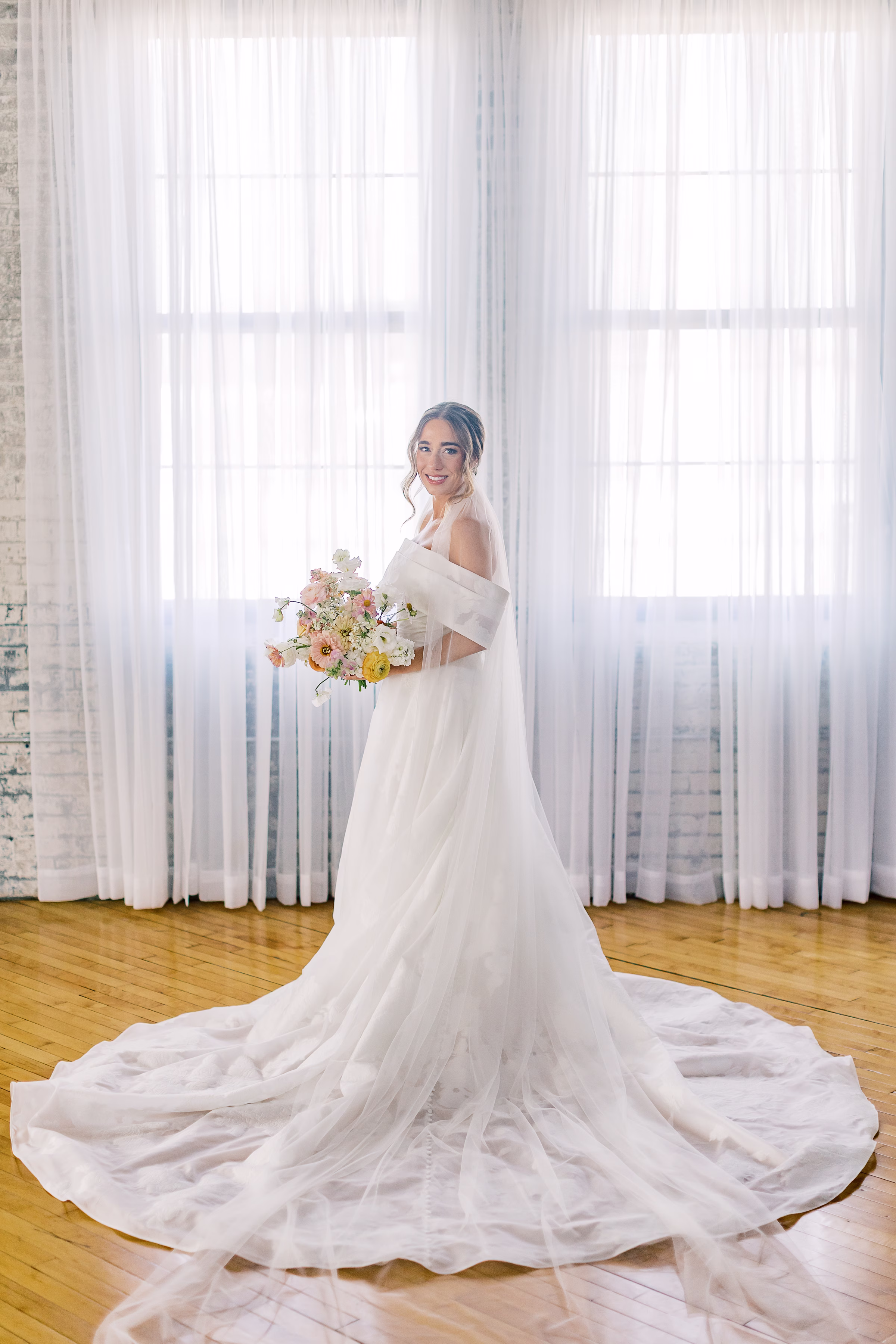 Mallory said yes to an ethereal, romantic gown from Marah’s Bridal. The beautiful, off-the-shoulder dress featured a wrapped bodice, A-line silhouette, and luxe (brocade) fabric draping into an elegant, full train. She accessorized with a cathedral-length tulle veil at varying times throughout the day, for the ceremony and couple portraits.