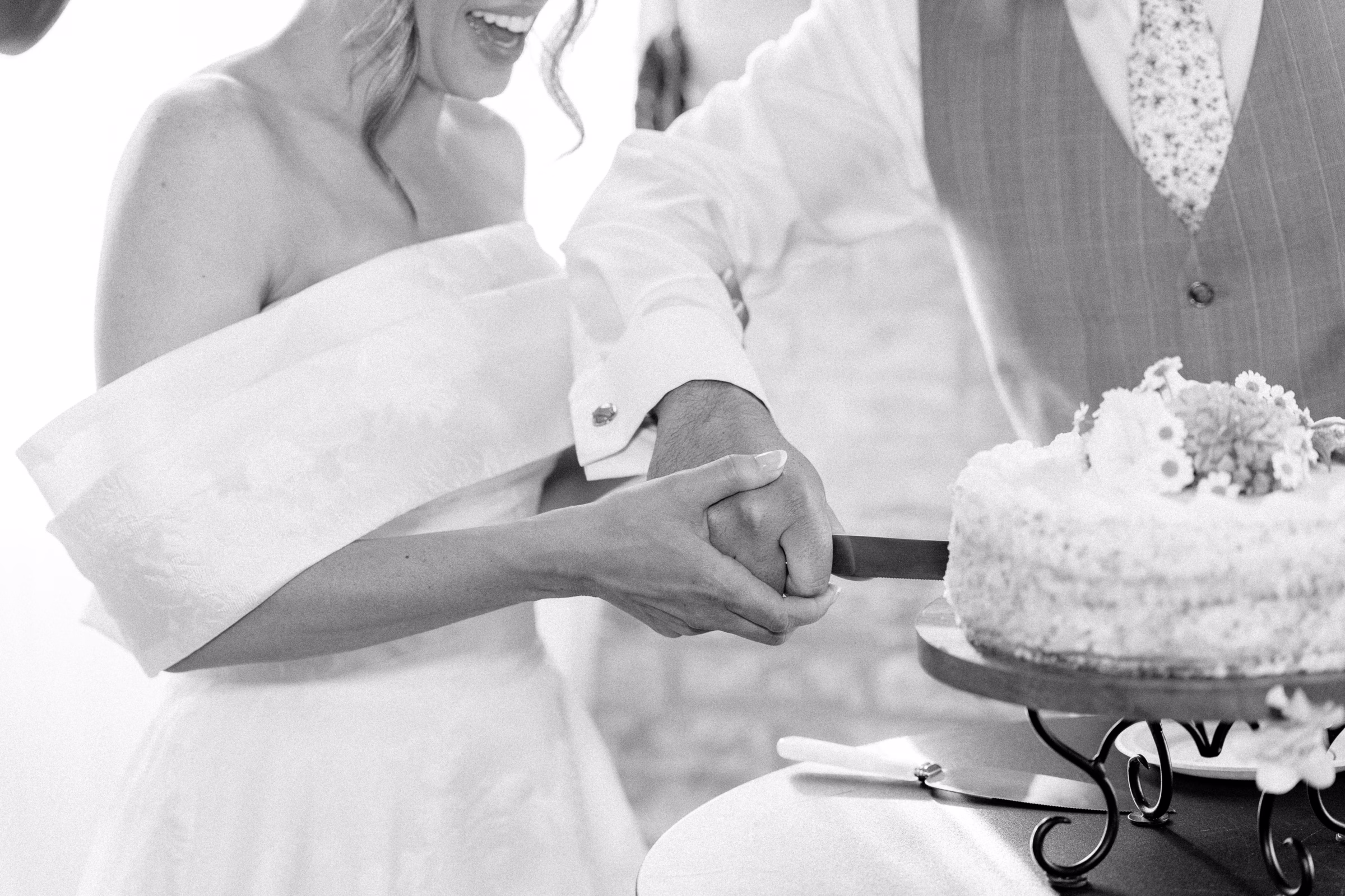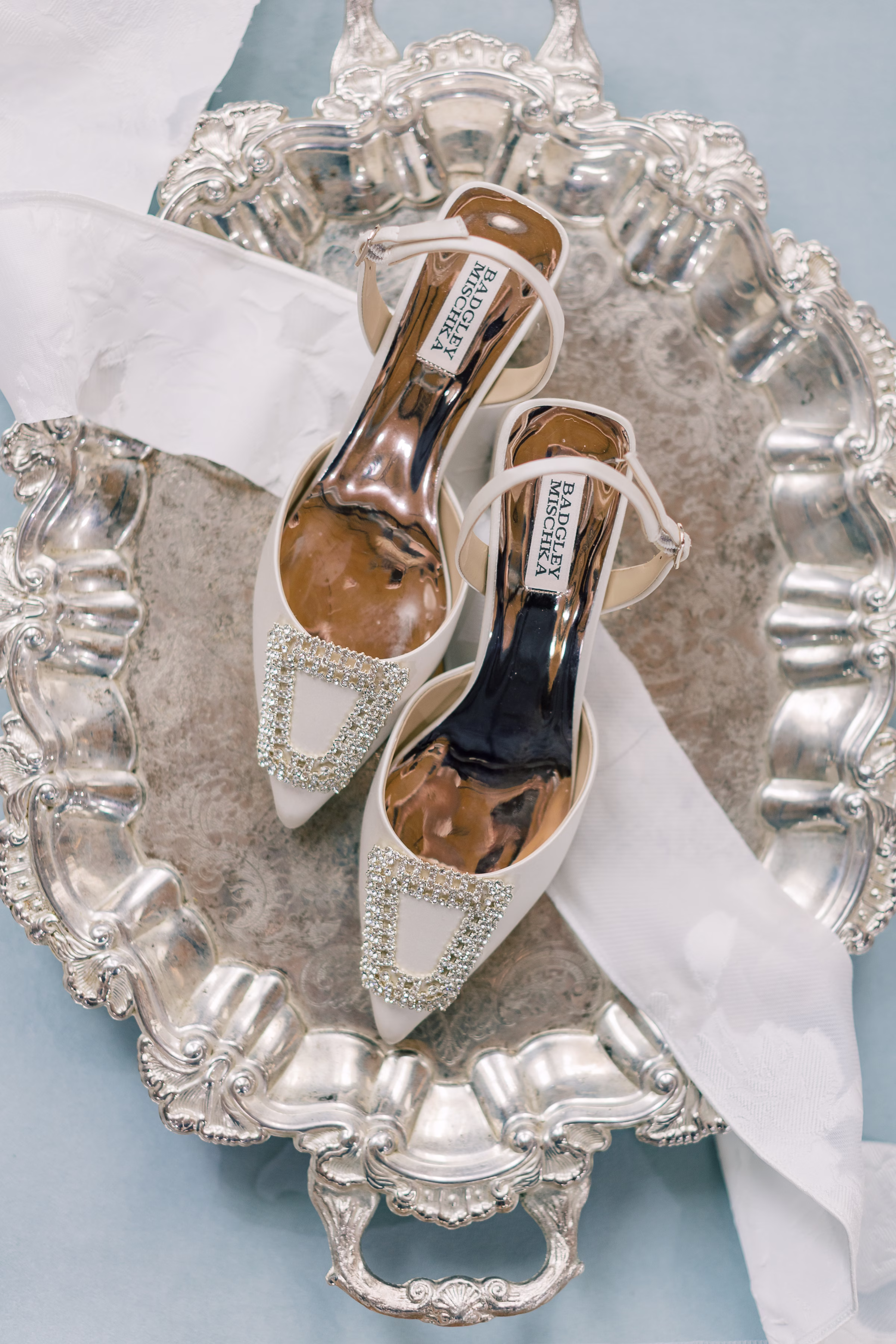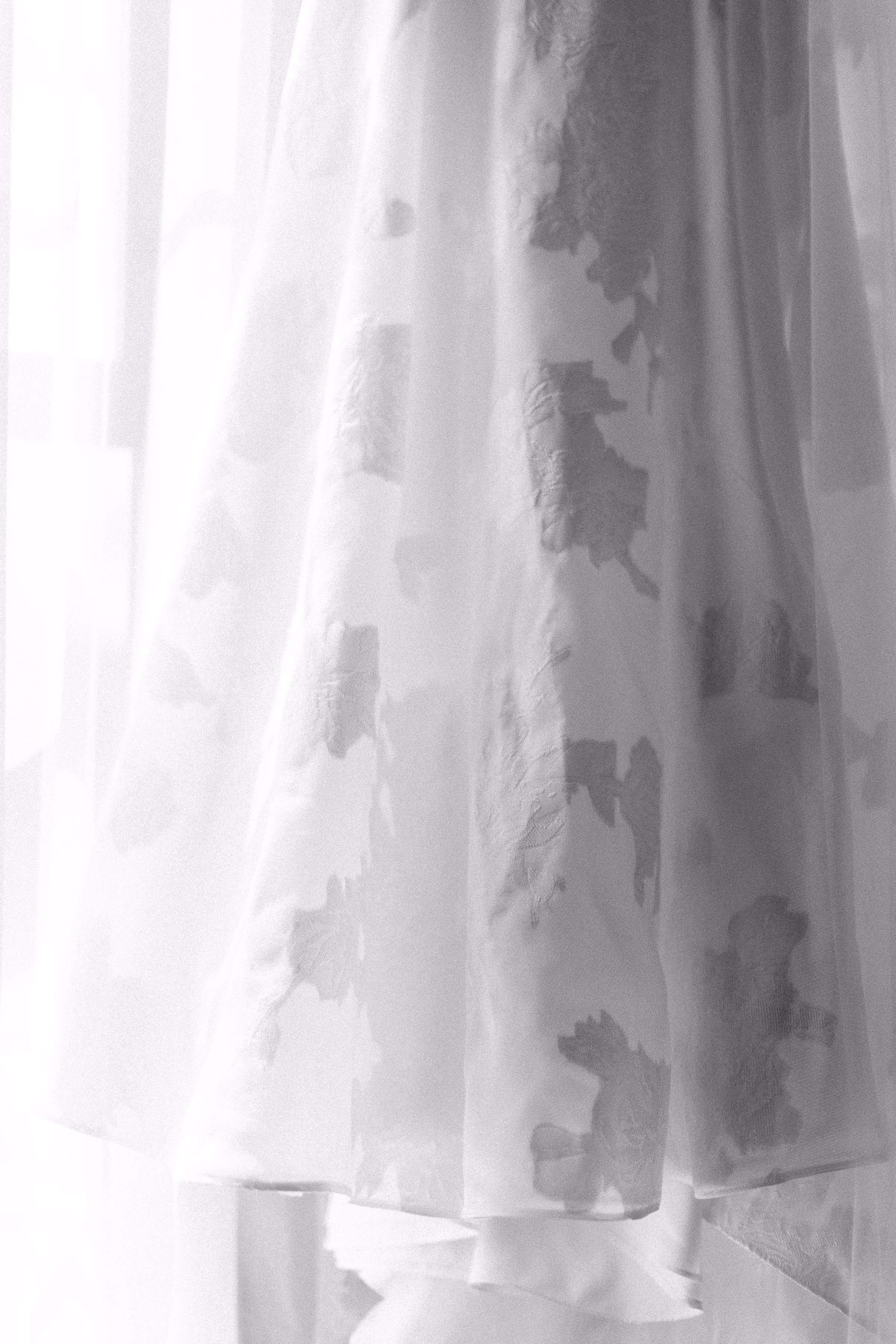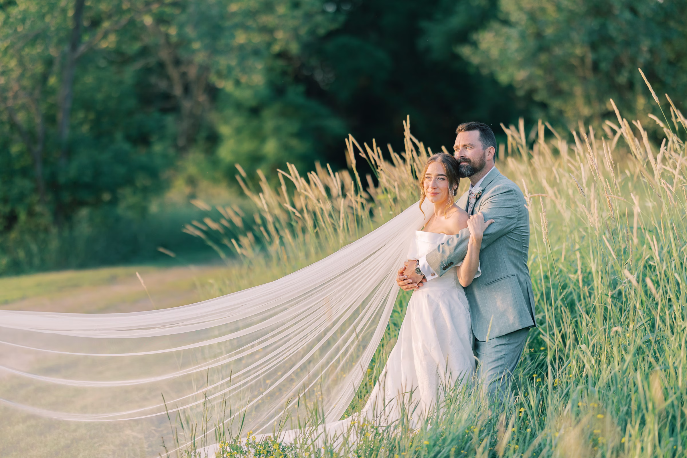 Mallory said yes to an ethereal, romantic gown from Marah’s Bridal. The beautiful, off-the-shoulder dress featured a wrapped bodice, A-line silhouette, and luxe (brocade) fabric draping into an elegant, full train. She accessorized with a cathedral-length tulle veil at varying times throughout the day, for the ceremony and couple portraits.