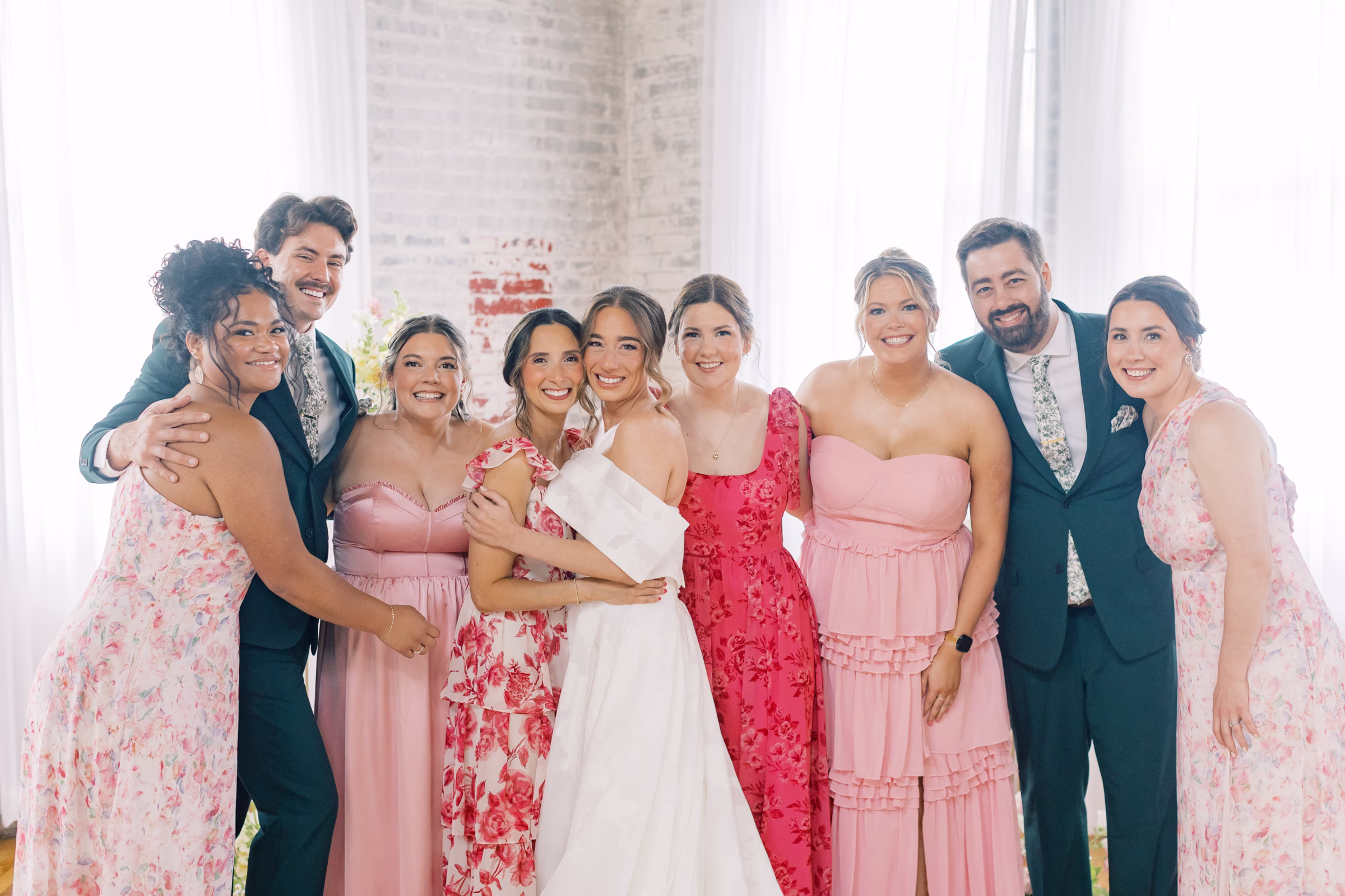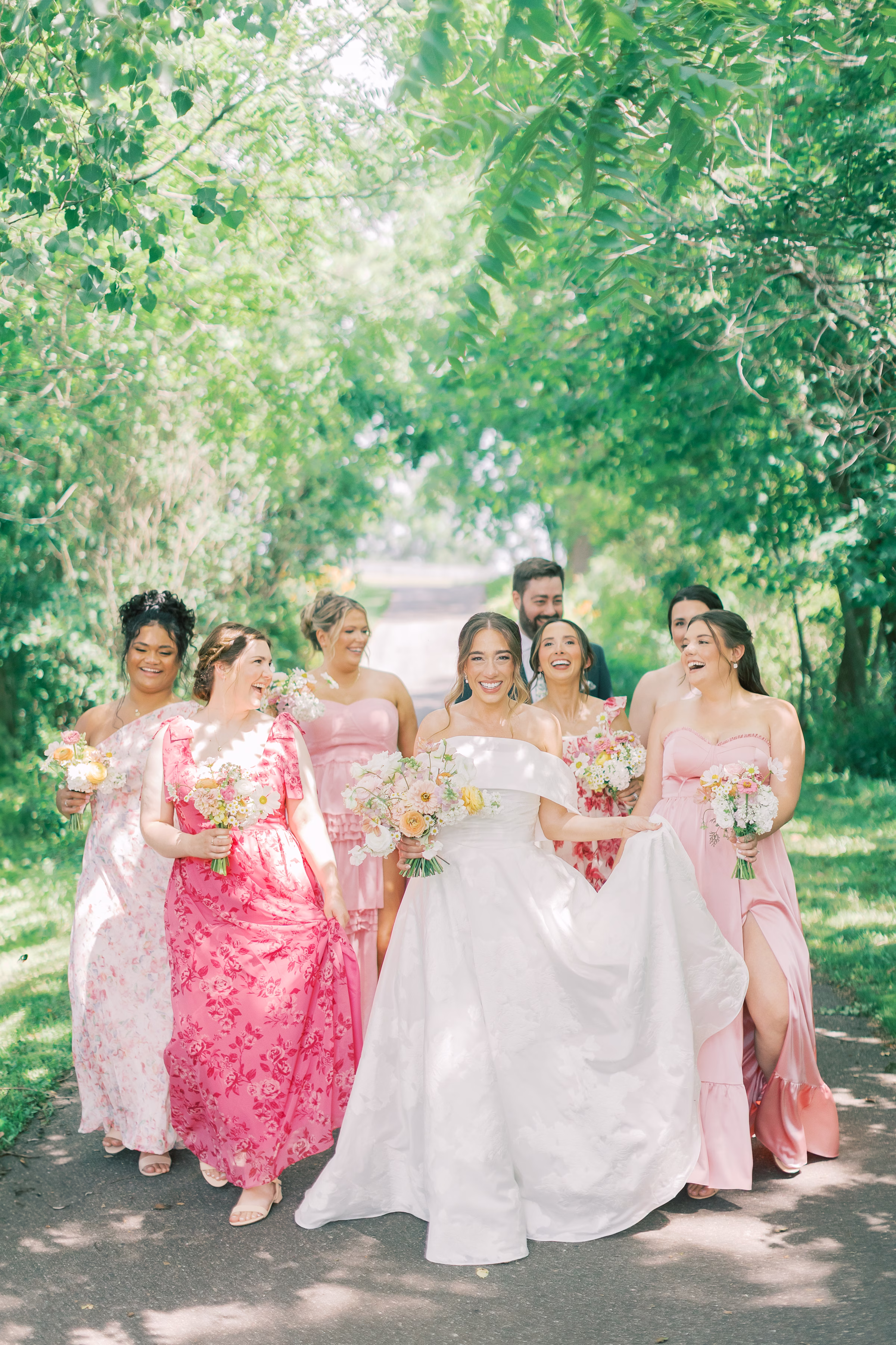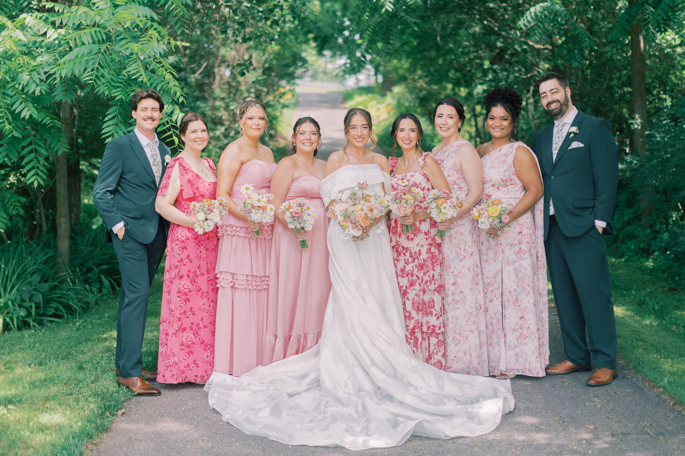 Boldly completing the wedding party, Mallory’s bridesmaids wore unique, floor-length dresses in varying textures, shades of pink and yes–patterns! The final group photos were full of personality while remaining cohesive.