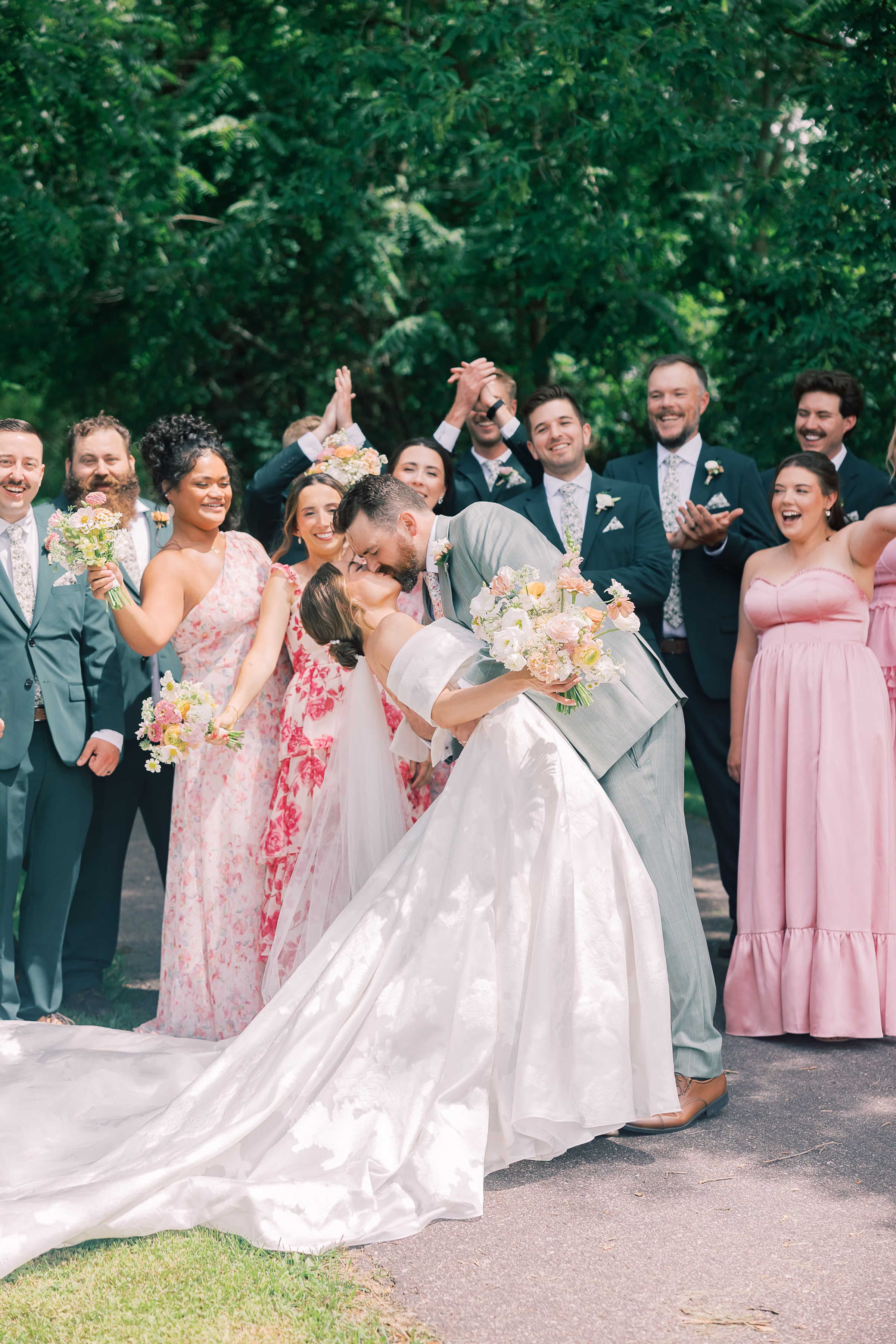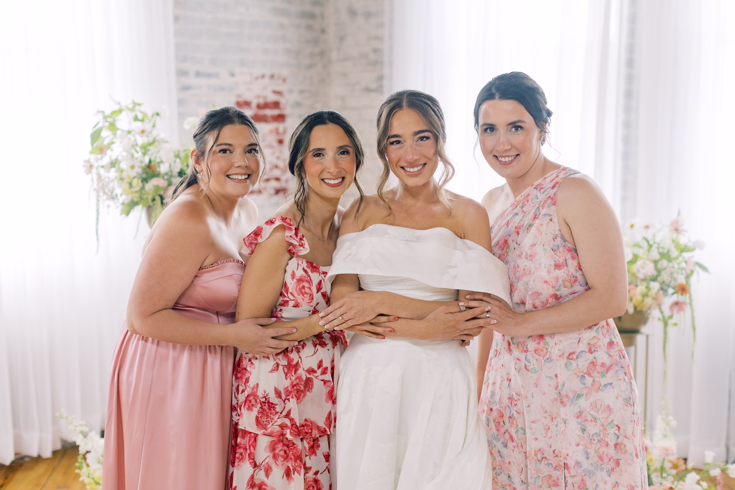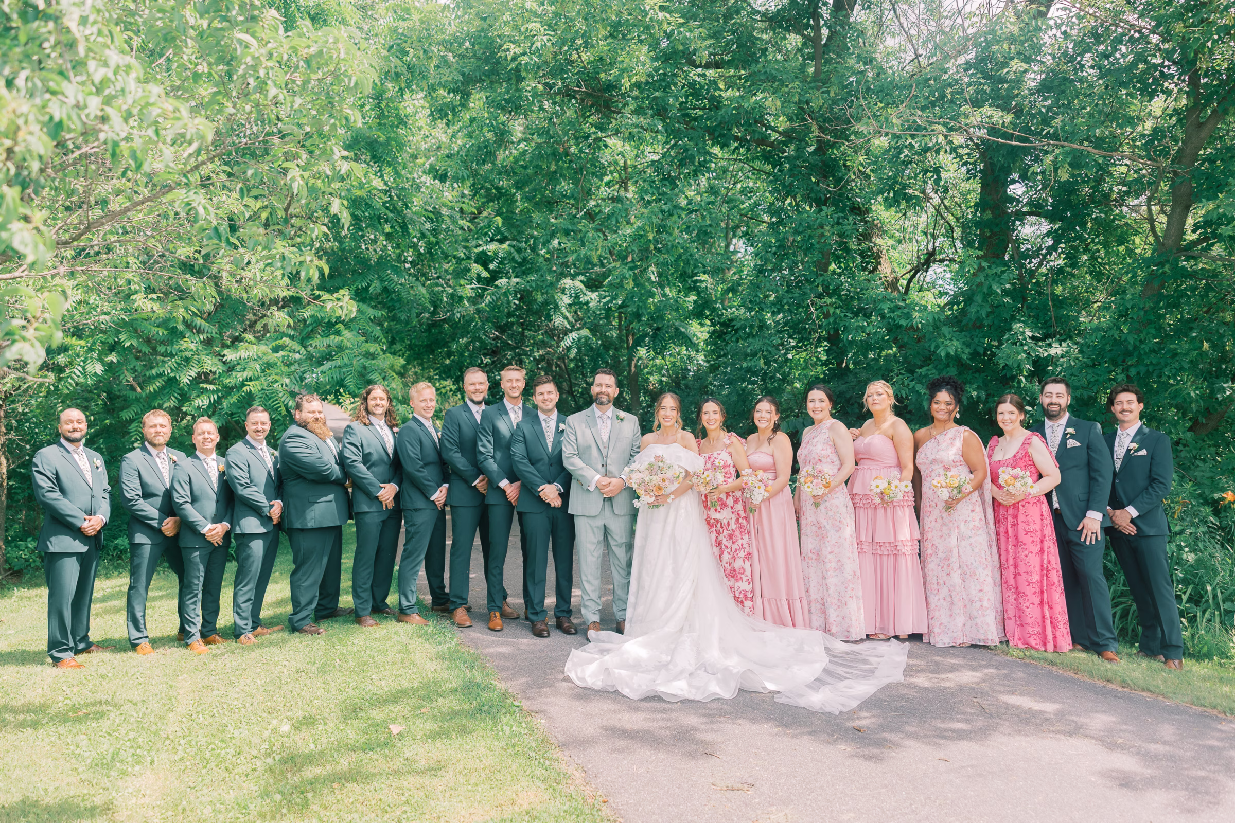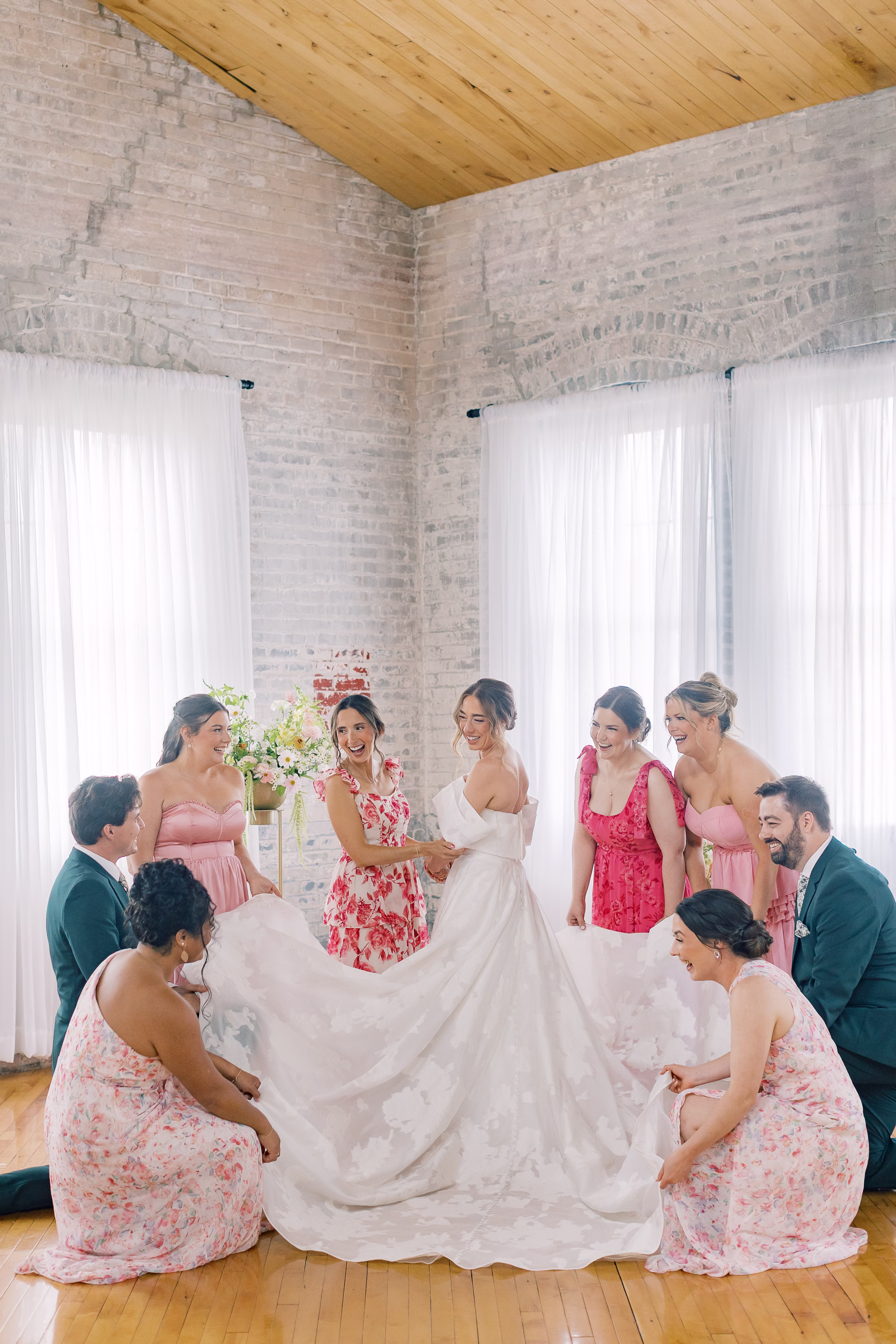 Boldly completing the wedding party, Mallory’s bridesmaids wore unique, floor-length dresses in varying textures, shades of pink and yes–patterns! The final group photos were full of personality while remaining cohesive.