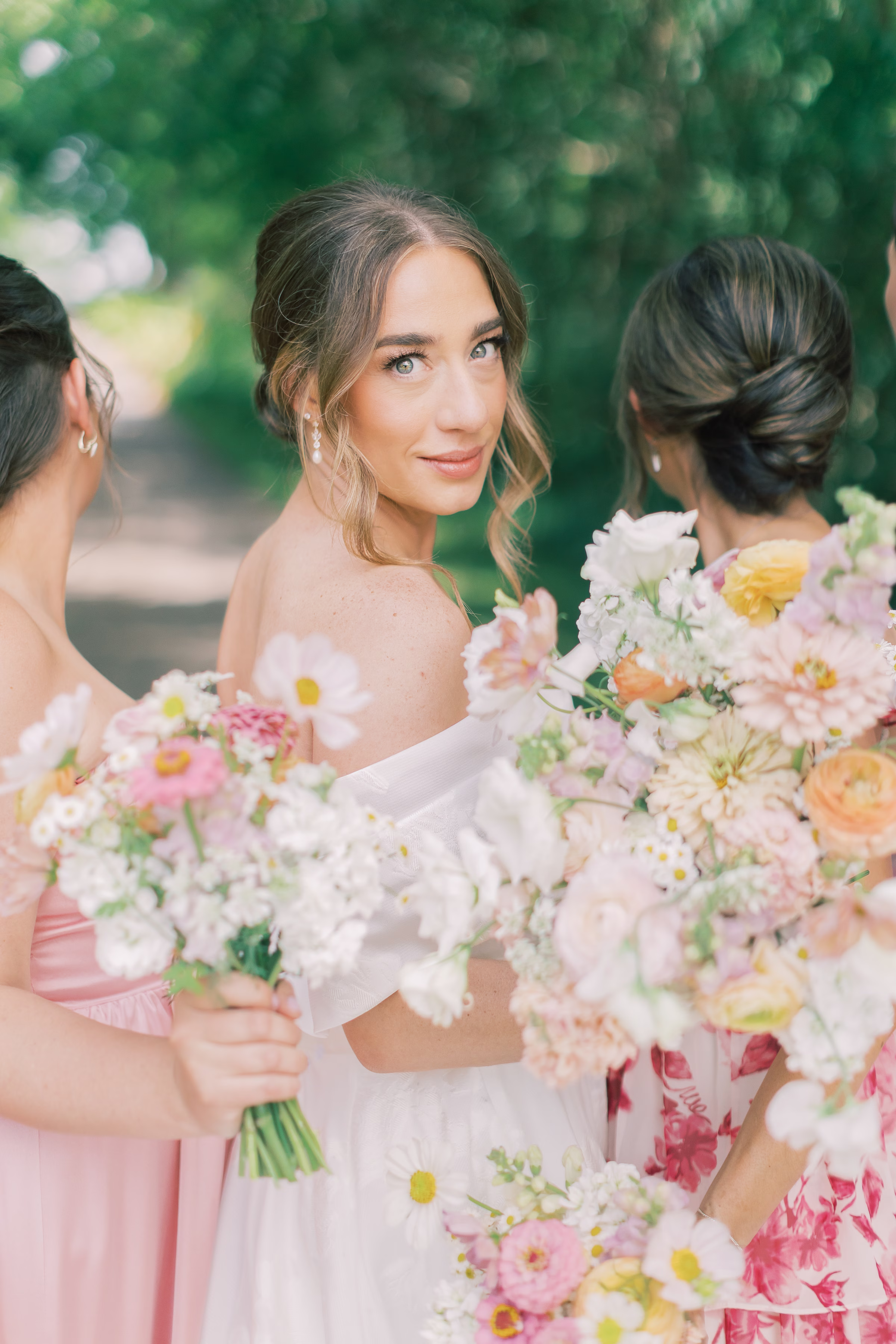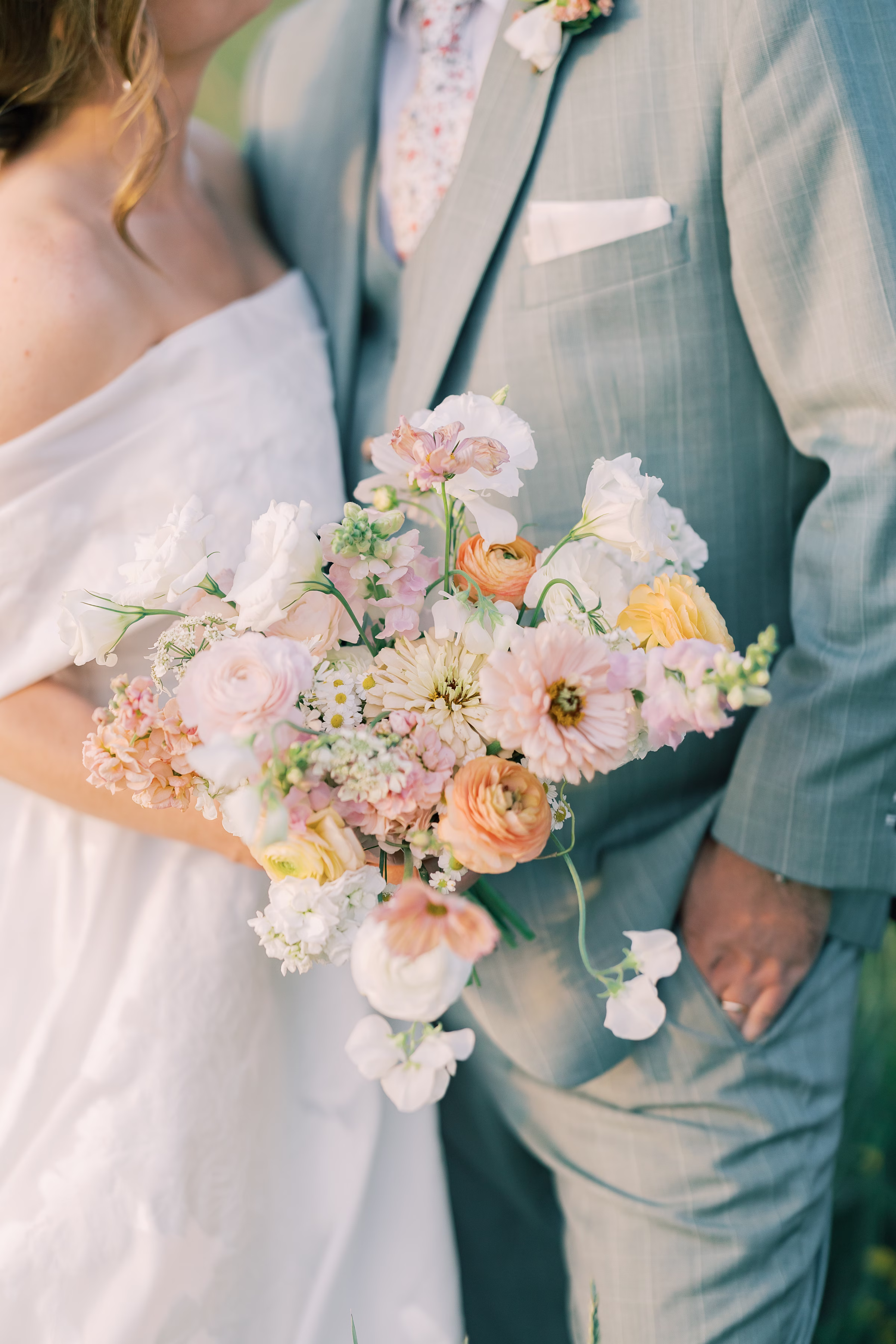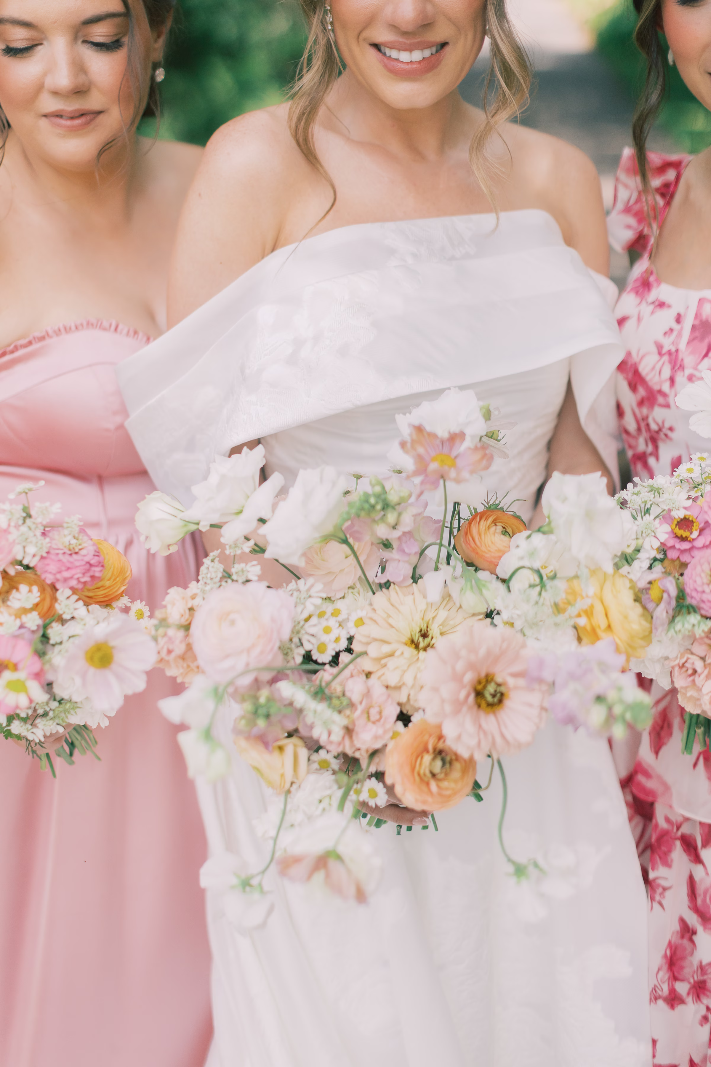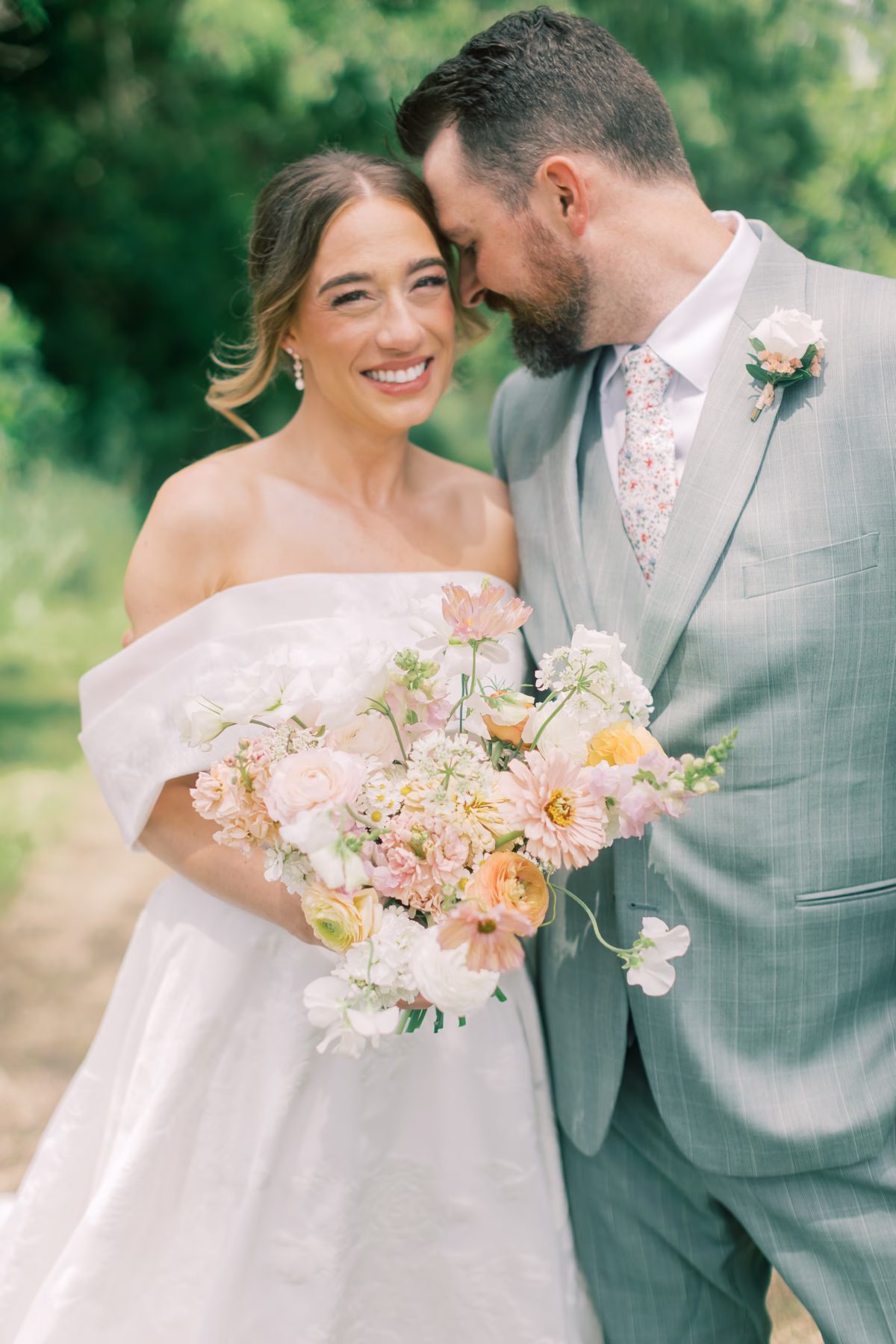 Sage green, forest green, white, peach, and varying shades of pink encompassed the couple’s garden-inspired color palette. Florist Pennycress Studio brought pops of color to life in airy, meadow-inspired floral arrangements. Mallory and her bridesmaids carried bouquets consisting of peach ranunculus, blush garden roses, zinnia, cosmos, white sweet peas, and clusters of soft pink stock flowers, further texturized with chamomile and Queen Anne’s lace.