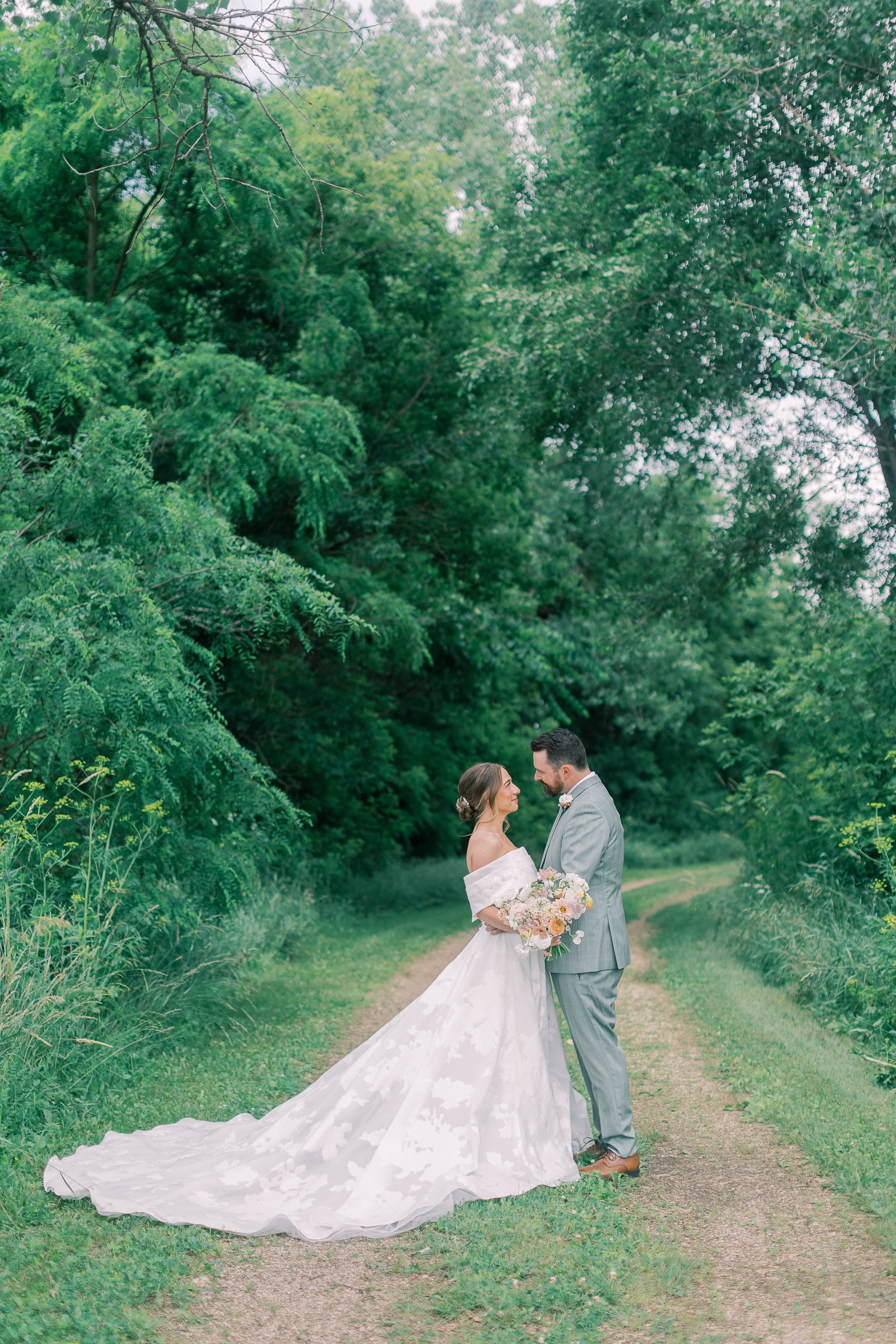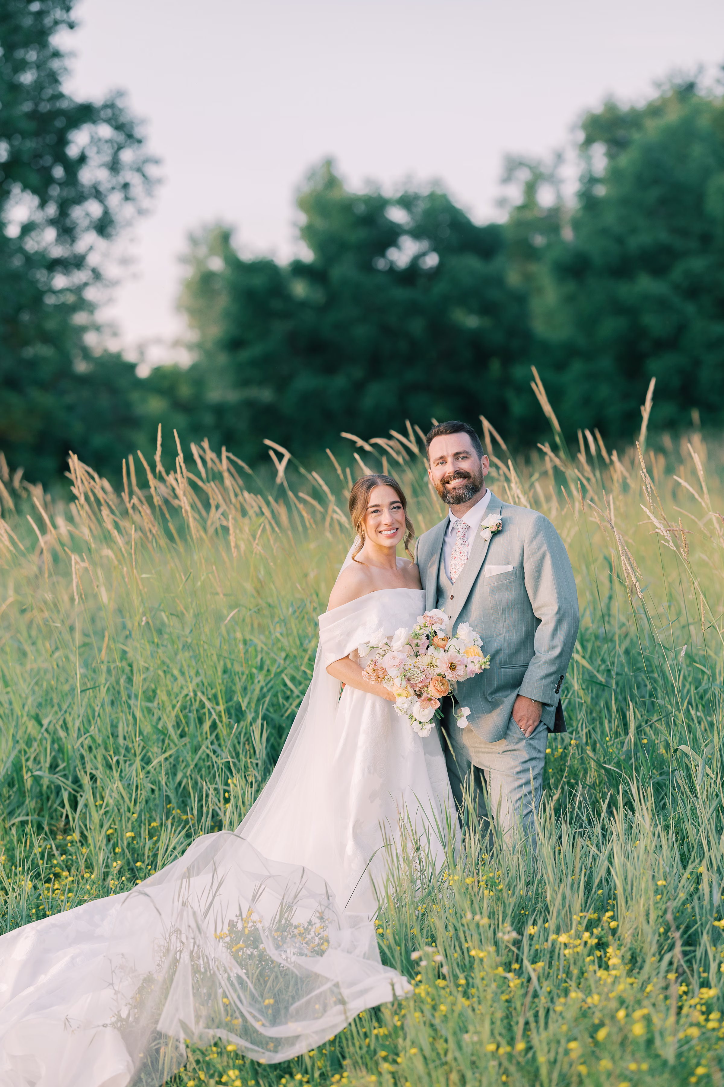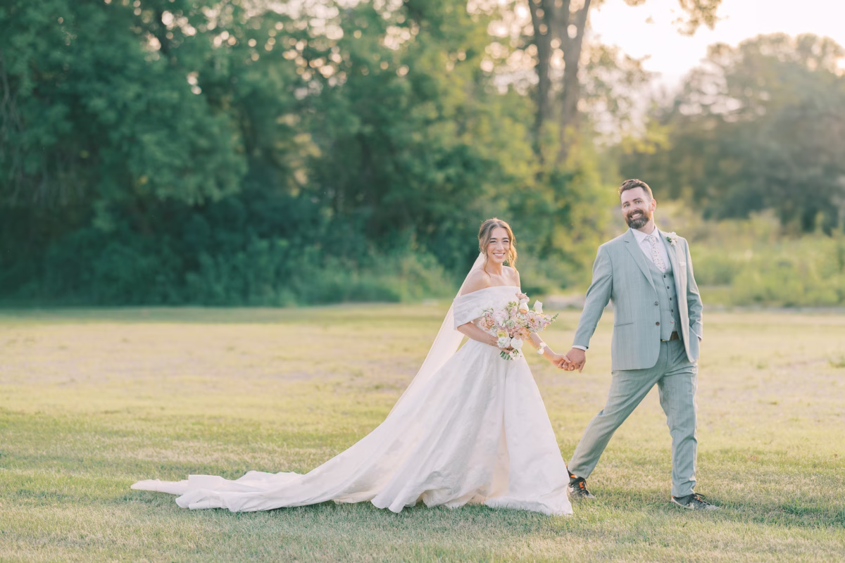 Sage green, forest green, white, peach, and varying shades of pink encompassed the couple’s garden-inspired color palette. Florist Pennycress Studio brought pops of color to life in airy, meadow-inspired floral arrangements. Mallory and her bridesmaids carried bouquets consisting of peach ranunculus, blush garden roses, zinnia, cosmos, white sweet peas, and clusters of soft pink stock flowers, further texturized with chamomile and Queen Anne’s lace.