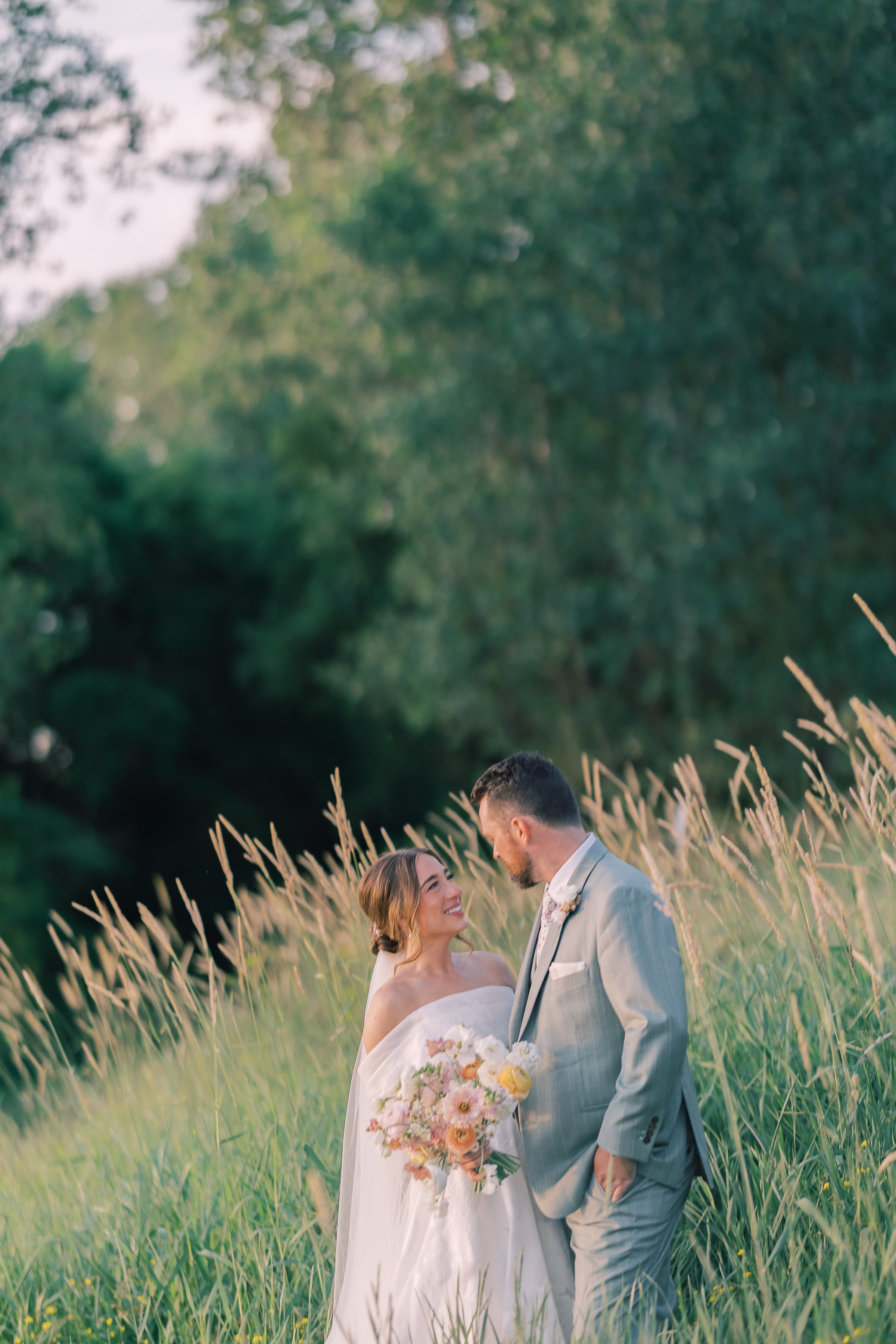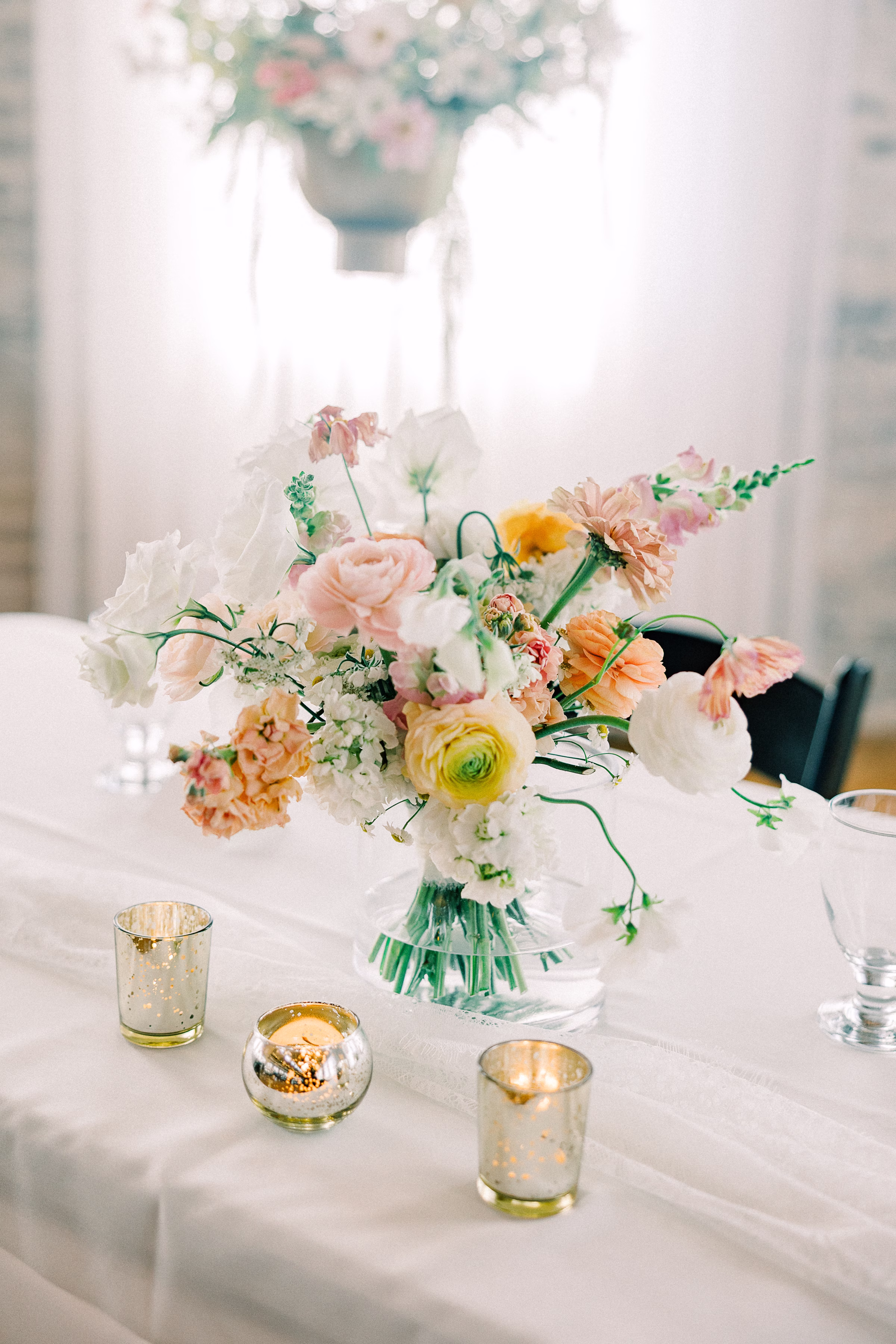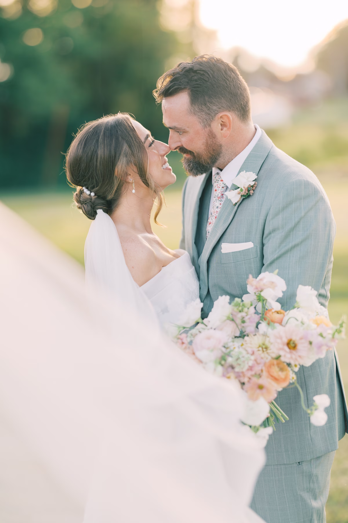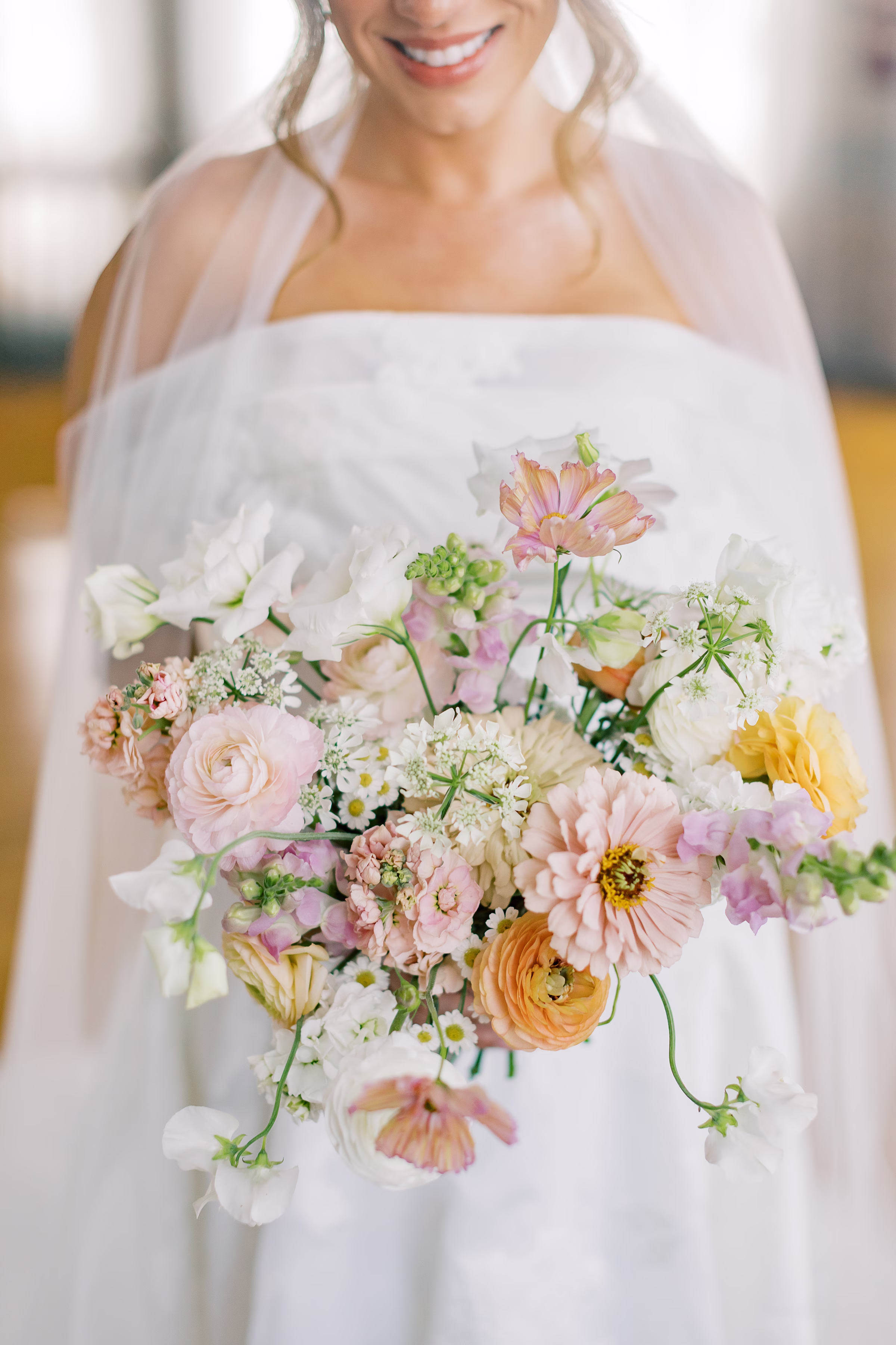 Sage green, forest green, white, peach, and varying shades of pink encompassed the couple’s garden-inspired color palette. Florist Pennycress Studio brought pops of color to life in airy, meadow-inspired floral arrangements. Mallory and her bridesmaids carried bouquets consisting of peach ranunculus, blush garden roses, zinnia, cosmos, white sweet peas, and clusters of soft pink stock flowers, further texturized with chamomile and Queen Anne’s lace.
