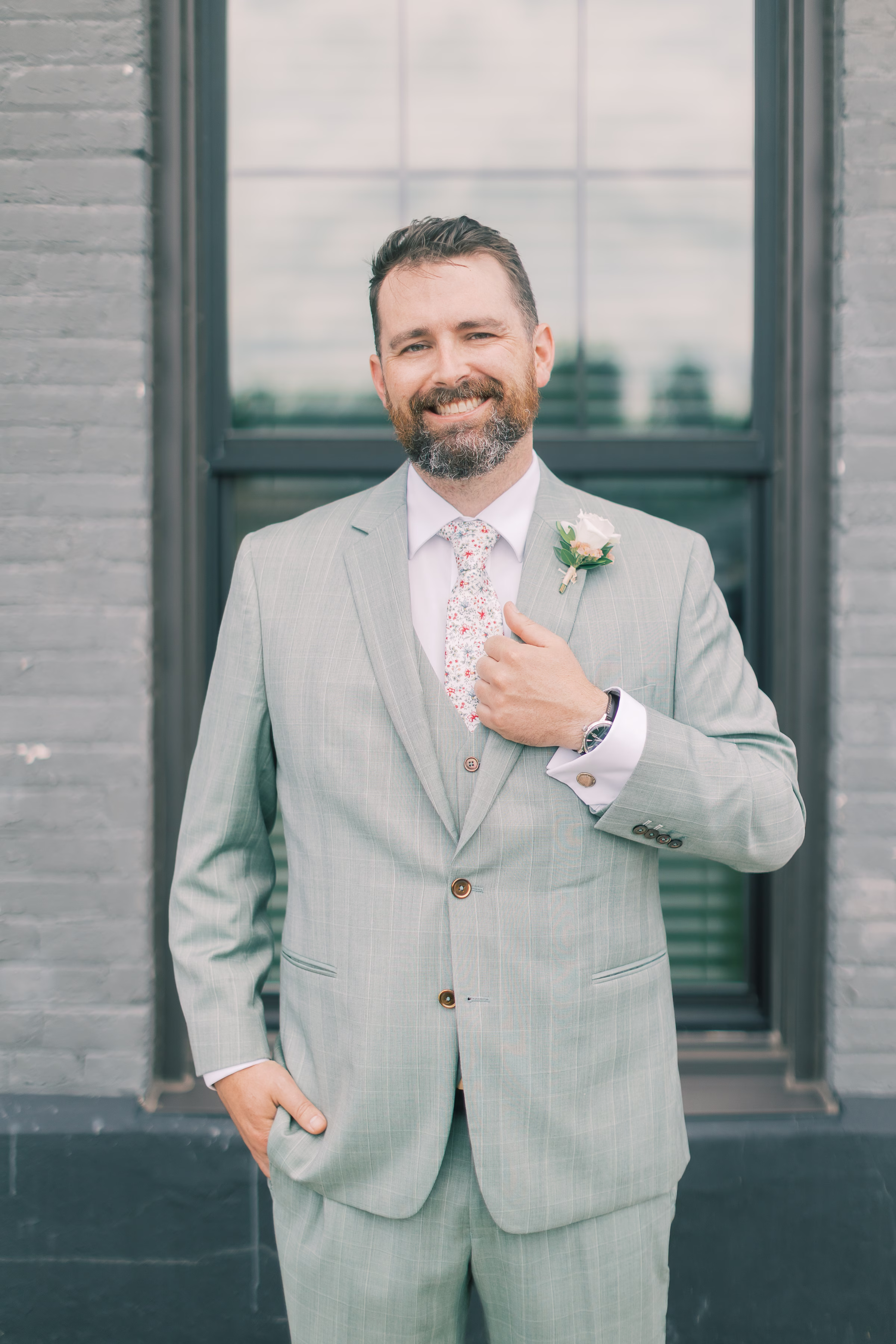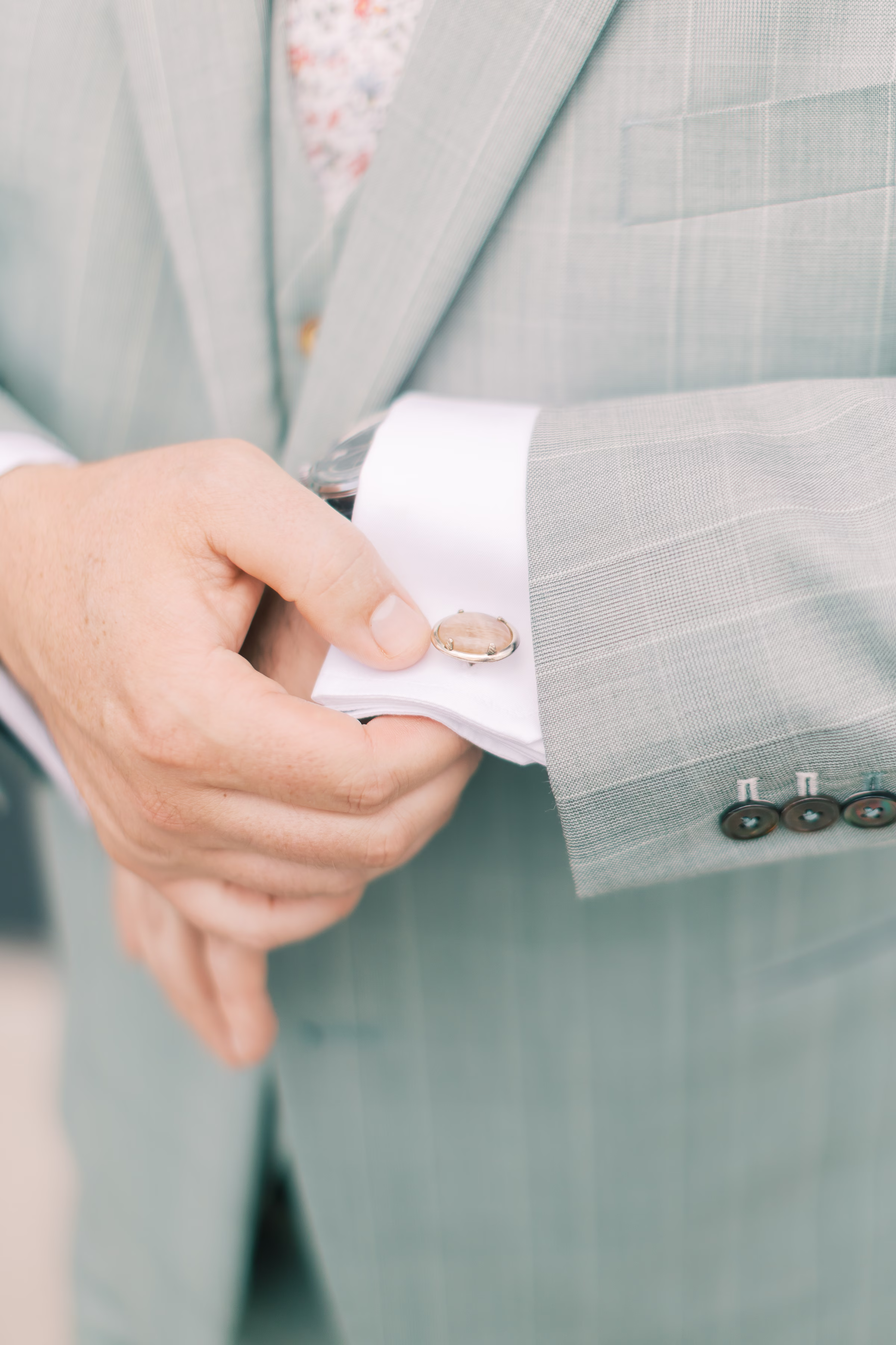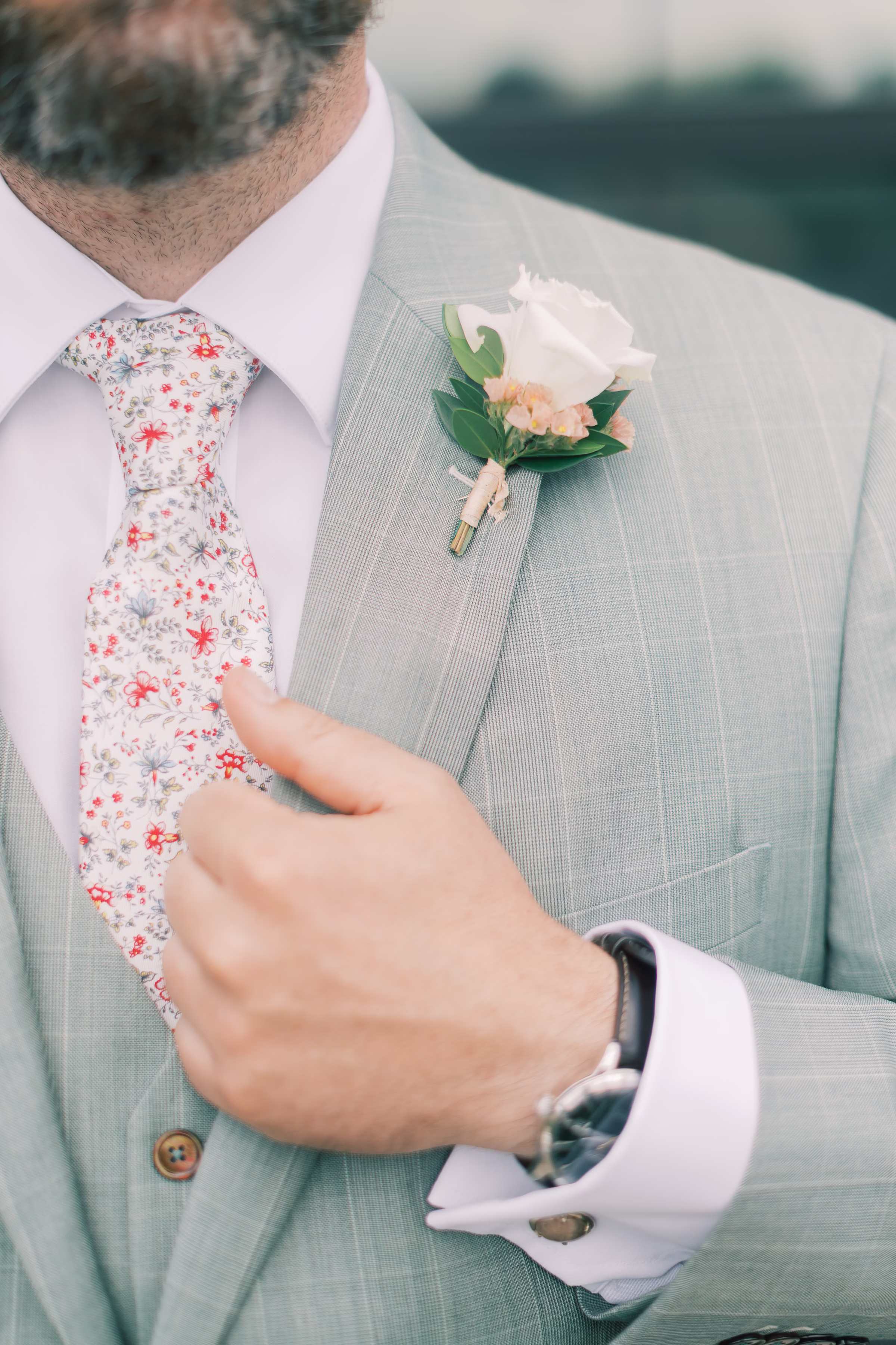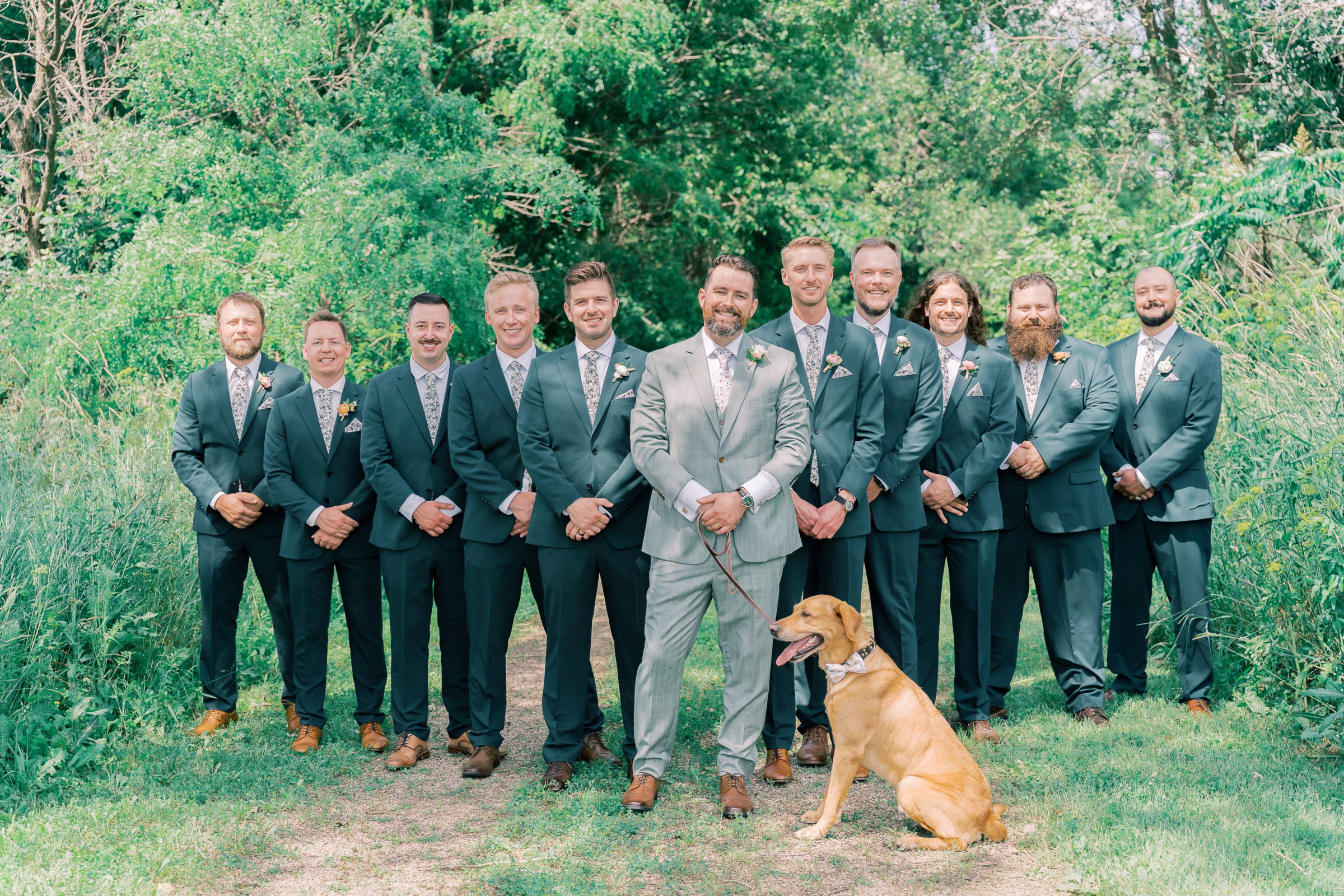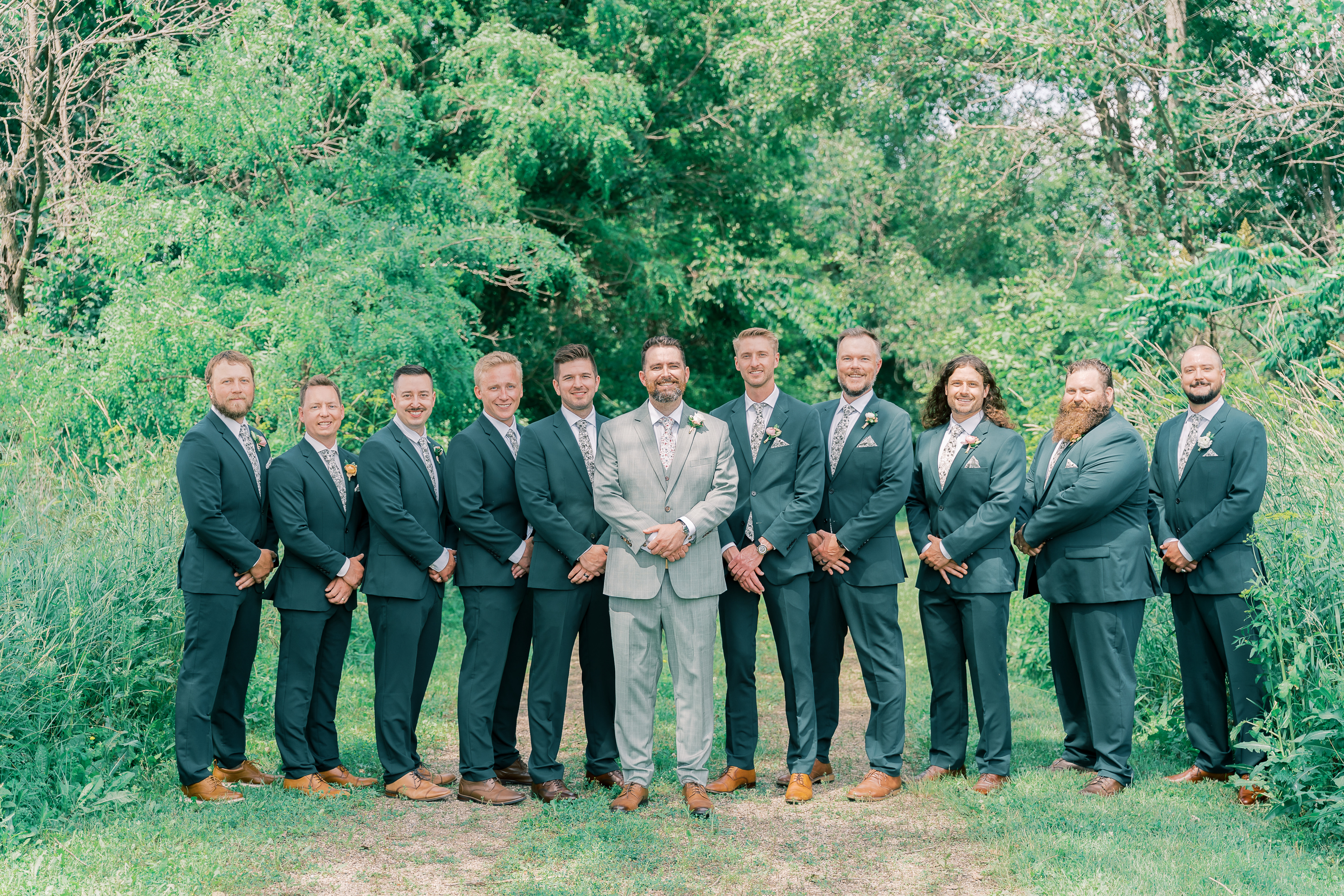 Green was the theme for menswear, with Ryan wearing a pinstripe check sage suit with a matching vest, while his groomsmen wore solid forest green. They otherwise matched with white undershirts, brown dress shoes, floral boutonnieres, and floral-patterned ties.
