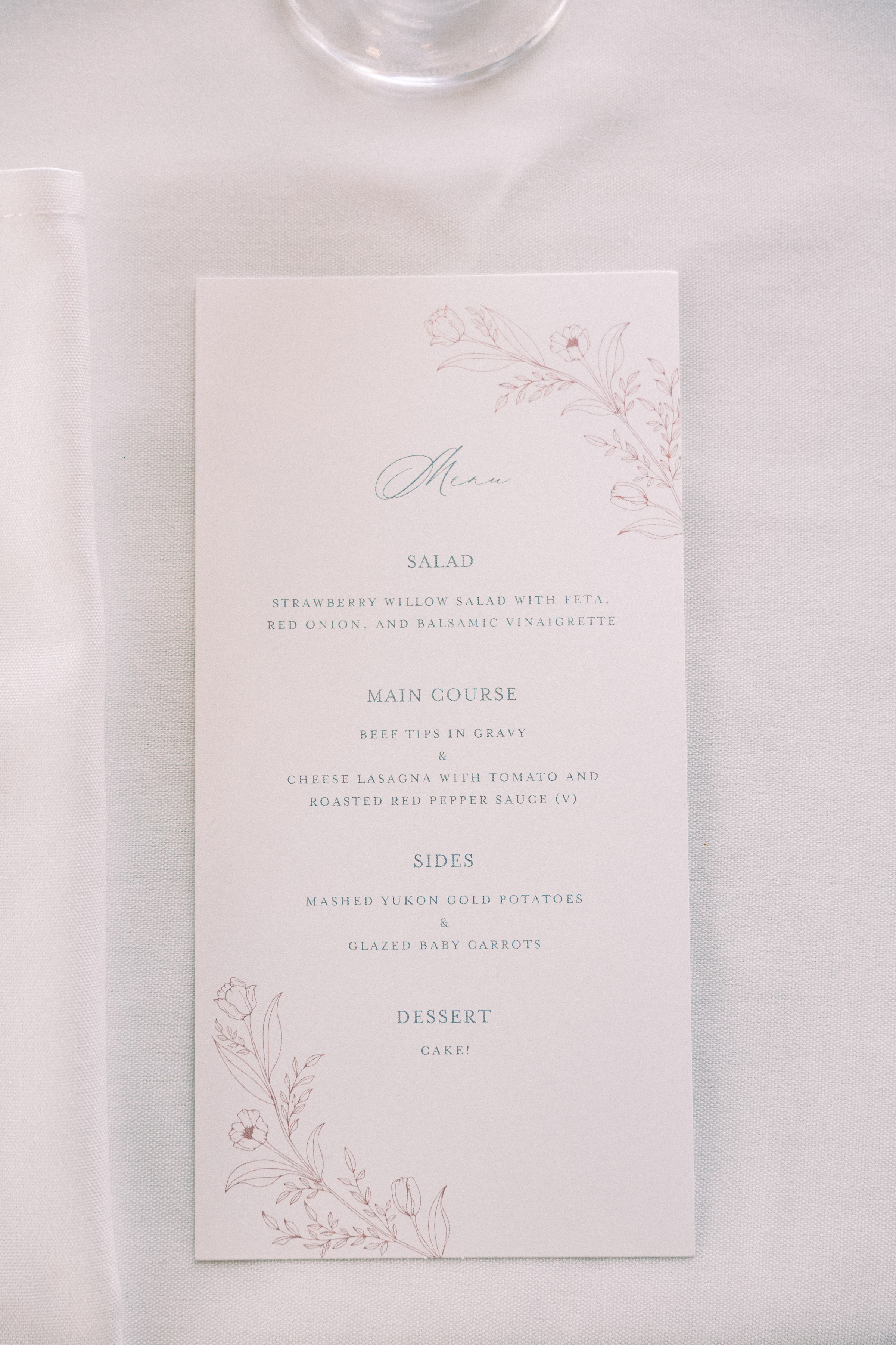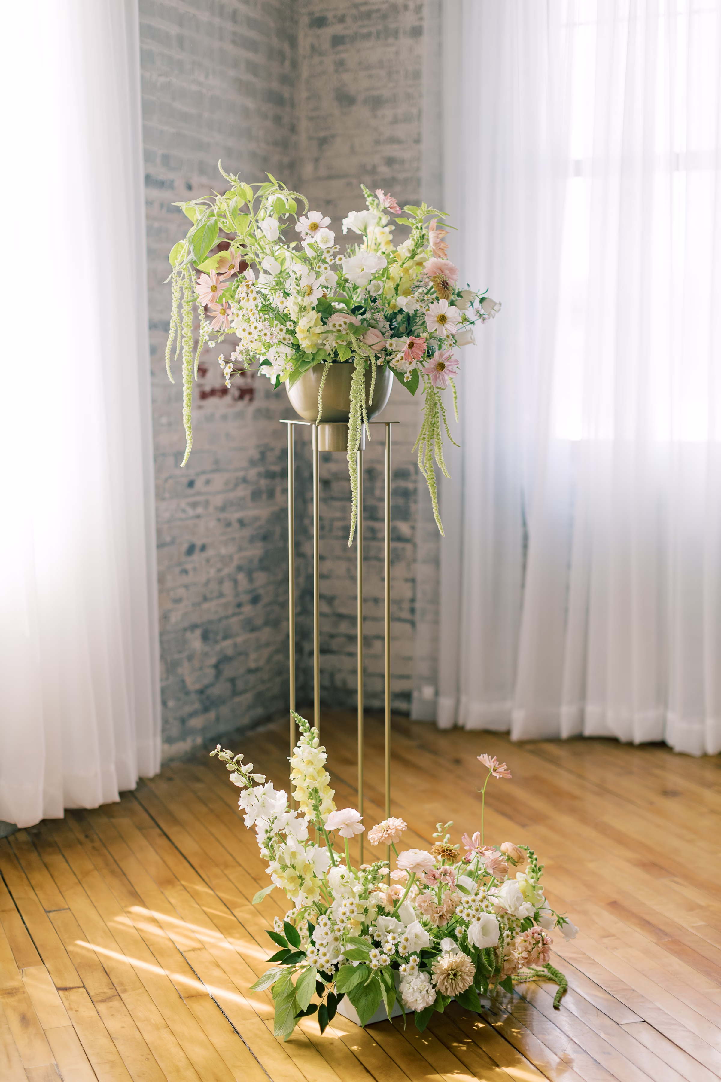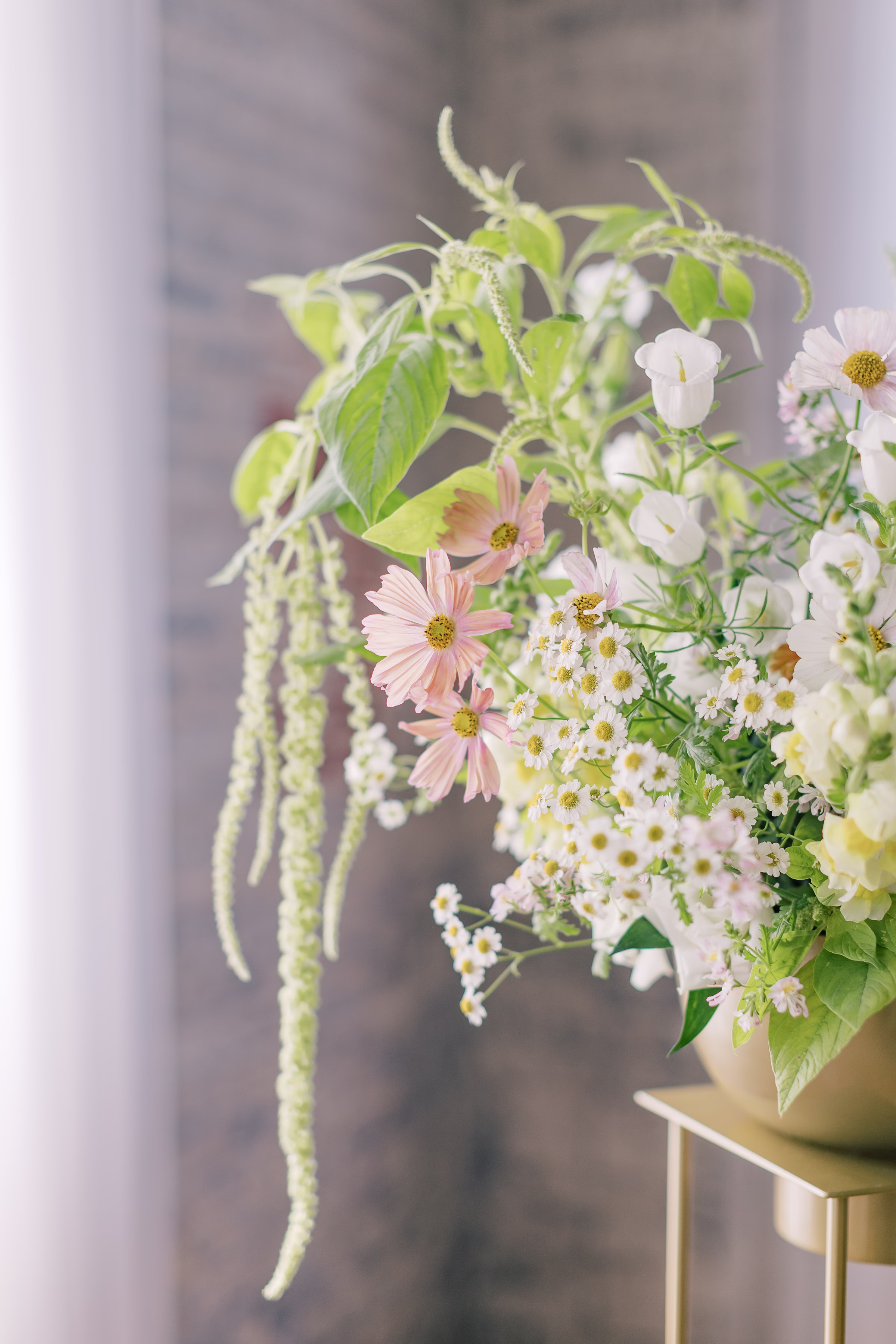 Additional greenery and cascading green amaranthus (added) in the floral décor, most notably in the ceremony backdrop and table arrangements, ranging from bud vases to mini bouquets.