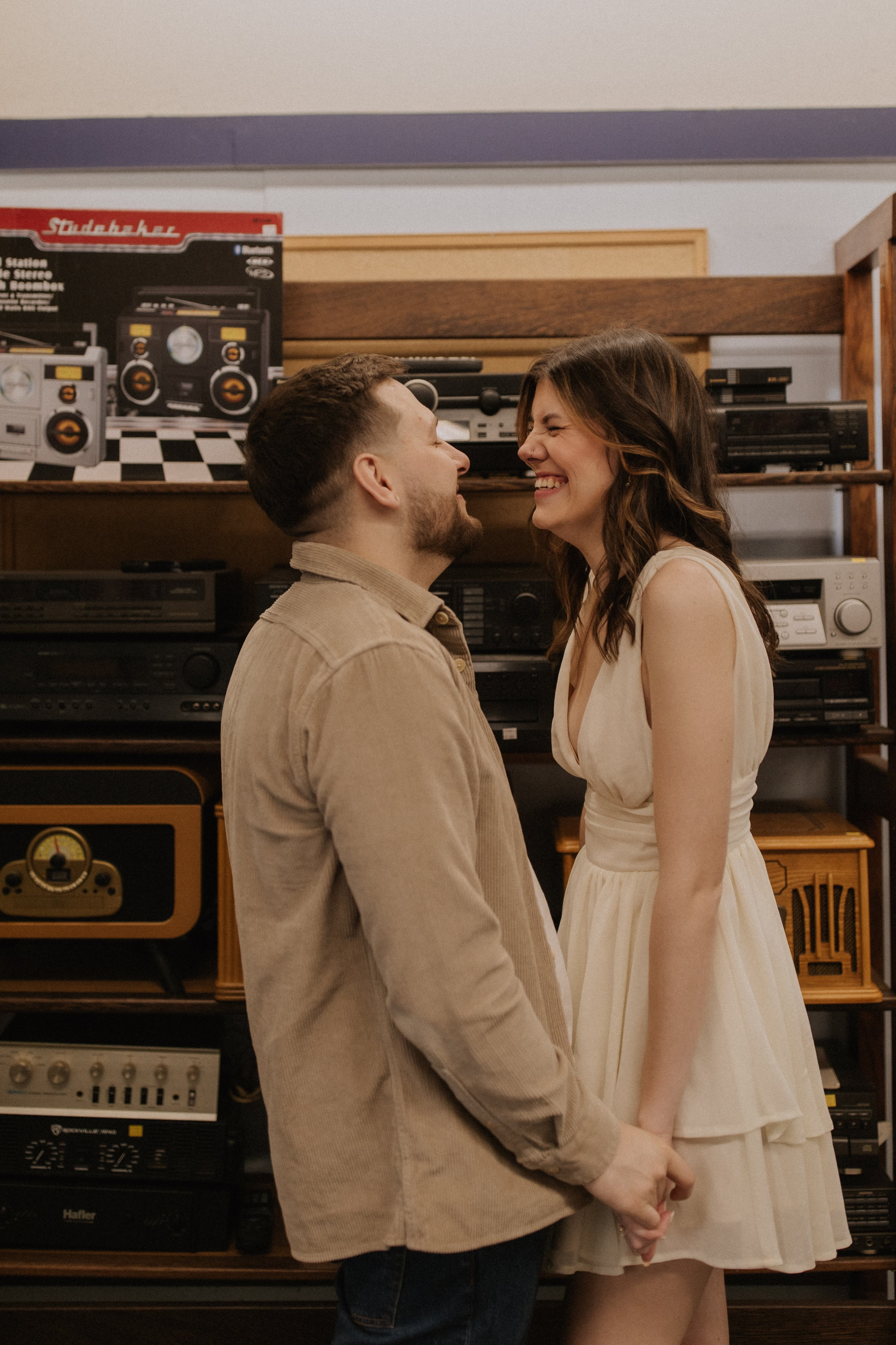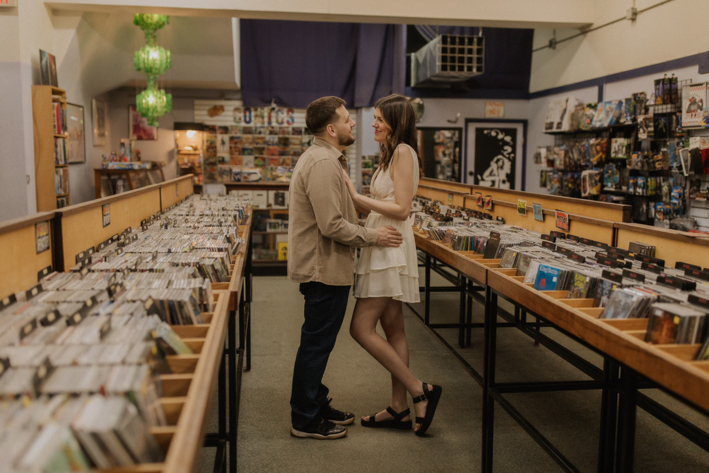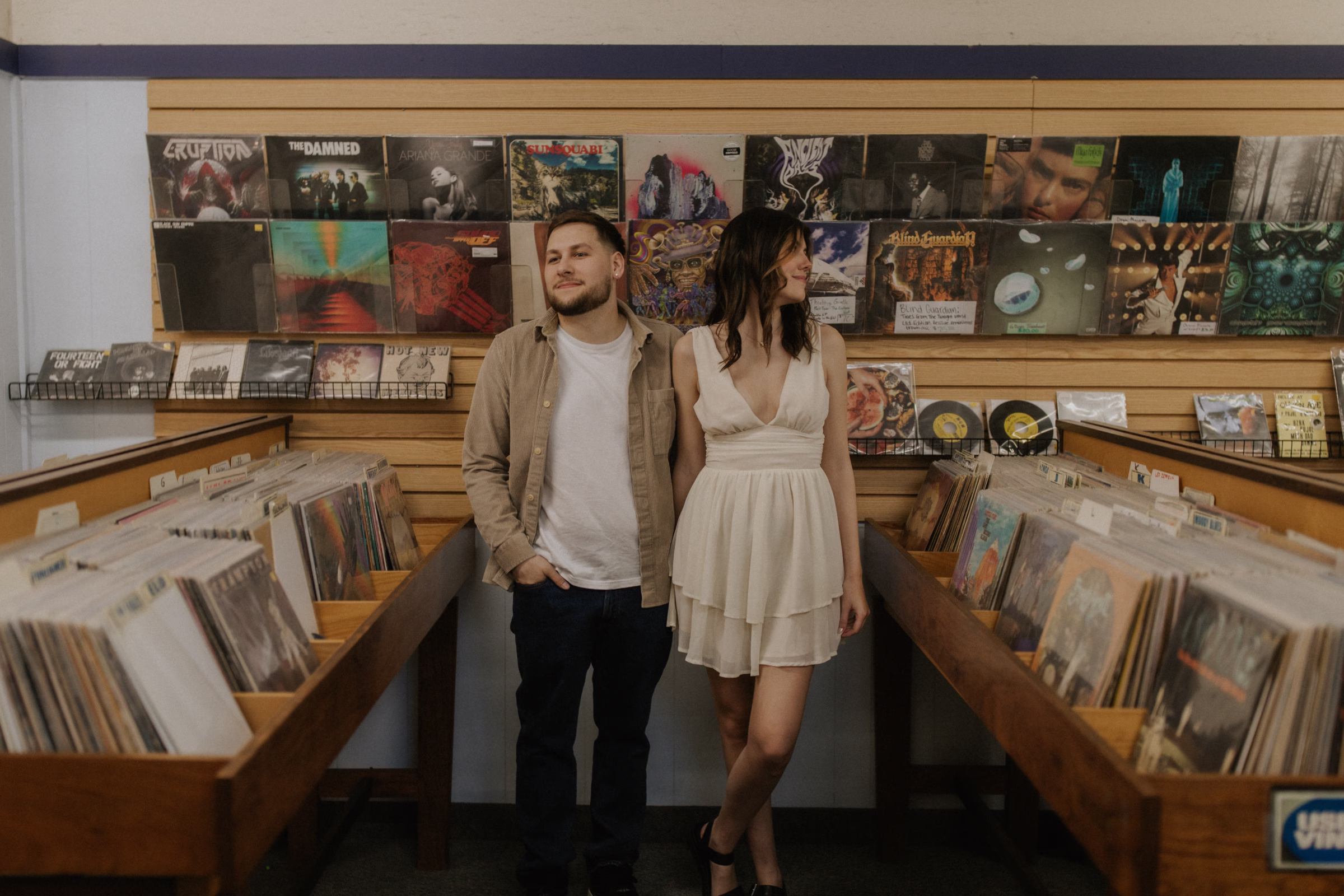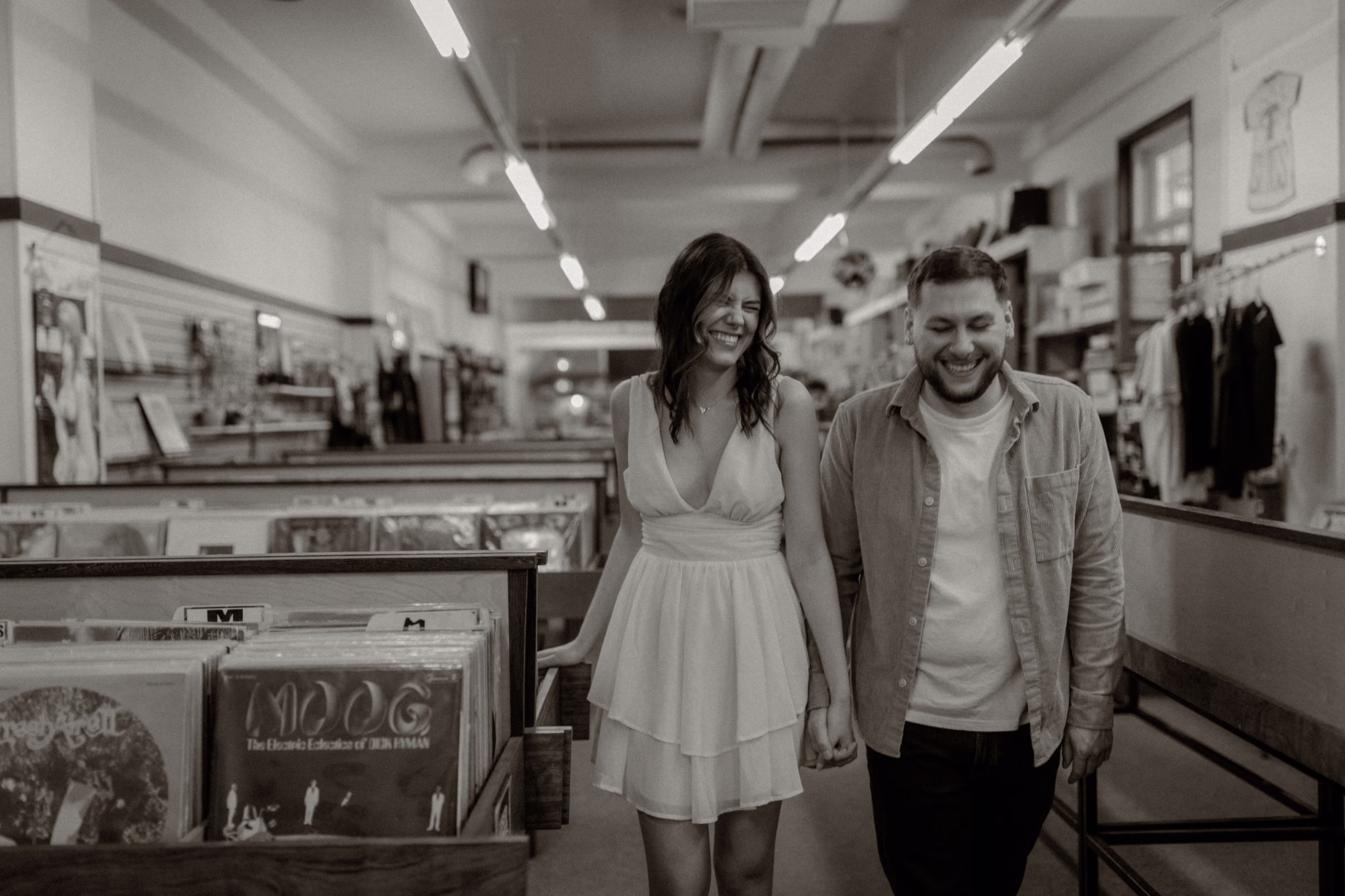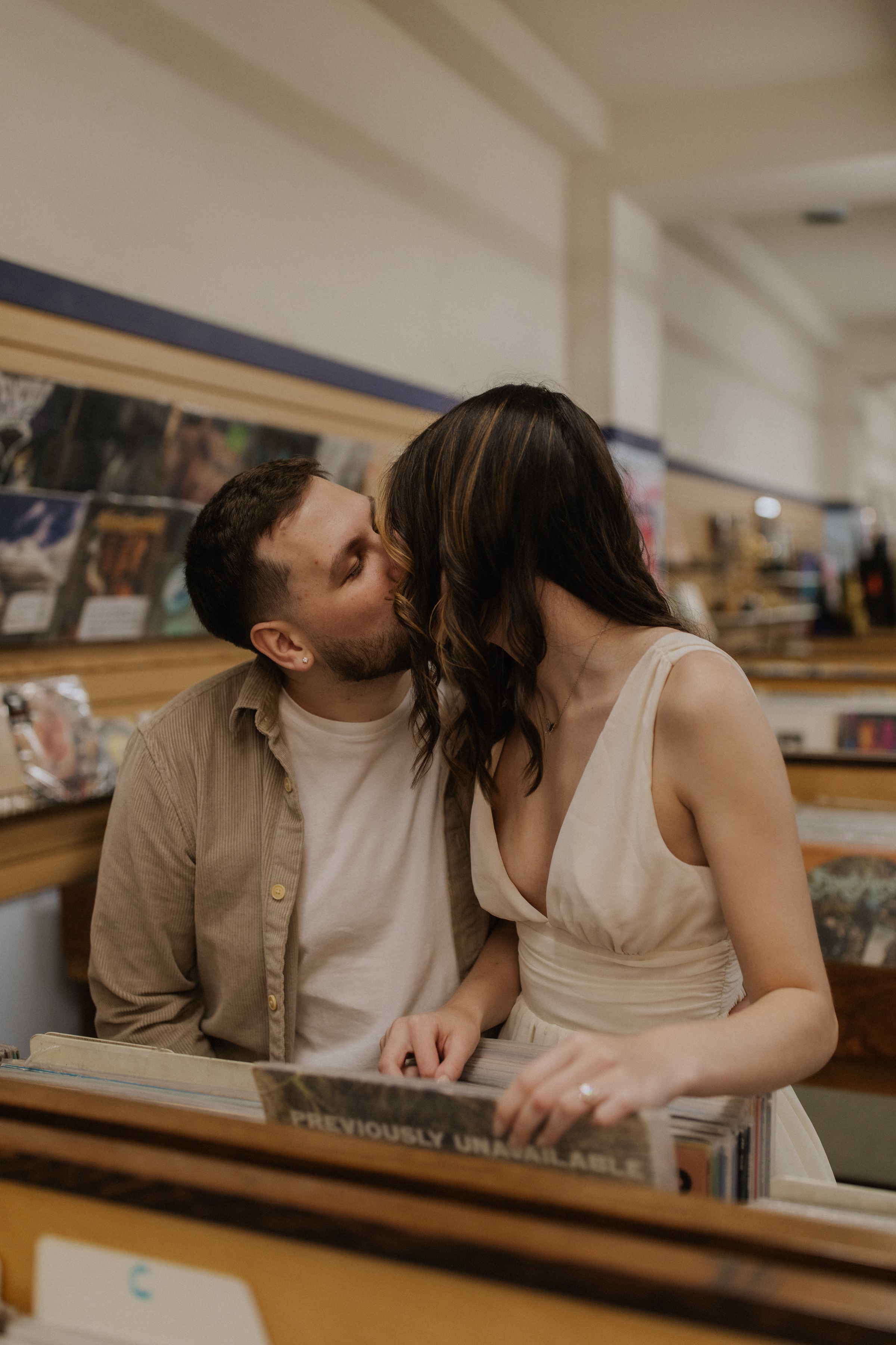 The music themes continued down the street at Deaf Ear Record Exchange, a fun and romantic spot to browse vinyl records, CDs, and collectibles. Afterwards, Marilyn & Jared embraced the small-town architecture, taking photographs along downtown walkways.