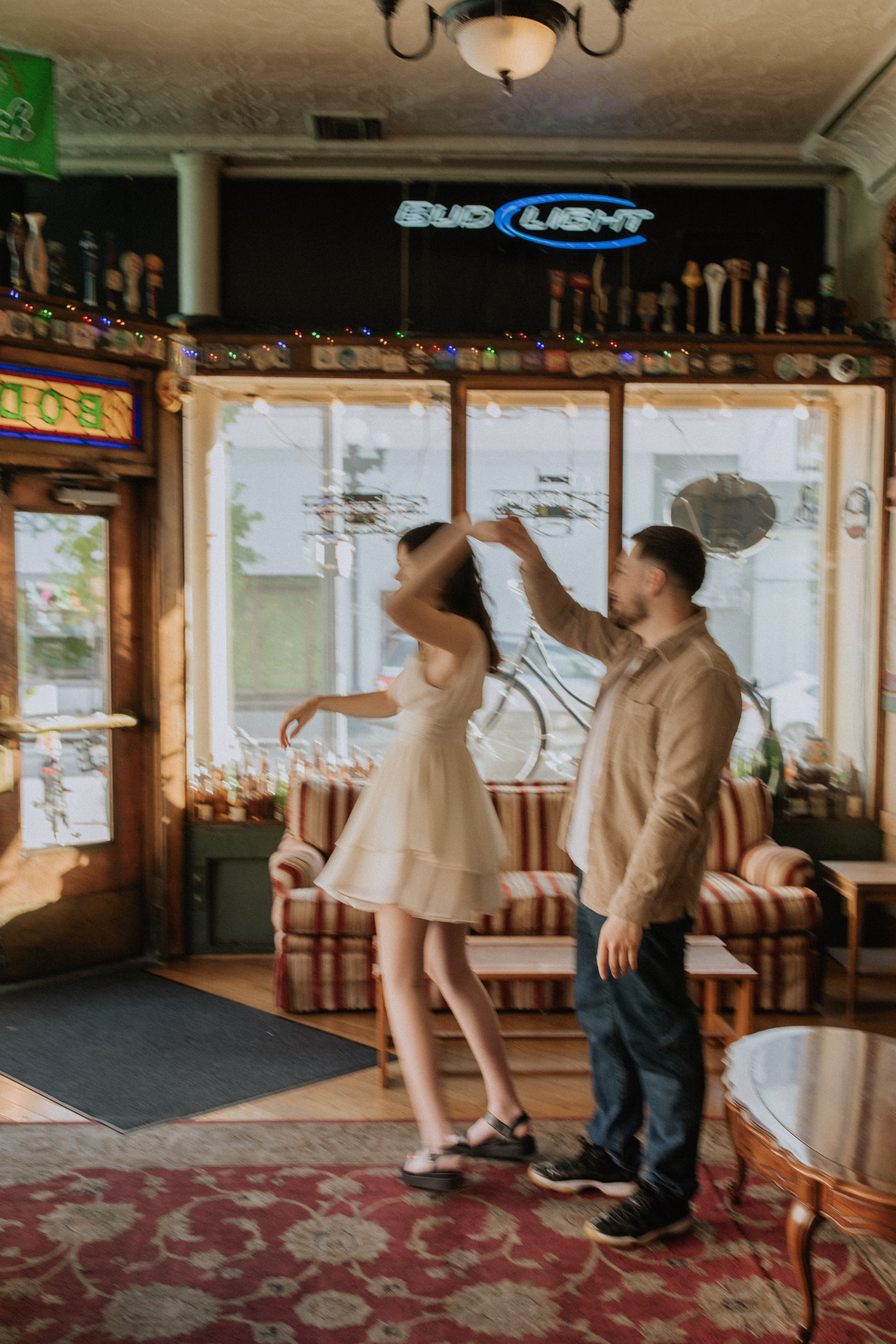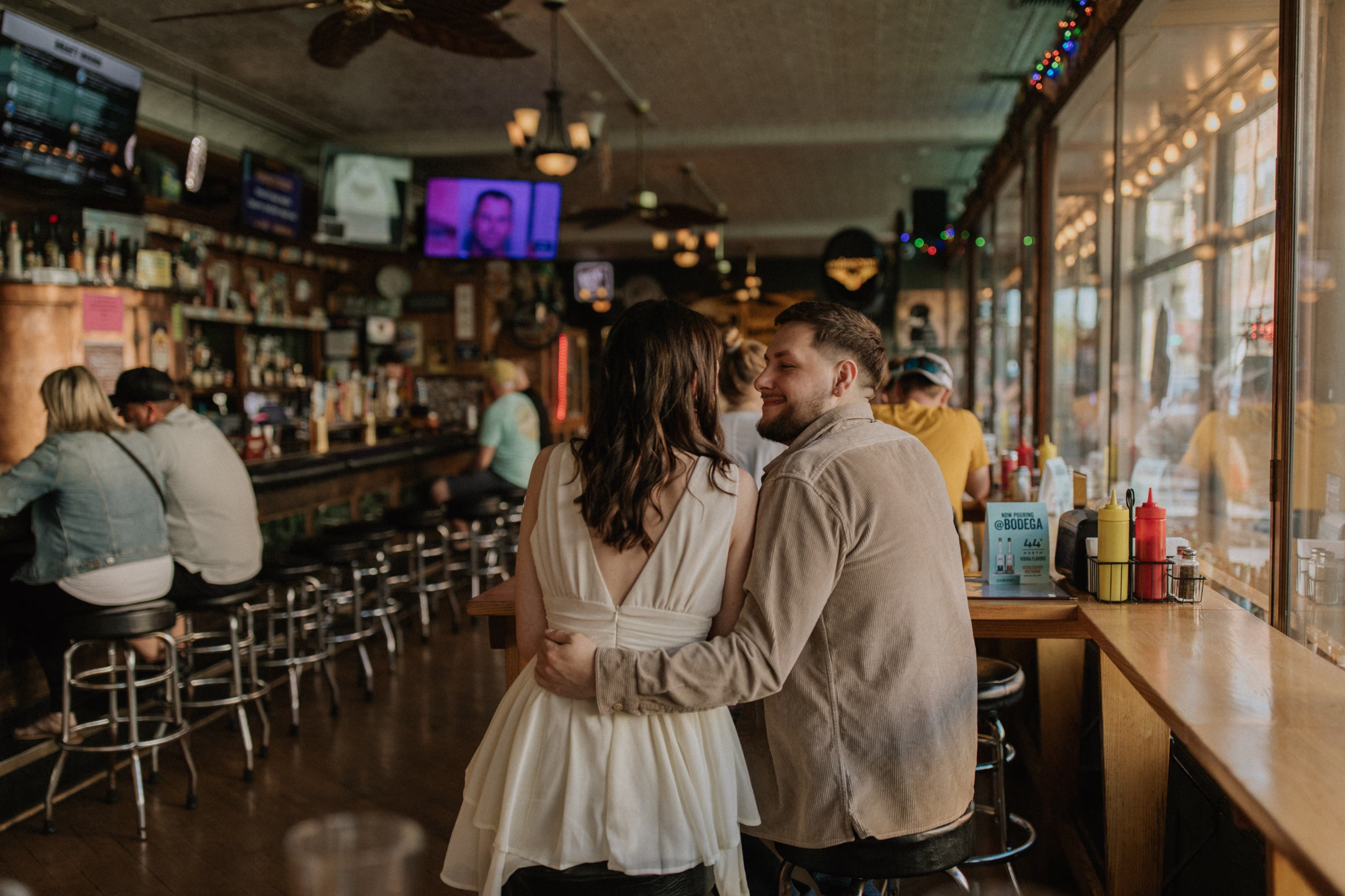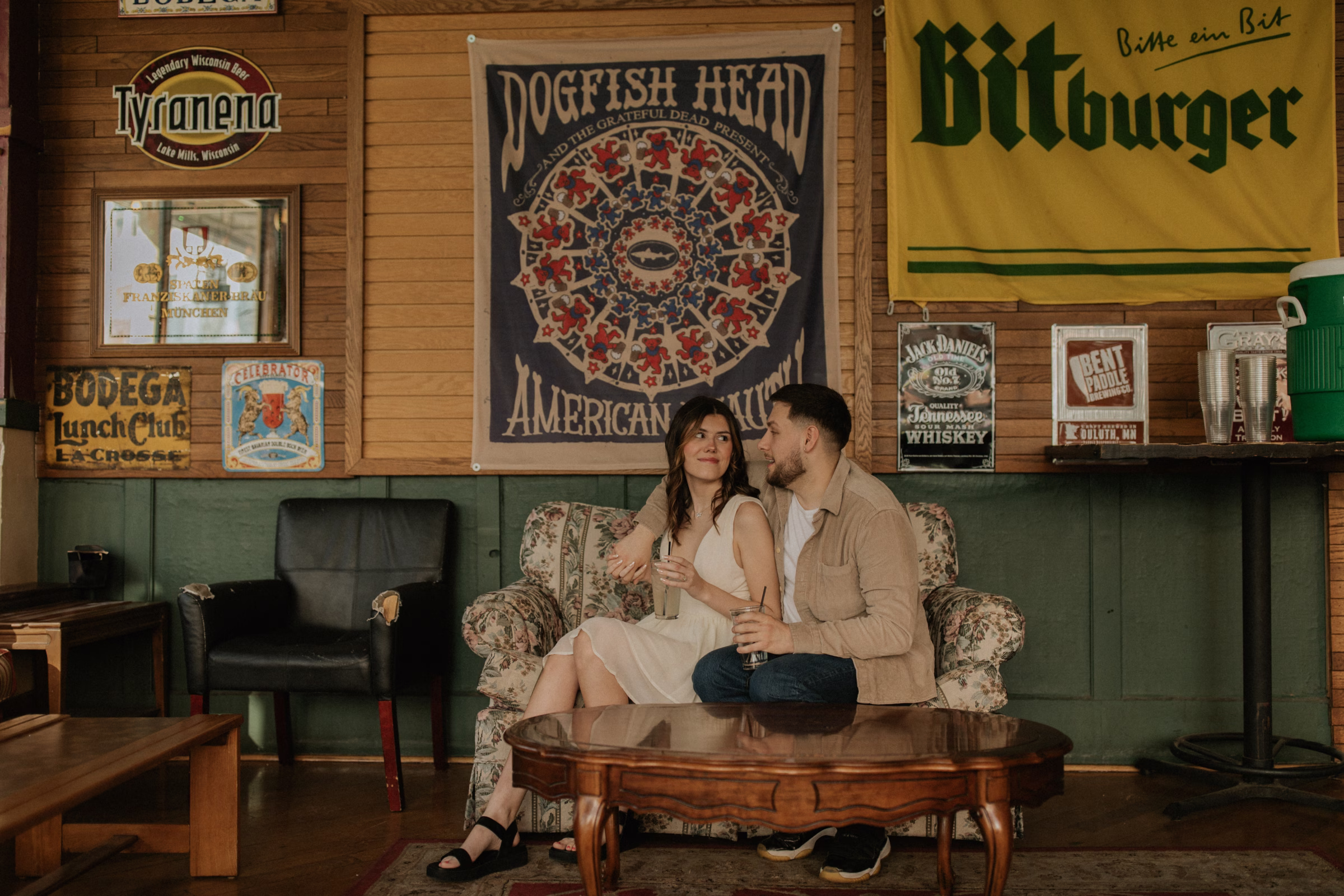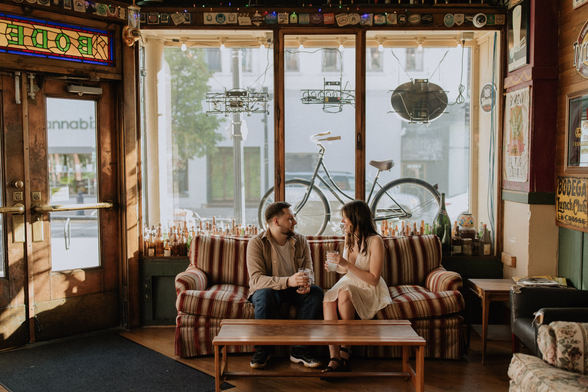 La Crosse, Wisconsin, has many scenic locations, and Marilyn & Jared wanted to include some of their favorites in their engagement photos. They began at Bodega Brew Pub, a cozy space known for drinks, gatherings, and live music.