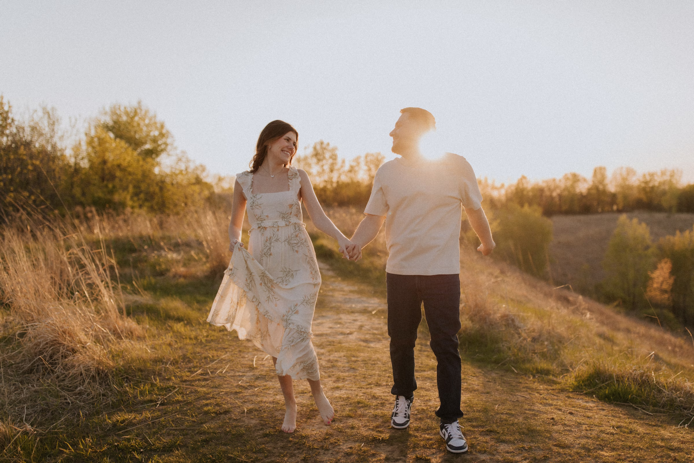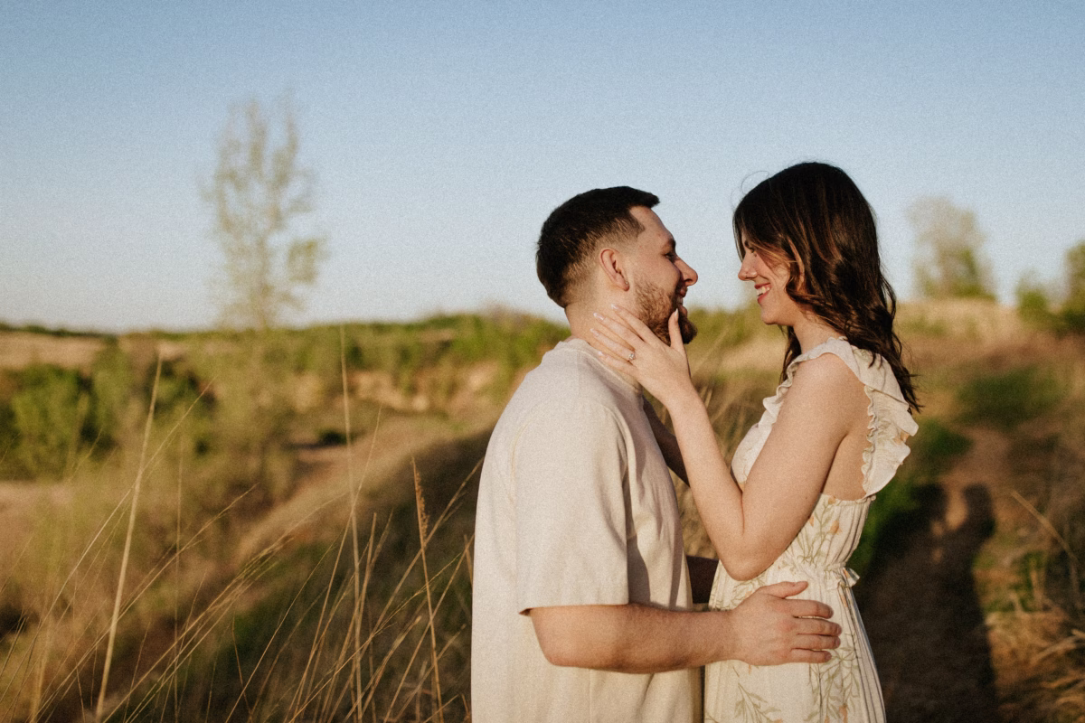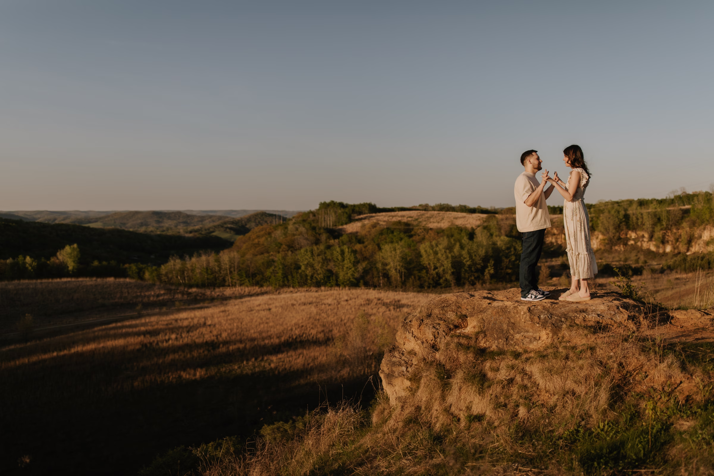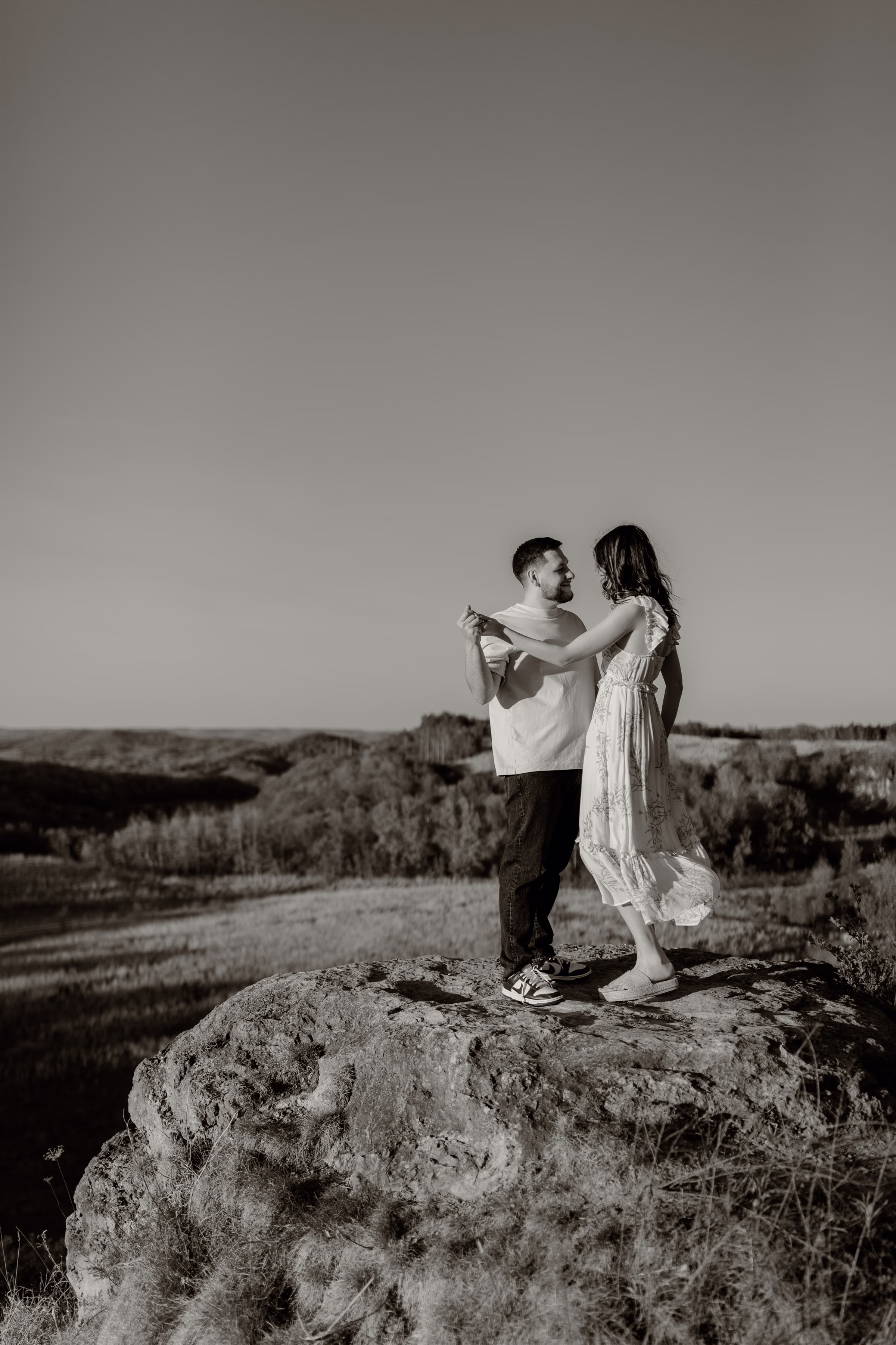 Outfit and location changes are a major consideration in engagement photography. For their final photos, taken at sunset, the couple embraced La Crosse’s beautiful bluffs and rolling hills. Both Marilyn & Jared styled second looks fitting the prairie atmosphere. The results were a combination of joyful, golden hour portraits and sweet, candid moments.