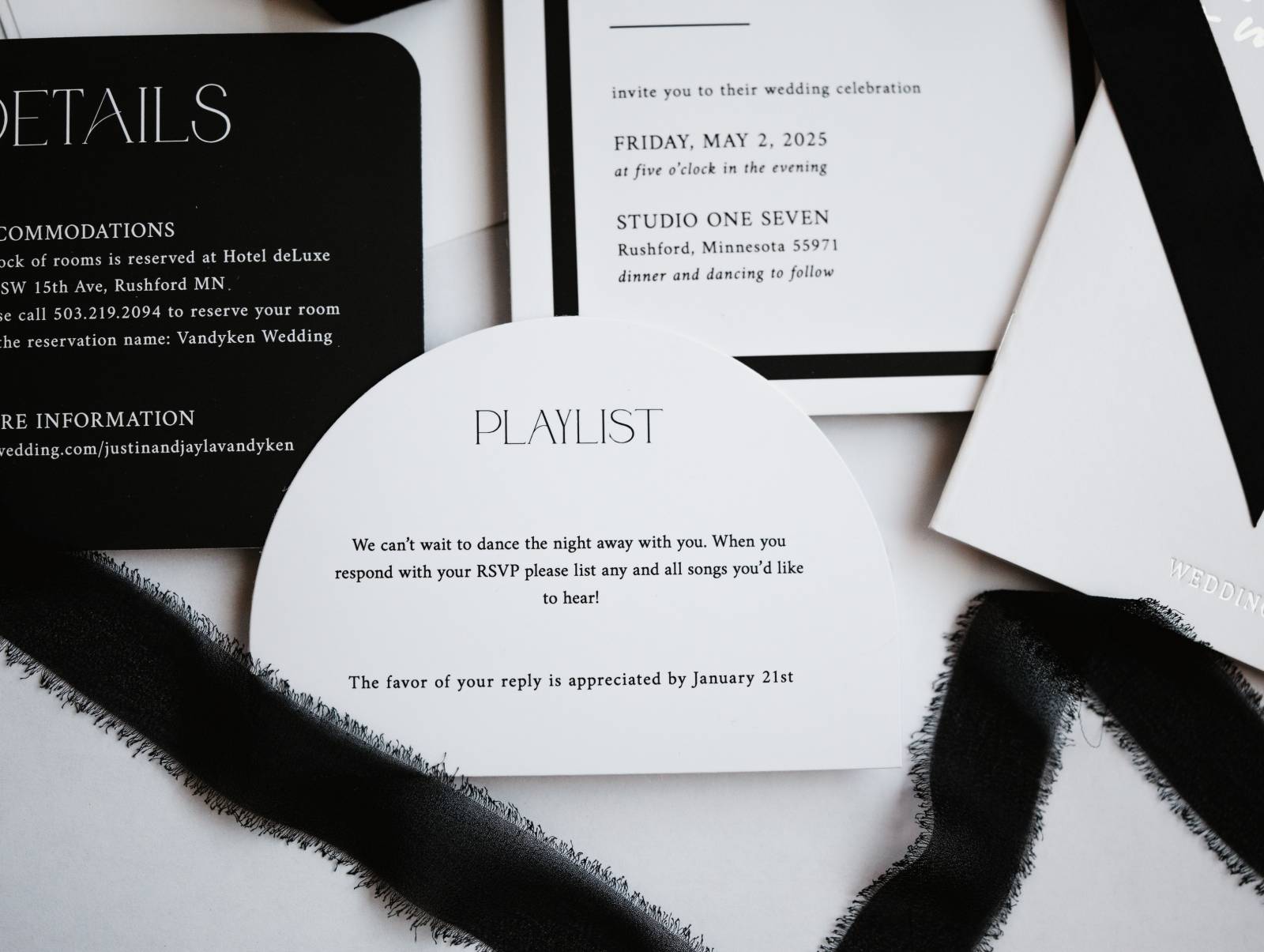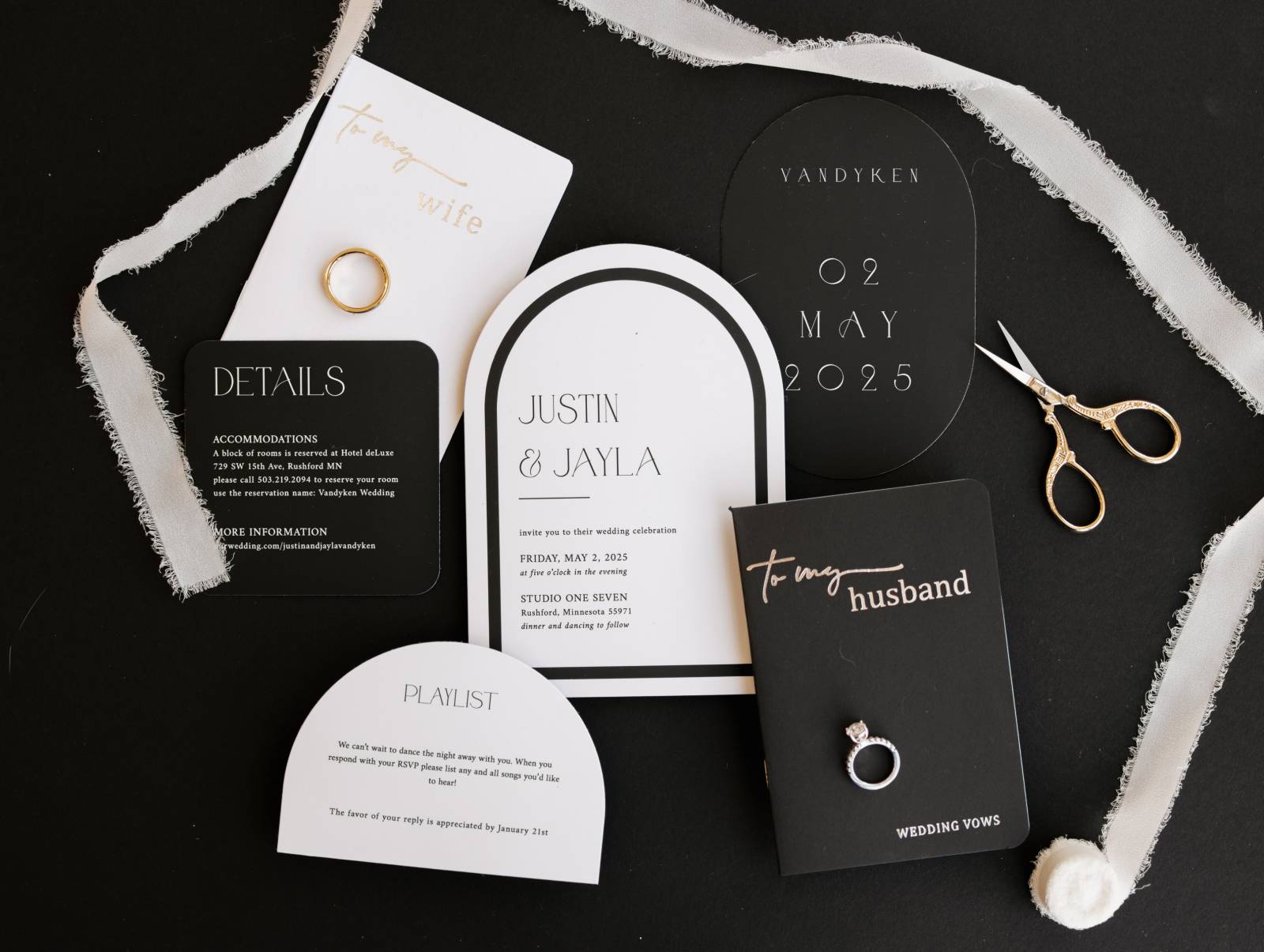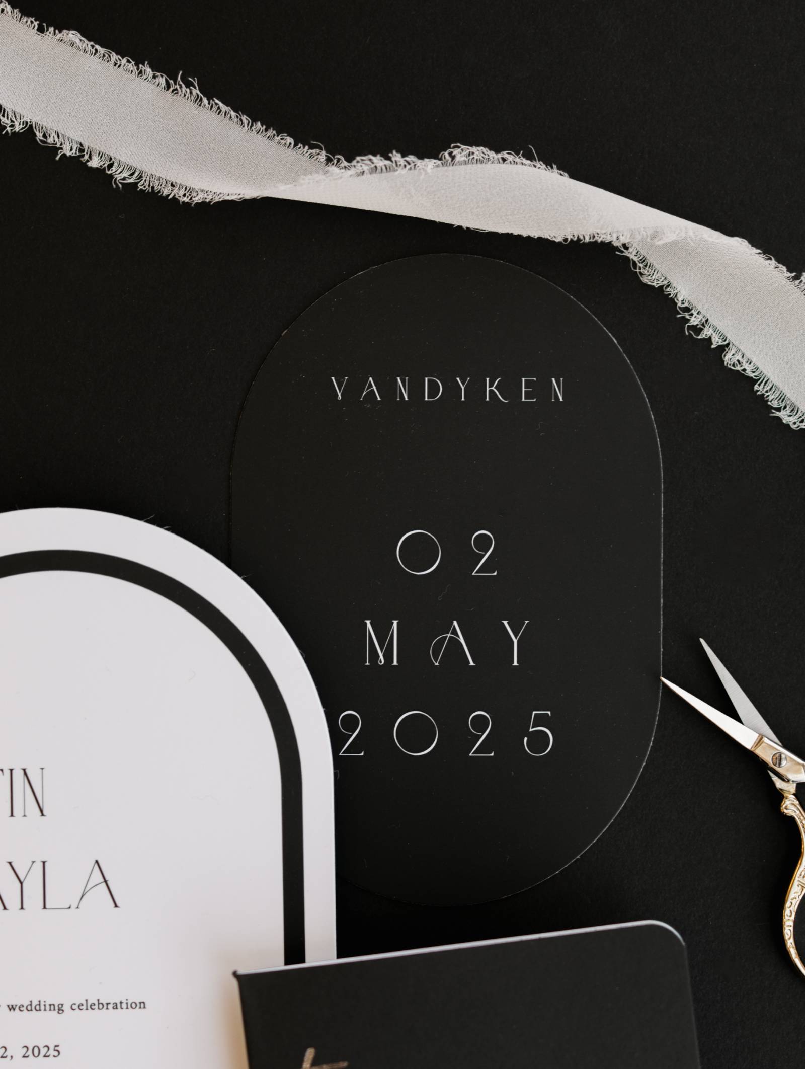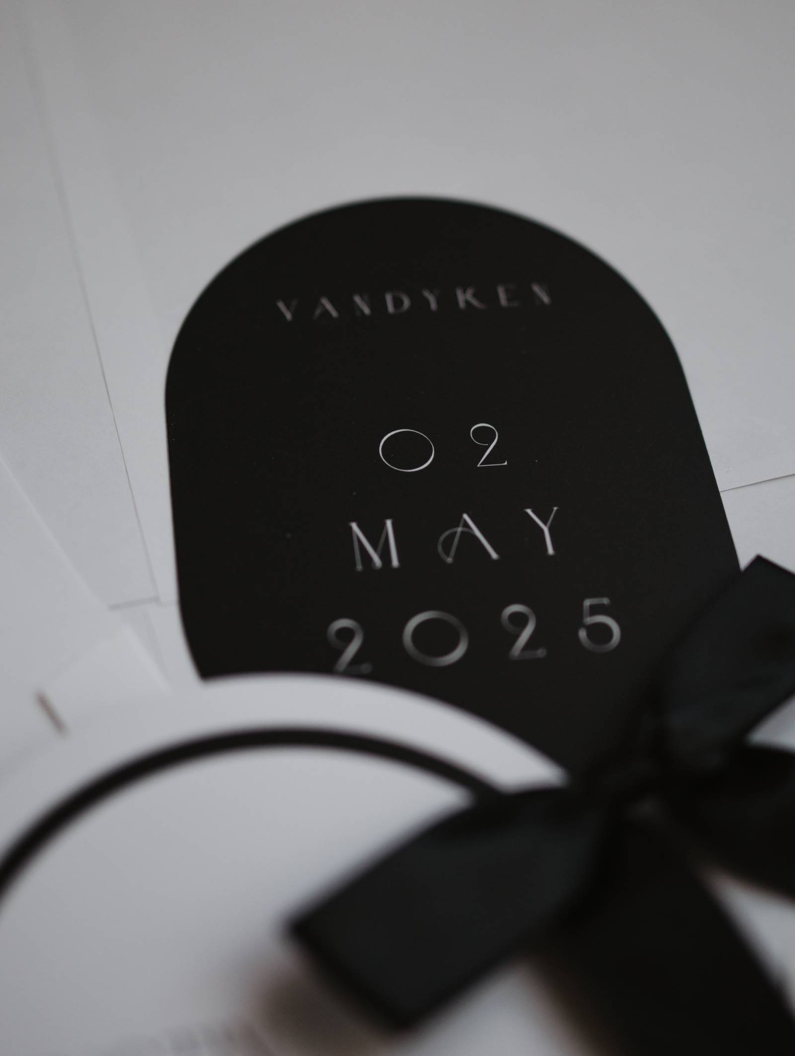 Truly Engaging set the tone with a custom stationery suite with a black, white, gold, and silver color palette. The suite featured a variety of contour-cut shapes, with a contrast between rounded and hard edges, along with vow books with a metallic finish. Fonts included an Art Deco-inspired title font paired with a classic serif for further details.