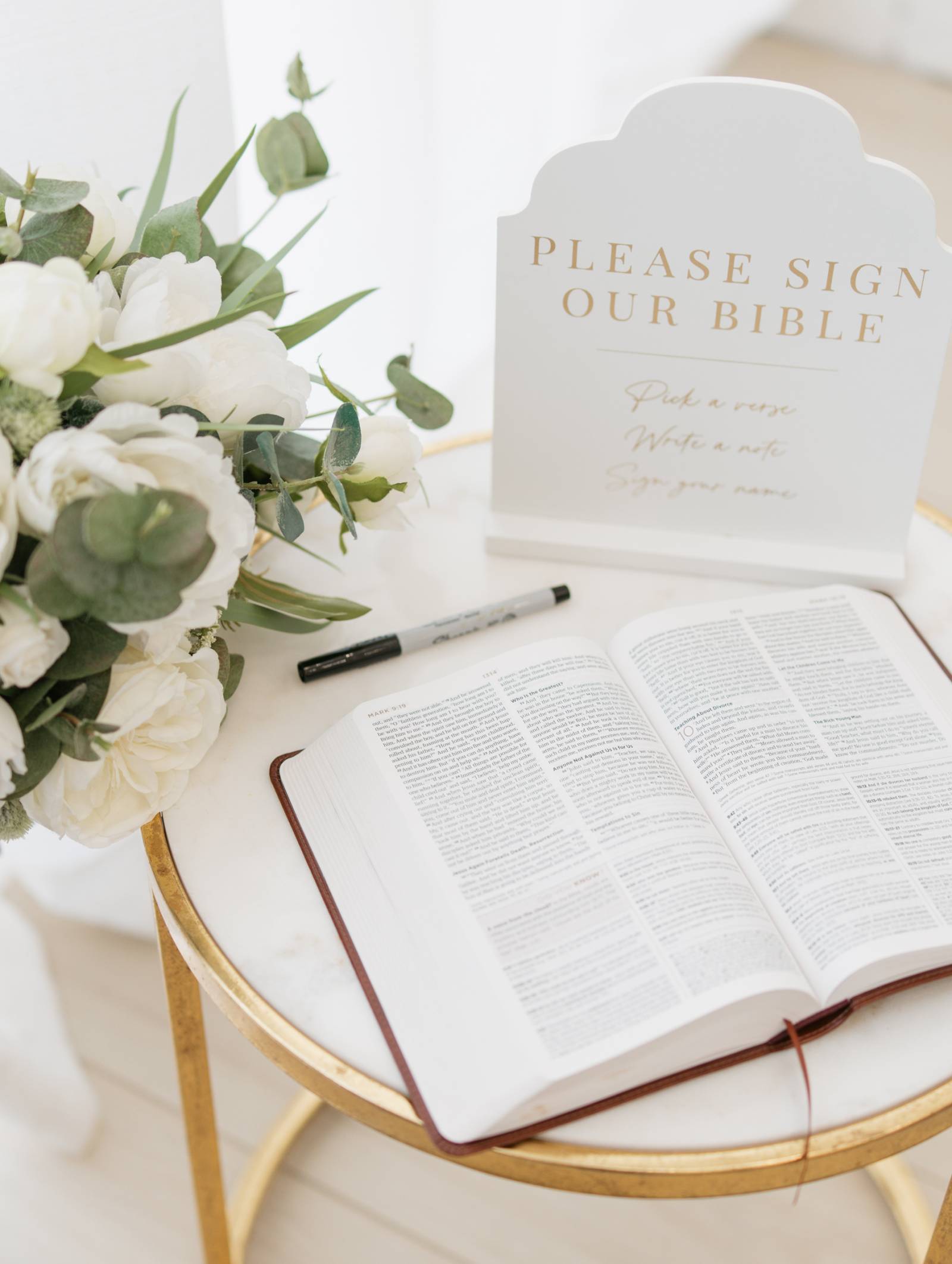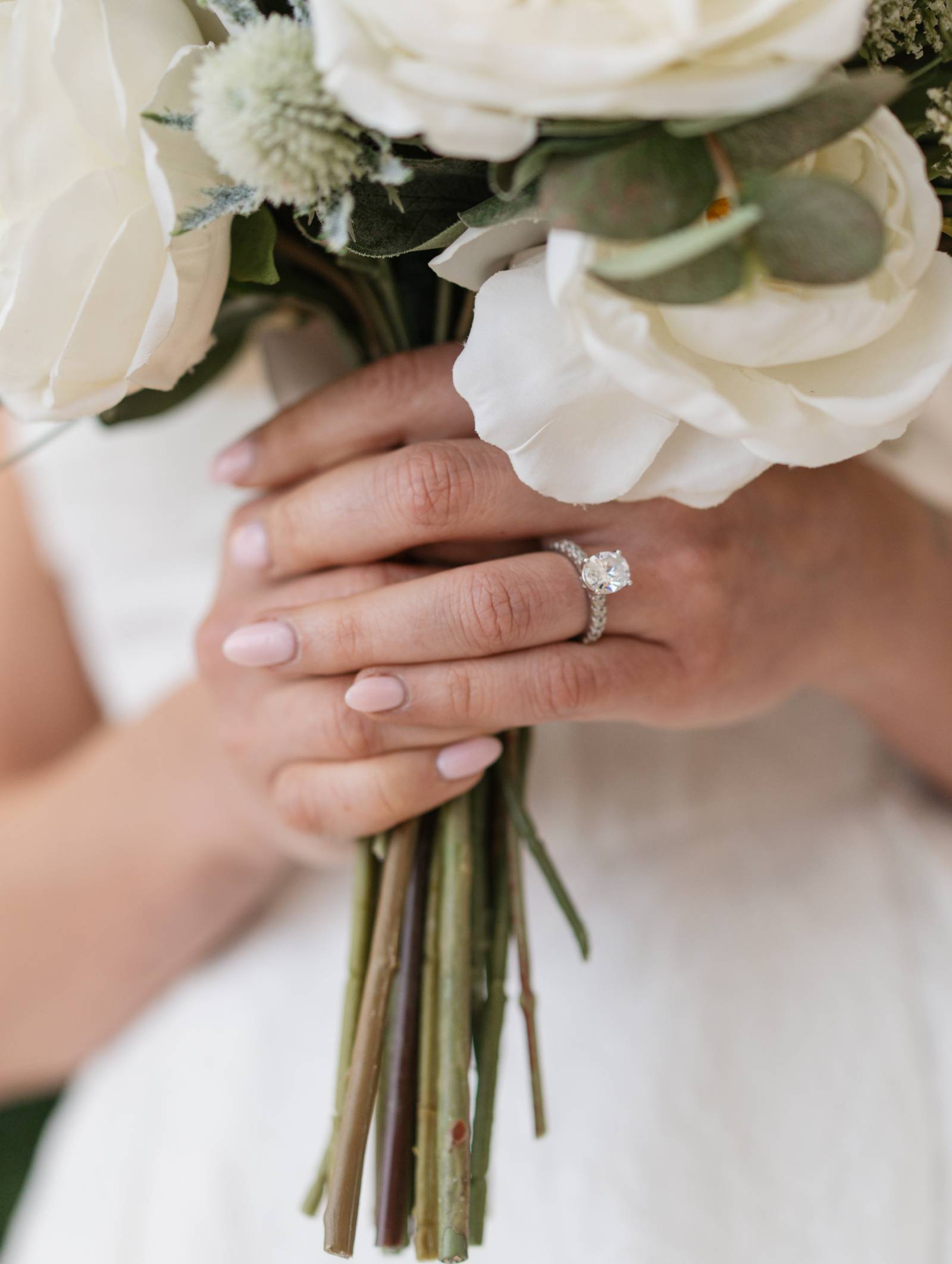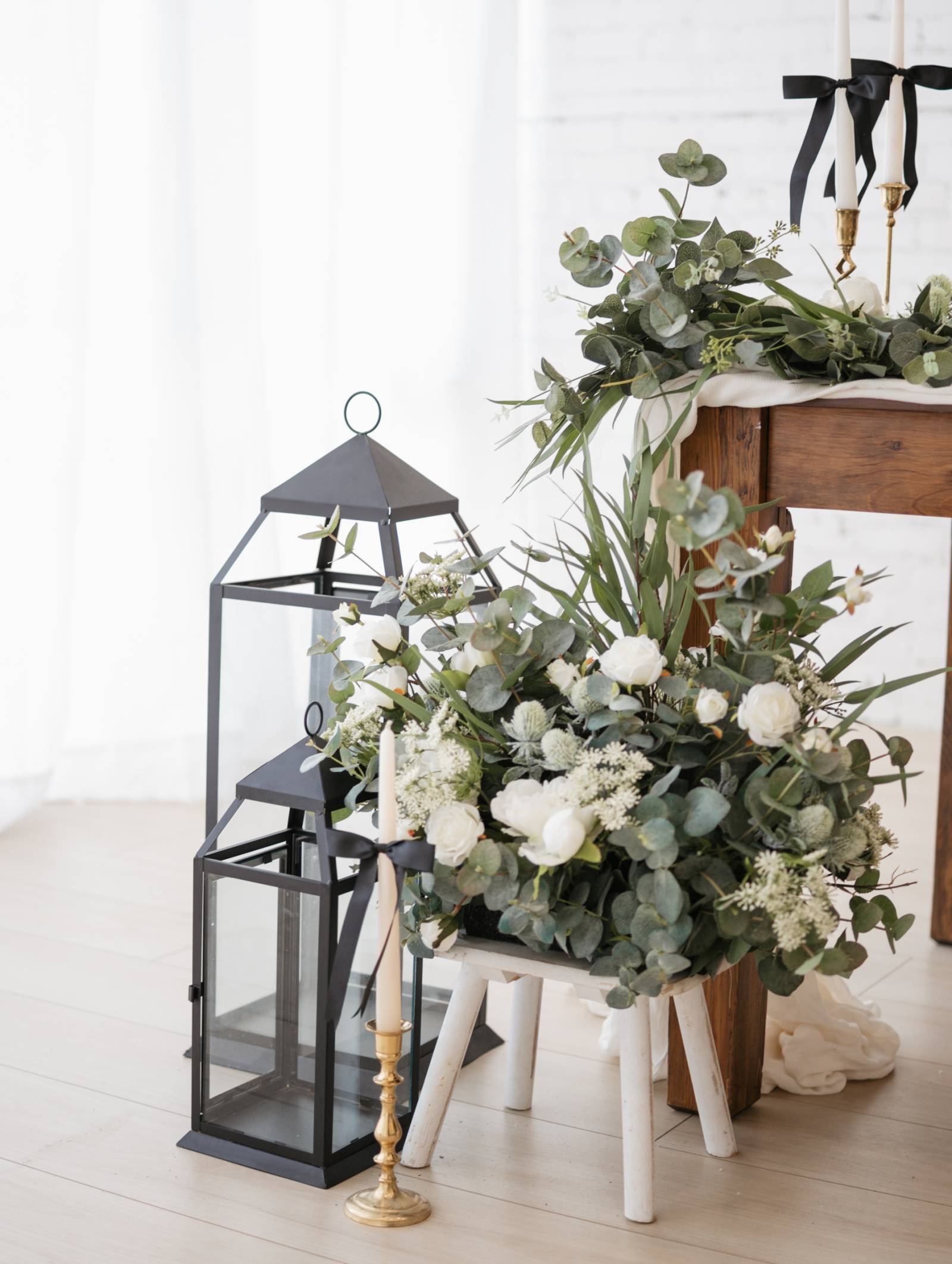 The florals were classic and monochromatic, with white roses and astrantia surrounded by ample greenery of eucalyptus, thistle, and grasses. A large installation spanned the length of the sweetheart table, which also featured a white table runner and white candles on gold candle holders.