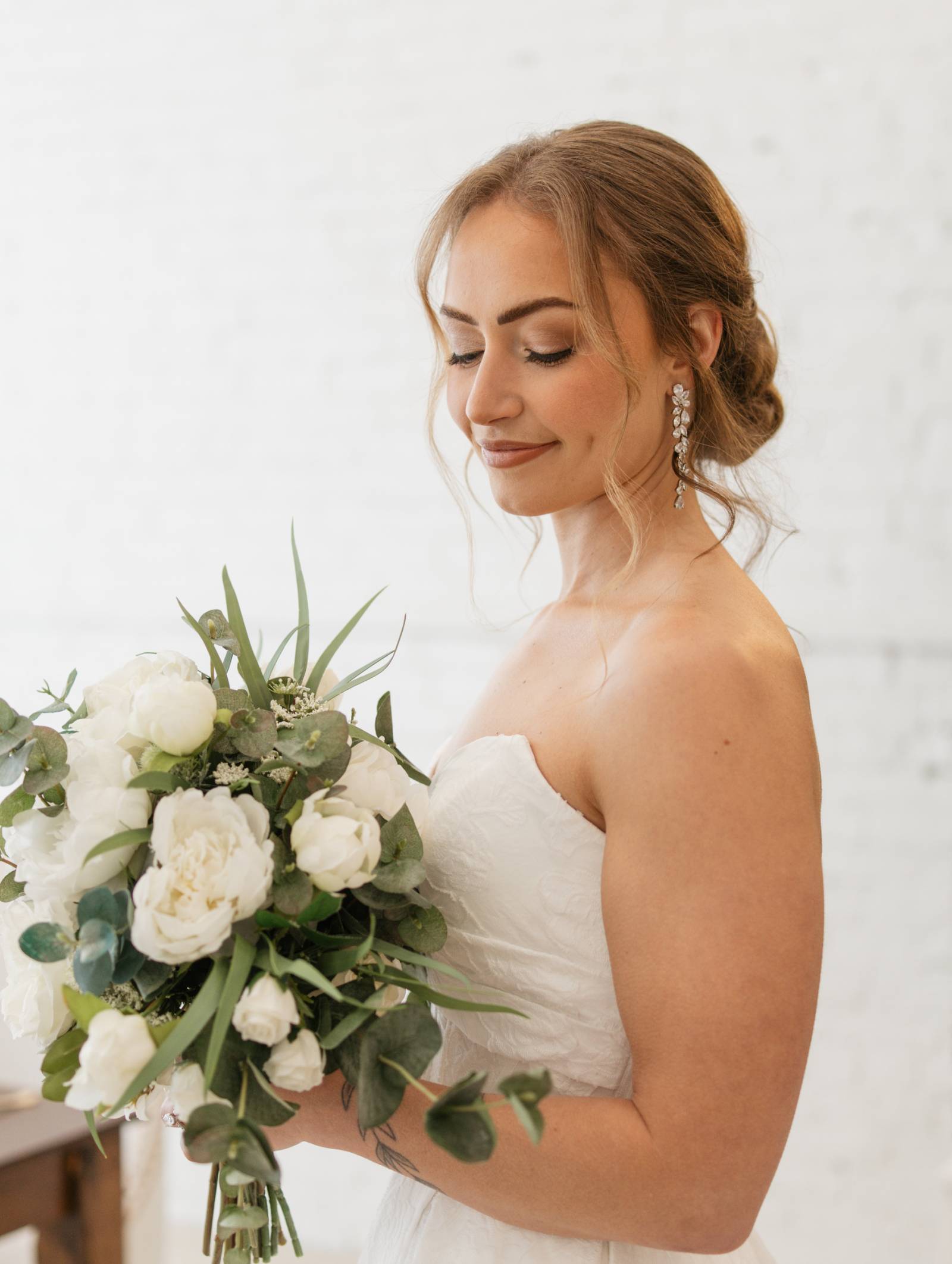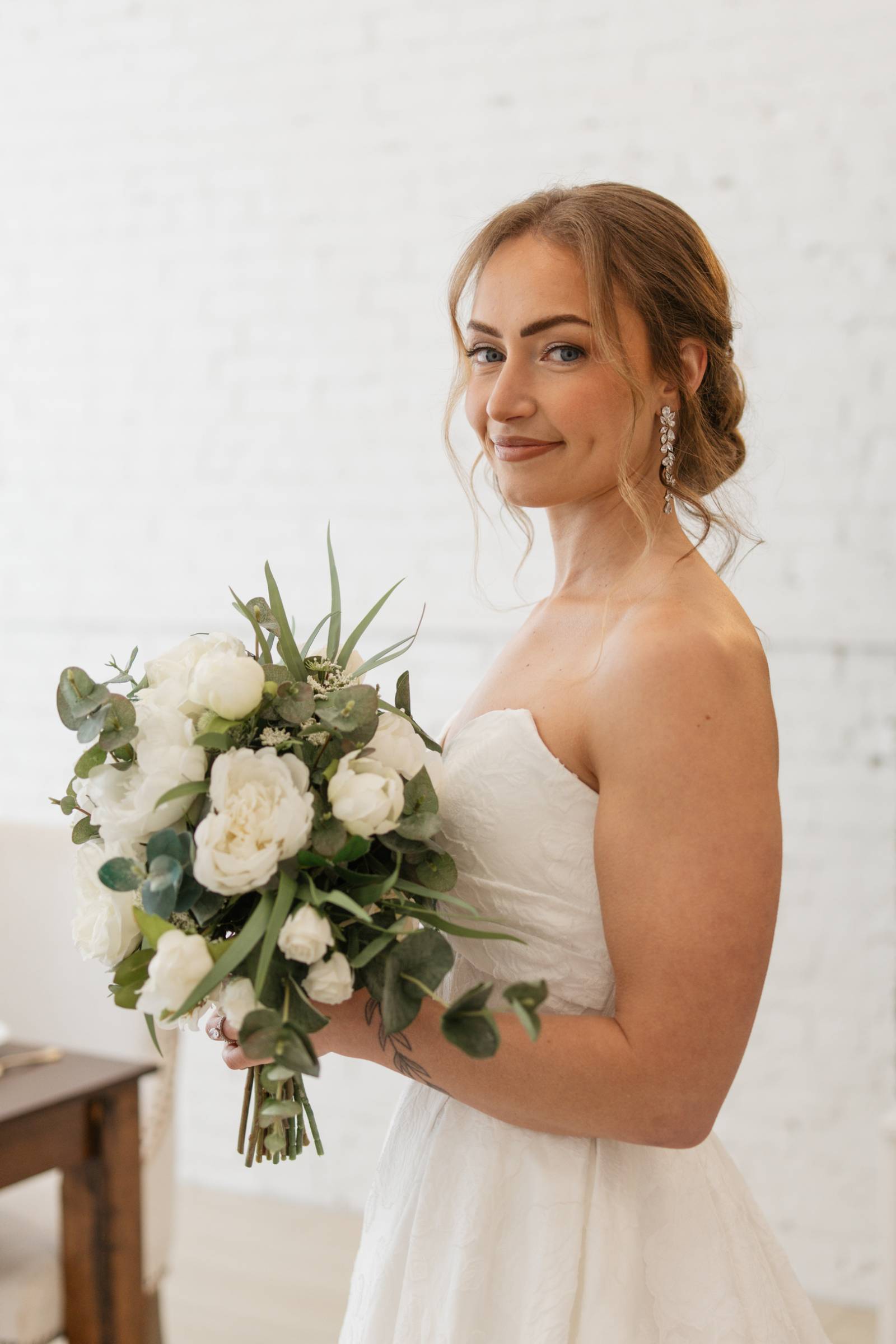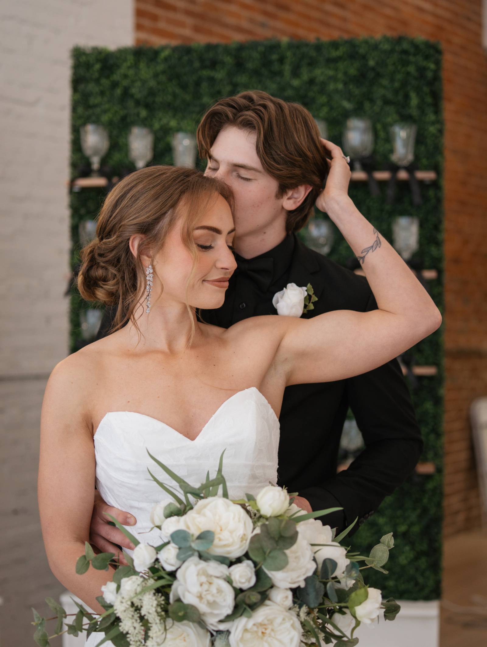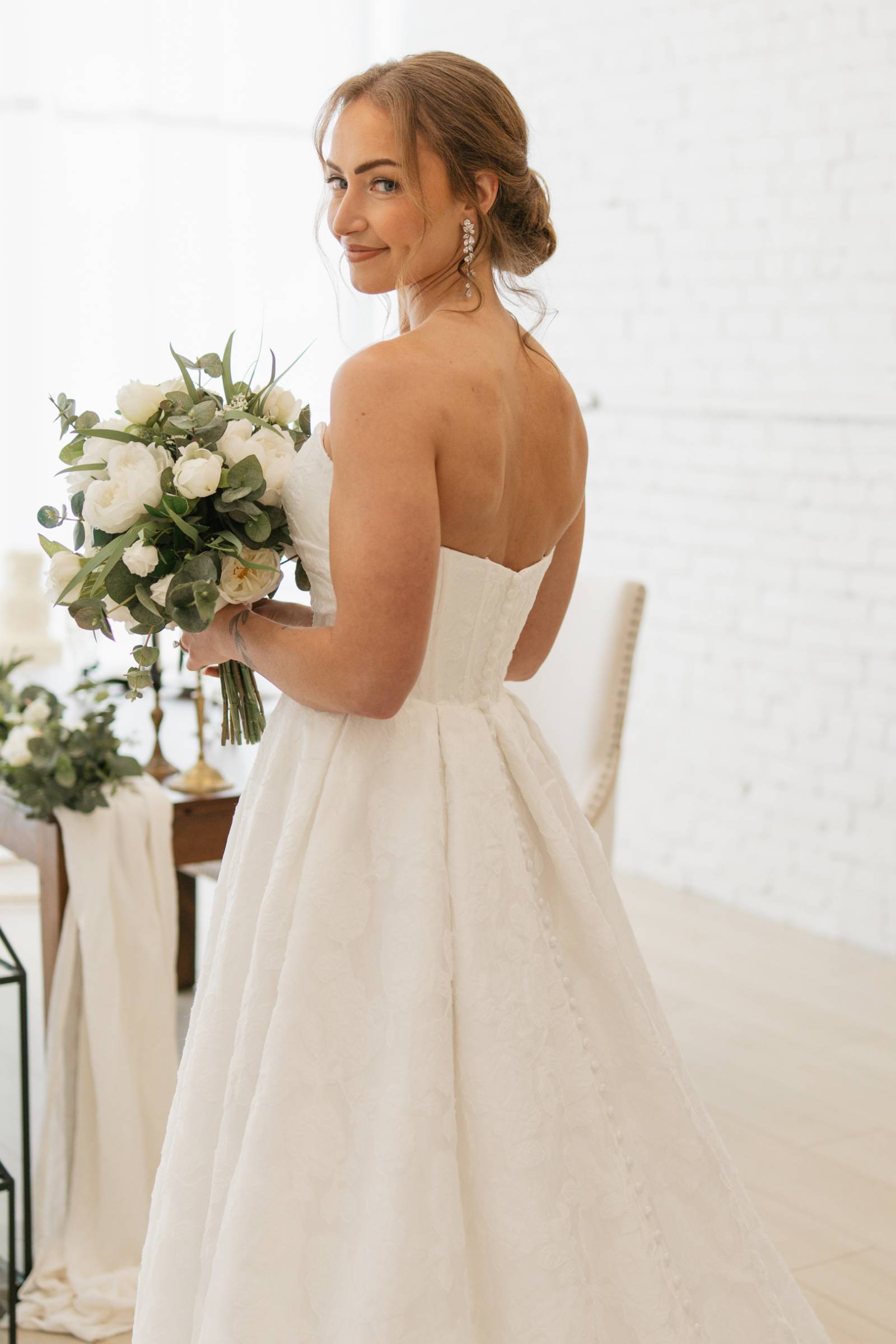 The bride wore a strapless, sweetheart-neckline dress from Charlotte’s Bridal & Formal Wear, with brocade fabric, a structured corset waist, and pleated, A-line skirt. Styled by Maria secured her hair into a low, twisted updo with loose, textured, face-framing curls. The hairstyle was perfect for securing a cathedral-length veil with embroidered edges. Drop earrings from enVogue Bridal Accessories and a bridal ring from Modern Gents added the finishing touches to the bridal styling.