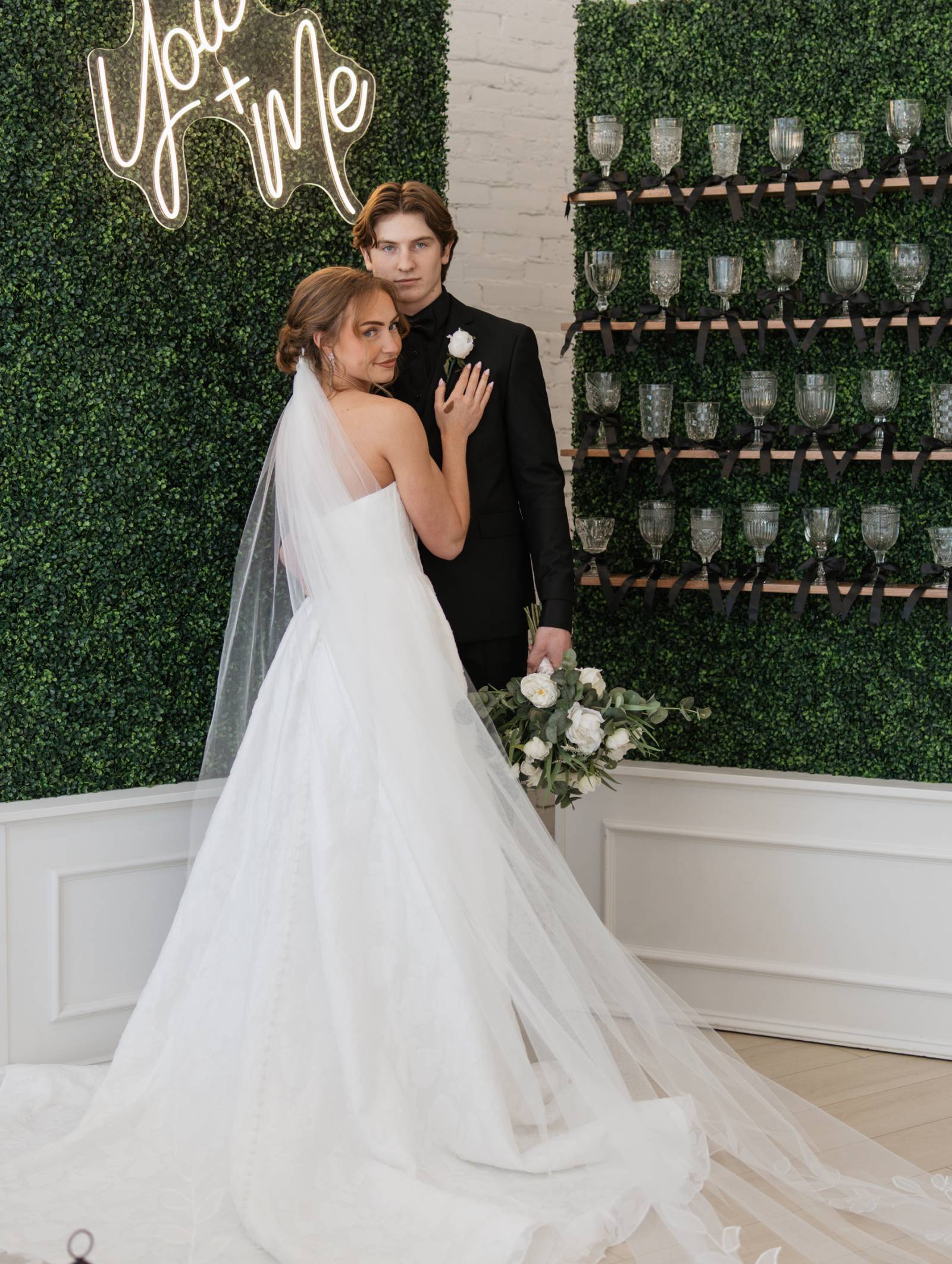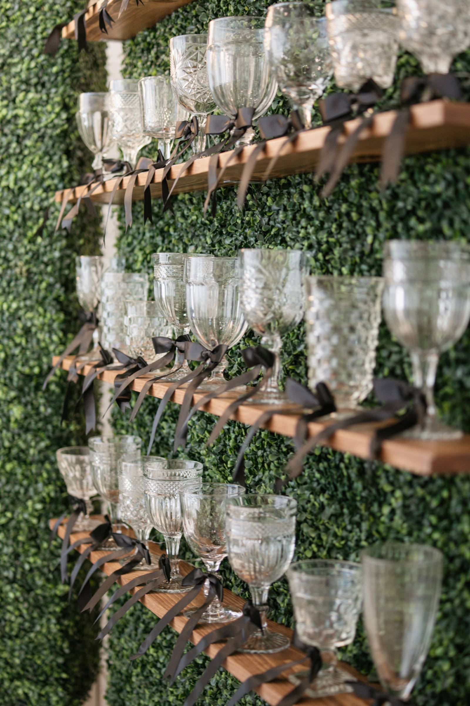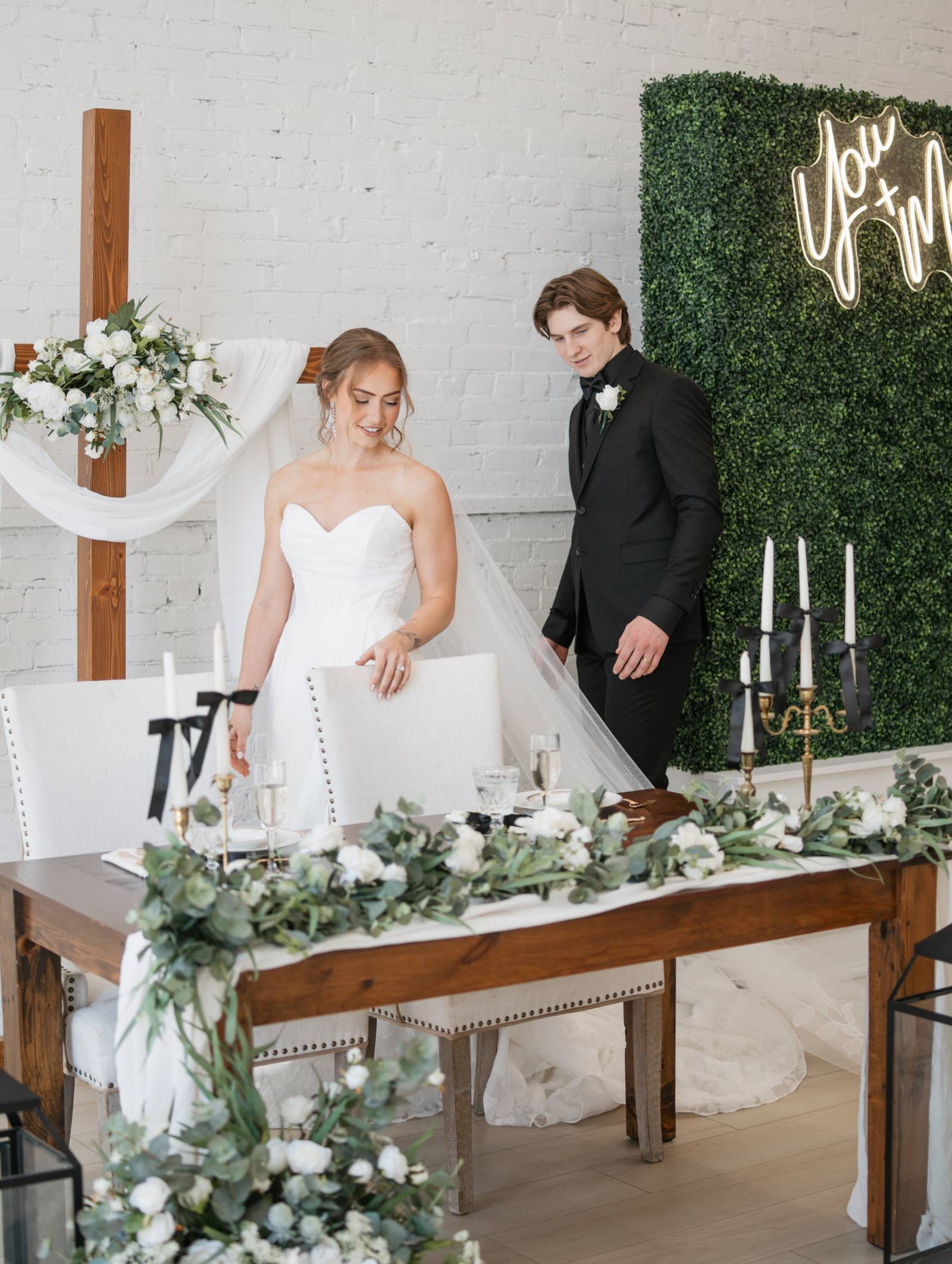 In addition to the tablescape, Resource Vintage Rental provided a variety of additional rental pieces, from geometric black lanterns to seating, end tables, and a greenery champagne wall. One side of the greenery wall transformed into a photo booth with a neon sign, with the other side shelving for individual, unique crystal glassware tied with bows.