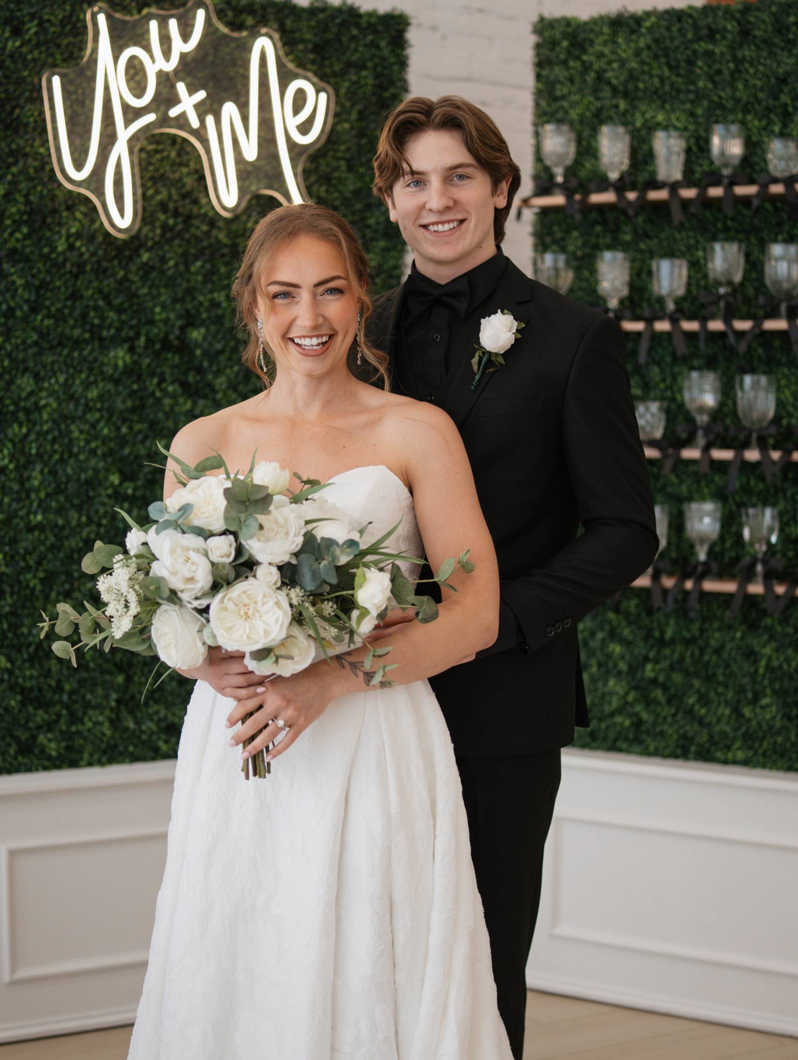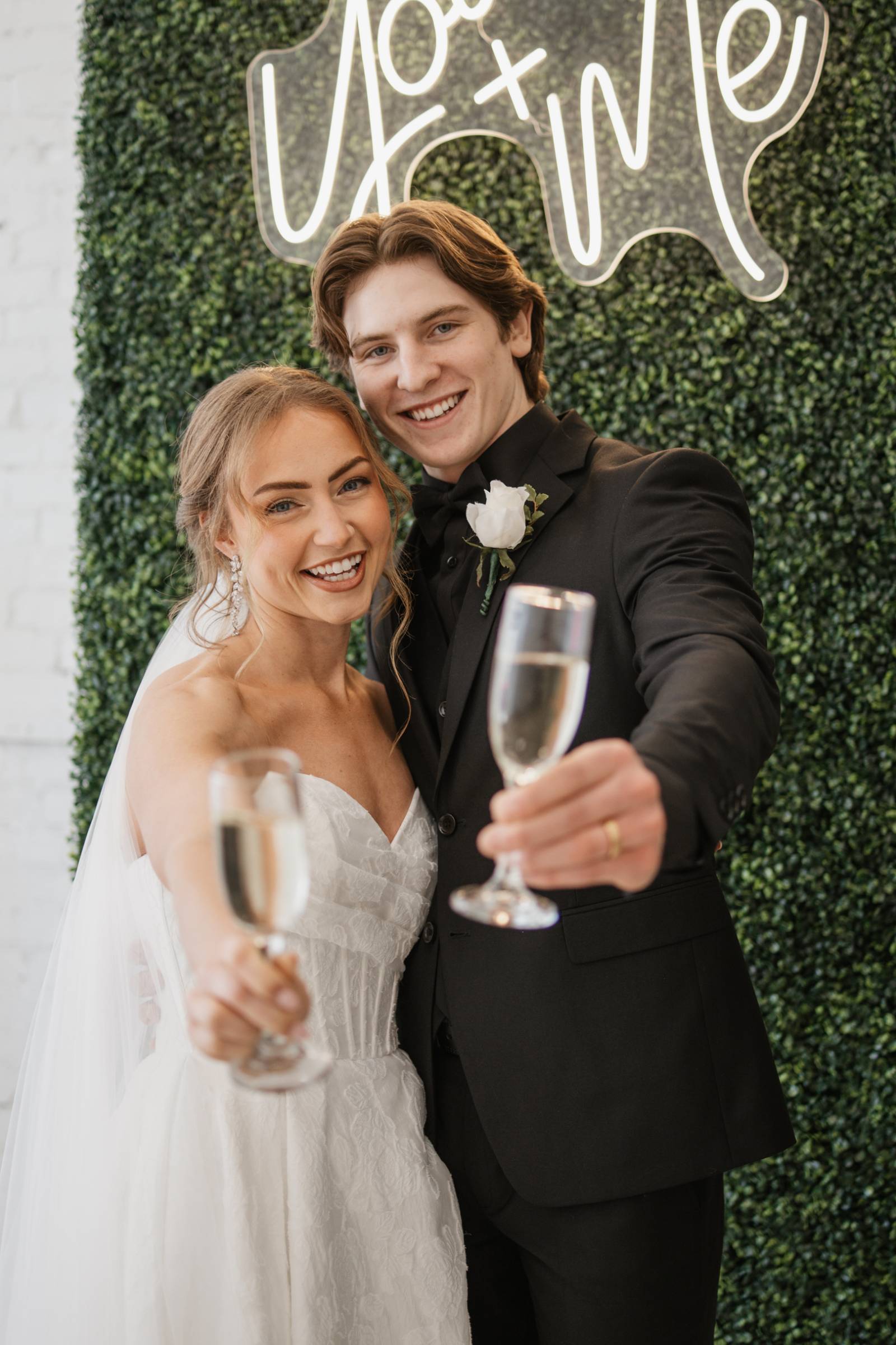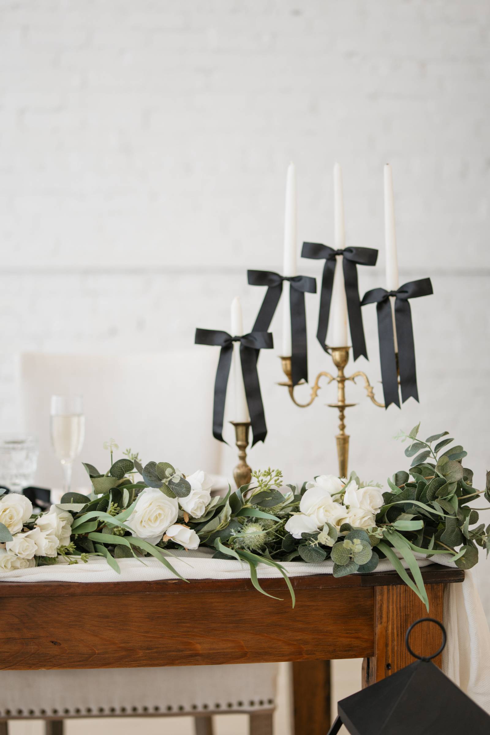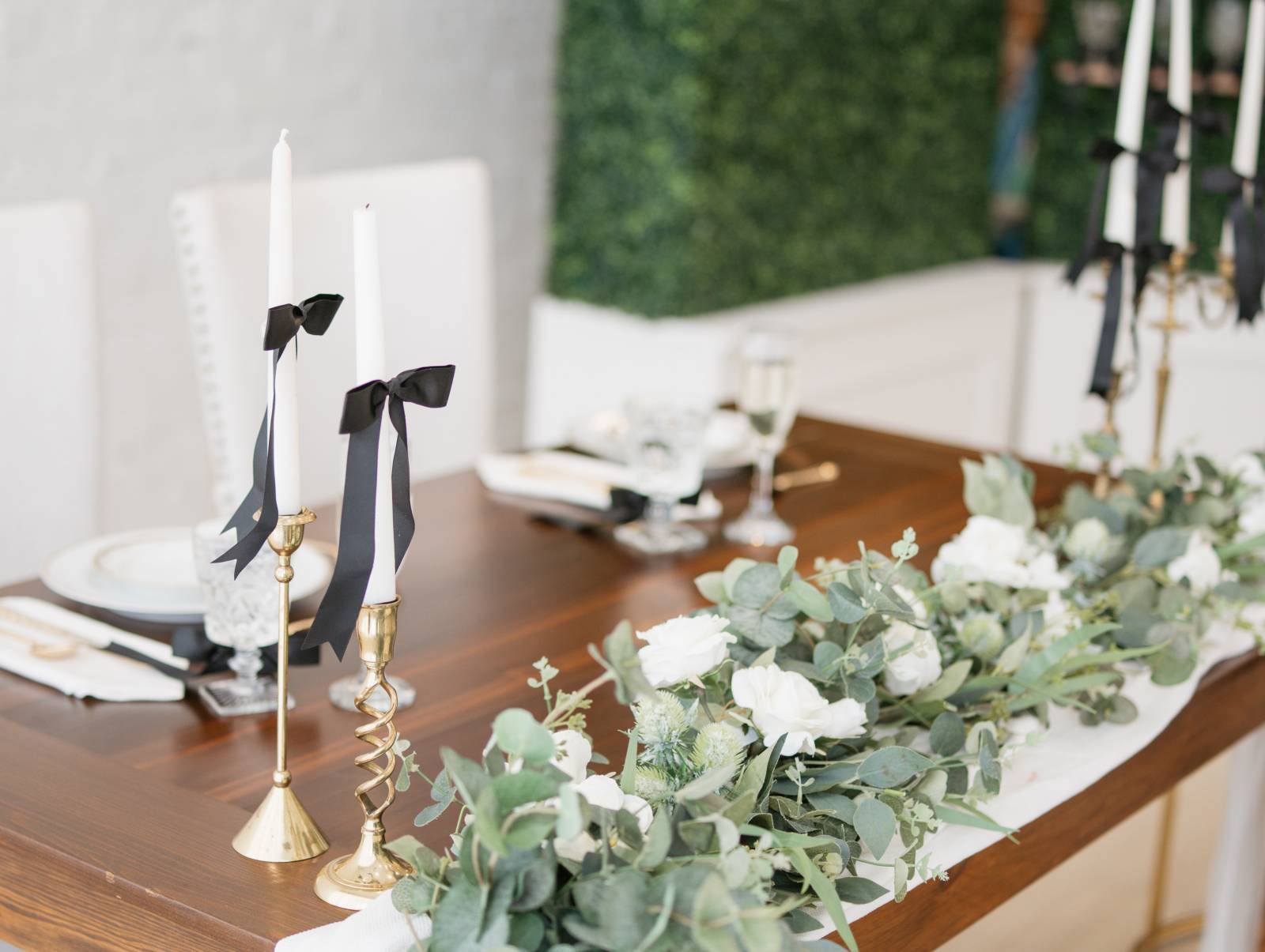 In addition to the tablescape, Resource Vintage Rental provided a variety of additional rental pieces, from geometric black lanterns to seating, end tables, and a greenery champagne wall. One side of the greenery wall transformed into a photo booth with a neon sign, with the other side shelving for individual, unique crystal glassware tied with bows.