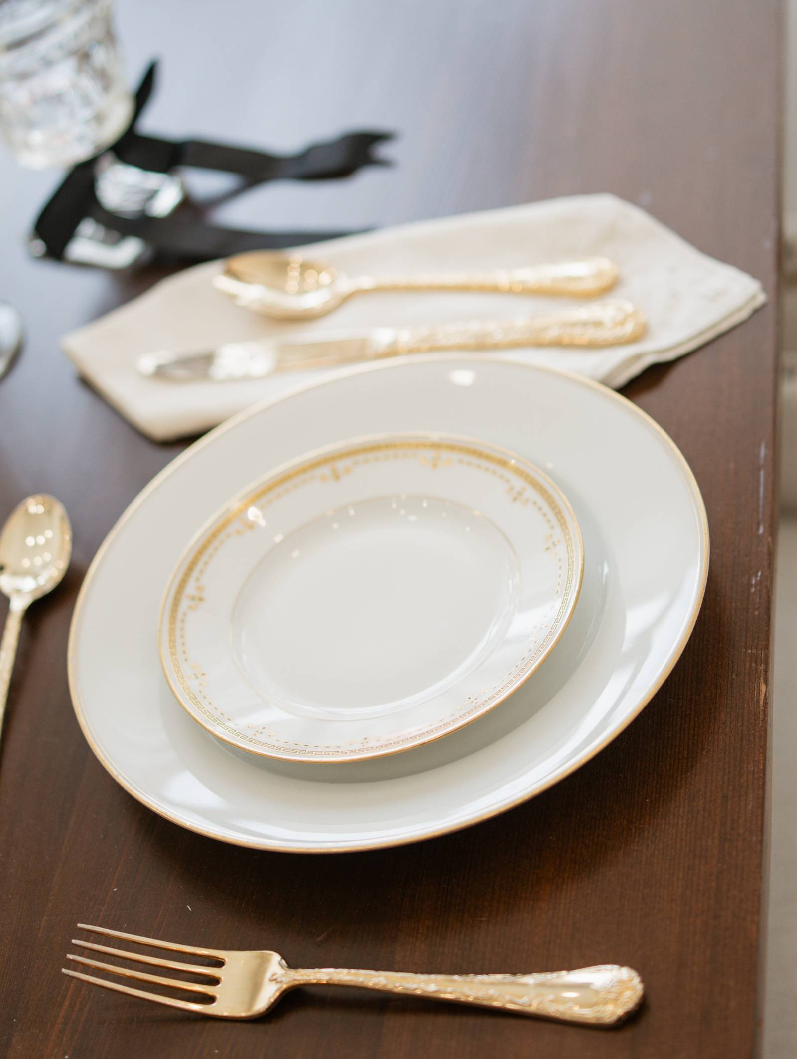 Tableware included white plating with gold edges, smaller white plates with ornate gold edges, and vintage-inspired, gold silverware. The couple was seated in Resource Vintage Rental‘s Madison Twins Dining Chairs, a beautiful combination of comfort and style.