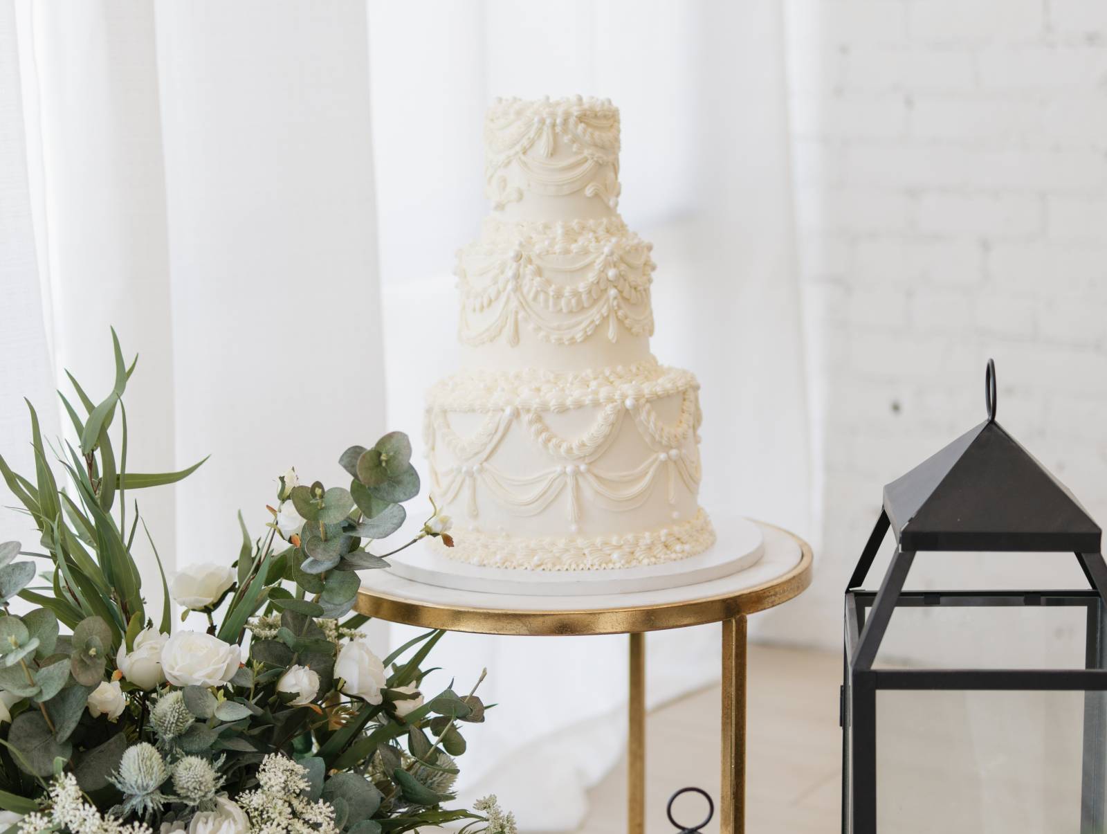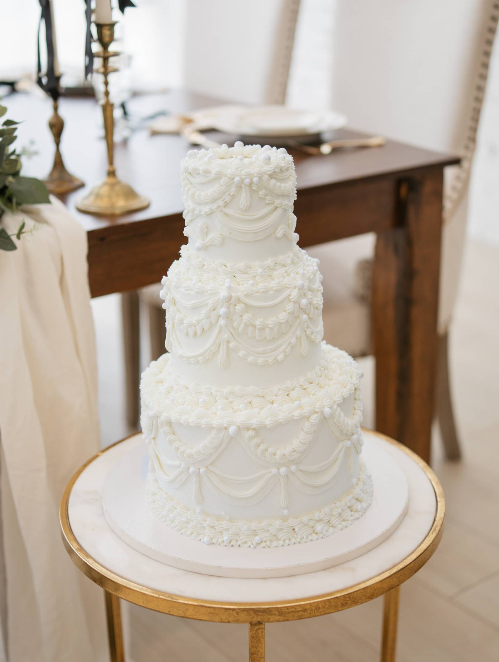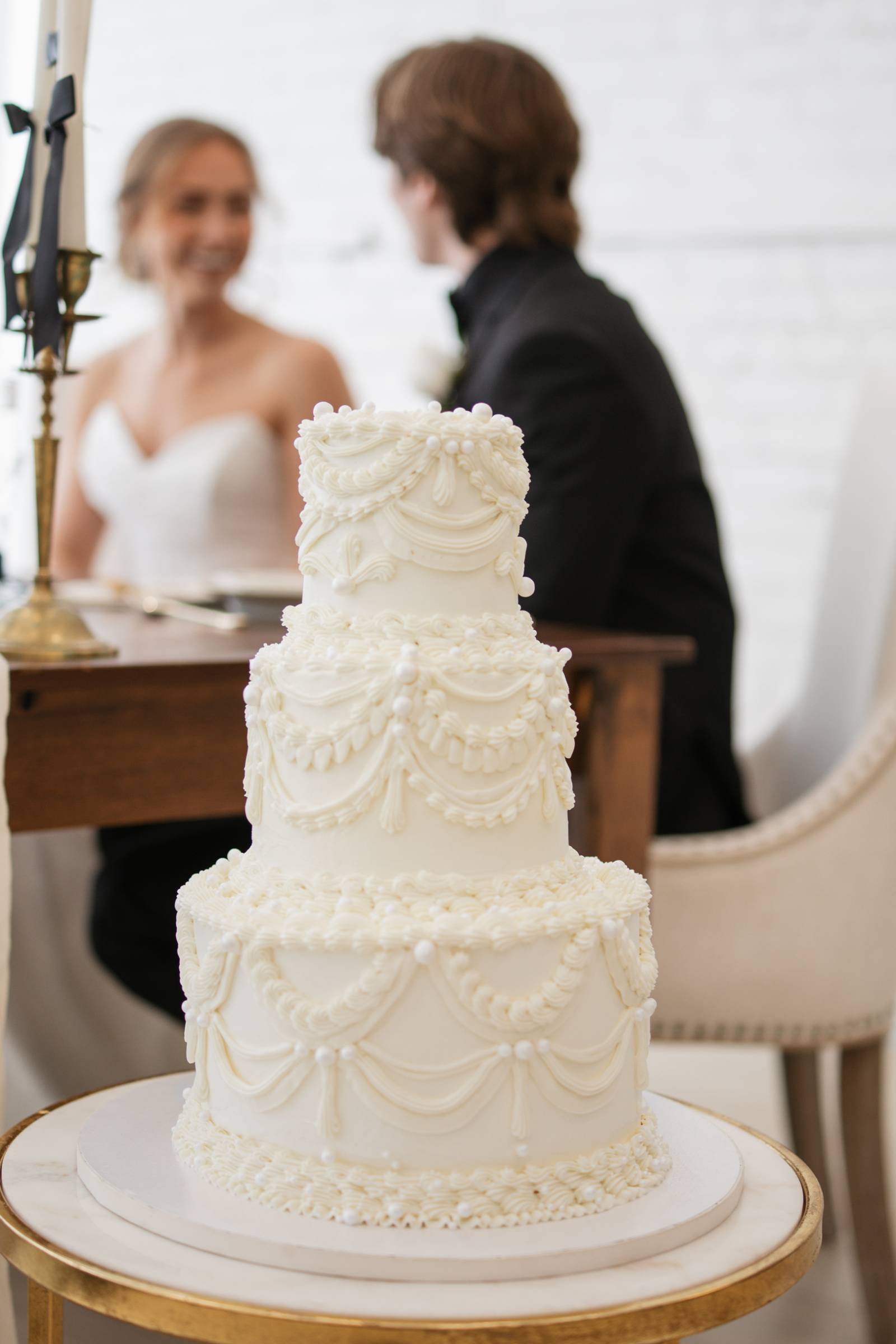 At the dessert table, Sweet Caeli’s provided a towering, three-tier white cake with artful, ornamental piping.