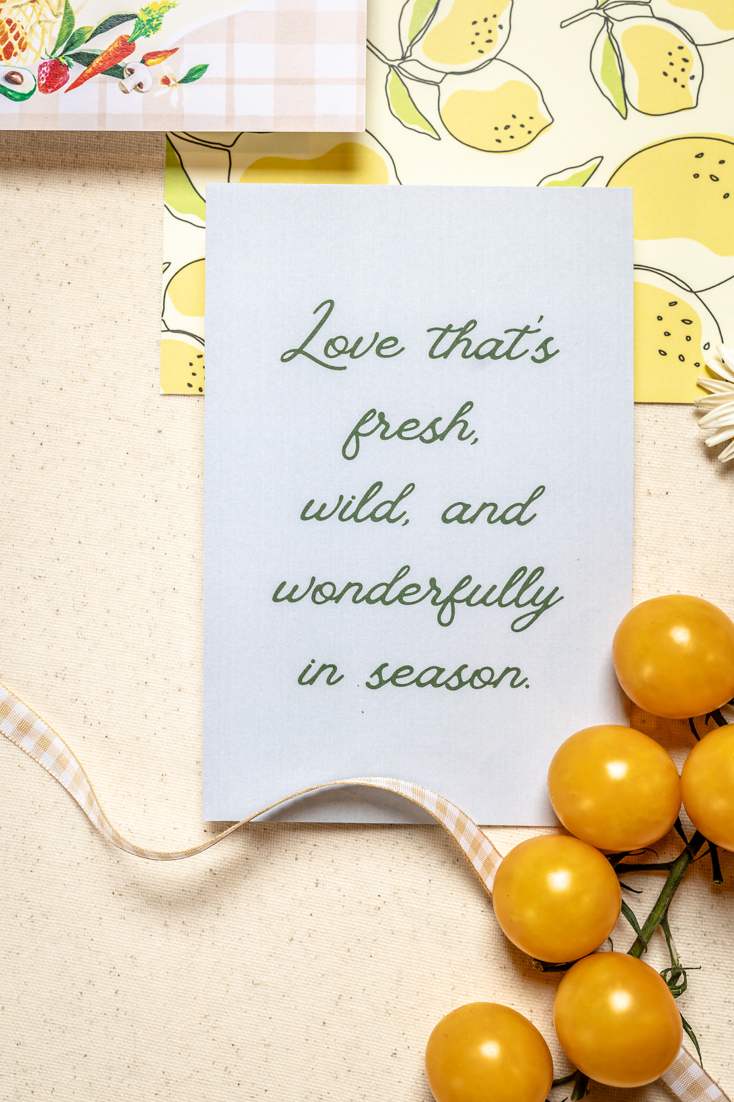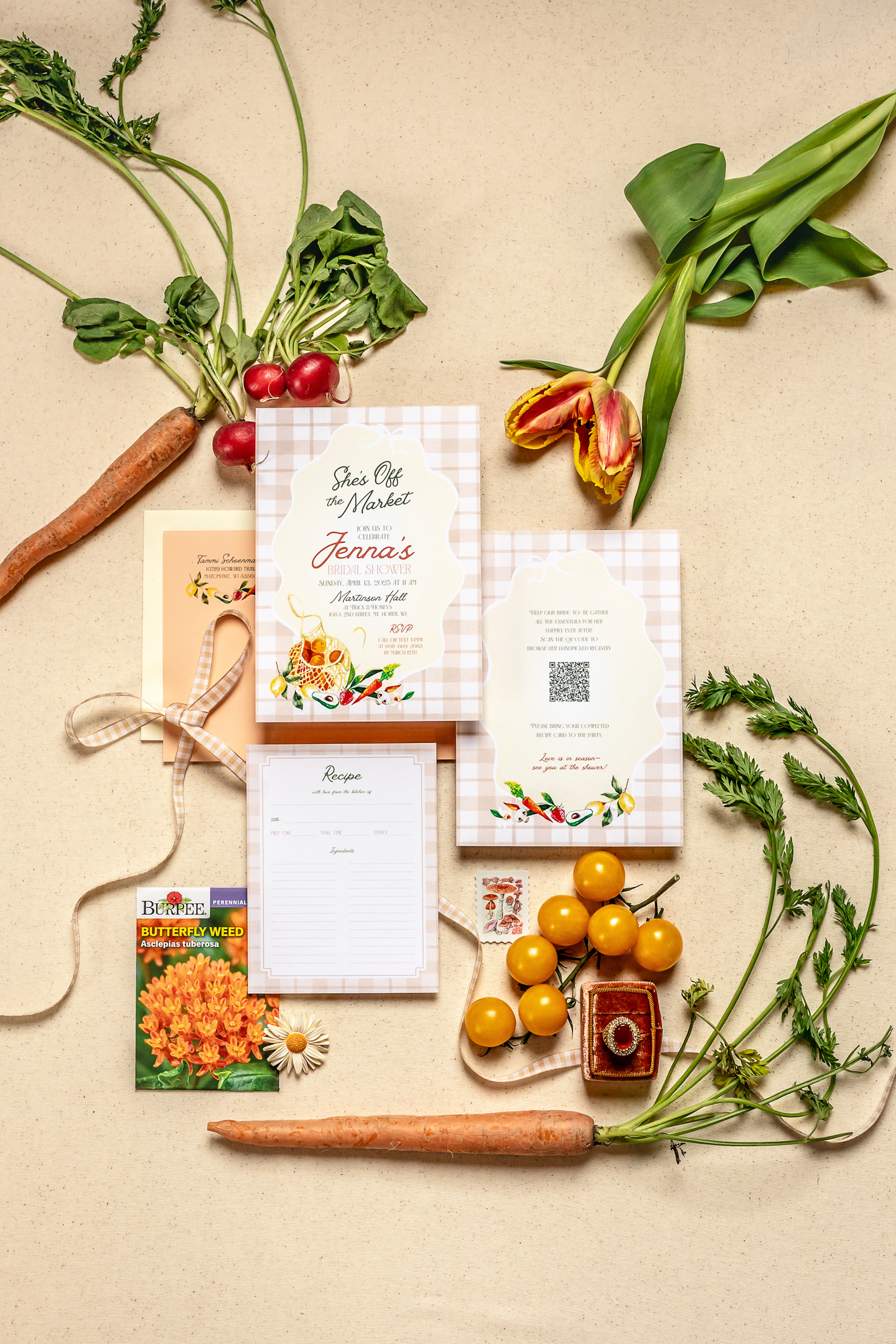 The design began with a warm, natural color palette of soft tan, pale yellows, oranges, greens, and reds. The invitations combined organic elements, fruit and vegetable illustrations, a subtle, checkered pattern, and whimsical fonts. Guests also received recipe cards to gift the couple with their favorite or family specialties that could later be combined into a custom and thoughtful cookbook.