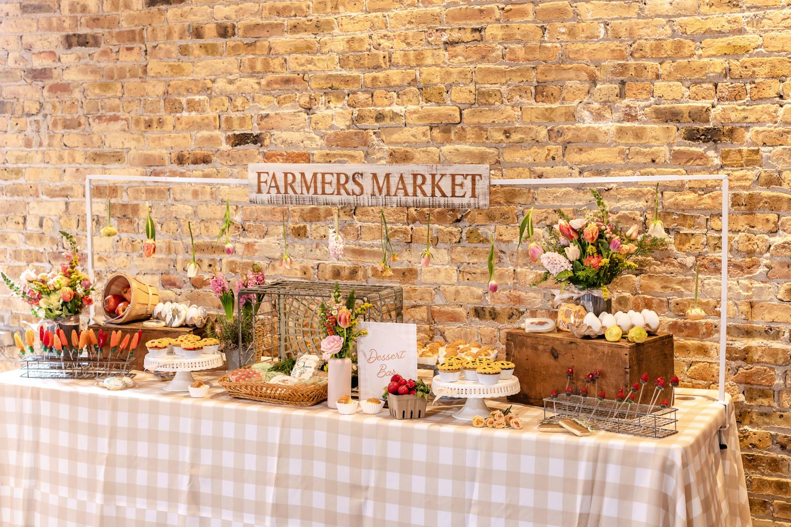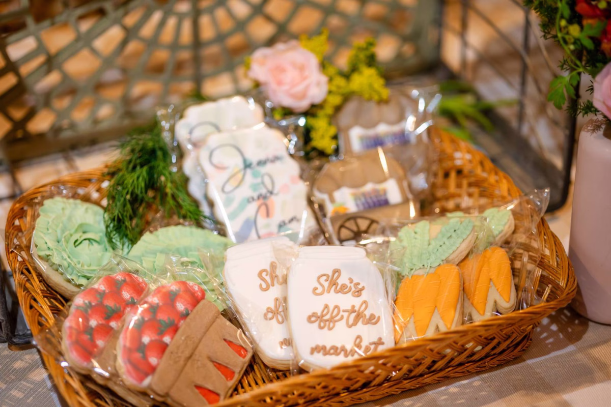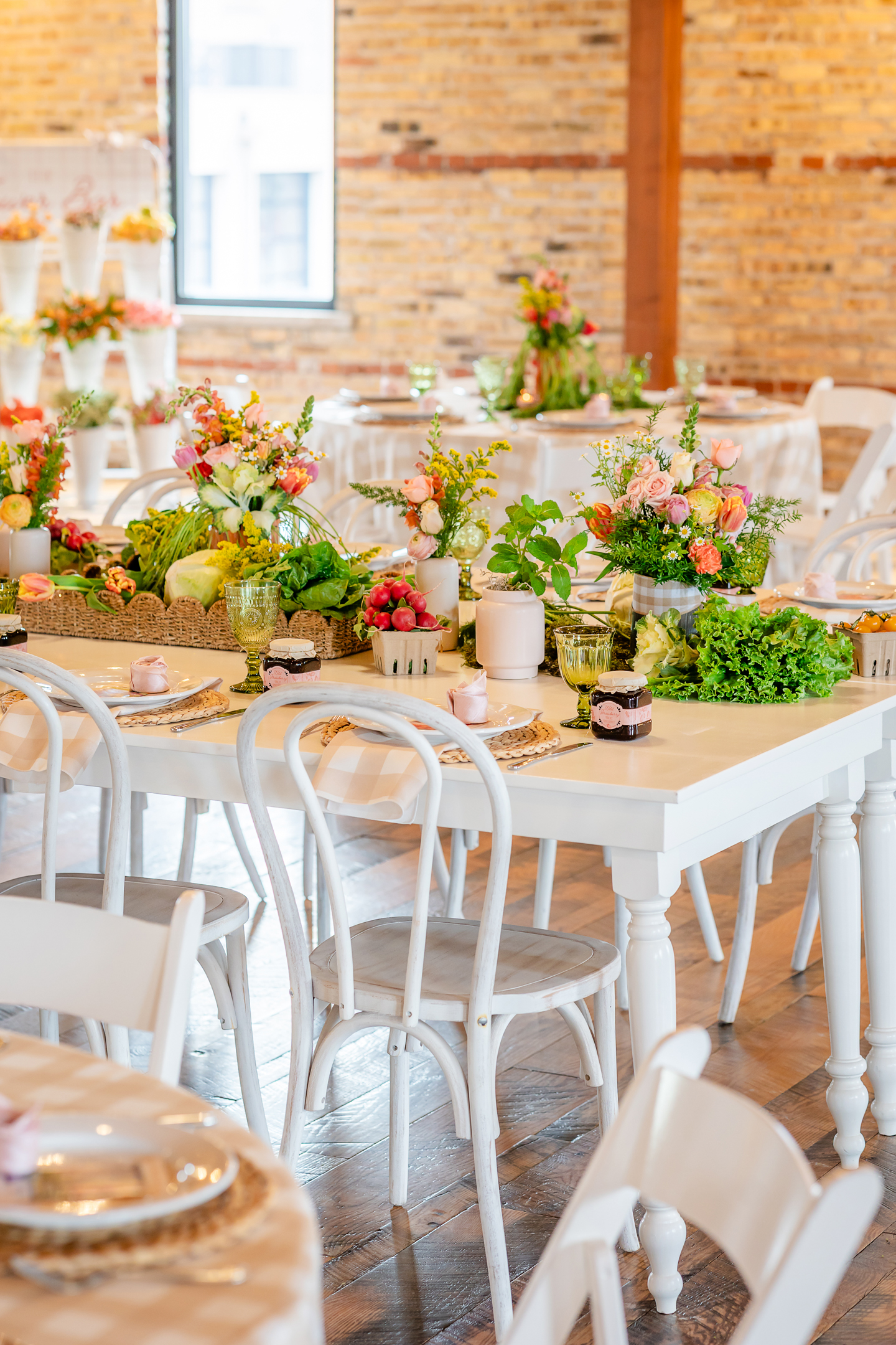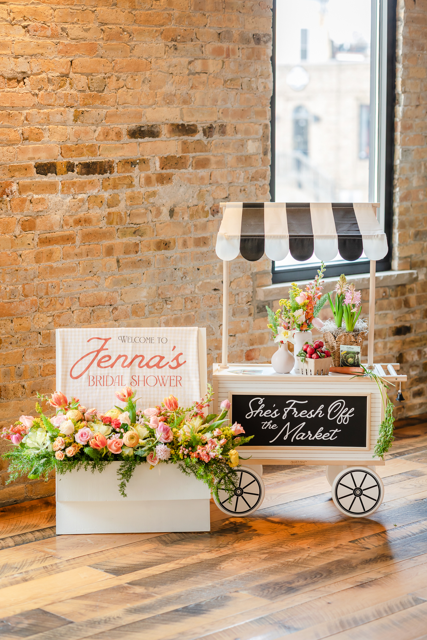 This “She’s Fresh off the Market” bridal shower was a cheerful and stylish nod to all things fresh, local, and lovely. Held at Martinson Hall at Buck & Honey’s, the day featured garden-inspired florals, creative food presentations, and thoughtful décor that brought the farmer’s market theme to life!