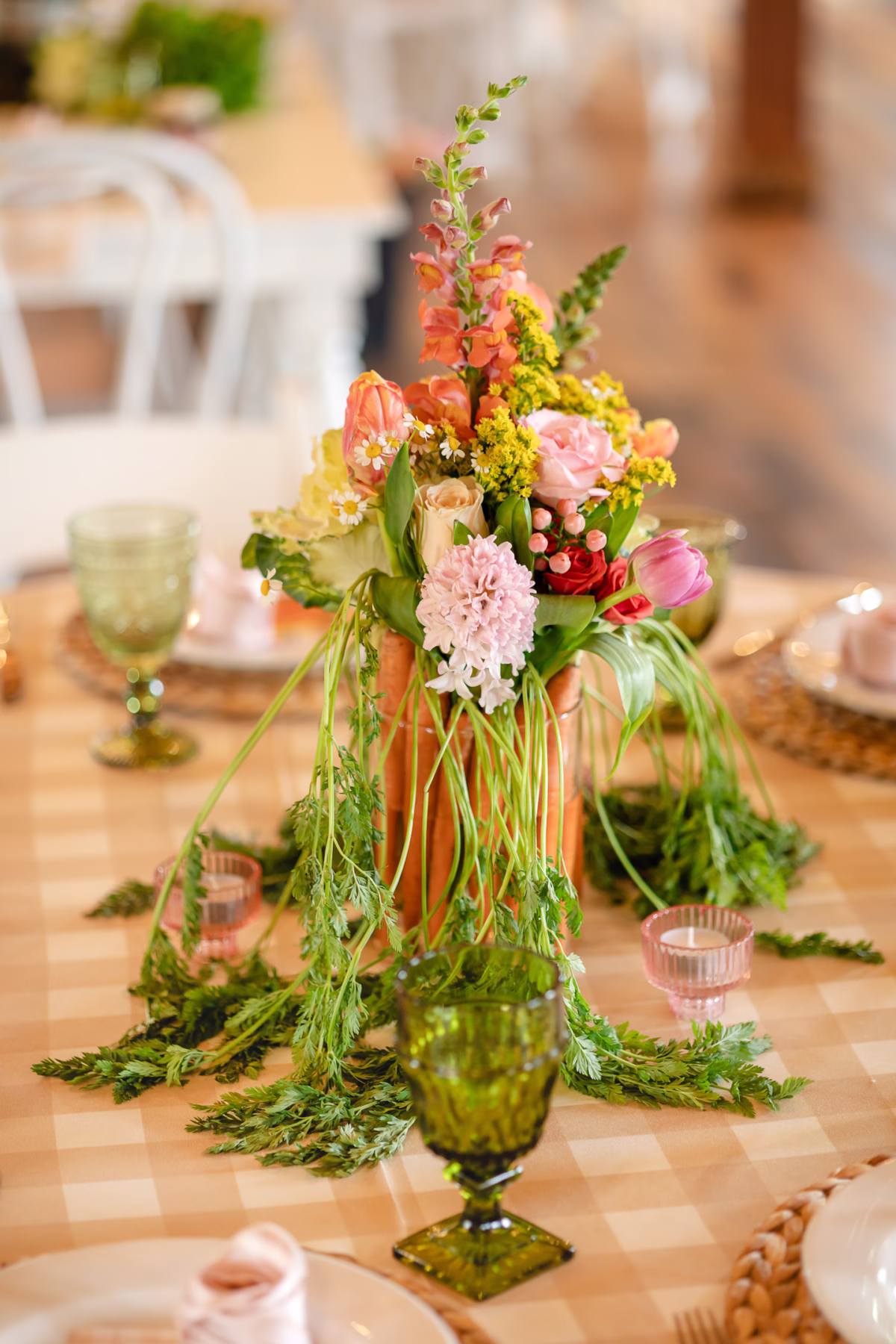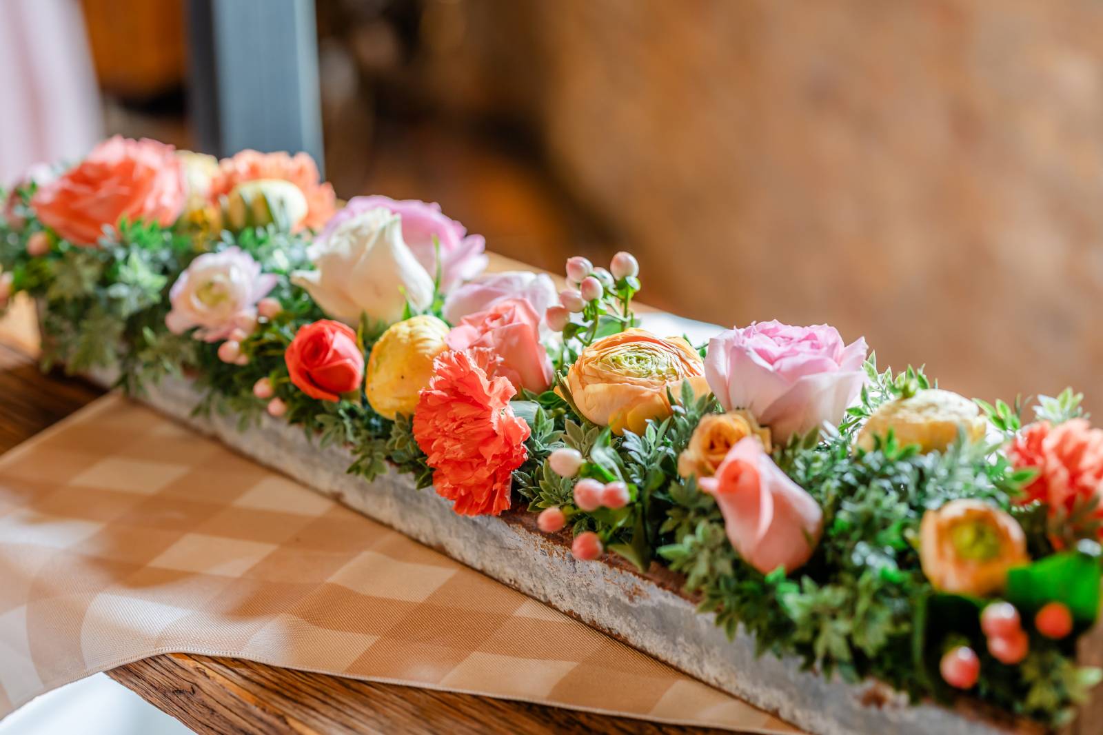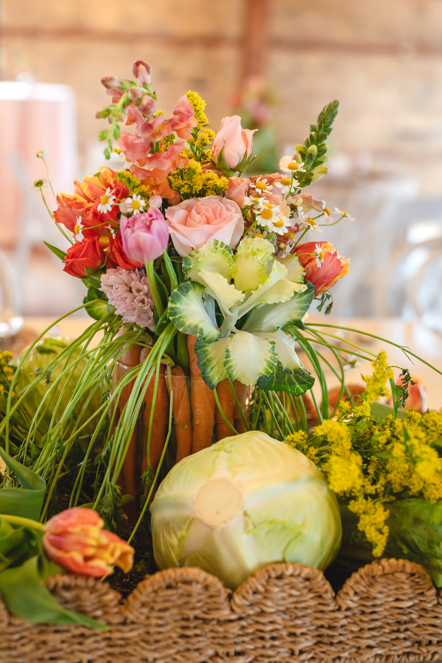 From a lush floral welcome sign to smaller vases, centerpieces, and a full head-table runner, Melody Rose Designs brought color, fresh blooms, and artful arrangements to every corner of the room. They composed cheerful bouquets of tulips, hyacinths, daffodils, snapdragons, chamomile, spray roses, solidago, hypericum berries, ranunculus, and more, mixed with playful bunches of carrots, cabbage, heads of lettuce, turnips, and tomatoes. Asparagus fern also filled in for greenery.
