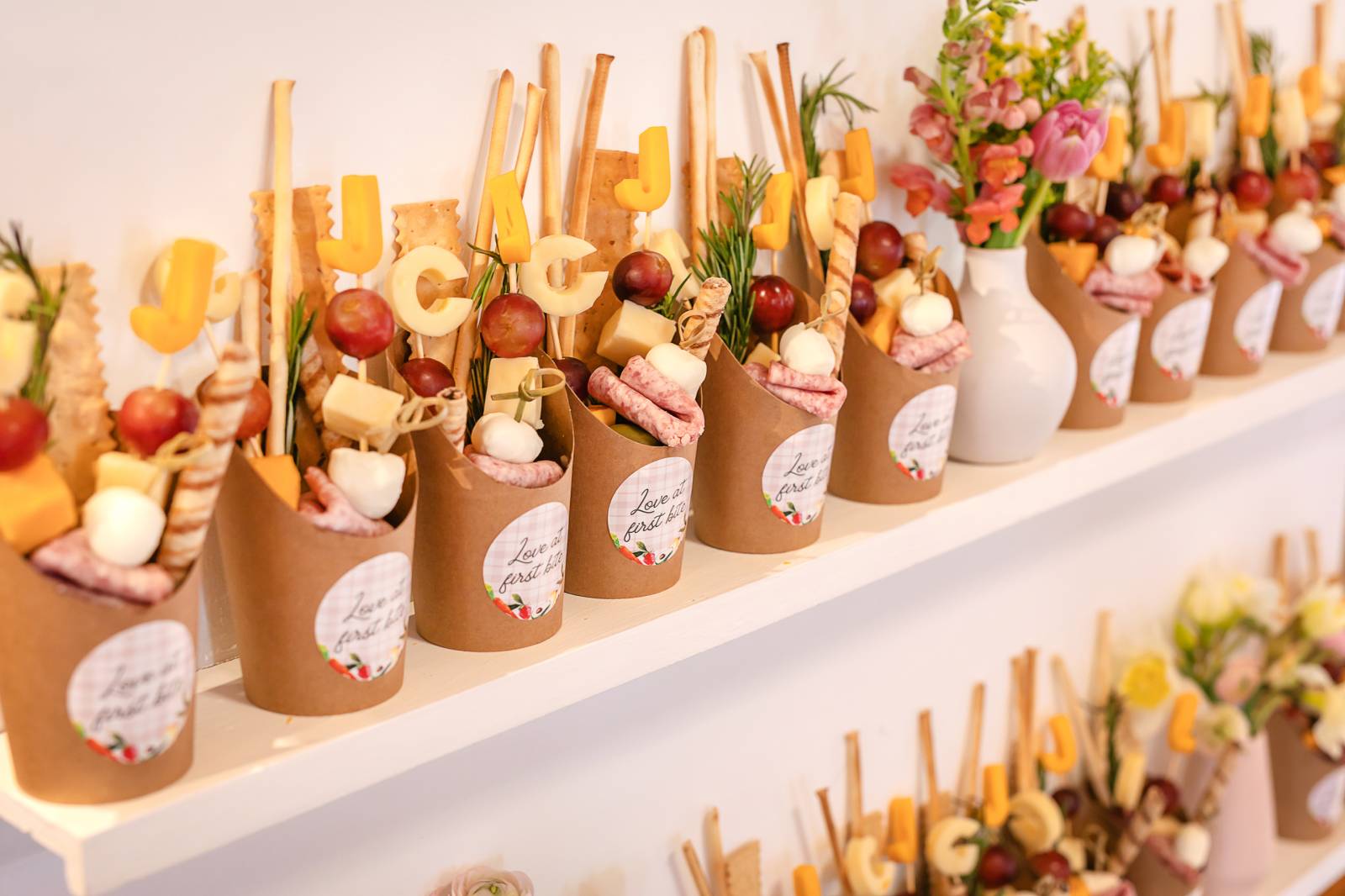 When it came to food, Buck and Honey's Catering focused on delicious, small bites for the day. Guests first helped themselves to a charcuterie wall, cups individually labeled with stickers and filled with meats, cheeses shaped like the couple's initials, fruits, and crackers.