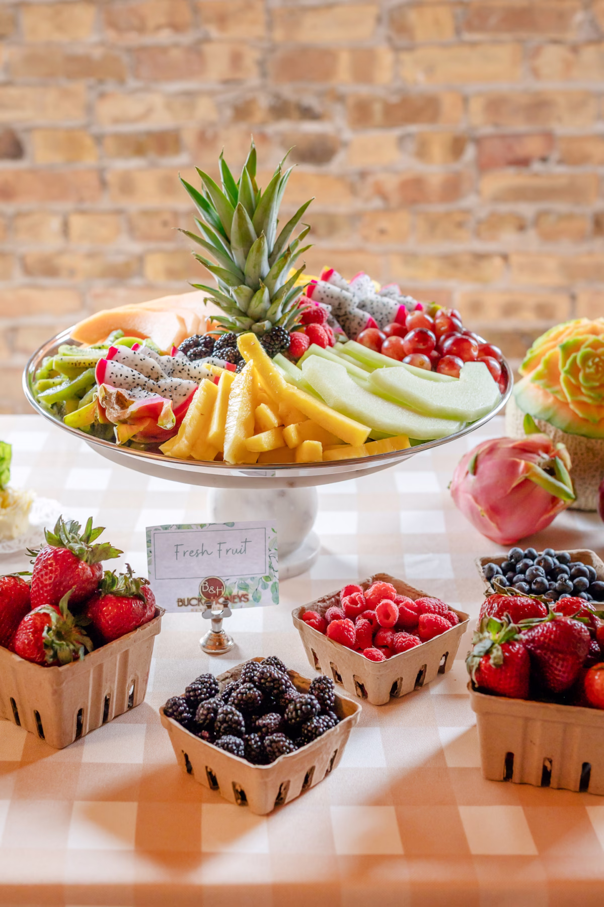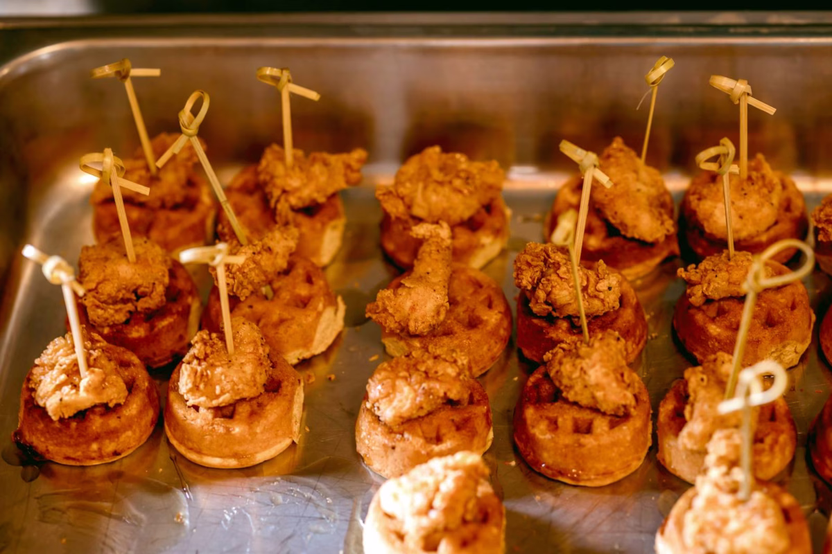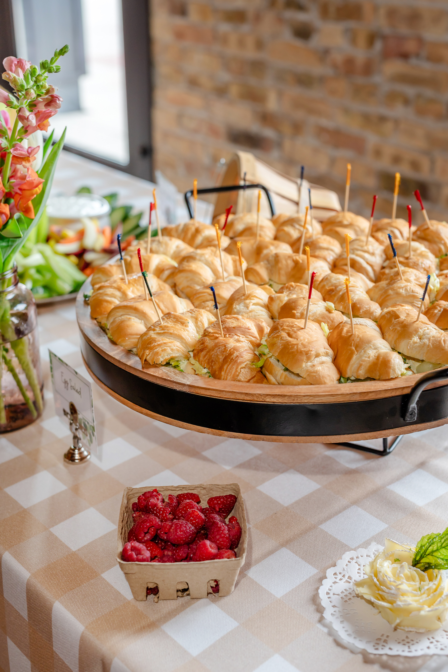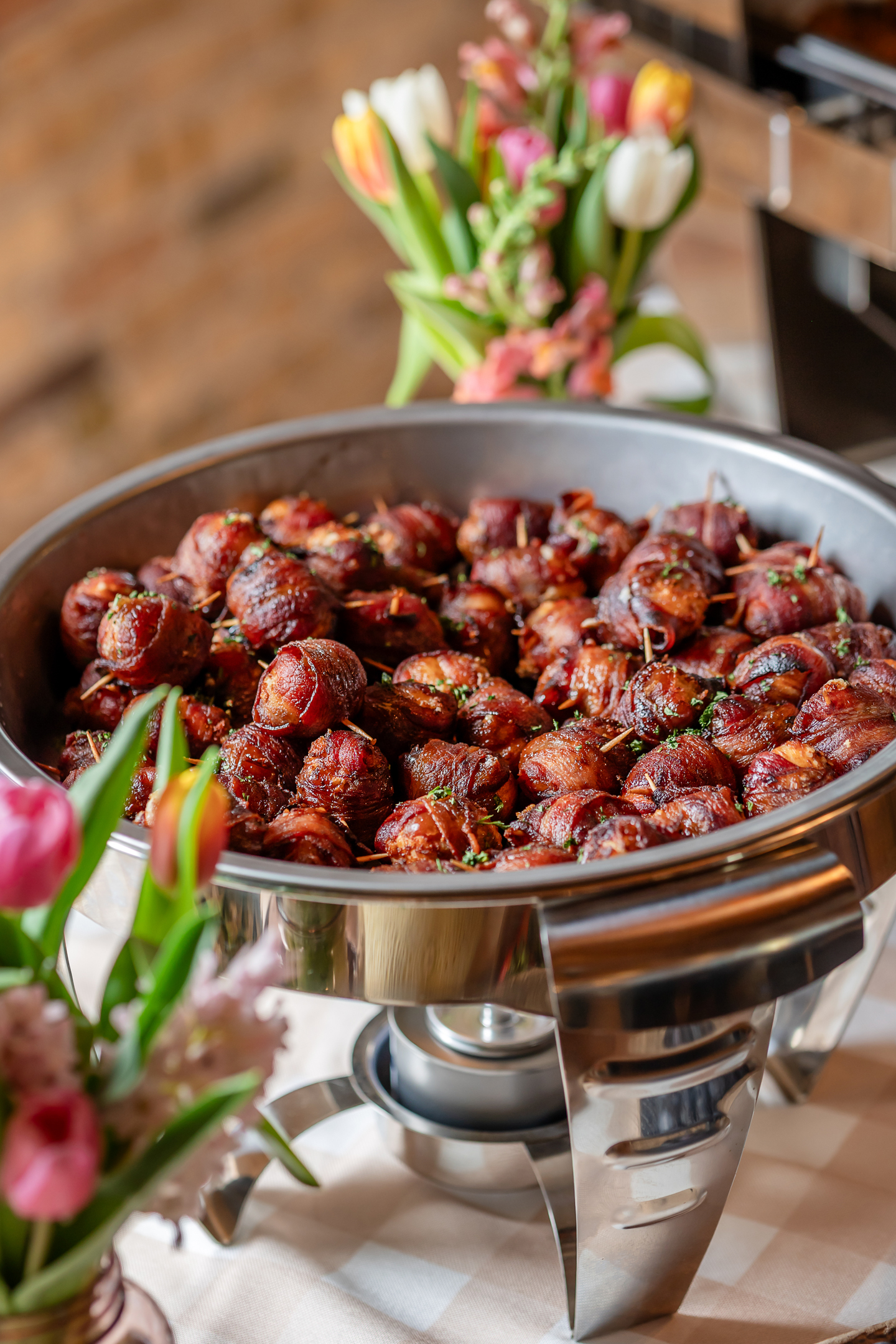 Later, the Buck & Honey's Catering team placed a variety of beautiful and delicious appetizers for guests to graze. The spread included artistically arranged fresh fruit, tea sandwiches on flaky croissants, Bacon-Wrapped Dates, and Chicken and Waffle Bites.
