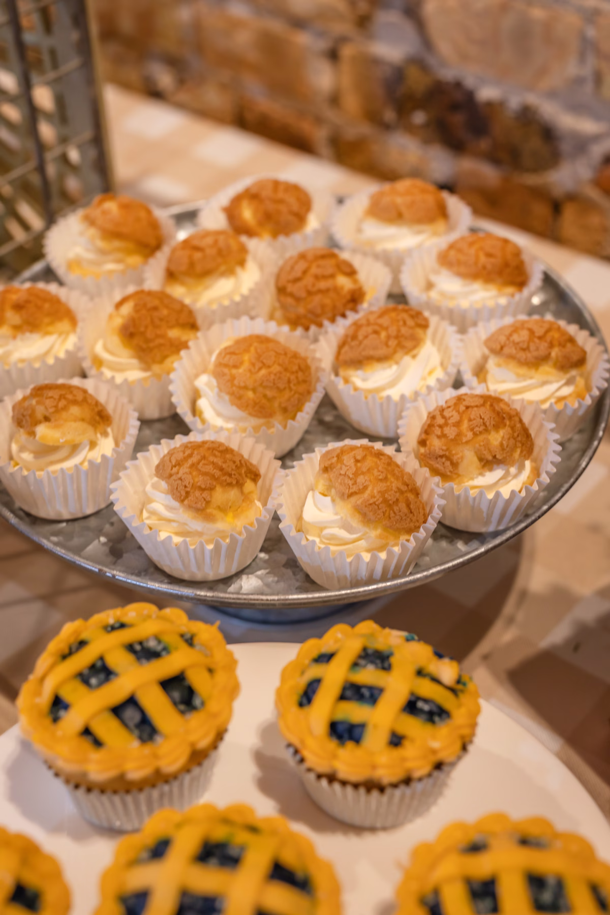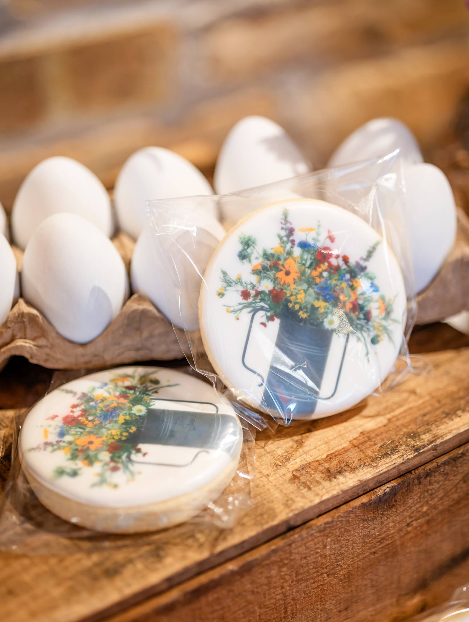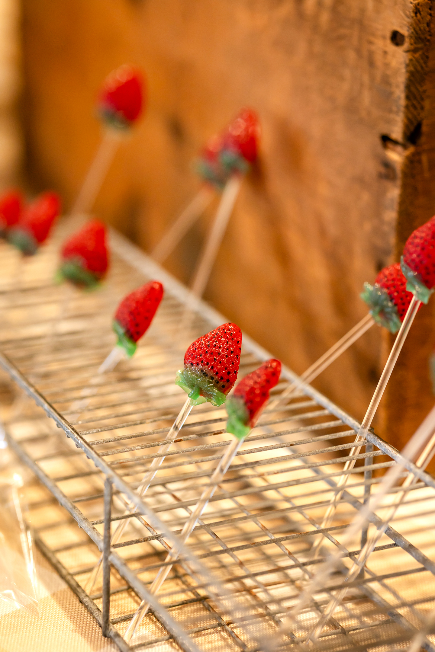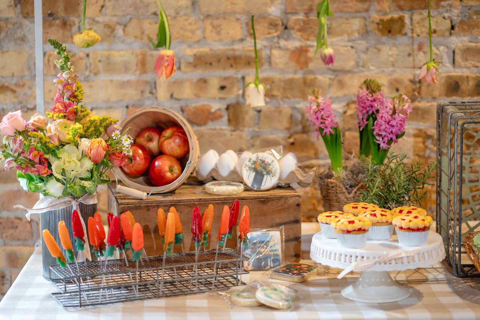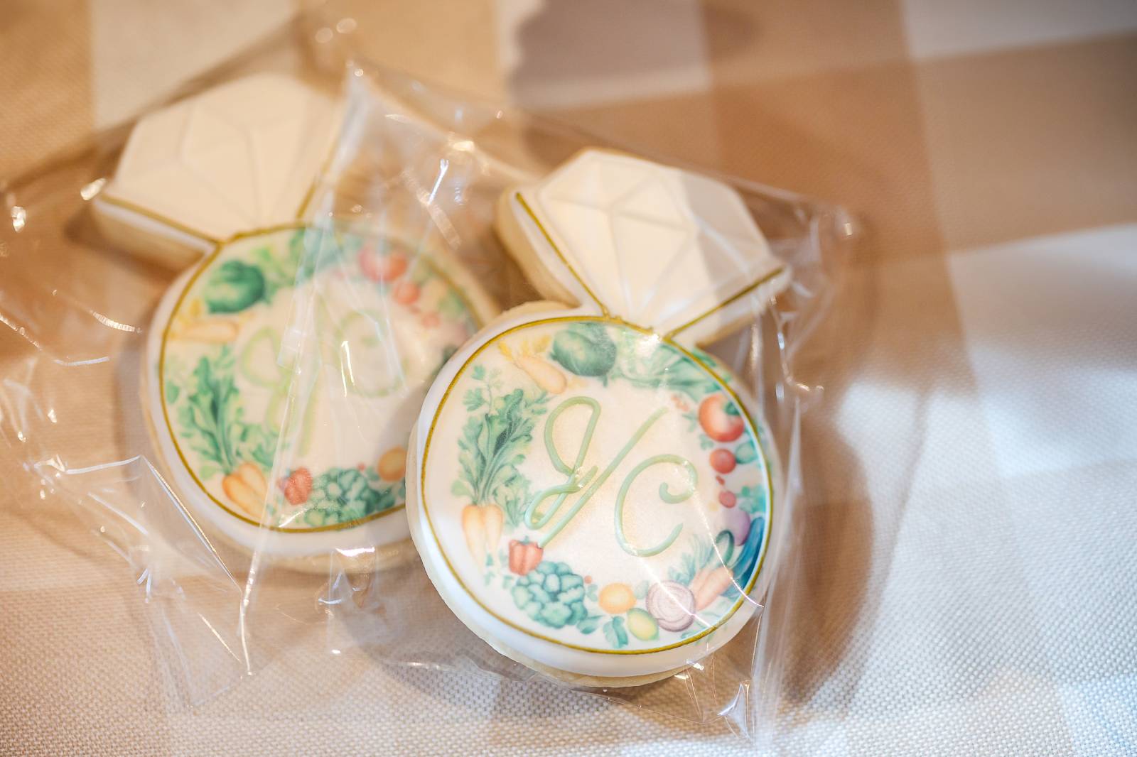 The dessert table was a delicious collaboration between Royally Sweet Cookies, Craig's Cake Shop, and Lily's Magical Treats. Royally Sweet Cookies provided shaped desserts with printed designs and hand-piped details over a smooth layer of royal icing. The themed treats resembled a box of strawberries, a mason jar, a bushel of carrots, a head of lettuce, rings, and more. Craig's Cake Shop brought delicious cream puffs and cupcakes frosted to look like strawberry and blueberry pies.