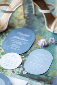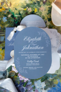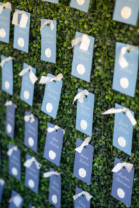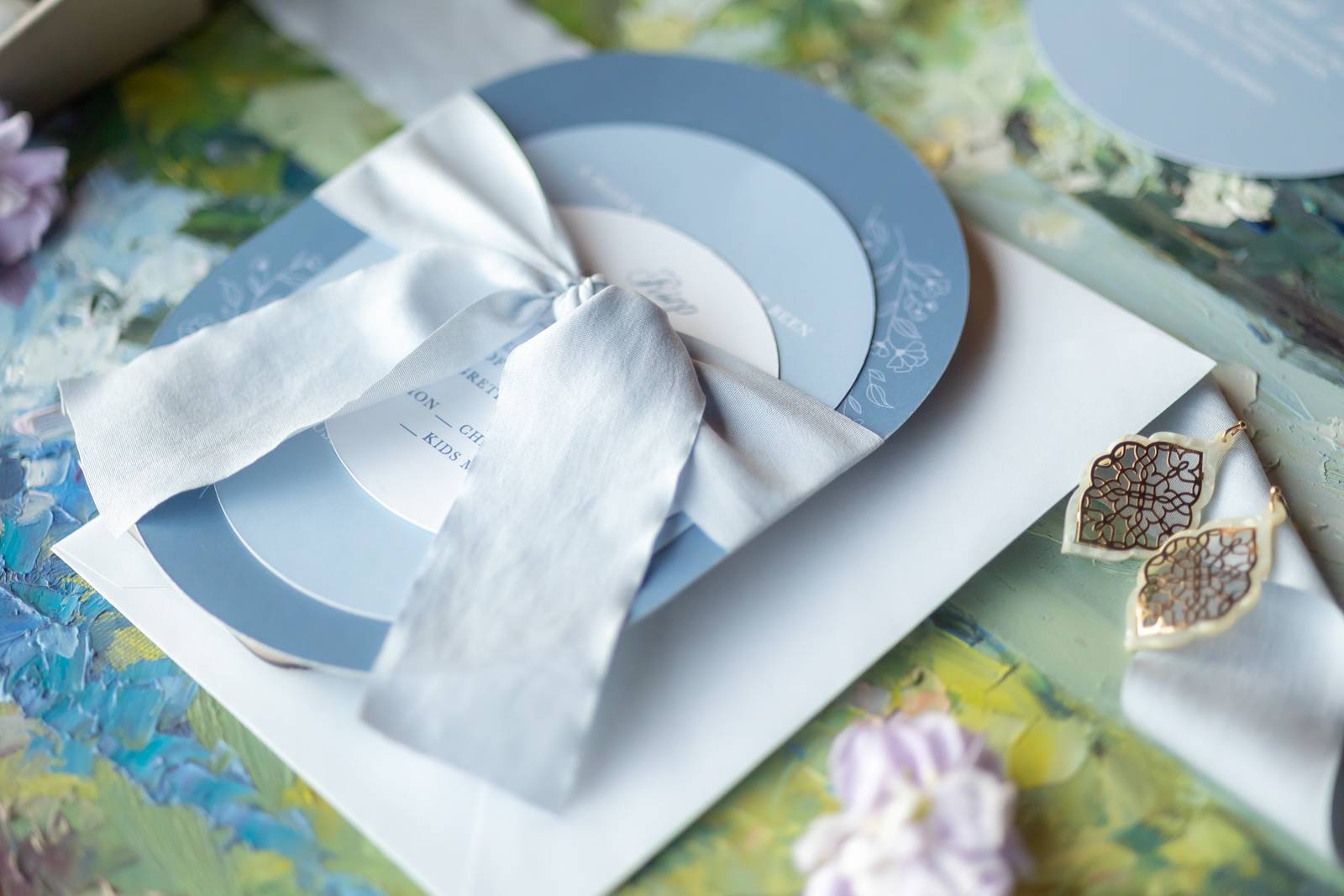 BP Creationery curated a soft and romantic dusty blue-toned stationery suite with an artfully layered invitation bound together by a delicate silk bow. A beautiful, eye-catching ombre-effect escort card boxwood wall gui