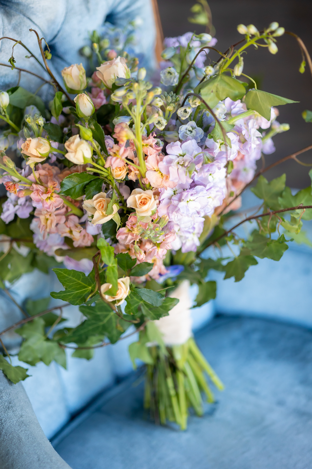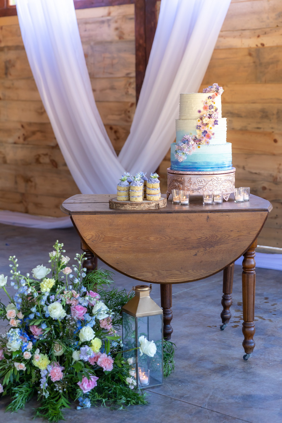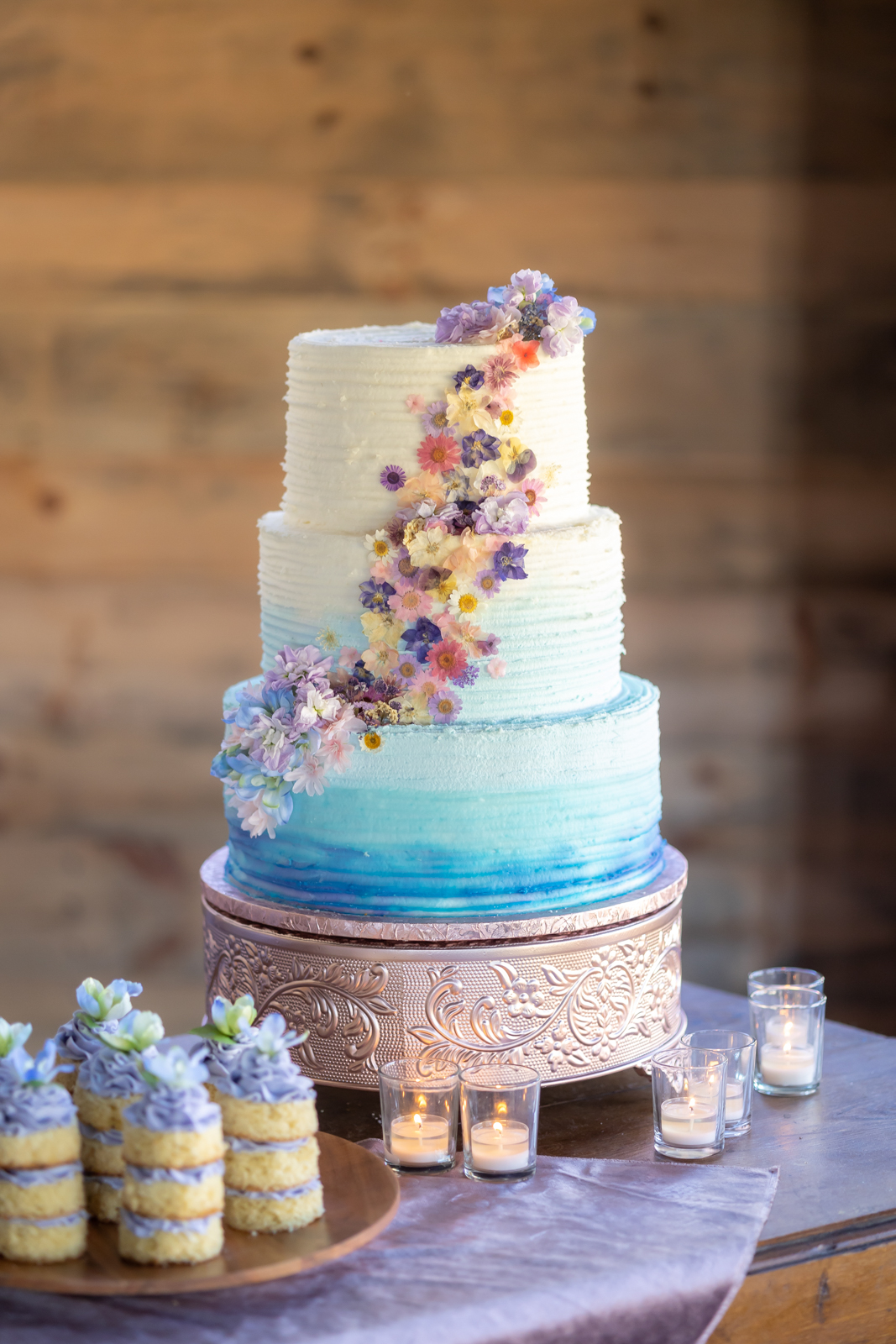 A 3-tiered blue ombre pressed flower cake from Cowboy David’s Bakery adds whimsy and color to the dessert table alongside their layered mini cakes with the perfect spring lilac purple frosting.