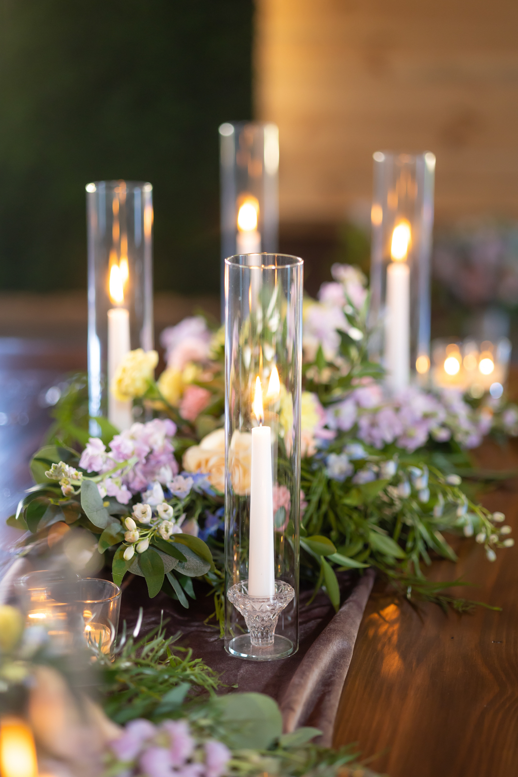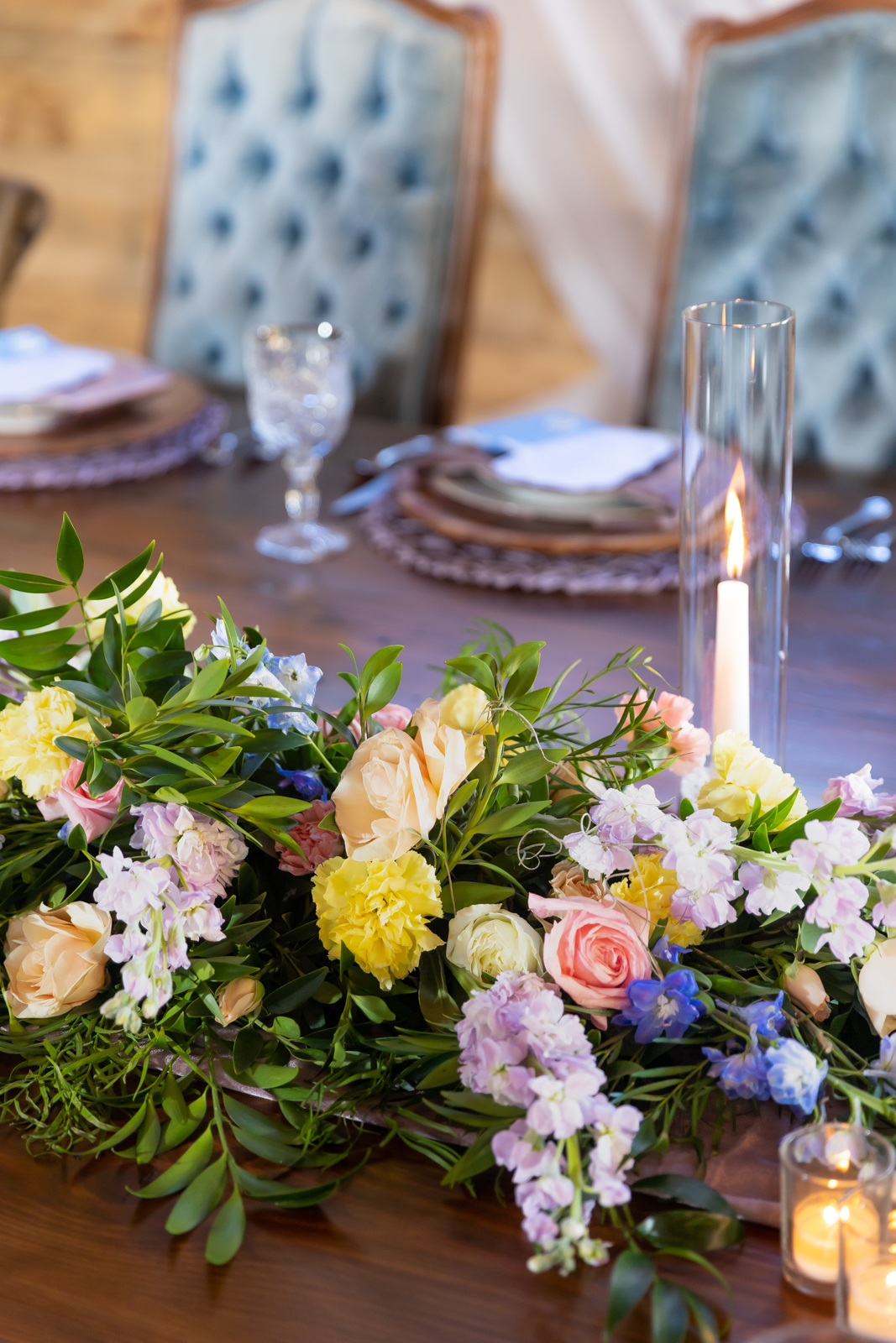Lush garden-inspired florals from Wyld Stem blossom with spring colors and organic texture. A split garland centerpiece serves as the focal point for this dreamy table design, and artistic arrangements of blooms with a whimsical undone feel grace every corner of today’s scape.