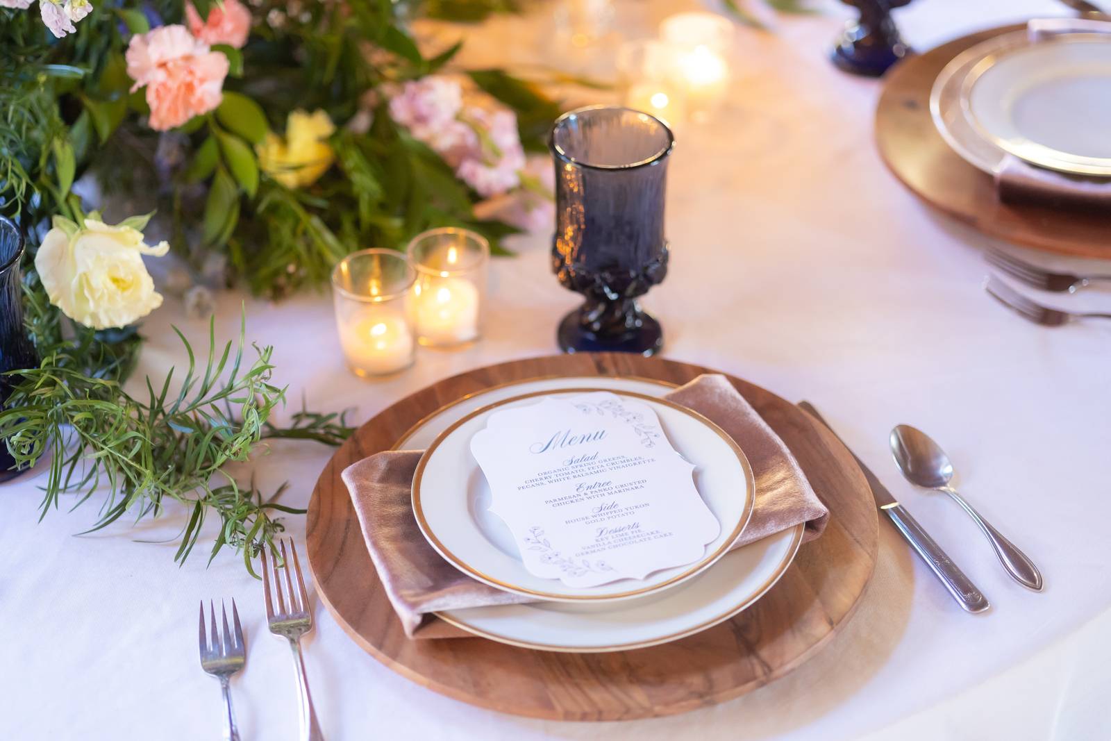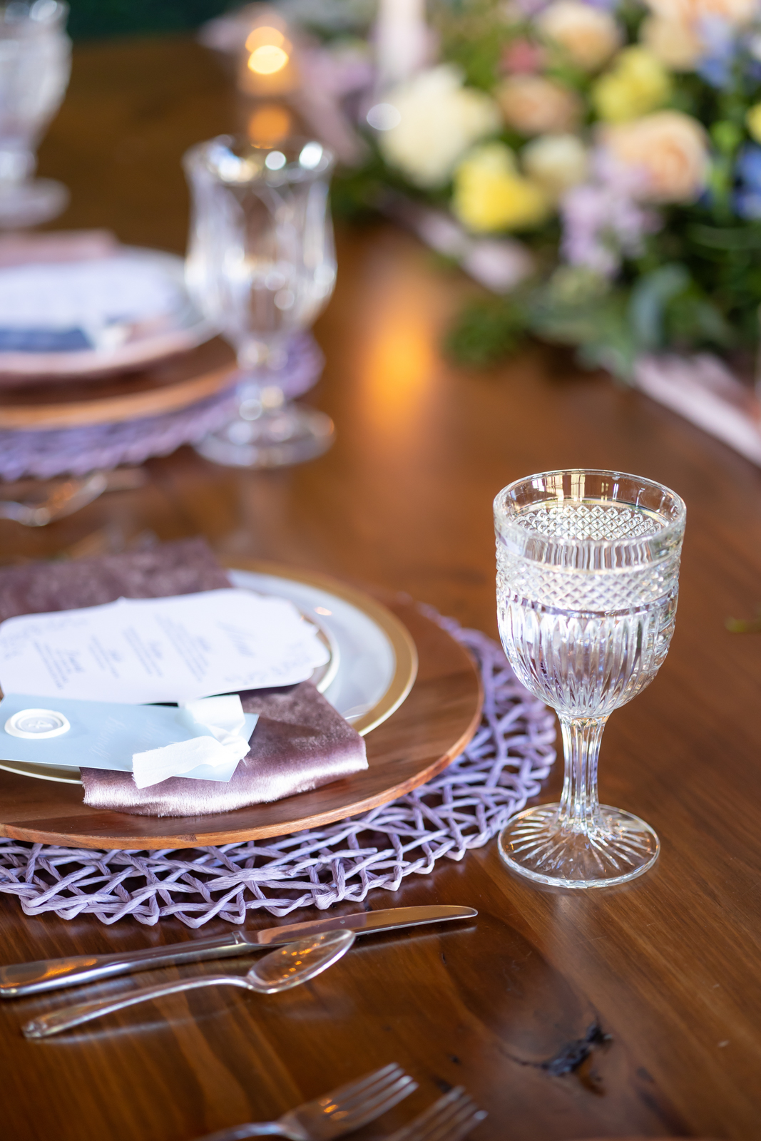 Natural wood tones and textures mix with elegant glassware, luxurious velvet napkins, and glowing candles to continue the rustic-meets-romantic feeling of this wedding look.
