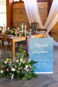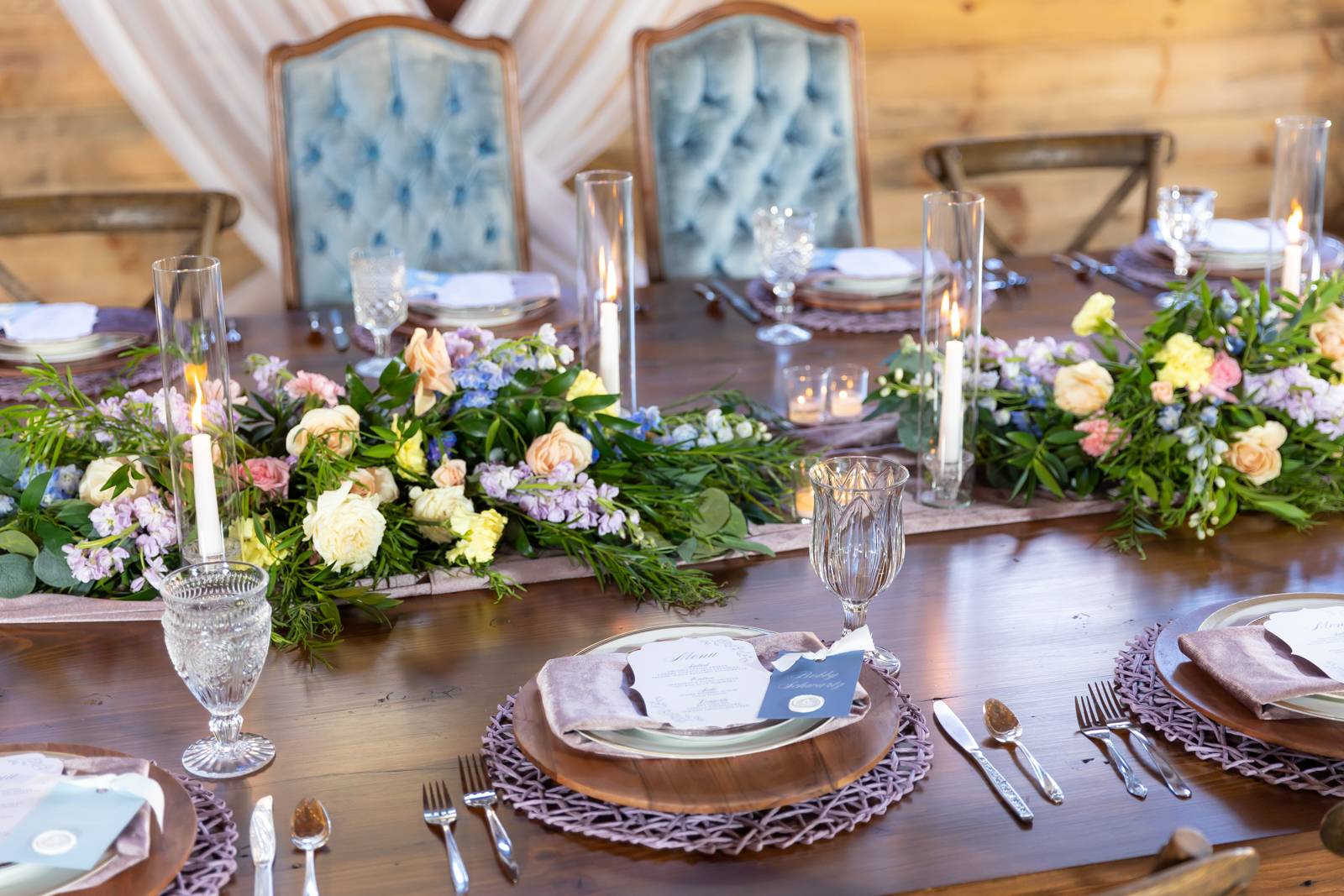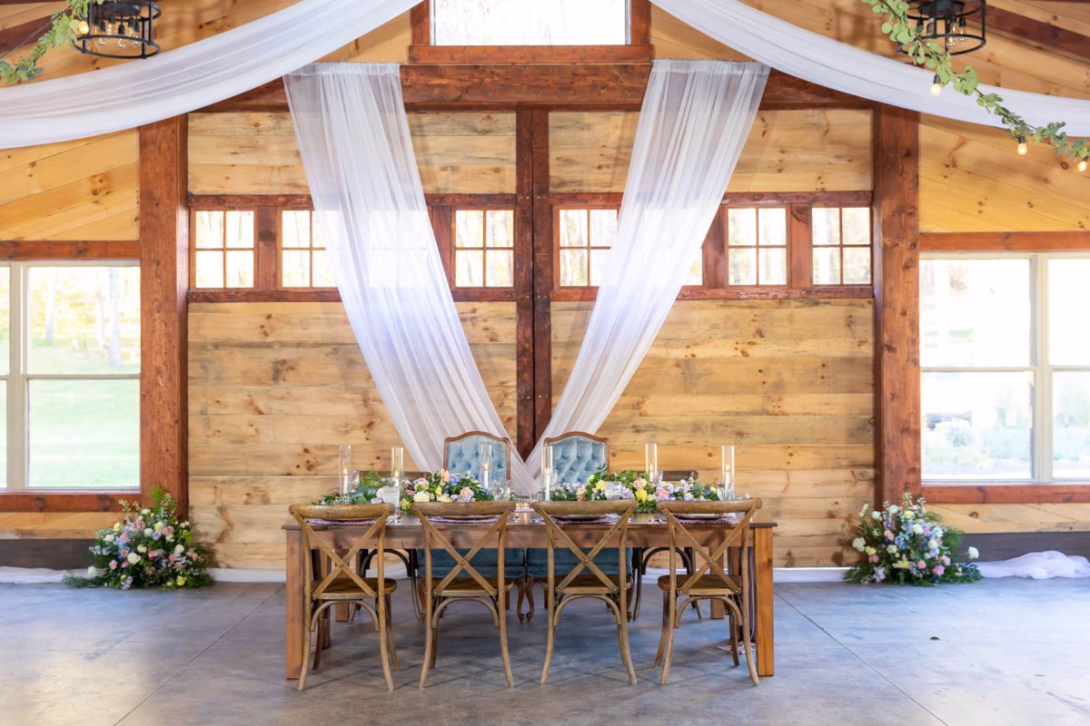 An ethereal drapery ceiling installation from Skies the Limit Events anchors this head table set in Valley Creek’s beautiful reception barn. Harvest tables, wooden cross-back chairs, and elegant blue velvet seating from Resource Vintage Rental lay the foundation for a fairytale-feeling tablescape.