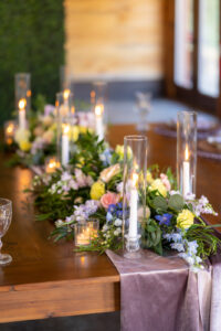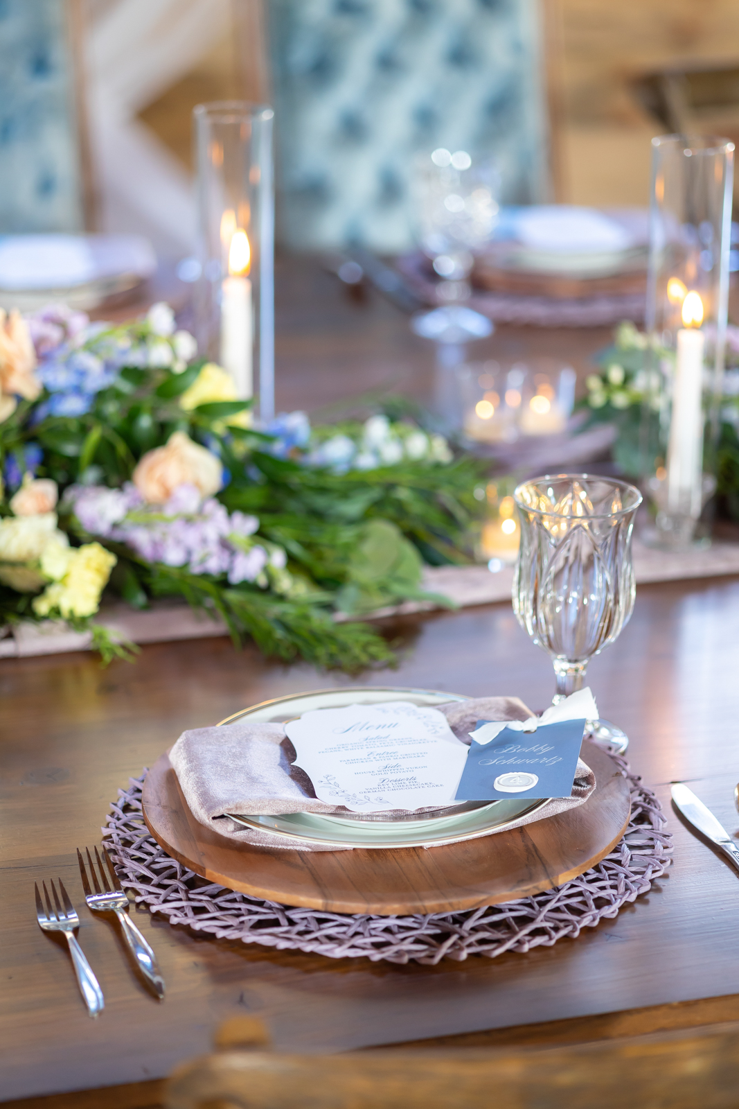 The rich wood tones of Valley Creek‘s wedding and event barn in Holmen, Wisconsin, set the scene for this rustic-meets-romantic wedding design. Coordinated by Skies the Limit Events, dusty blues, and pretty pastel purples, yellows, and pinks blend to create the dreamy ideal color palette for a timely spring-inspired celebration.