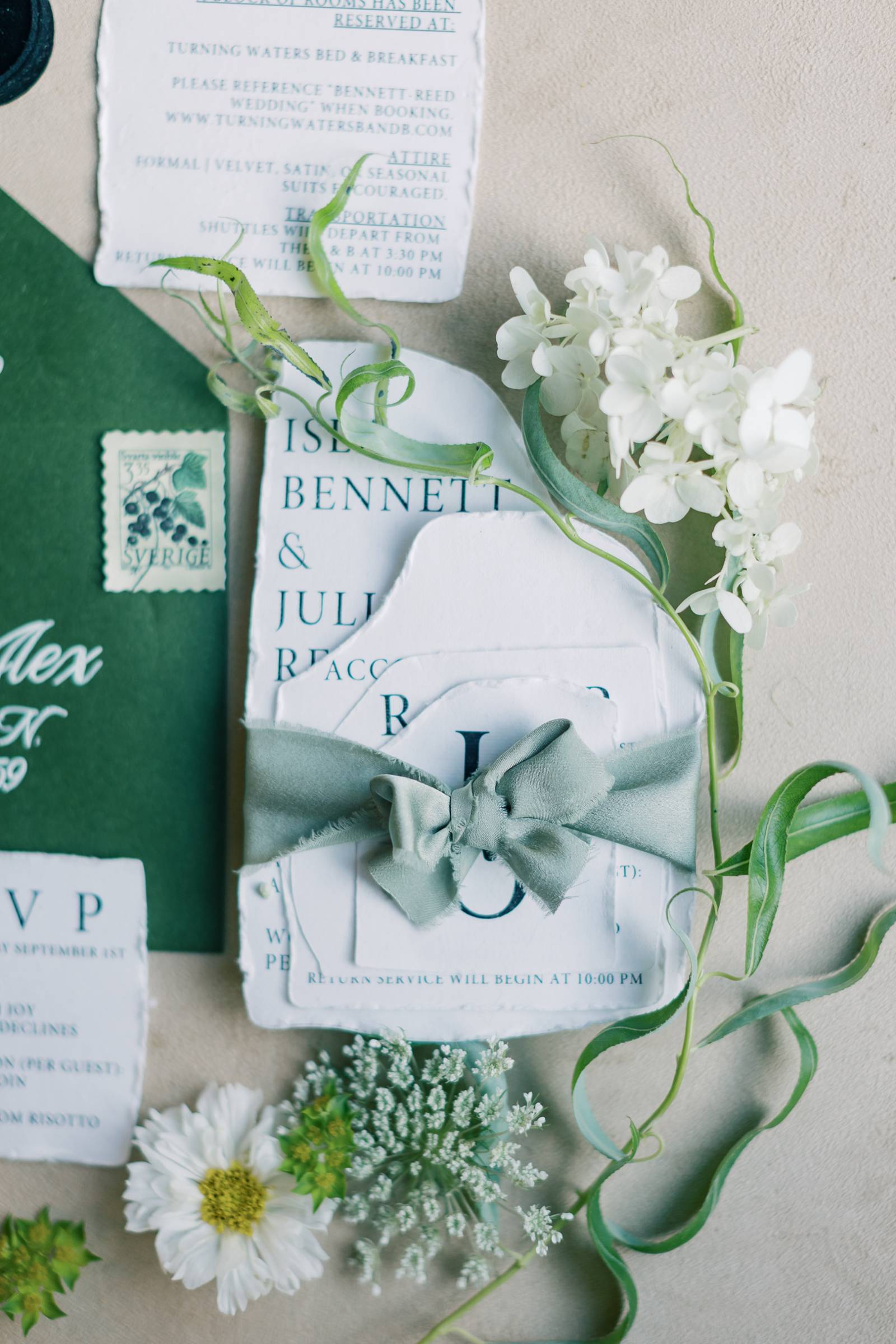 Whimsical Design and Decor embraced organic textures with an invitation suite full of unique shapes and torn edges. The suite, printed on premium white stock, included four pieces of various sizes, layered and secured with an elegant green bow. The fonts were modern and clean, elegantly contrasted with the script font and structure on the dark green envelope.