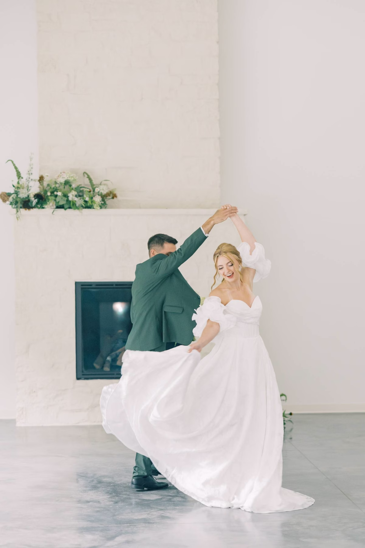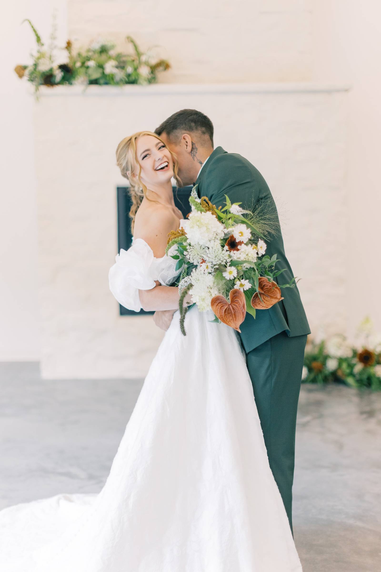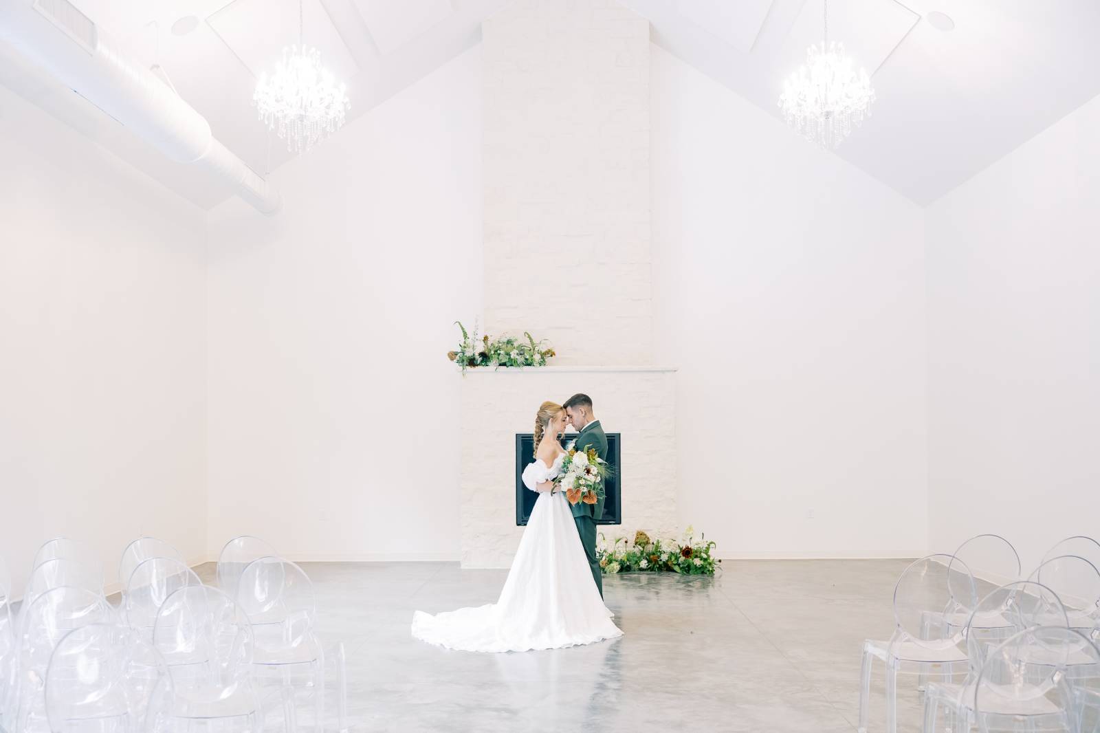 The styled shoot began in the Indoor Ceremony Room, perfect for couples who prefer a stunning, temperature-controlled space to tie the knot (or assurance against inclement weather!). The vaulted, air room boasts abundant natural light and a fireplace backdrop that can be decorated to fit any vision. B-Style Floral framed the fireplace in asymmetrical florals, on the mantlepiece and the floor.