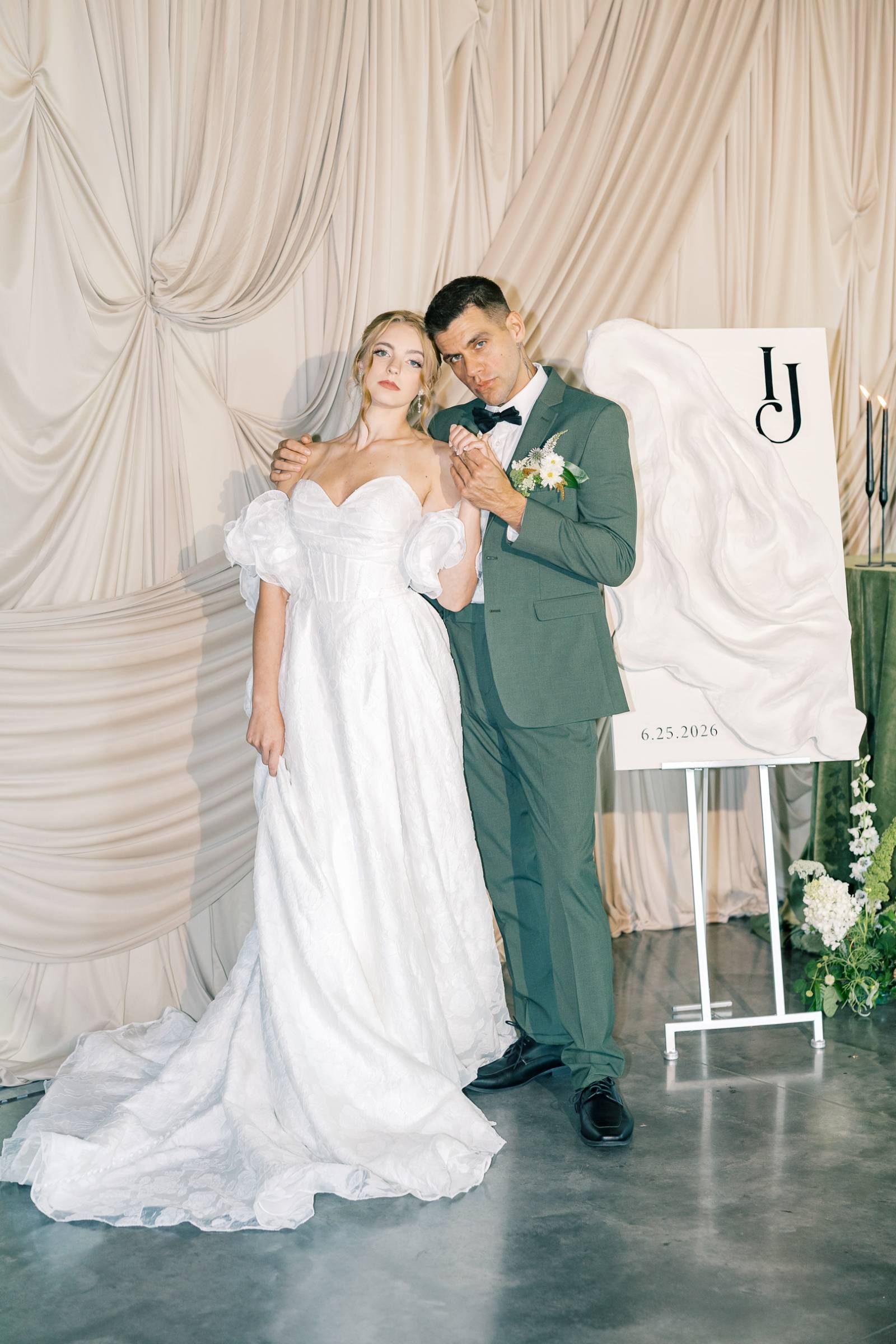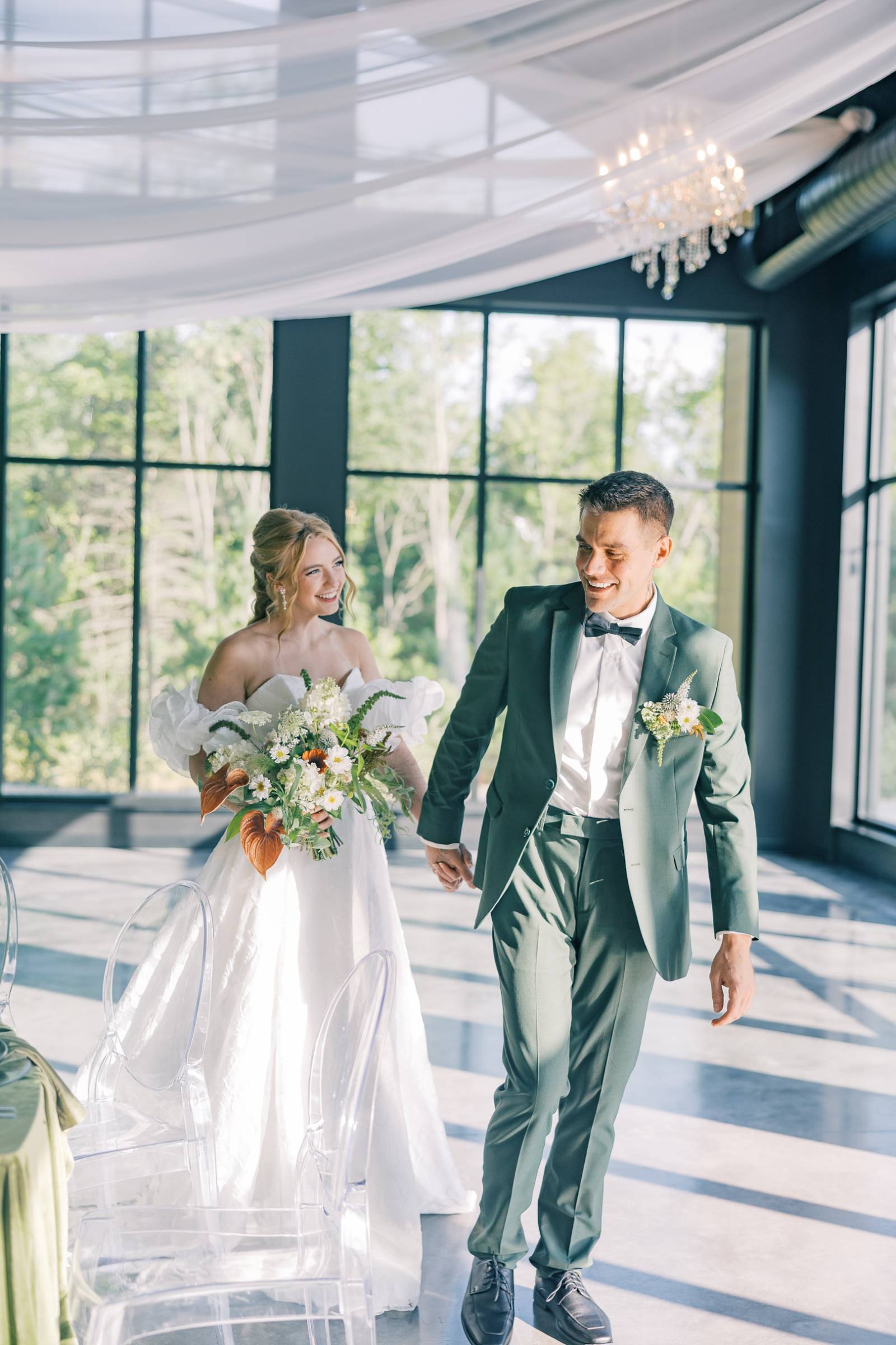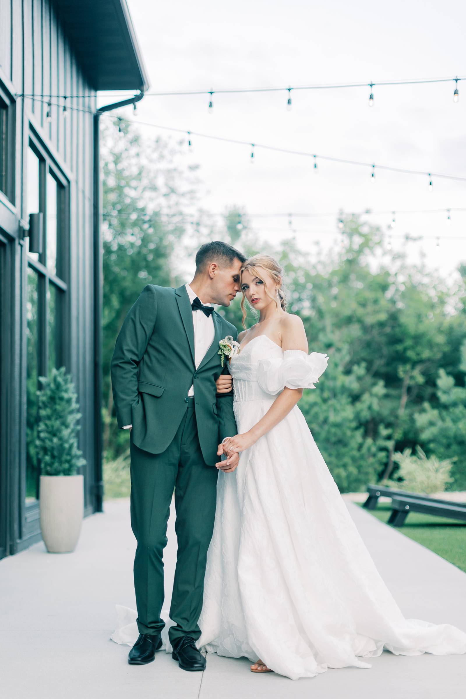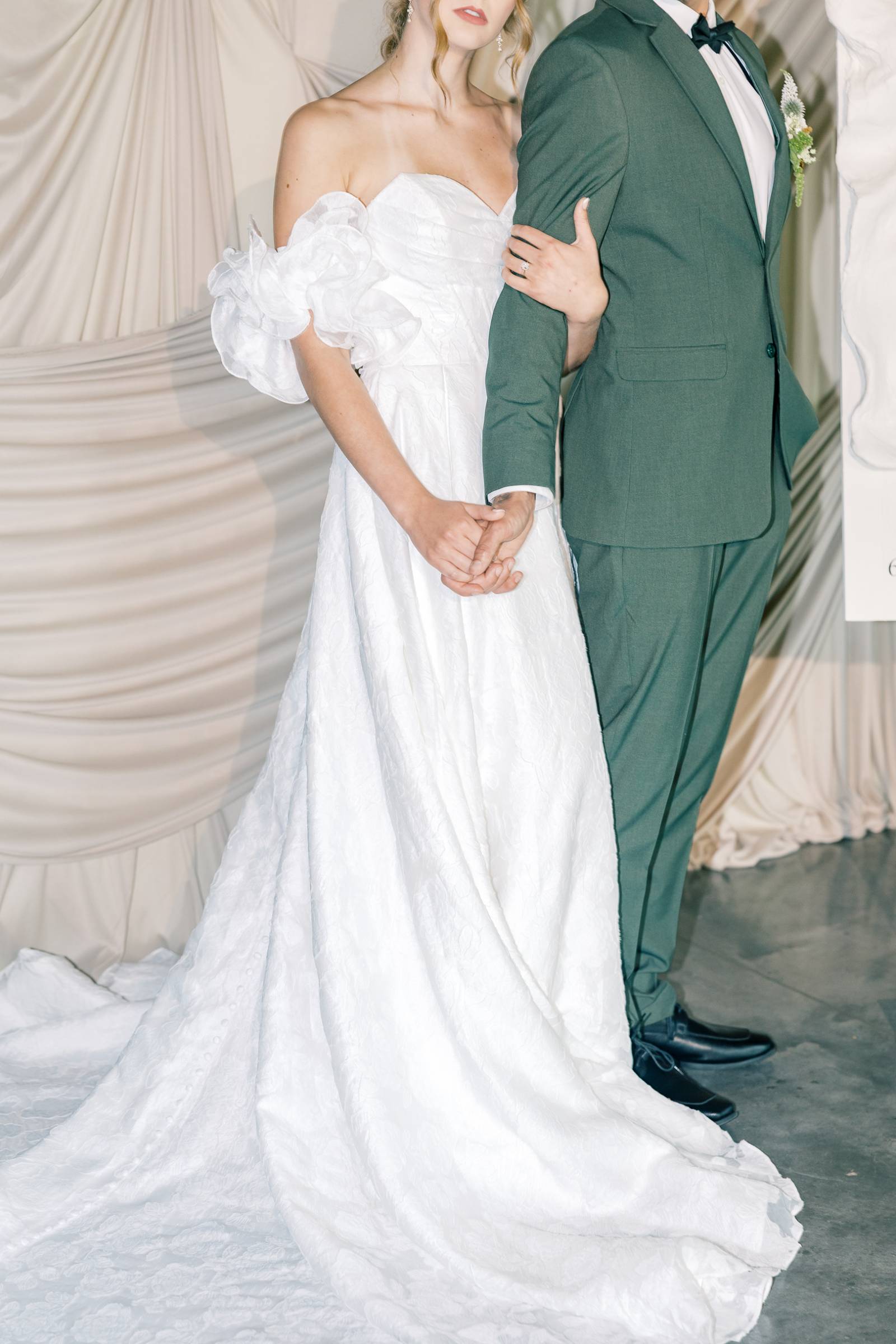 Charlotte’s Bridal & Formal Wear styled the couple in wedding fashions that were soft, elegant, and ethereal. The bride wore a dreamy A-line gown with a structured sweetheart corset and exposed boning. Trendy brocade fabric elegantly pleated at the waist, flowing into a full skirt with a high slit. Her look was completed with optional, puffy sleeves that sat right above the elbow.
