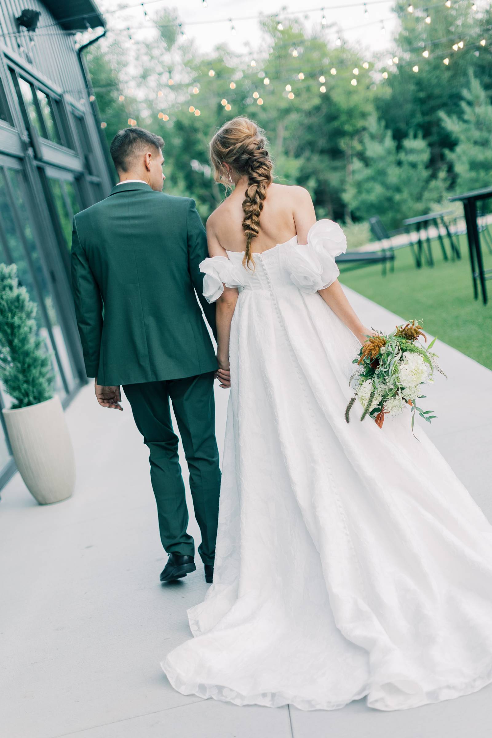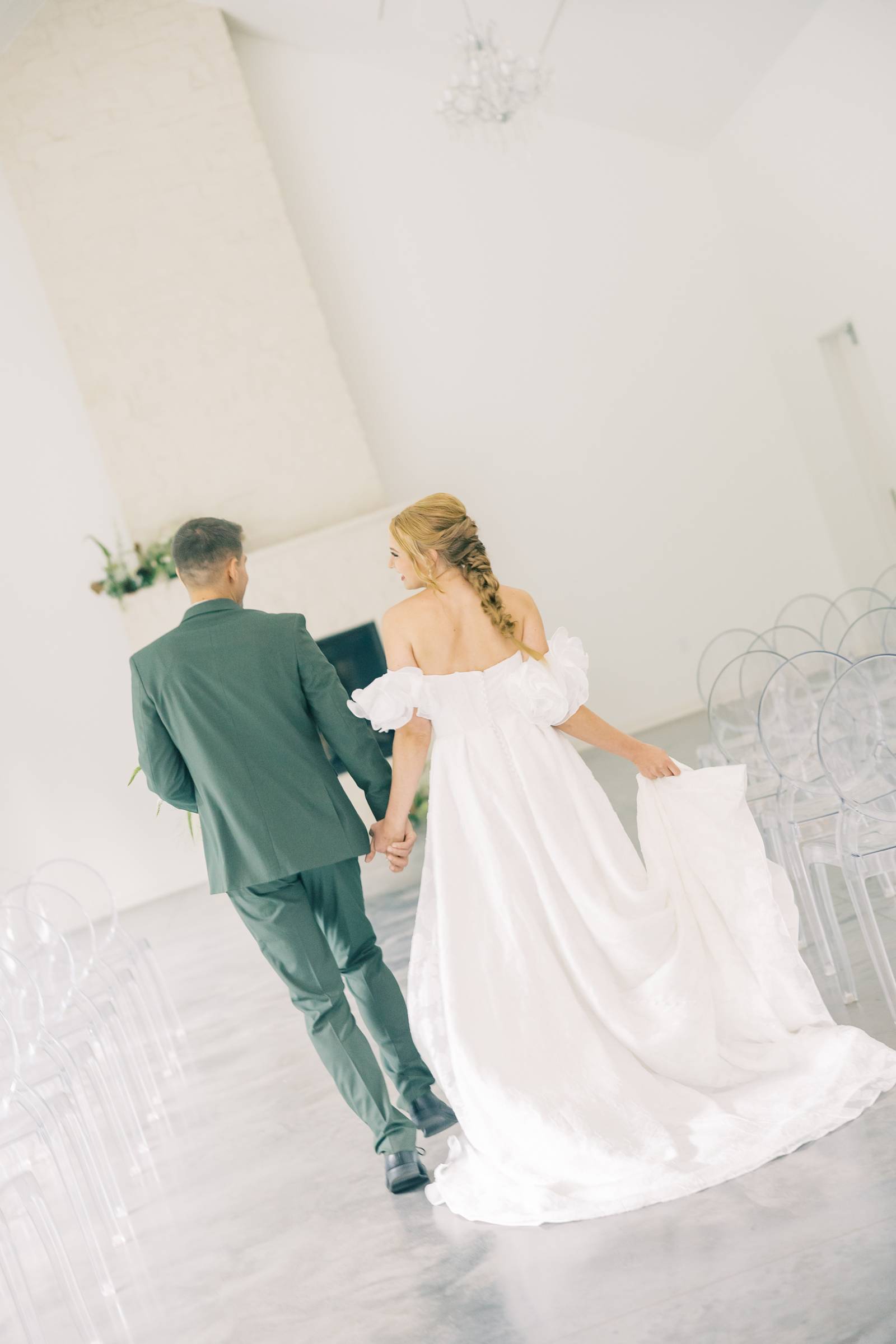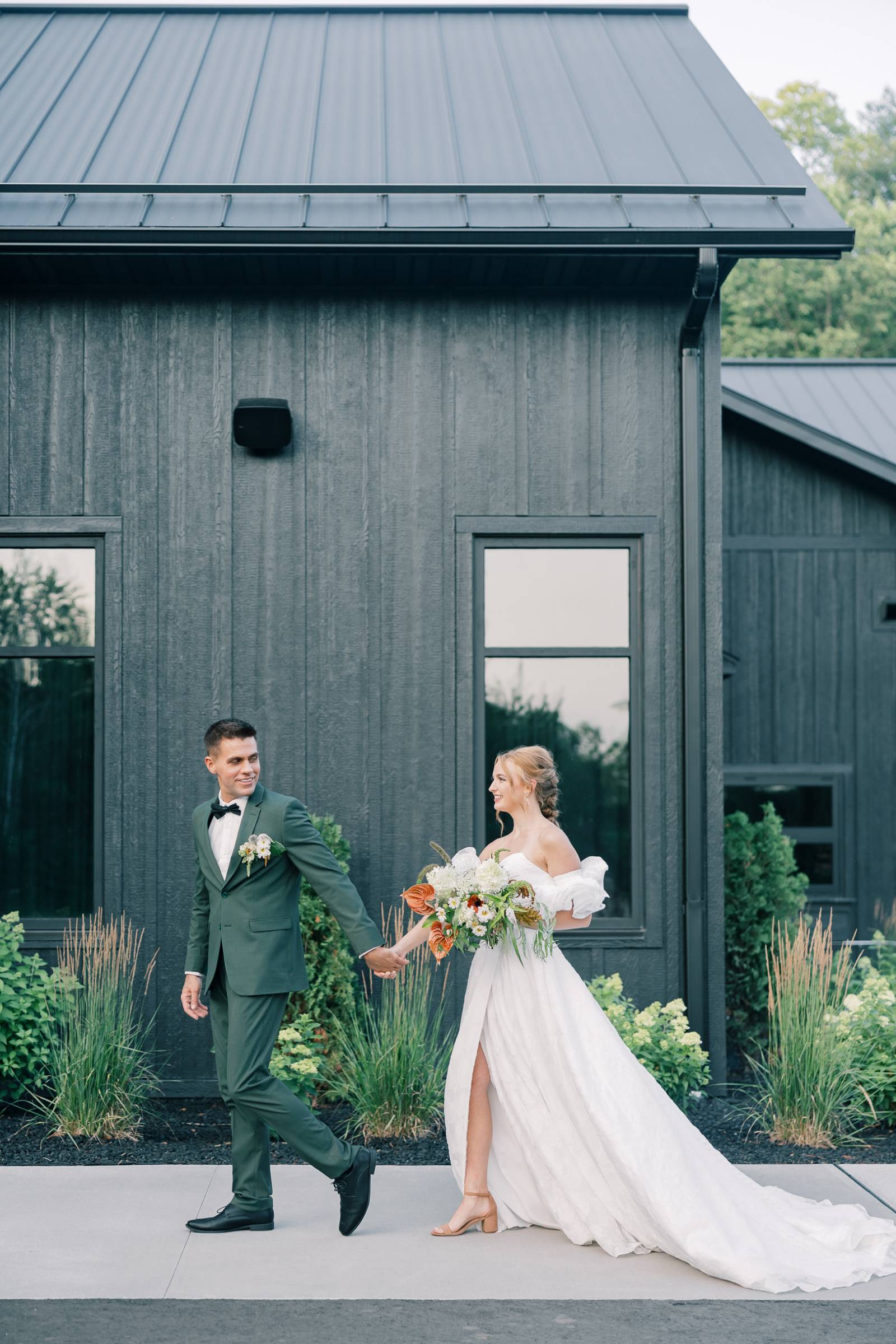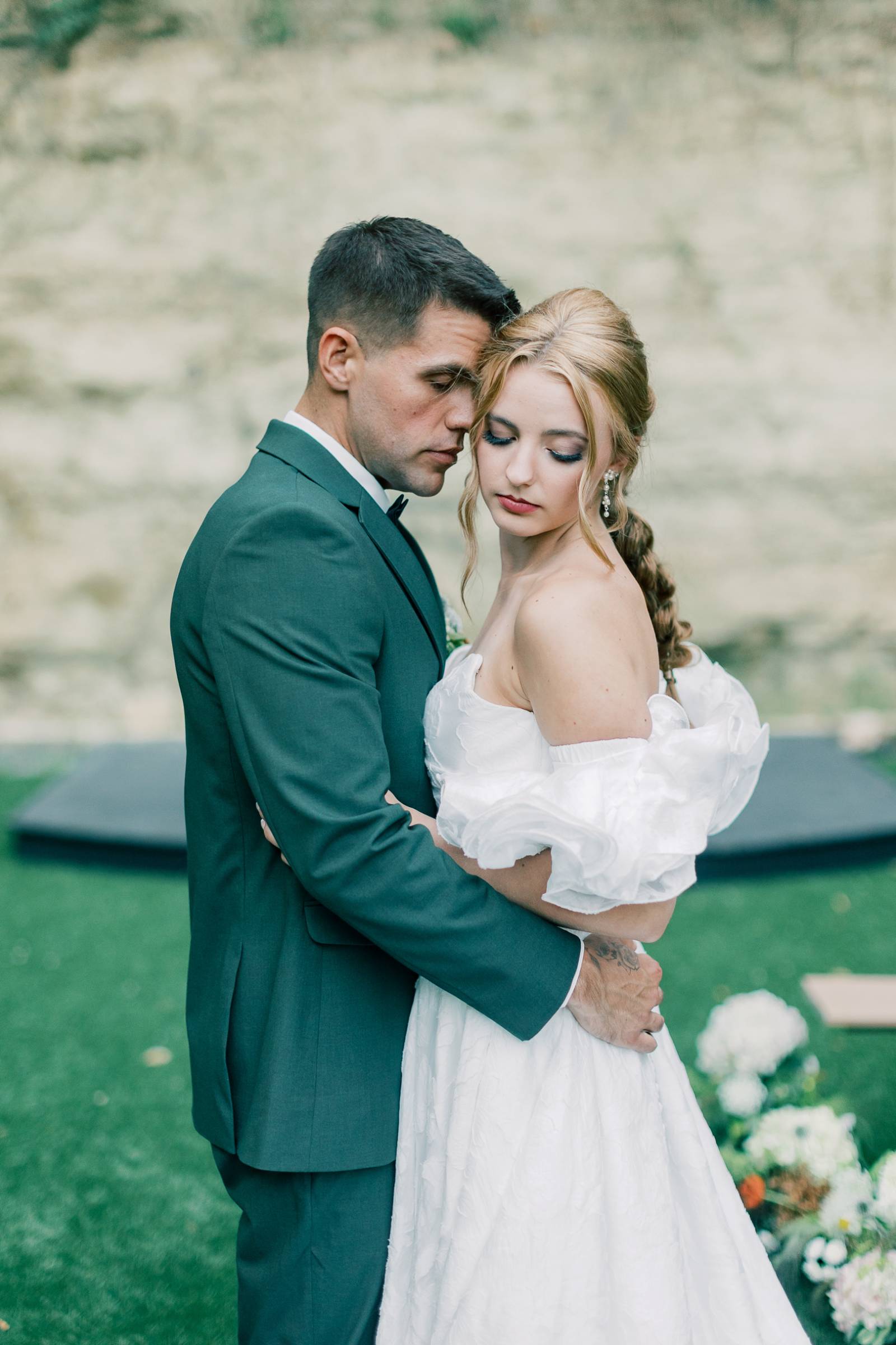 Charlotte’s Bridal & Formal Wear styled the couple in wedding fashions that were soft, elegant, and ethereal. The bride wore a dreamy A-line gown with a structured sweetheart corset and exposed boning. Trendy brocade fabric elegantly pleated at the waist, flowing into a full skirt with a high slit. Her look was completed with optional, puffy sleeves that sat right above the elbow.