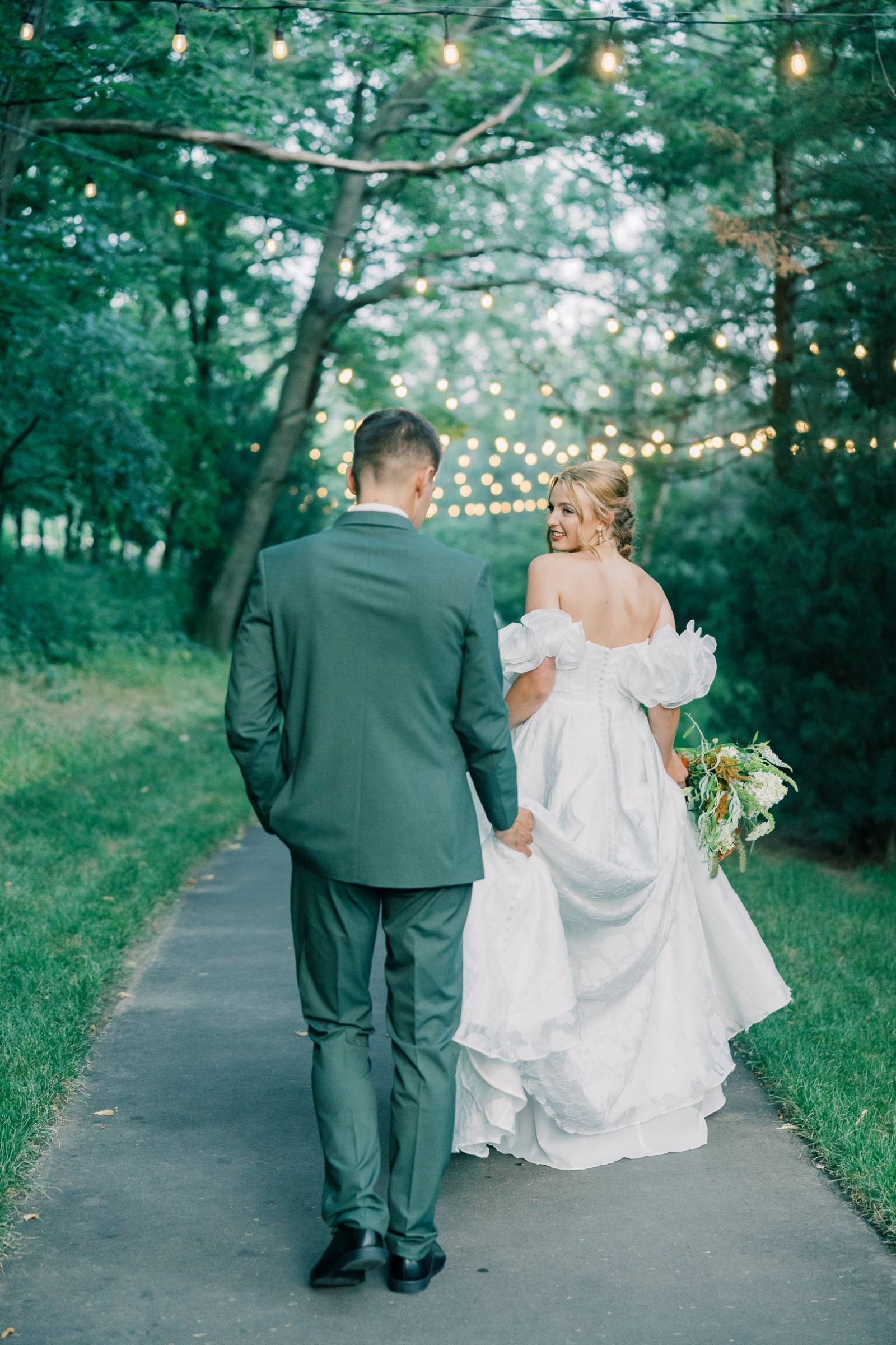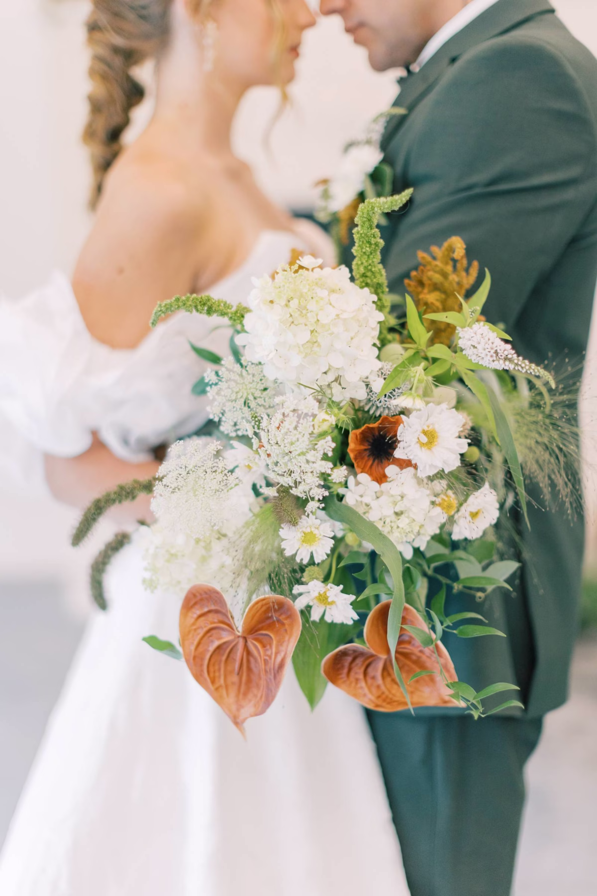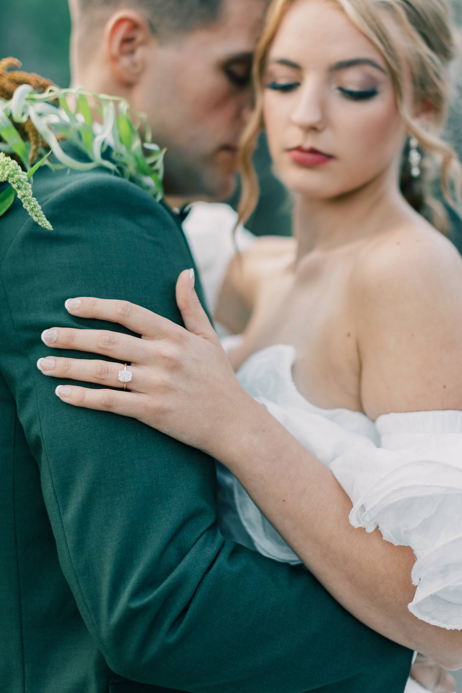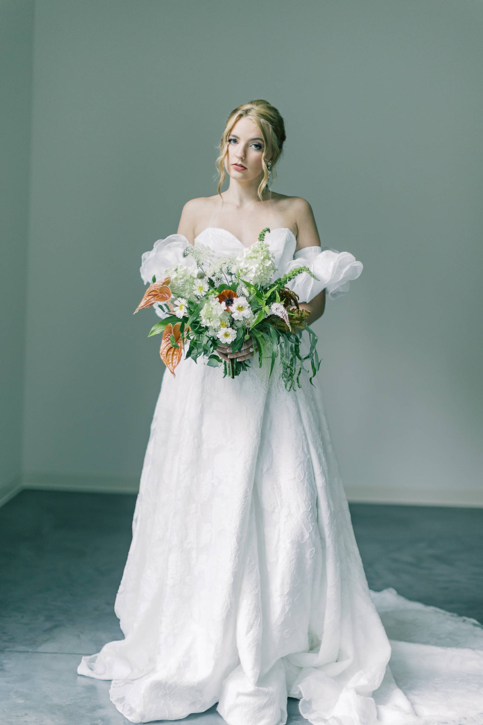 Charlotte’s Bridal & Formal Wear styled the couple in wedding fashions that were soft, elegant, and ethereal. The bride wore a dreamy A-line gown with a structured sweetheart corset and exposed boning. Trendy brocade fabric elegantly pleated at the waist, flowing into a full skirt with a high slit. Her look was completed with optional, puffy sleeves that sat right above the elbow.