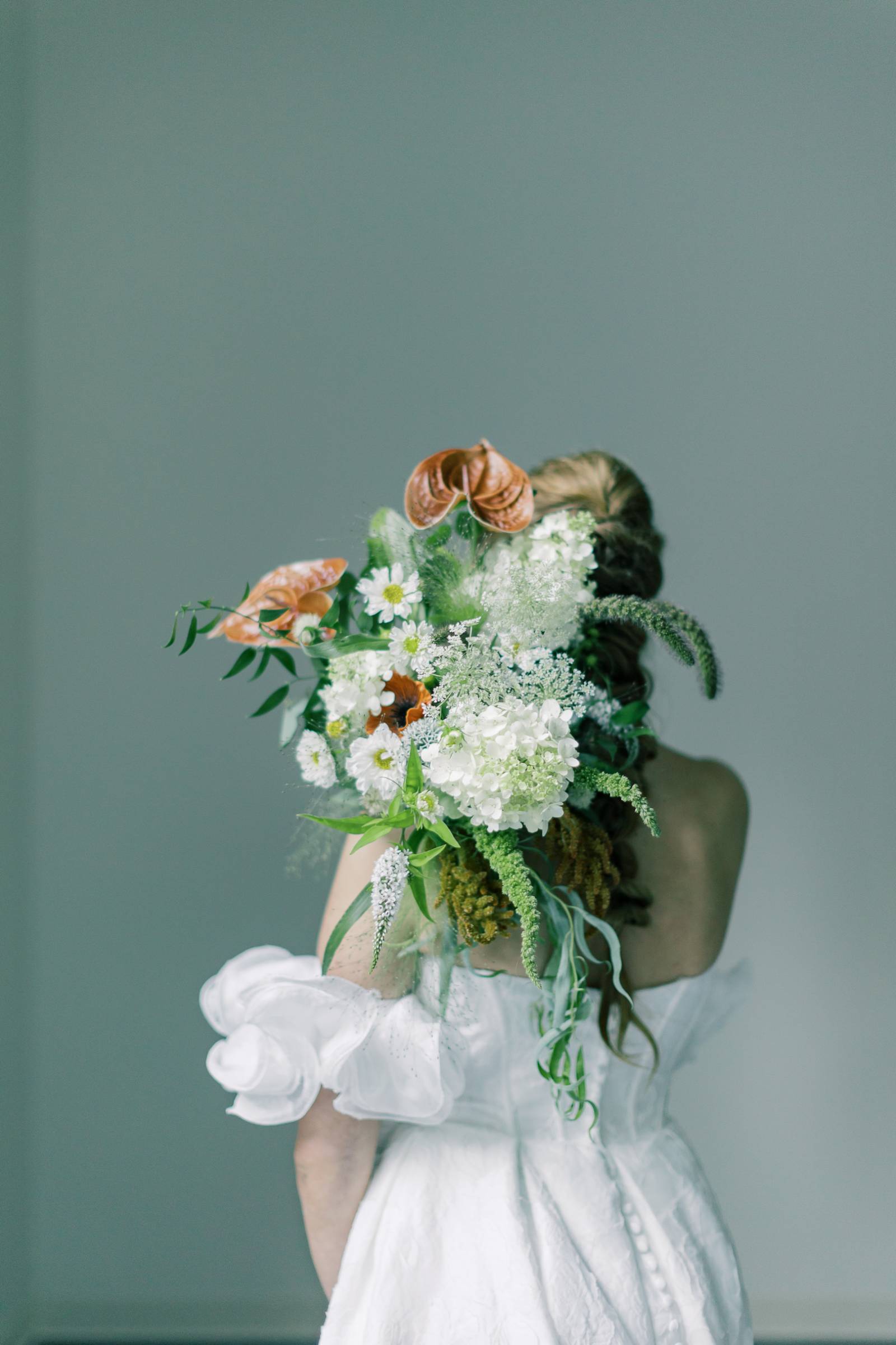 The groom wore a medium-tone, sage-green suit with a white, buttoned undershirt and a satin bow tie, and was accessorized with a whimsical, oversized pocket floral by B-Style Floral.