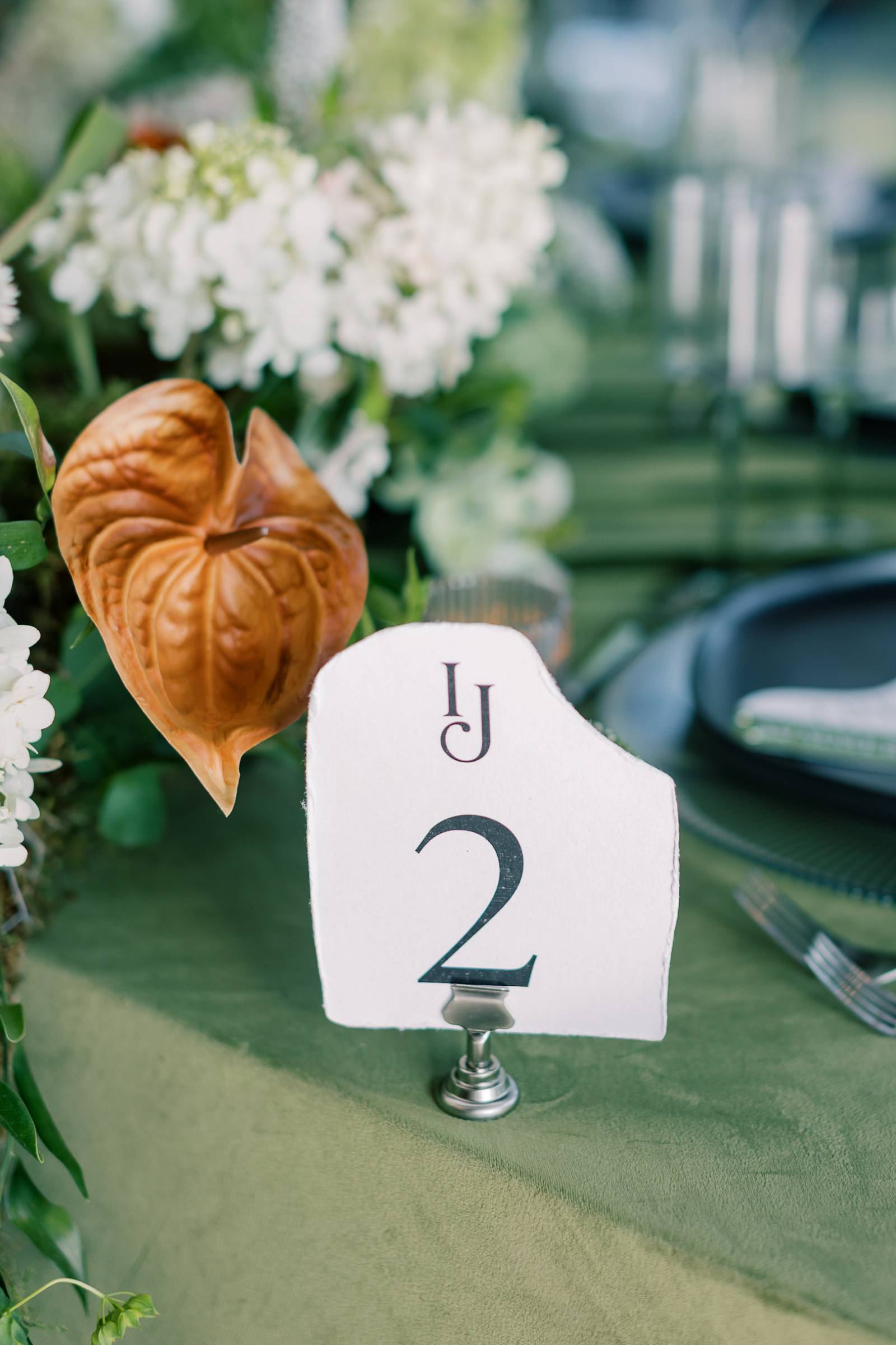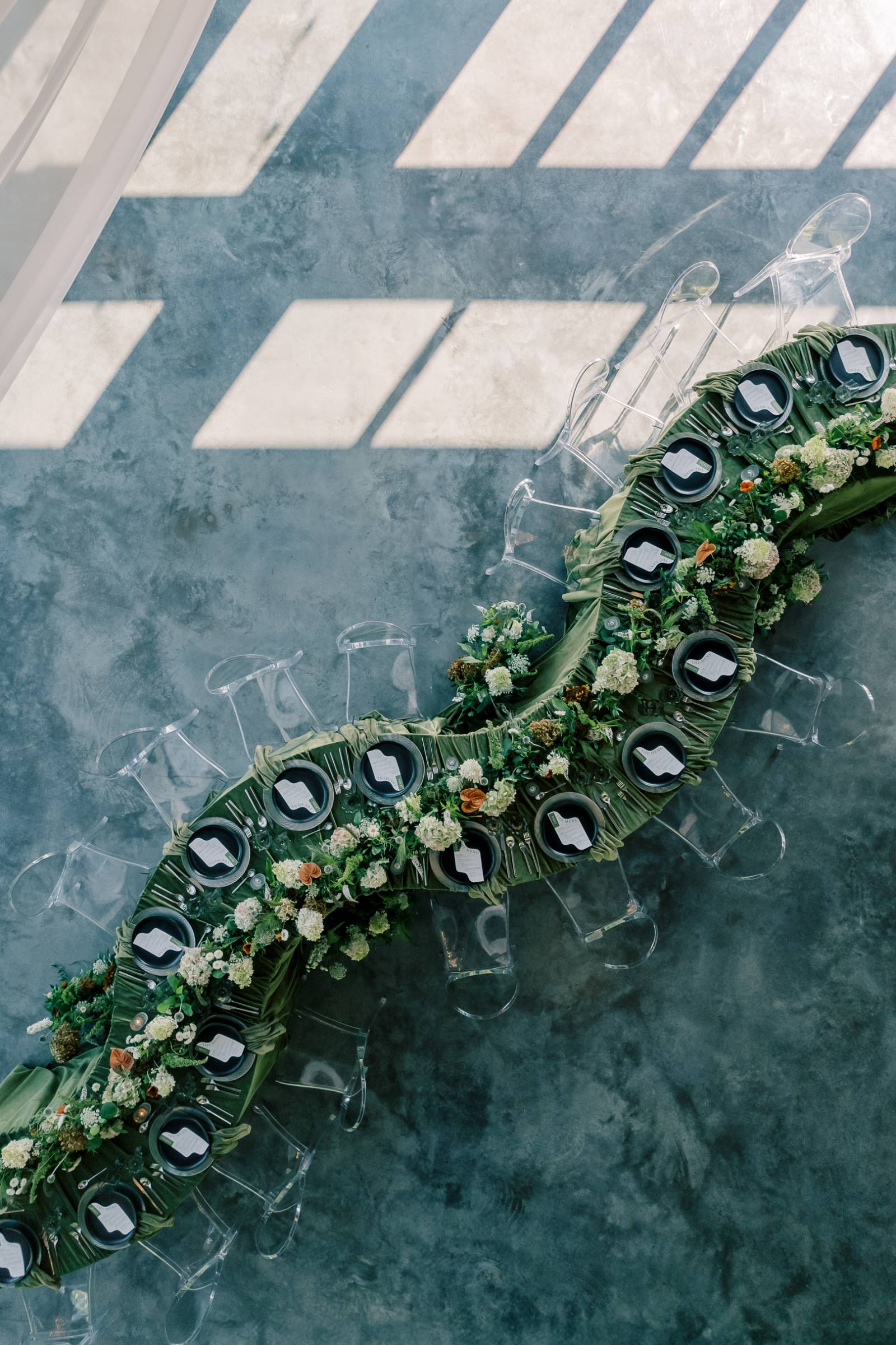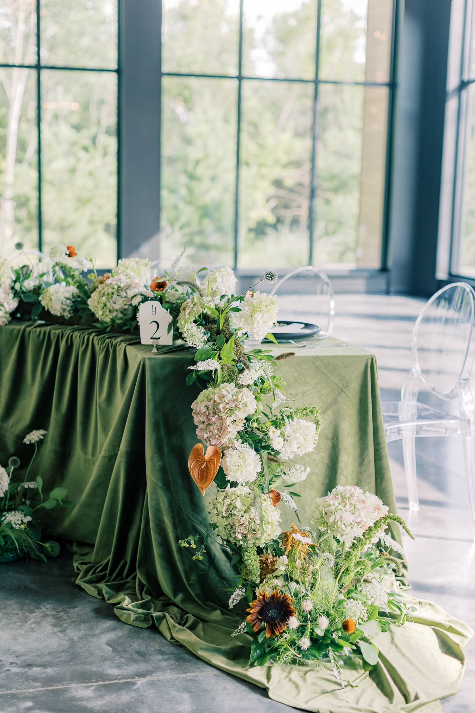At the reception, the tablescape featured many beautiful rentals from Orange Door Weddings, starting with serpentine tables set with acrylic chairs and covered in green velvet drapings and linens. Tablewear included (striped glass) chargers, black plates, and scalloped wine glasses. B-Style Floral fashioned a lush floral centerpiece spanning the length of the table and cascading from the edge. Along with abundant greenery, prominent blooms included white hydrangeas, orange anthurium, and scabiosa pods.