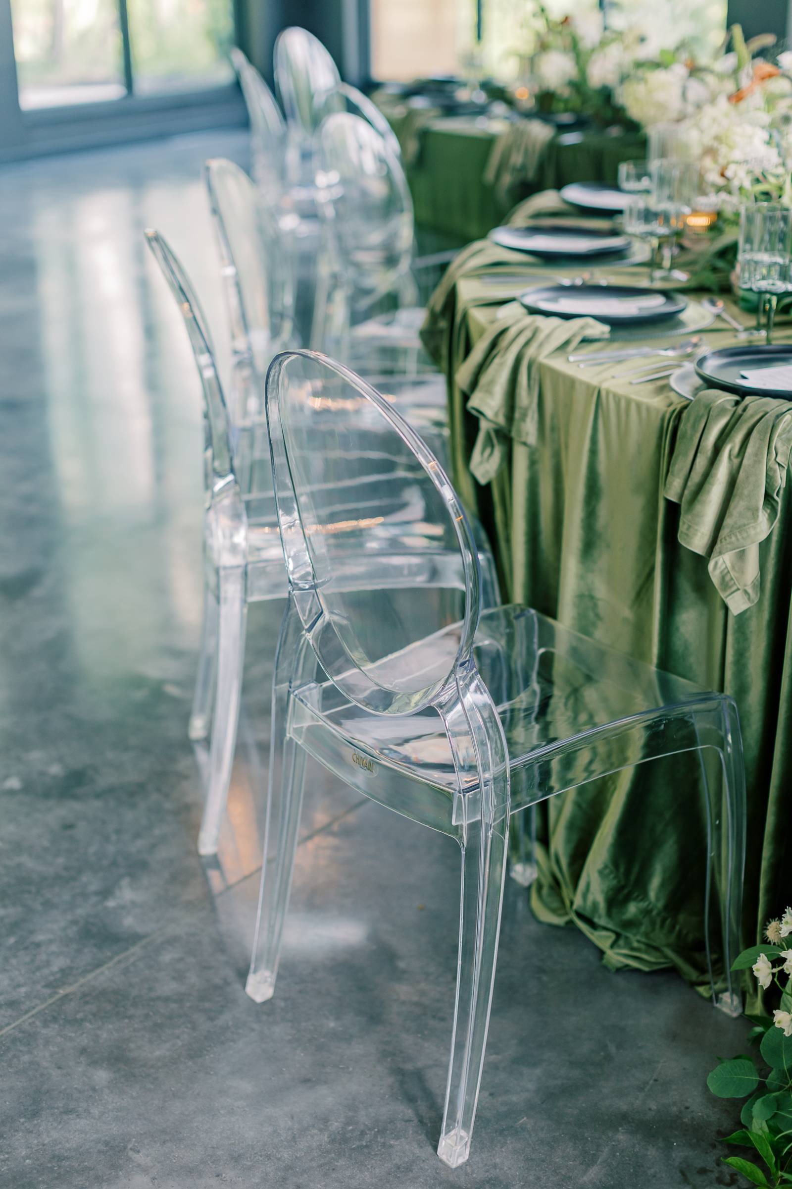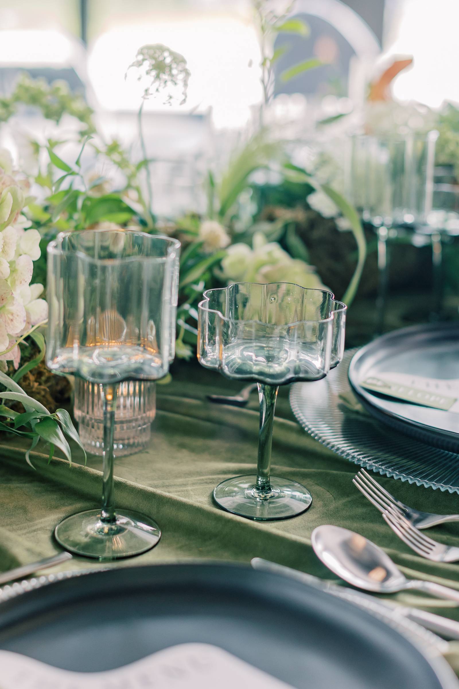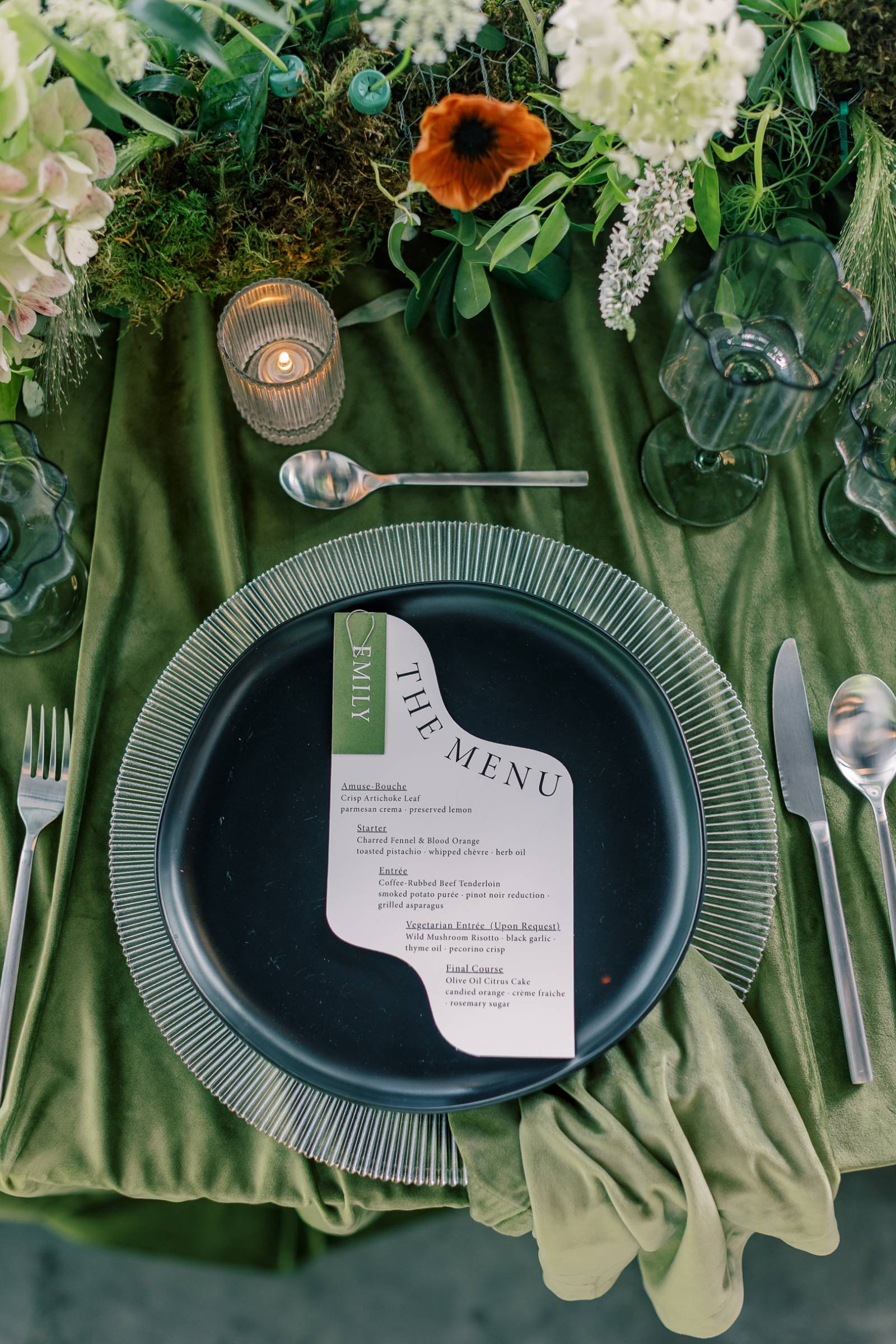 At the reception, the tablescape featured many beautiful rentals from Orange Door Weddings, starting with serpentine tables set with acrylic chairs and covered in green velvet drapings and linens. Tablewear included (striped glass) chargers, black plates, and scalloped wine glasses. B-Style Floral fashioned a lush floral centerpiece spanning the length of the table and cascading from the edge. Along with abundant greenery, prominent blooms included white hydrangeas, orange anthurium, and scabiosa pods.