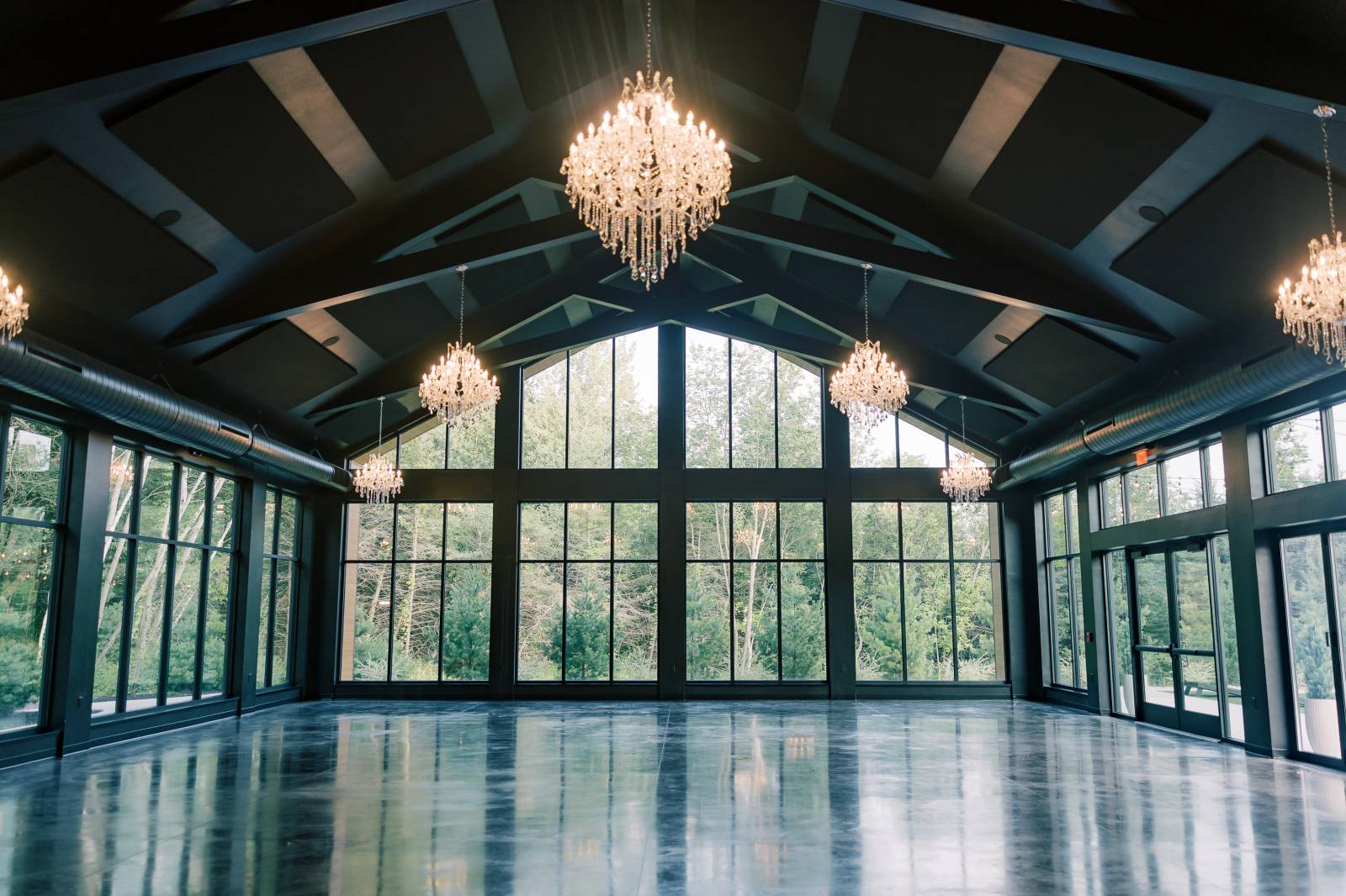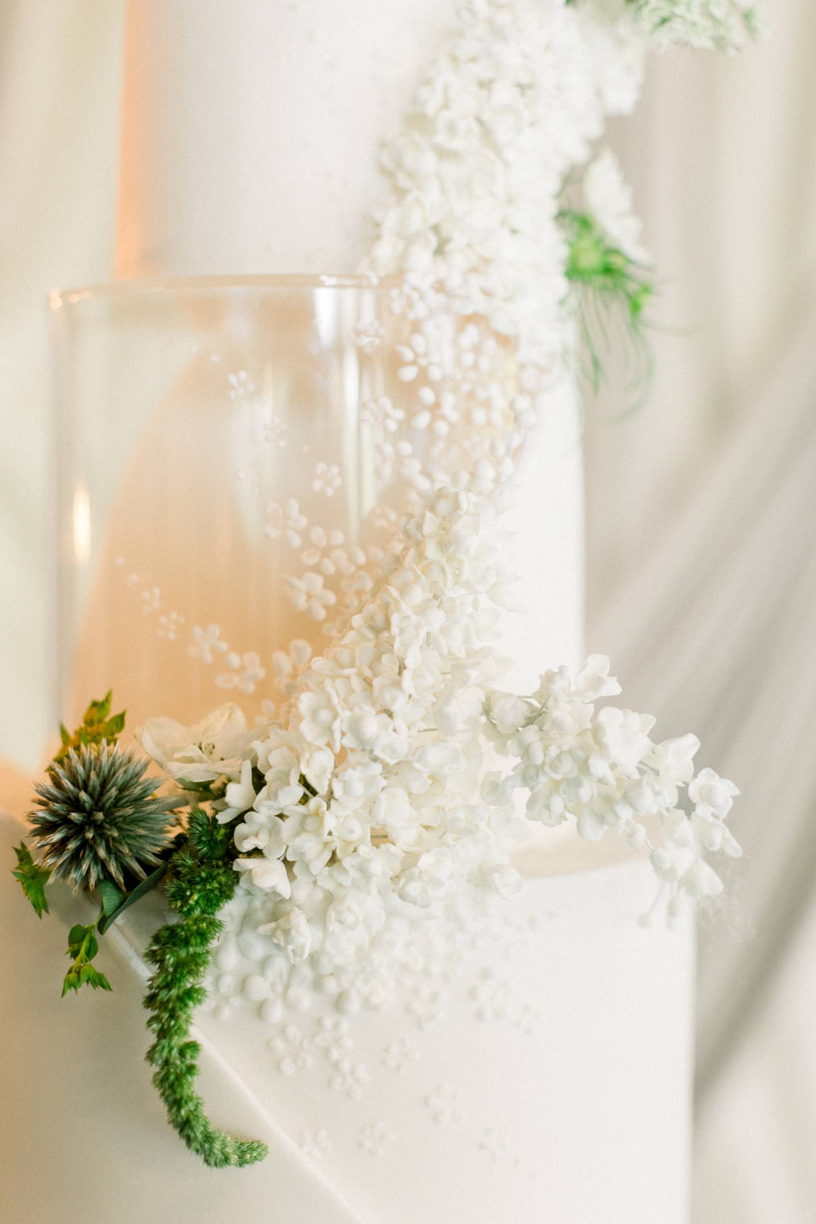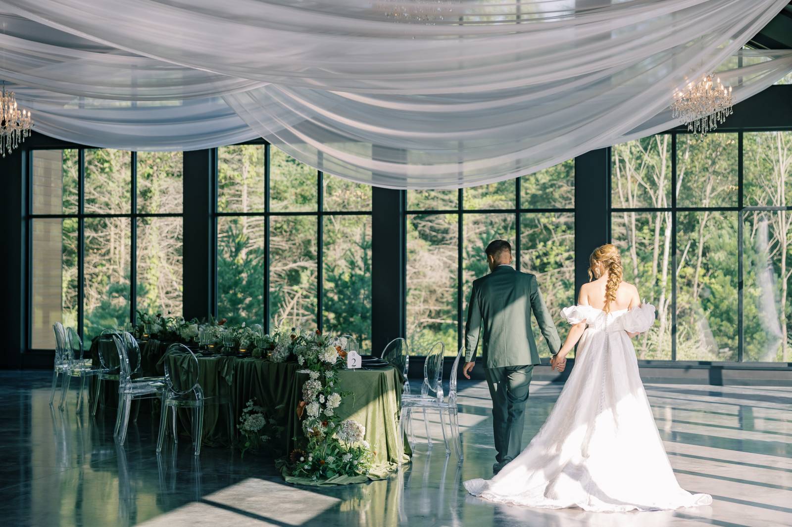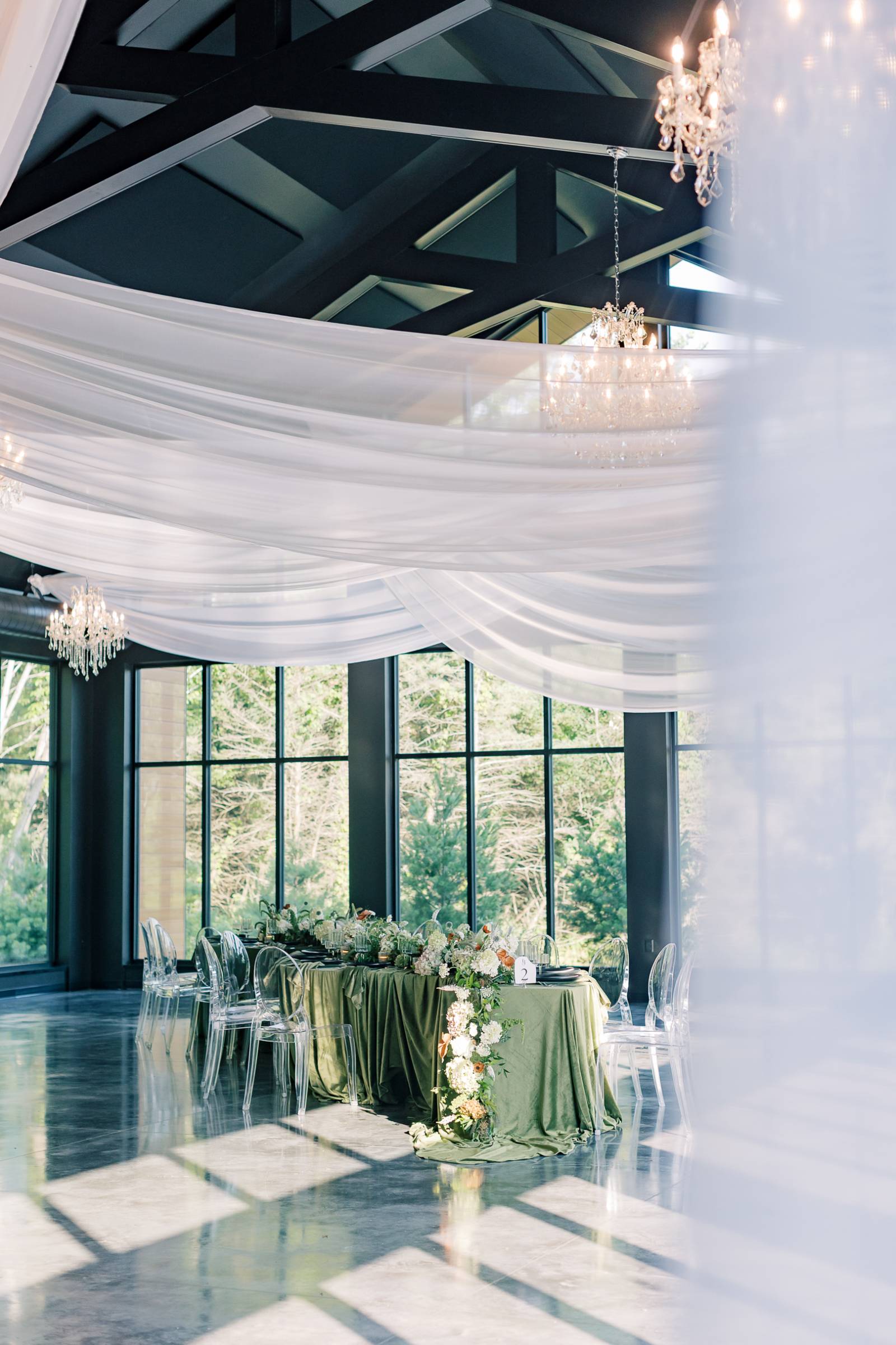 The table was set in the aptly named Glass House reception room, surrounded by floor-to-ceiling windows, towering ceilings, glowing crystal chandeliers, and sweeping white draping overhead.