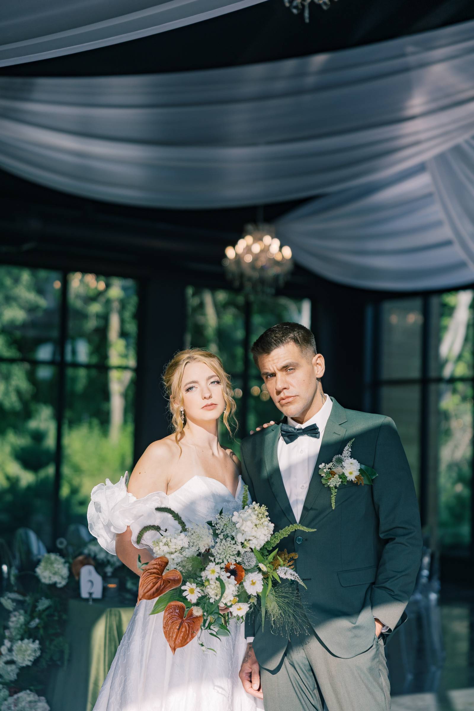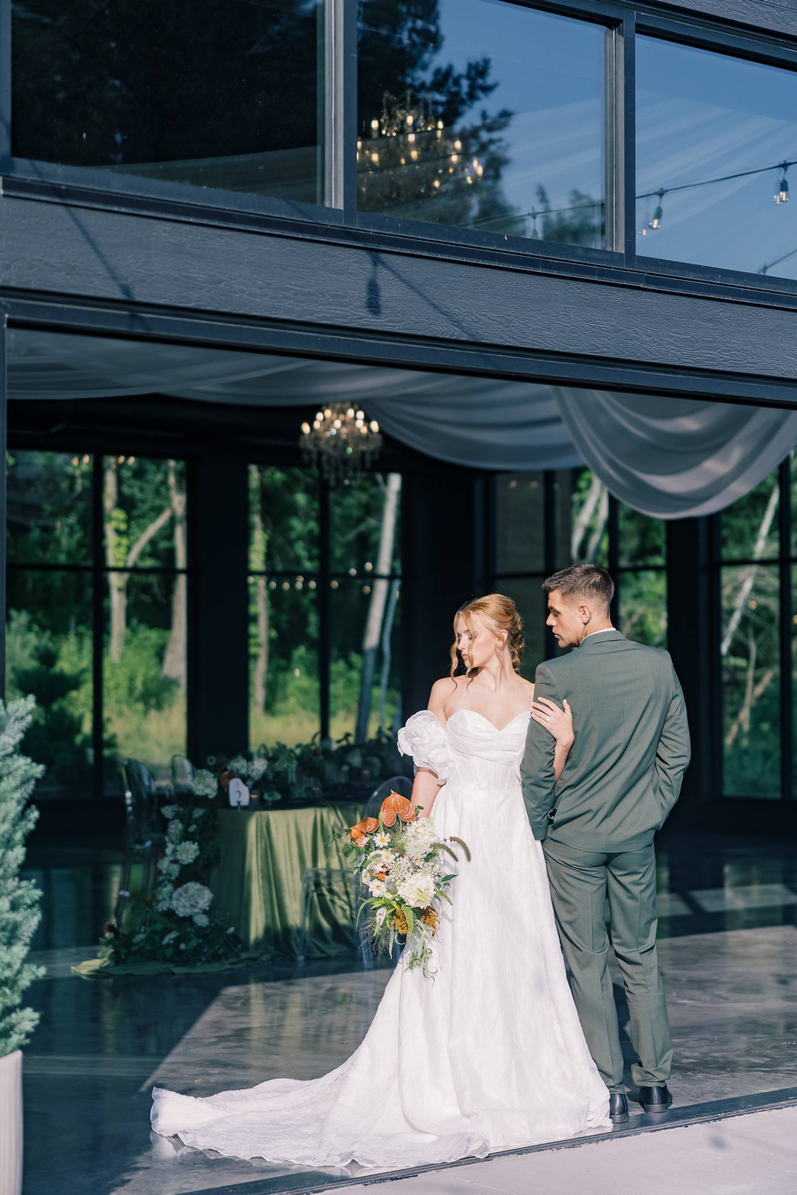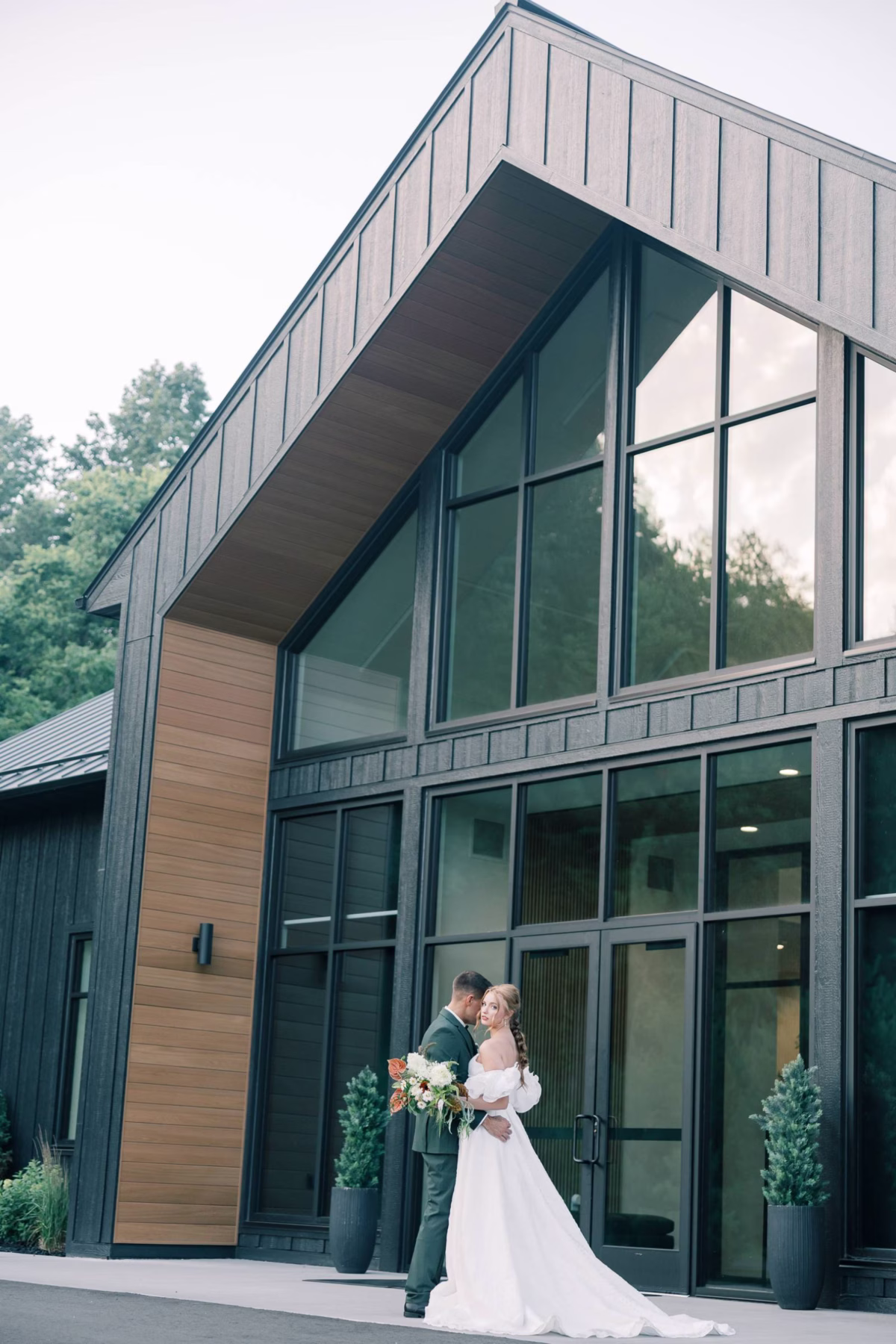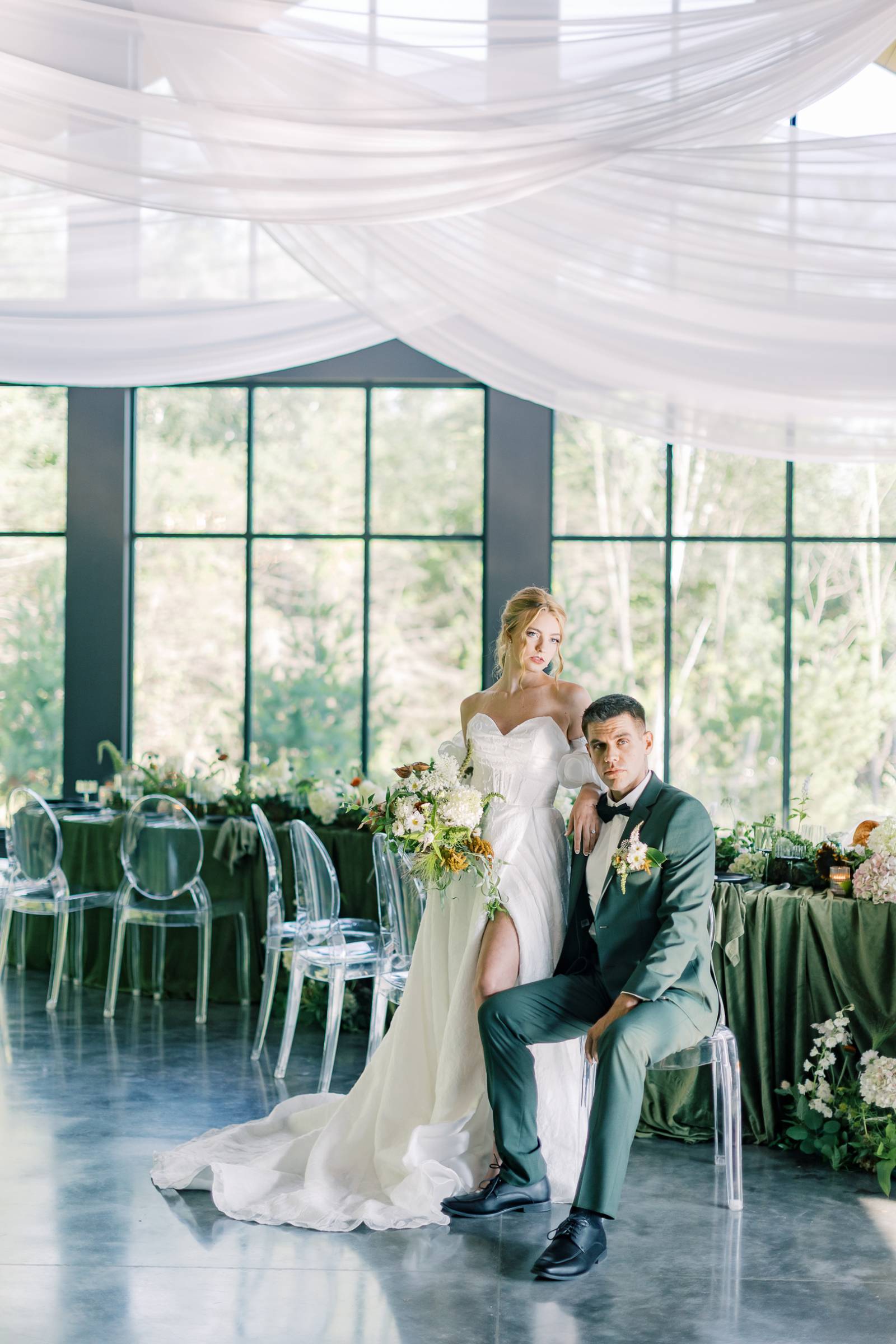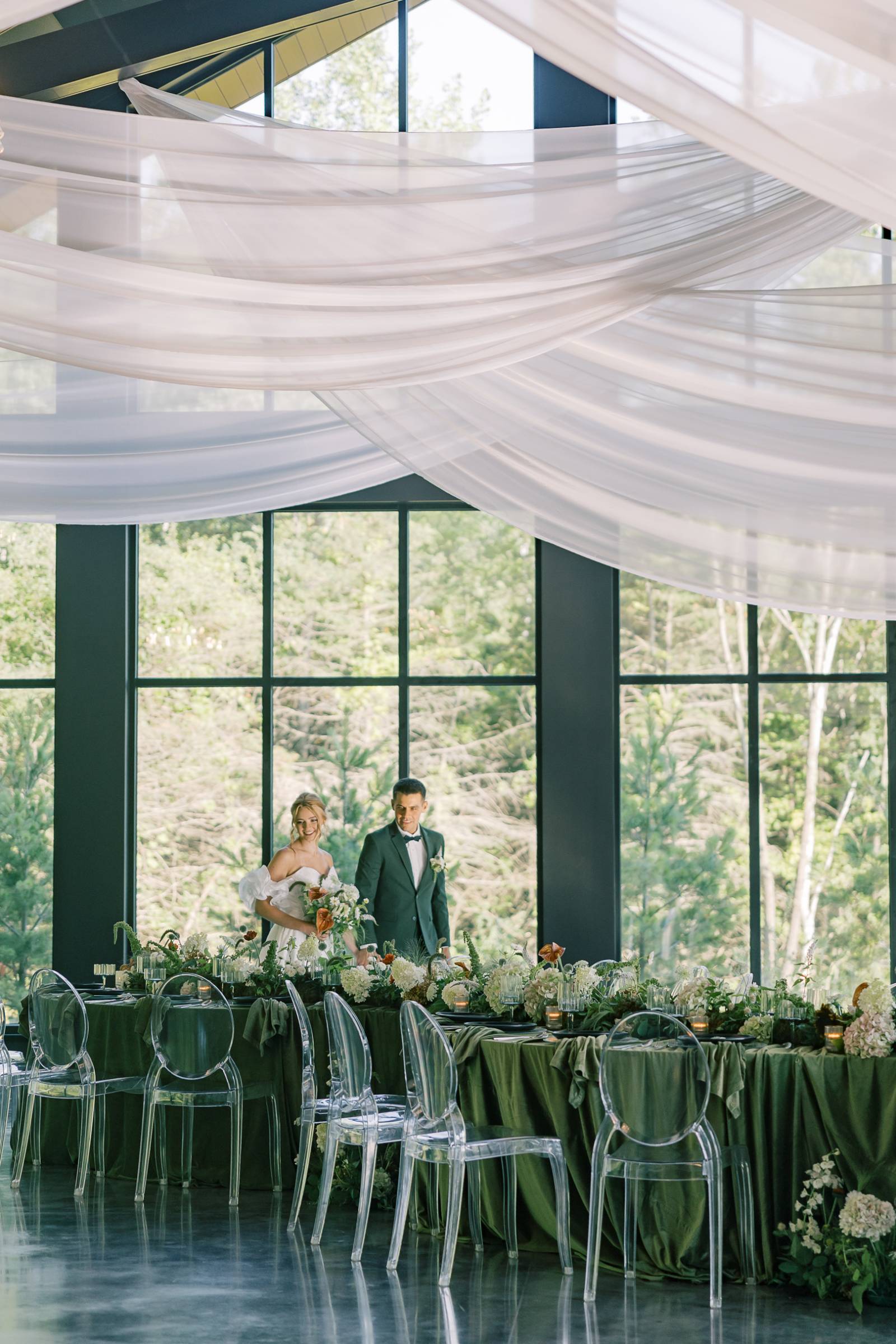 A palette of sage, forest, and muted greens met serene sophistication at Woods & Co Weddings’ upscale retreat. Orange Door Weddings led concept, coordination, rentals, and design, creating a thoughtful balance of modern elegance and ethereal details throughout the day. The result is a wedding design that feels polished, approachable, and full of love!
