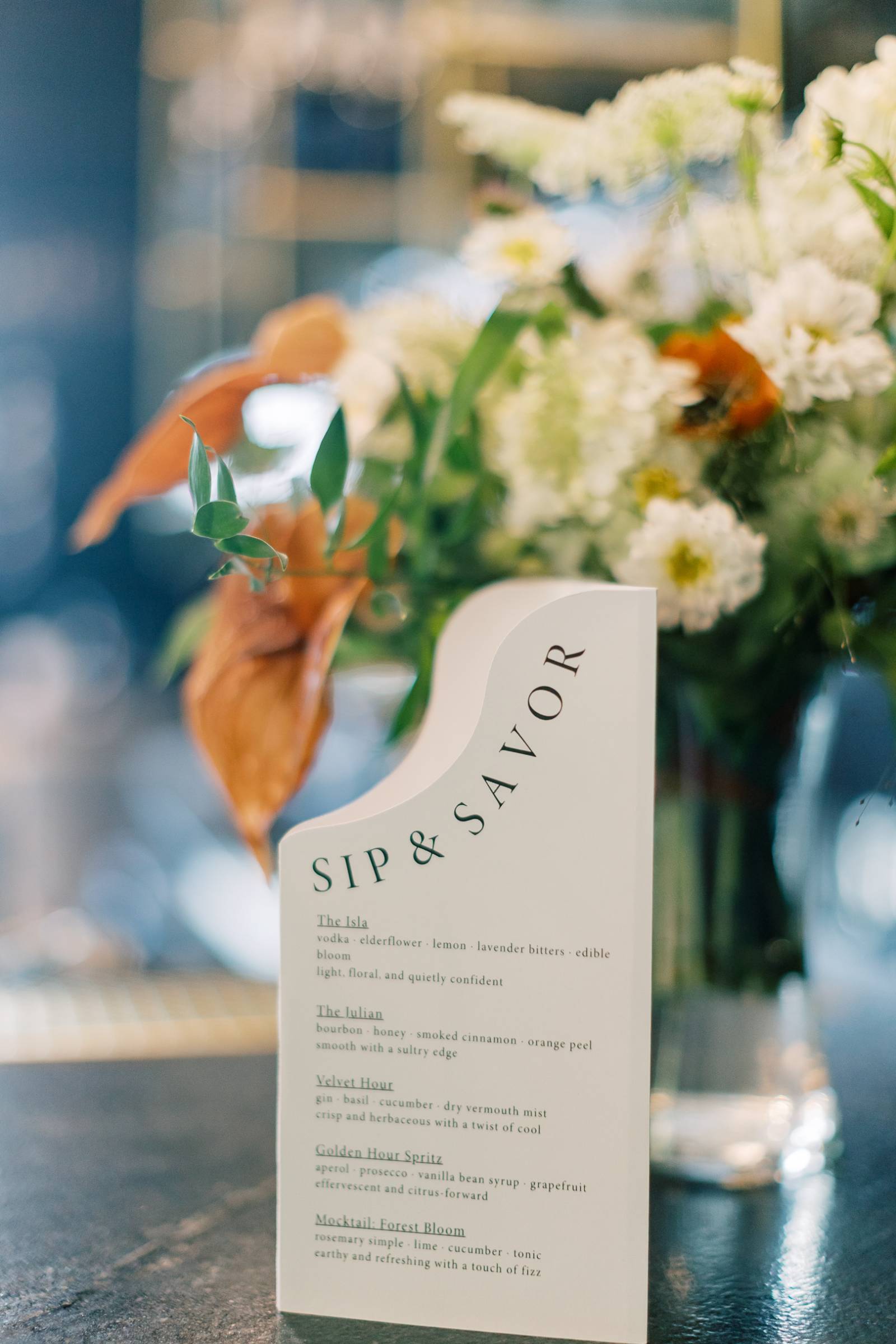 Further printed pieces included custom drink and dinner menus, name cards, a seating chart, and a textured, multi-media welcome sign.