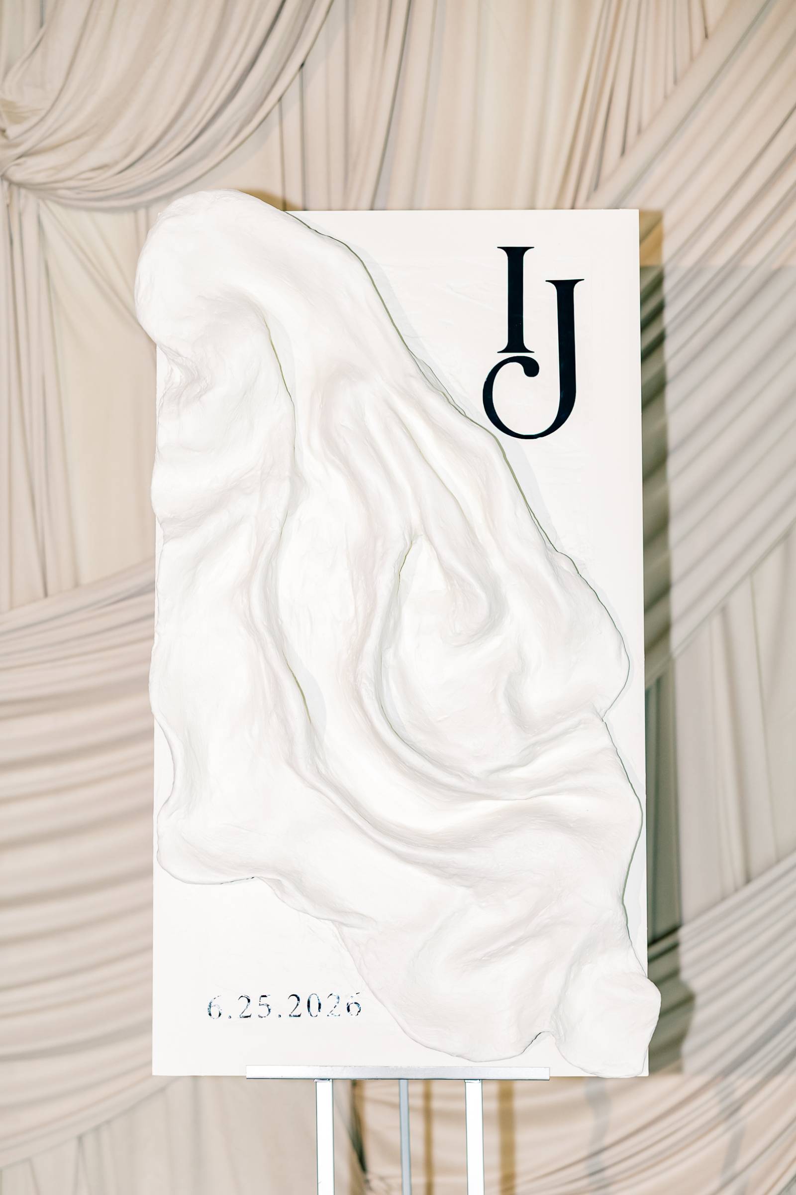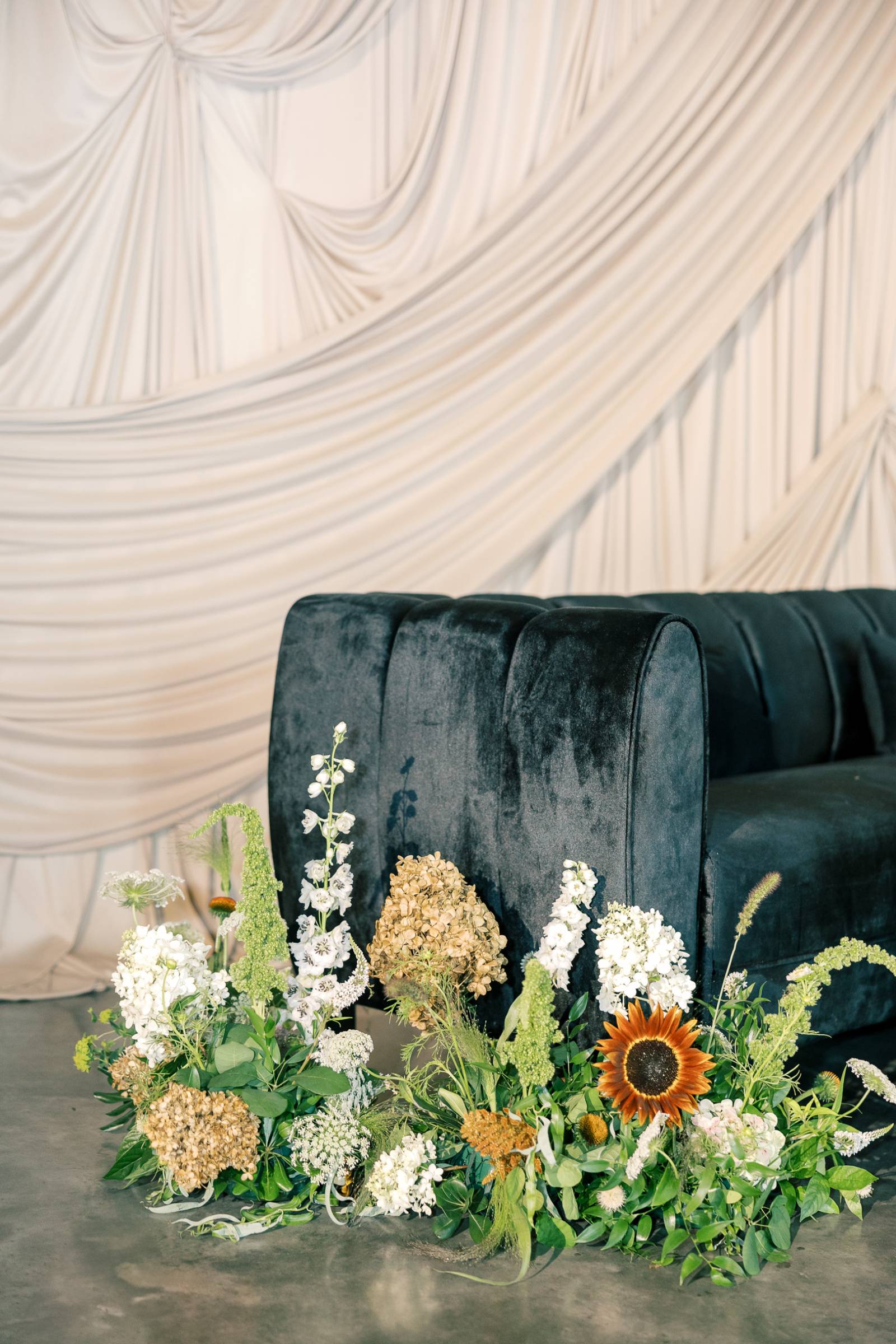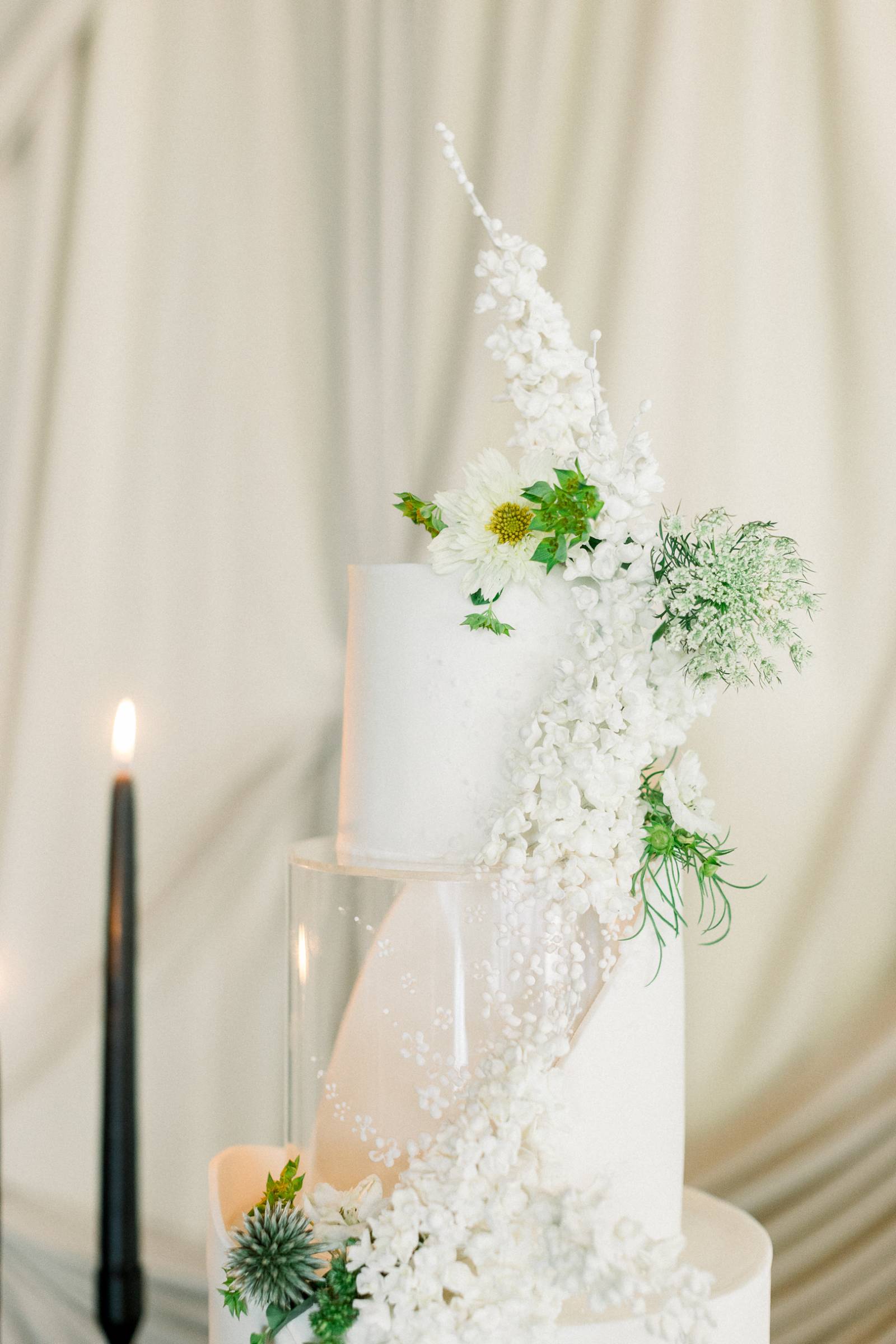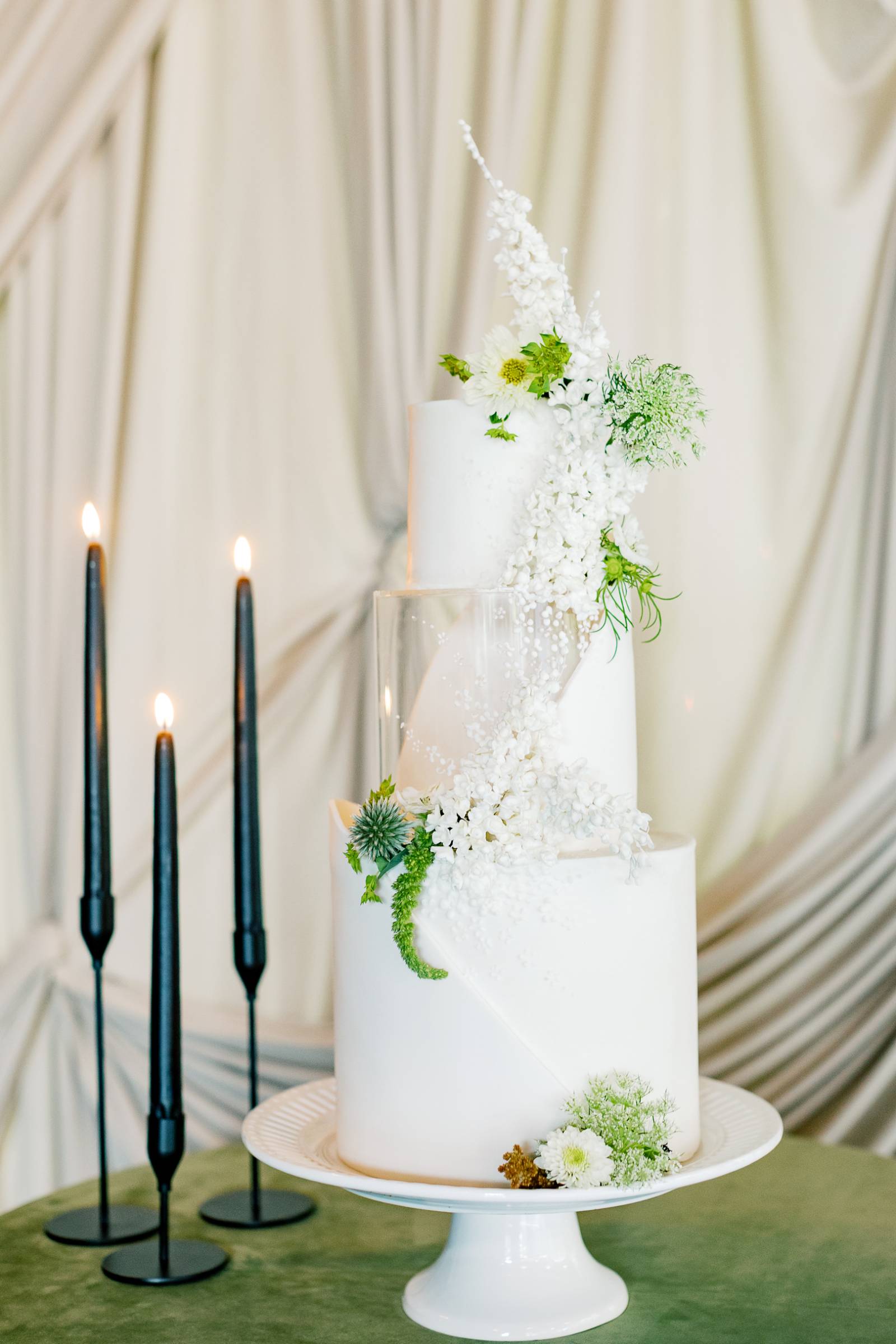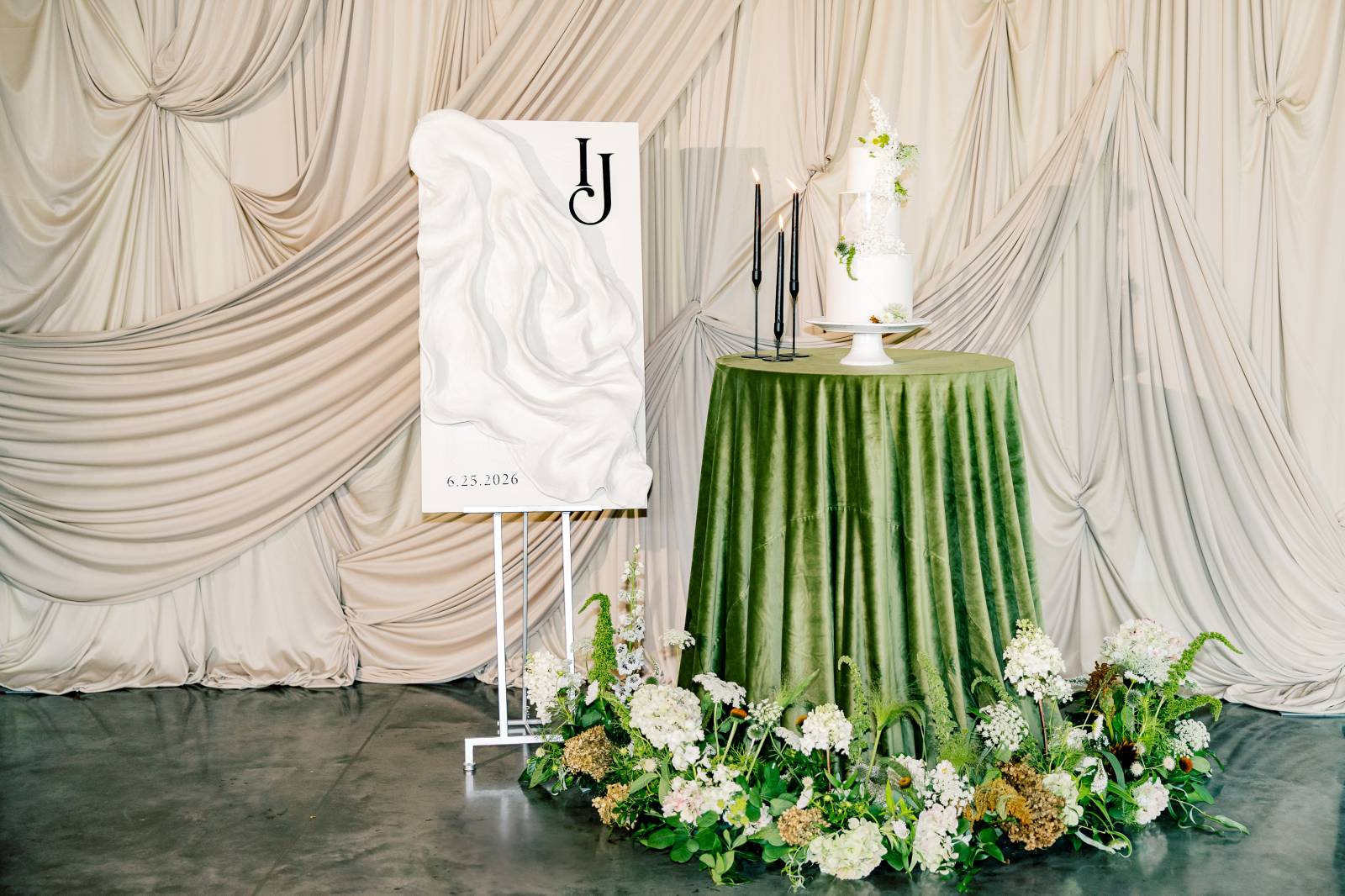 Other highlights included a dessert table and lounge, both set against intricate draping from We’ve Got it Covered. The dessert centerpiece was a three-tier white cake (including one acrylic layer) from Meringue Bakery & Cafe, spiraled with diagonal frosting and crawling florals and greenery. The cake was framed by tall candles and sat atop a round table surrounded by more florals.