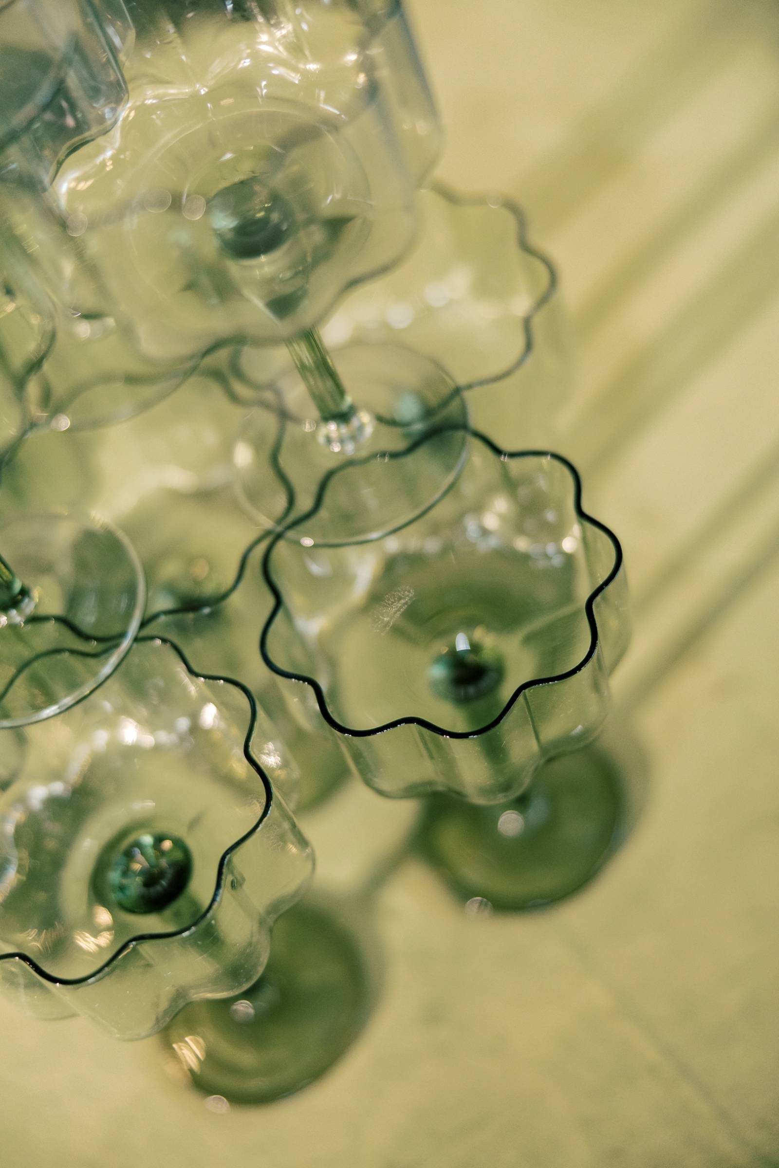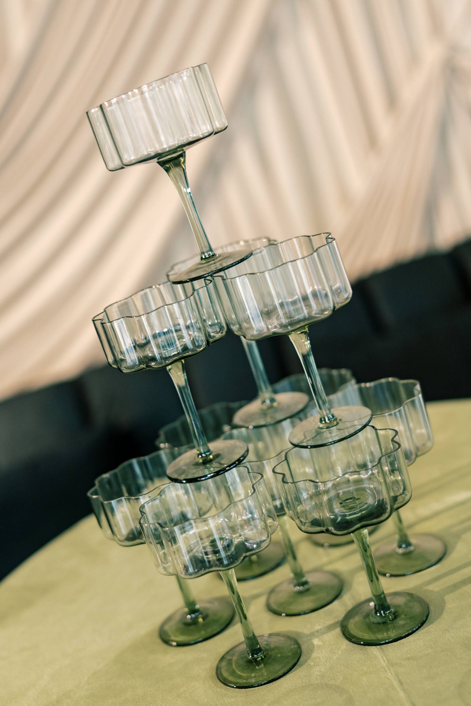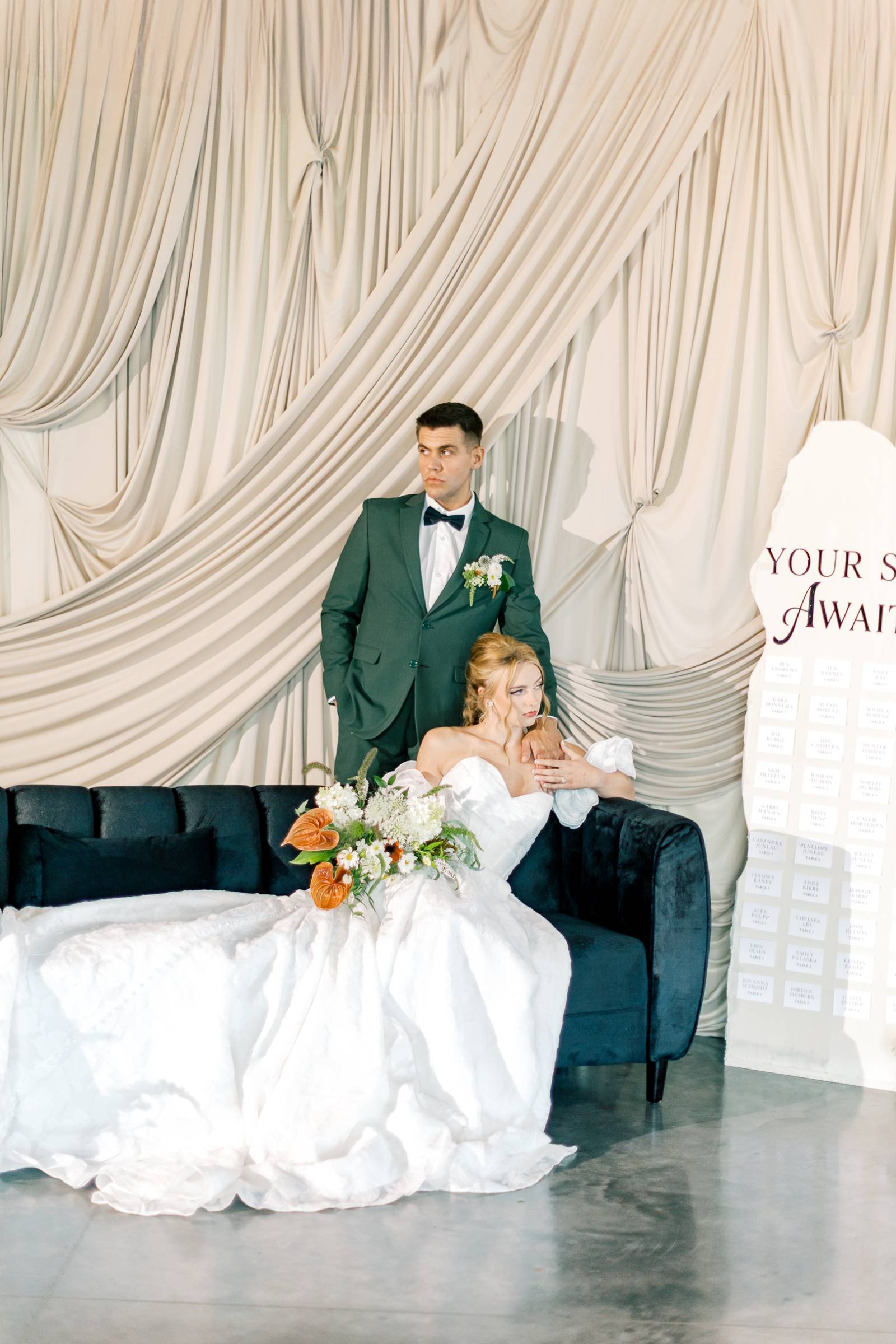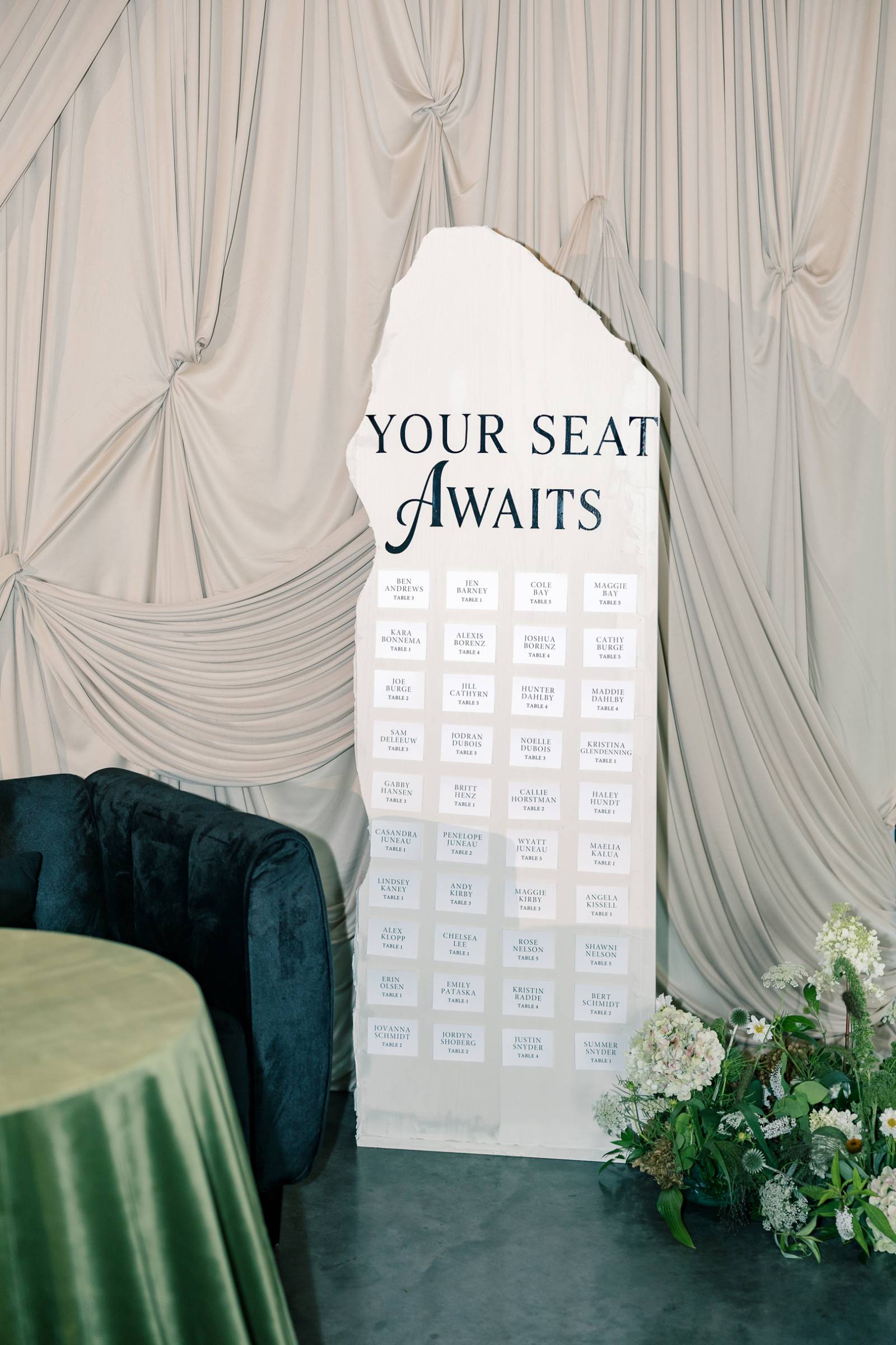 The lounge setup featured an array of furniture and decor pieces, with a dark green velvet couch, granite slab-inspired seating chart, and a champagne tower among the most prominent.