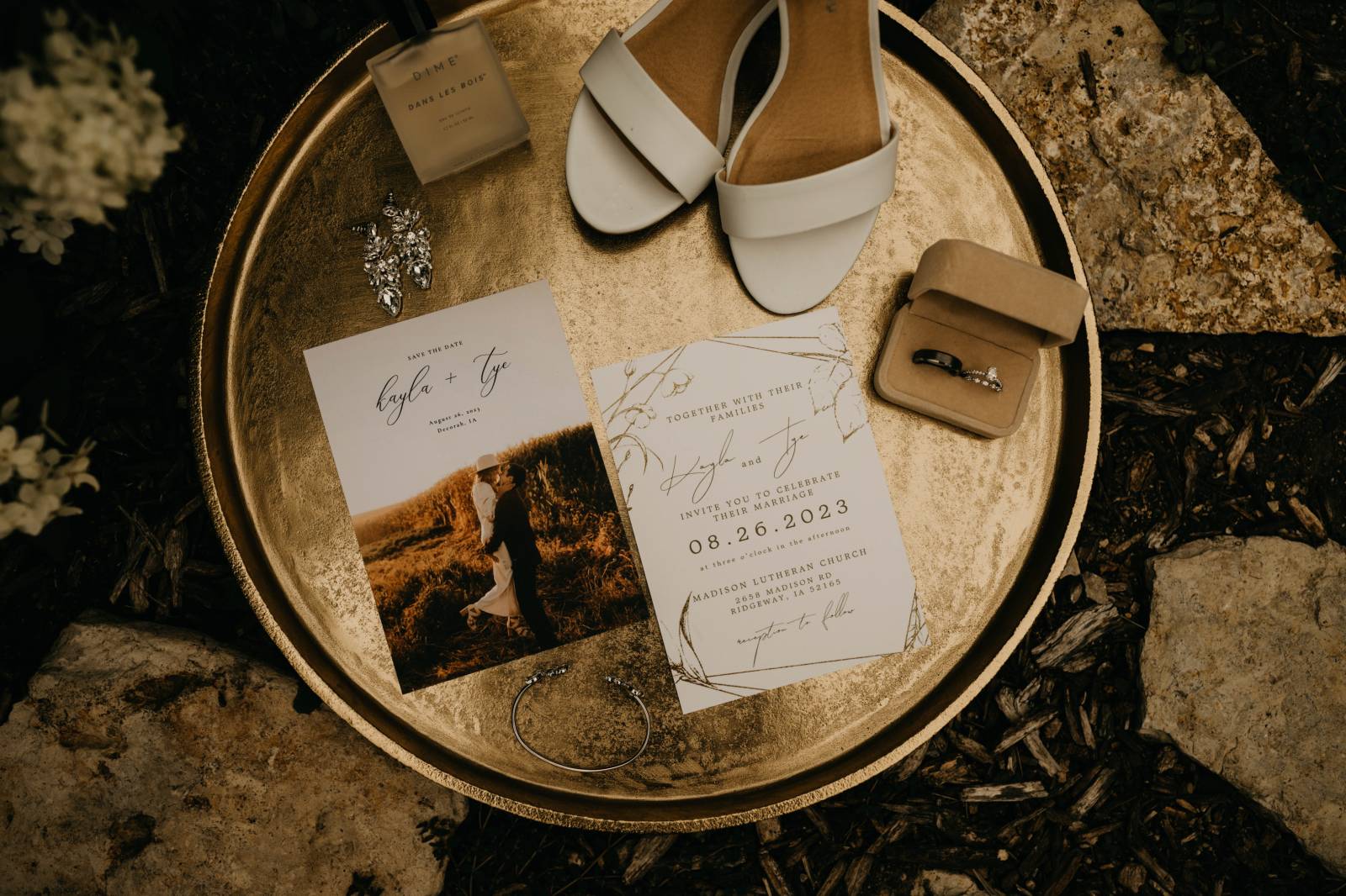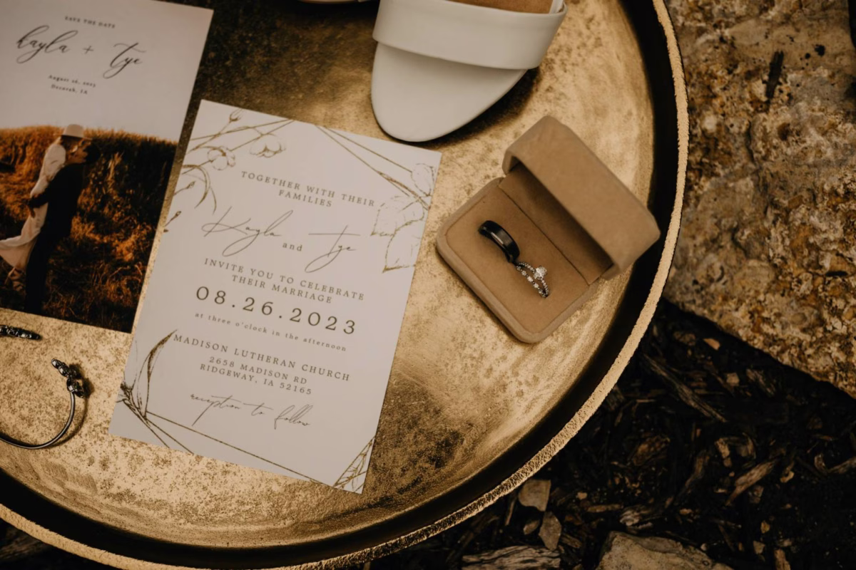 Kayla and Tye met on an orchestra bus in middle school and began dating shortly after. Unbeknownst to them, their grandparents were already friends, making for a special connection once their relationship became official. After seven years of dating, Tye proposed right at home, and the couple celebrated with drinks and dinner with some of their closest friends.