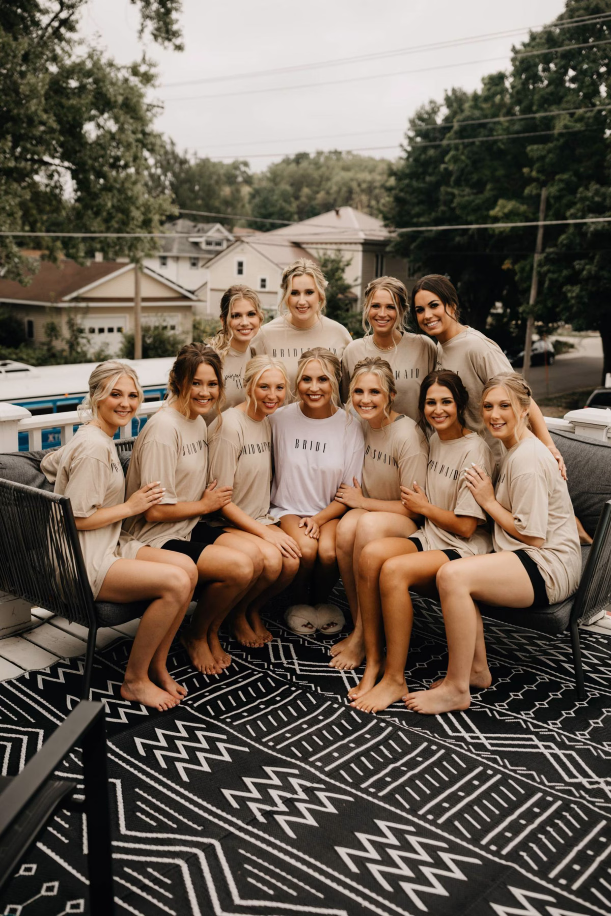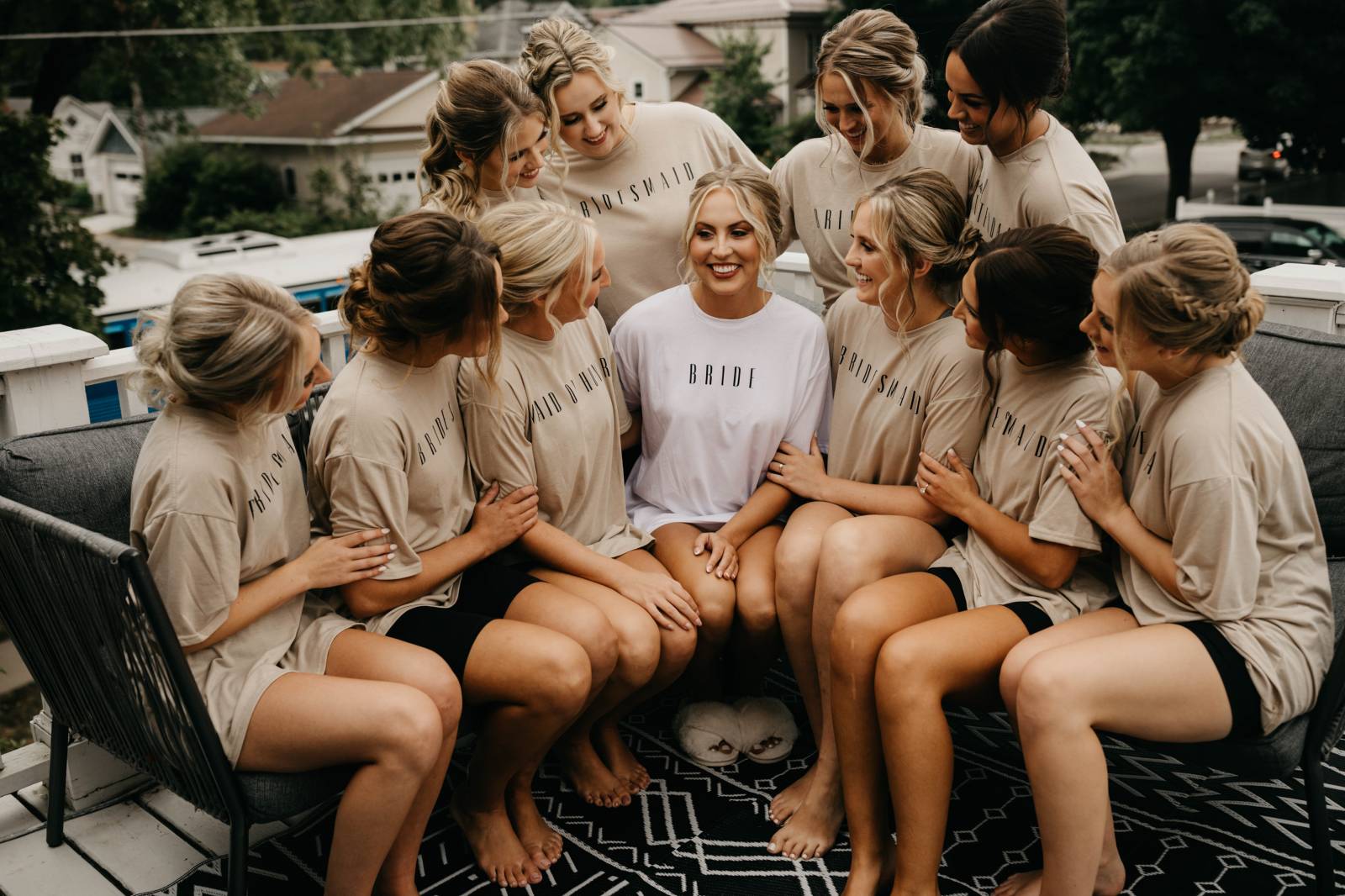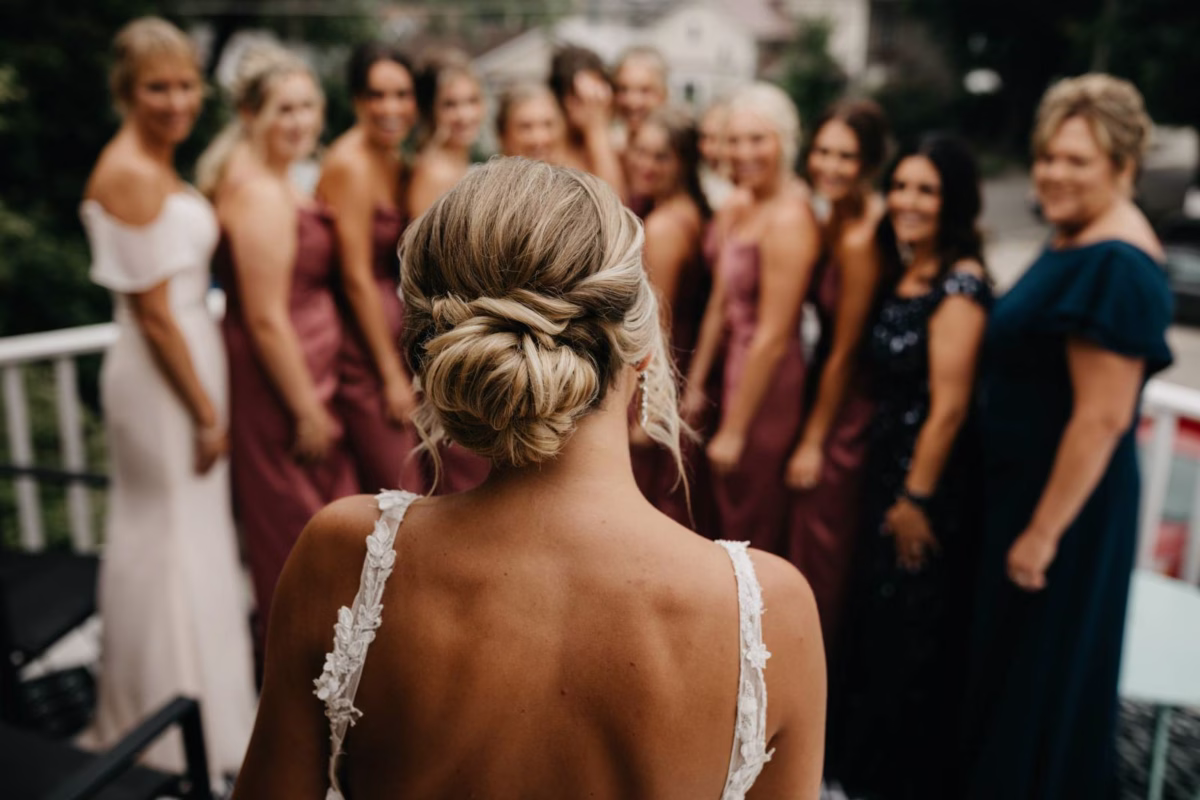 Natalie Heffern of Cactus Mane styled Kayla and her bridesmaids with textured, low-updos, or braids. Kayla's hair was skillfully secured into a low bun, with wavy, loose strands framing her face.
