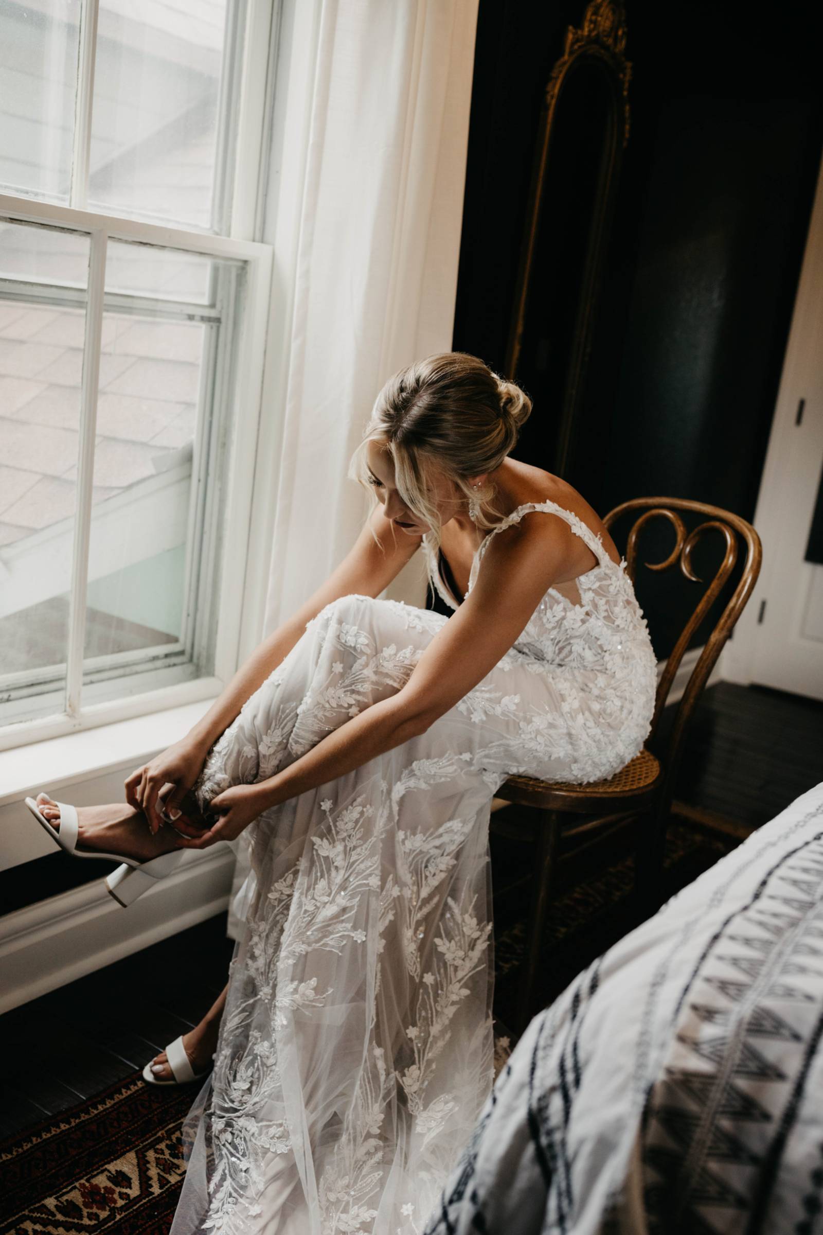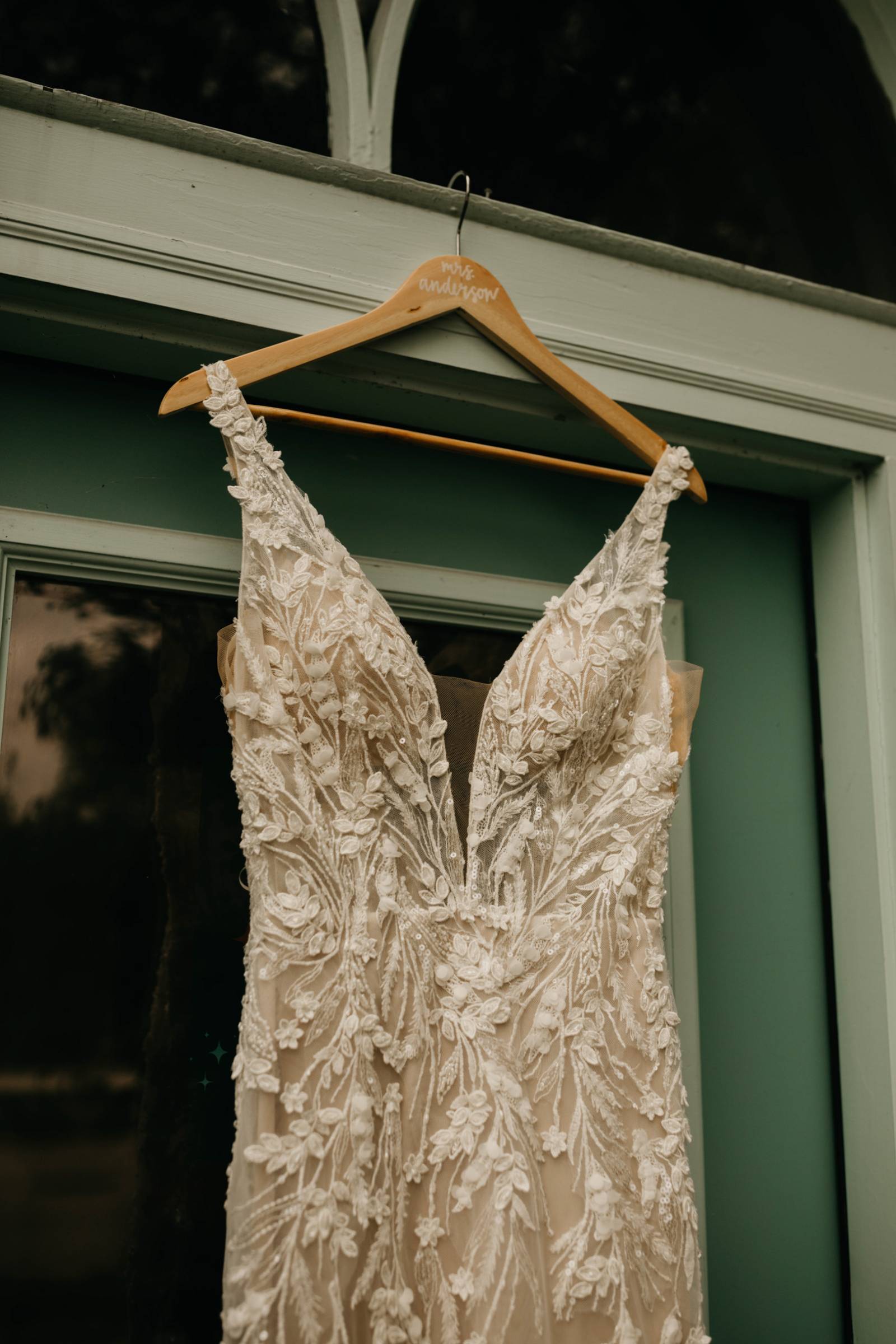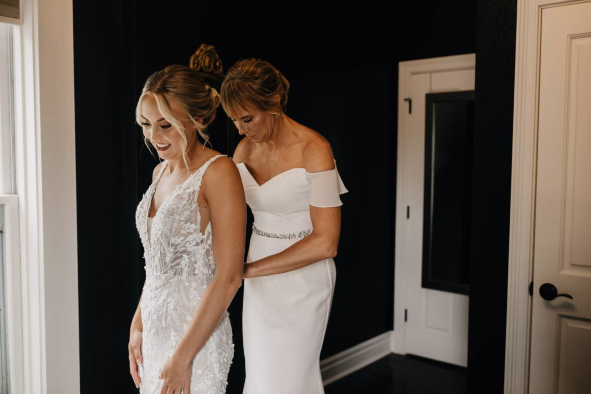 The final selection was a fit-and-flare boho gown full of textured embroidery and tasteful sequins. The gown featured a deep-v illusion front, an open back, nude underlay, and removable tulle bows on the straps. Accessories included sparkling drop earrings from Olive & Piper and a flowing tulle veil for the ceremony.